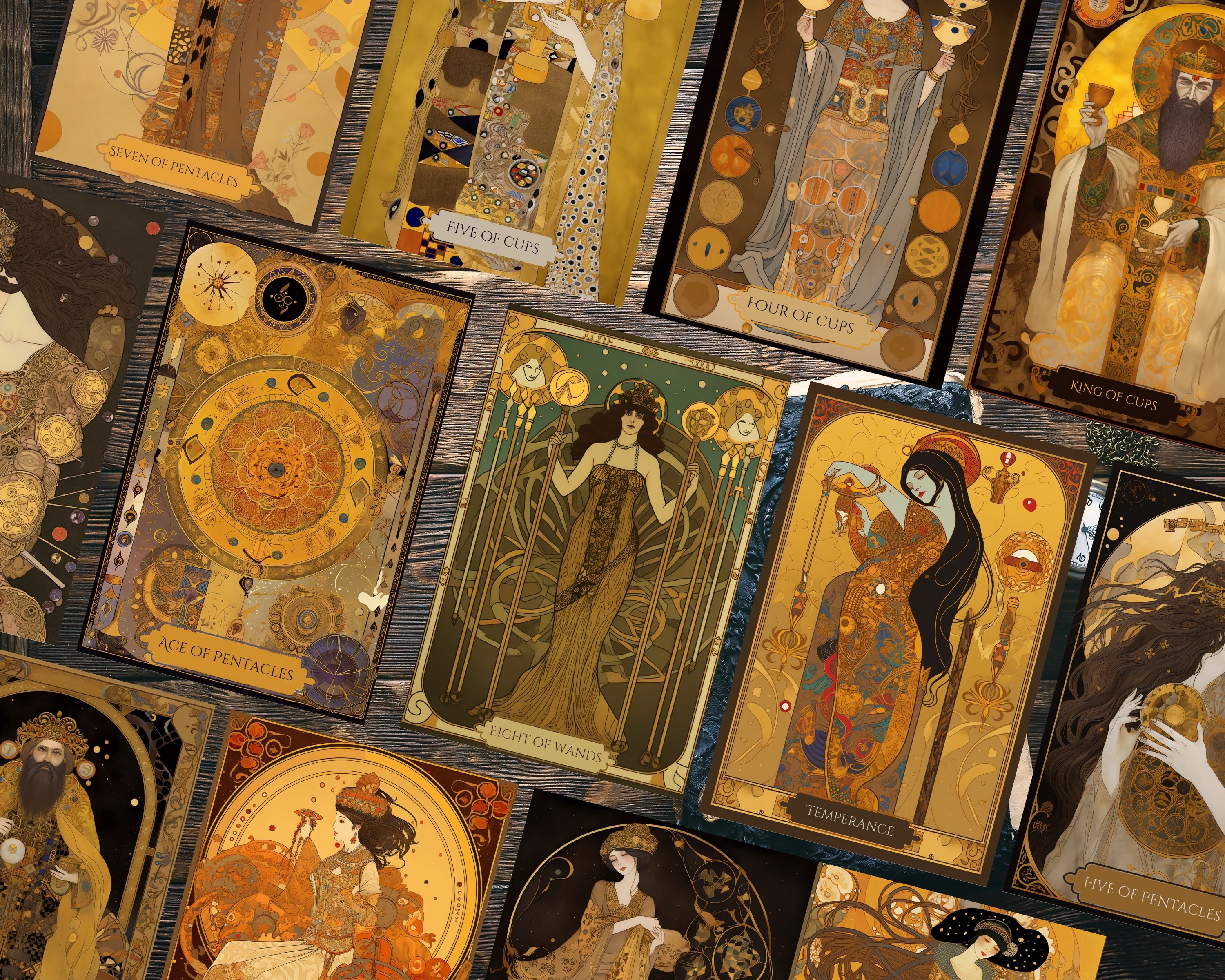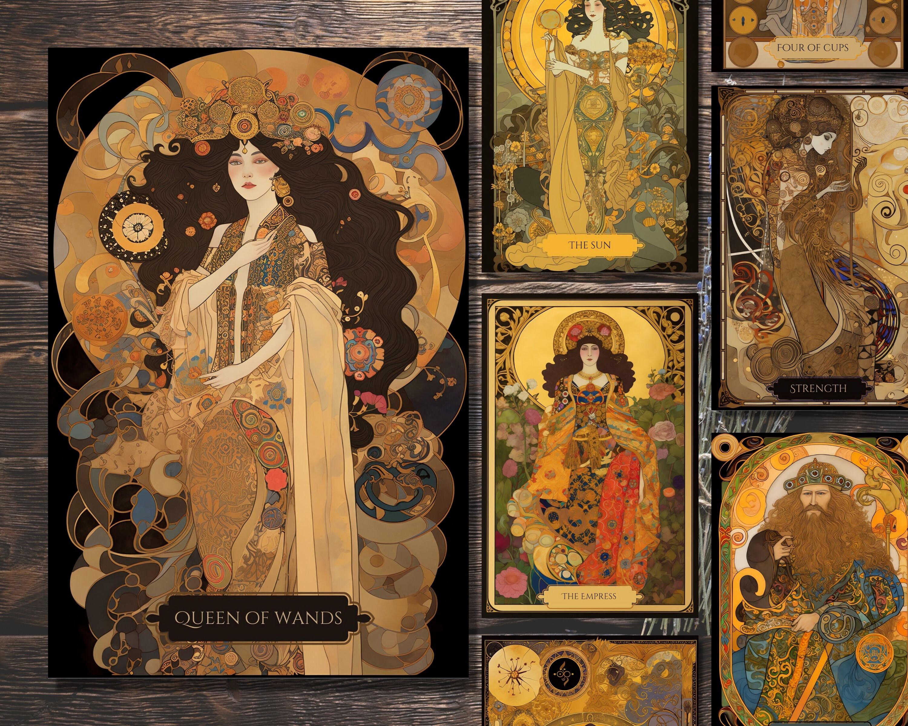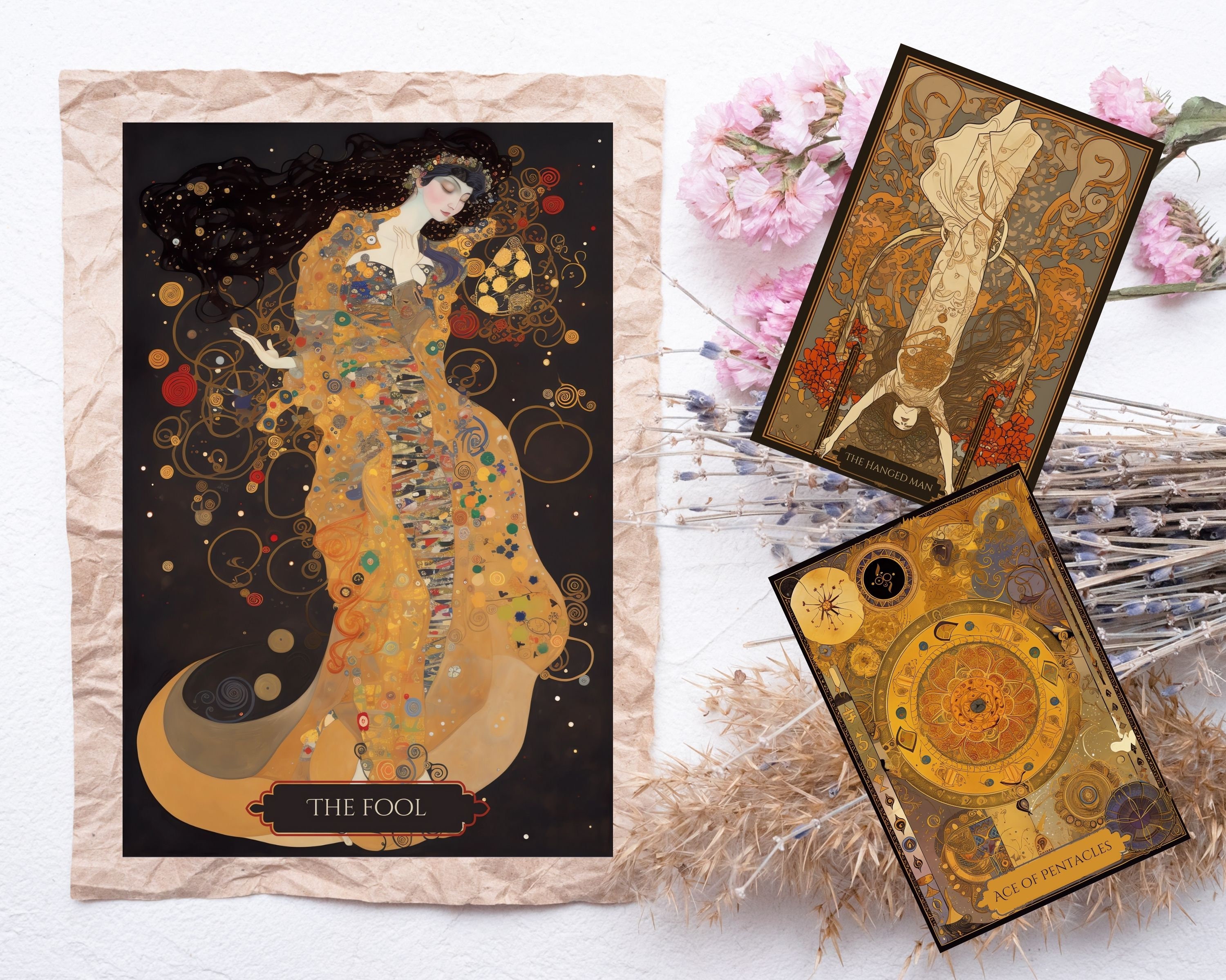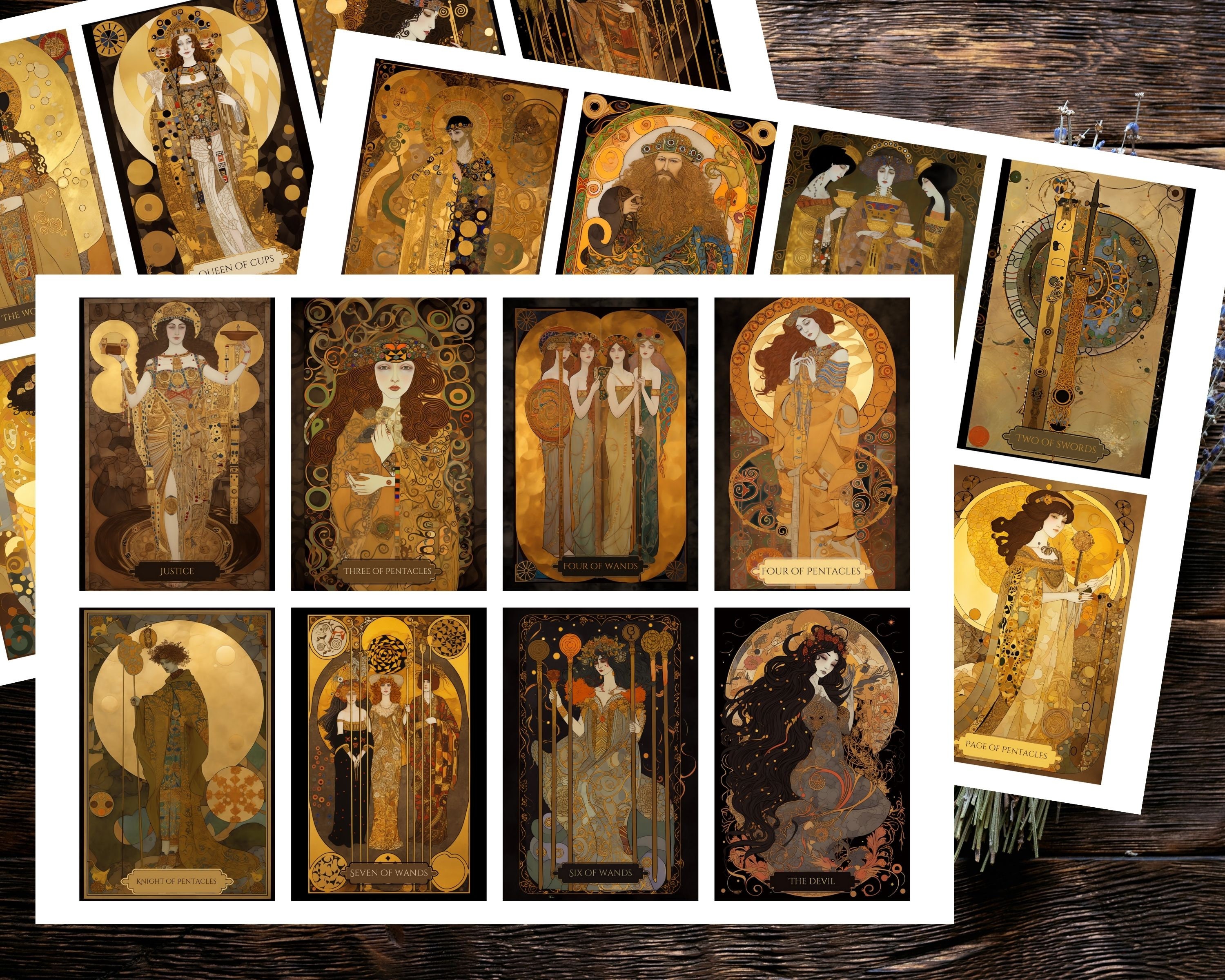 Introducing the Art Nouveau Gold Tarot Deck, inspired by the iconic Gustav Klimt. This 78-card tarot deck features exquisite, intricate gold artwork and is printable in PDF format. Each card is designed with the utmost care and attention to detail, resulting in a stunning and unique deck.