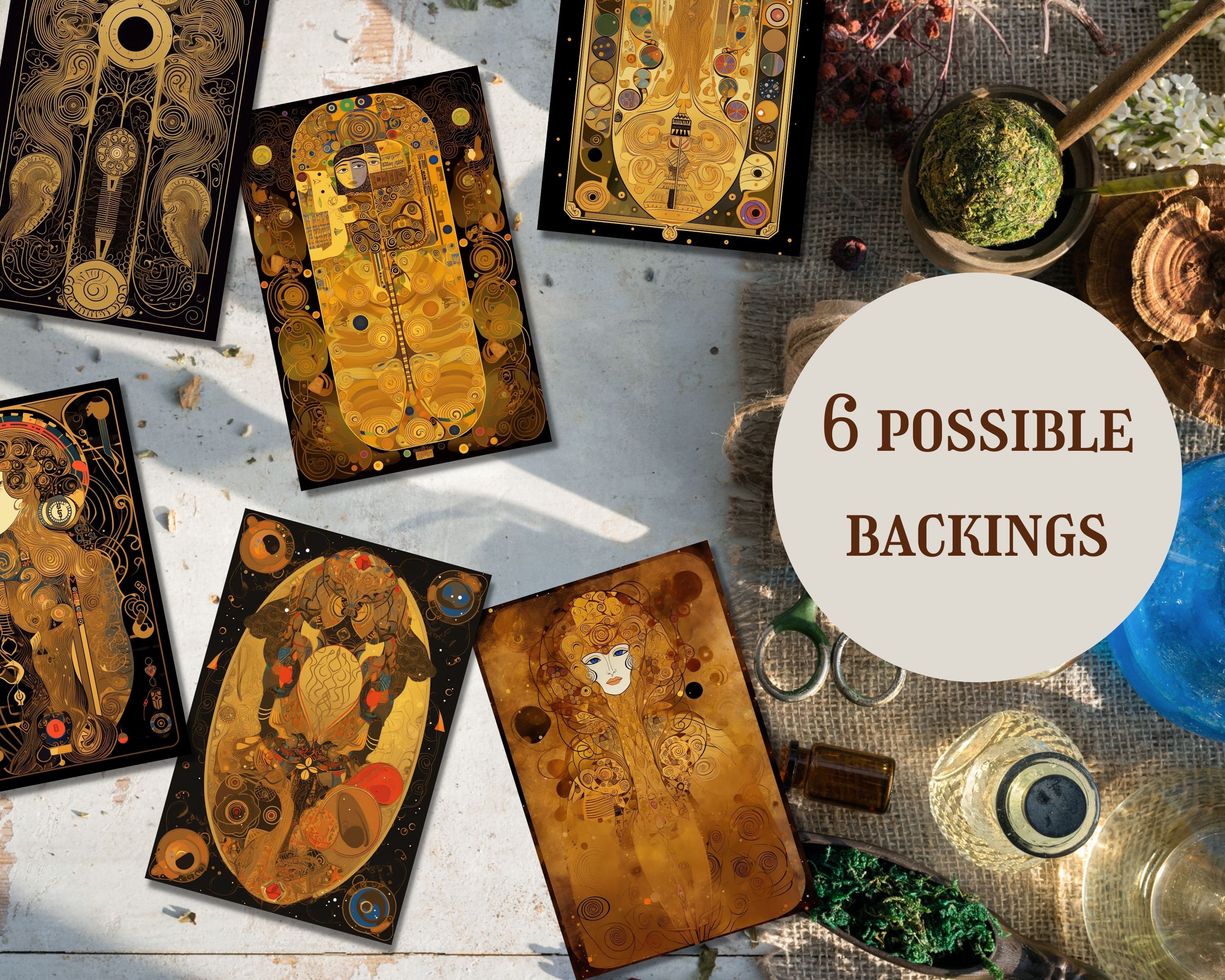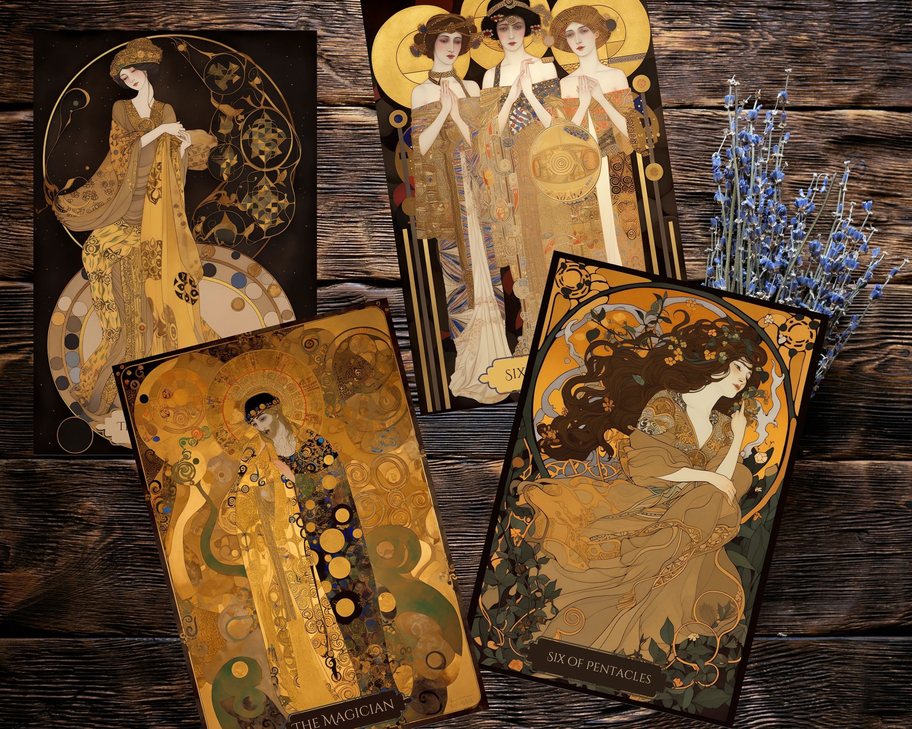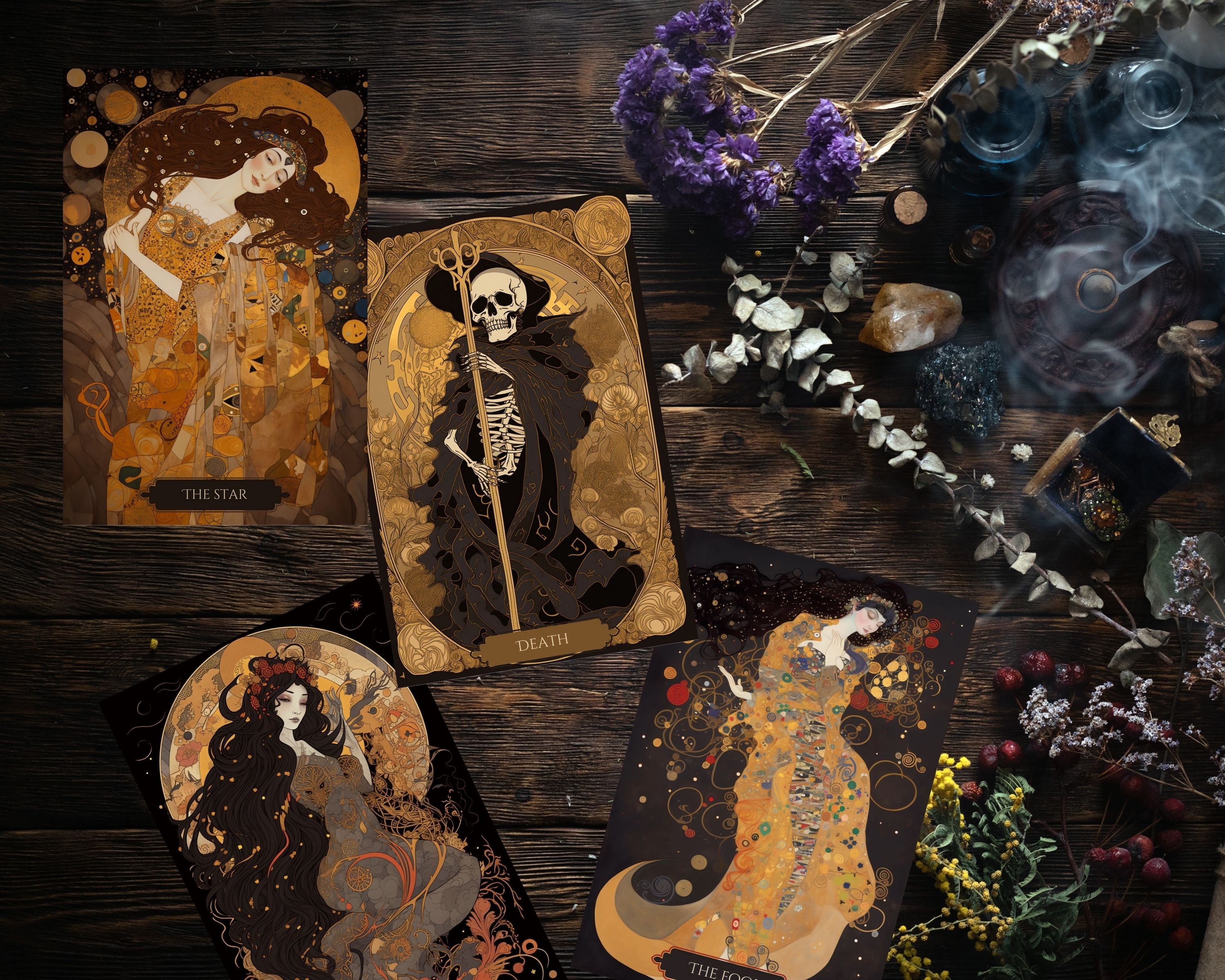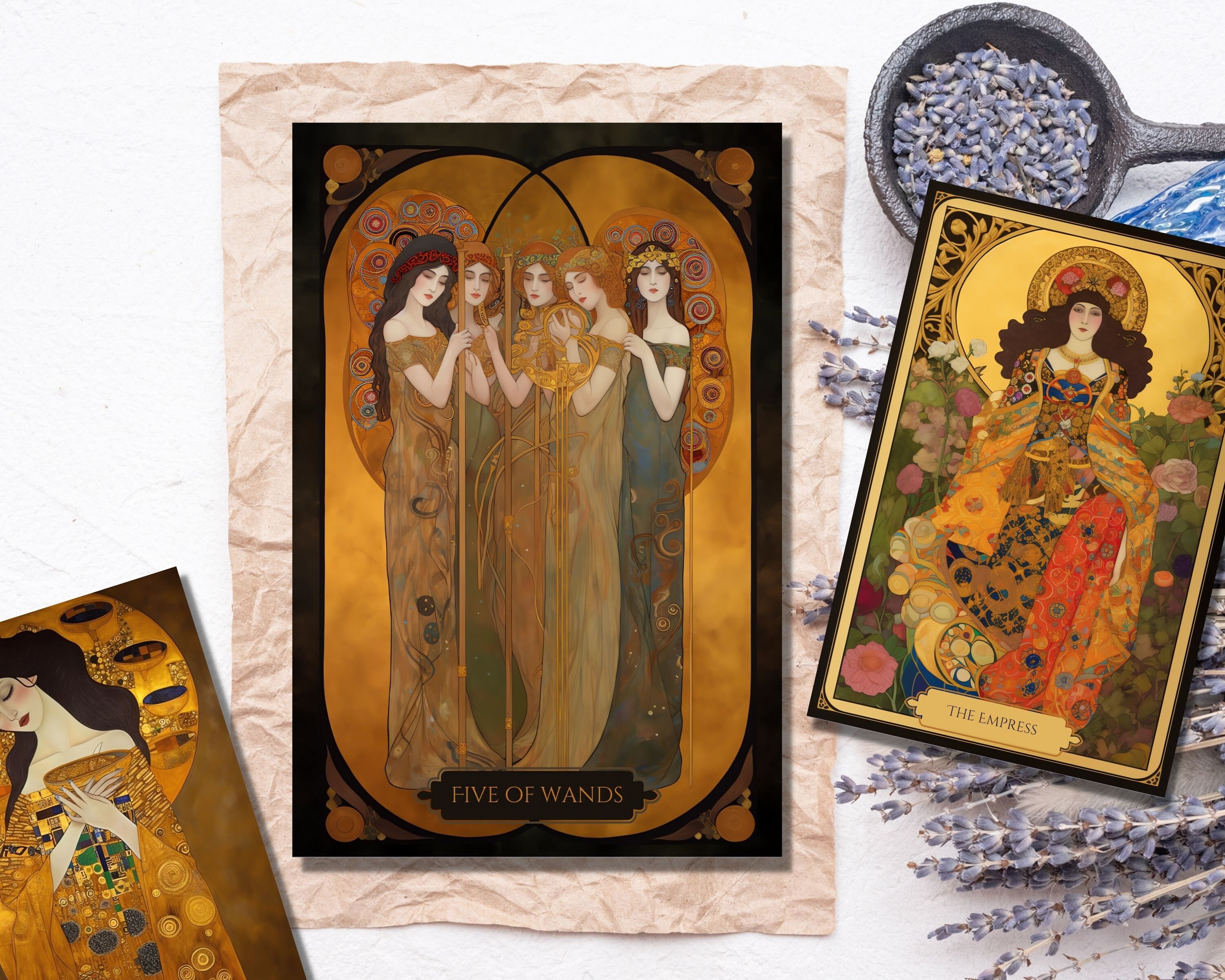 Introducing the Art Nouveau Gold Tarot Deck, inspired by the iconic Gustav Klimt. This 78-card tarot deck features exquisite, intricate gold artwork and is printable in PDF format. Each card is designed with the utmost care and attention to detail, resulting in a stunning and unique deck.