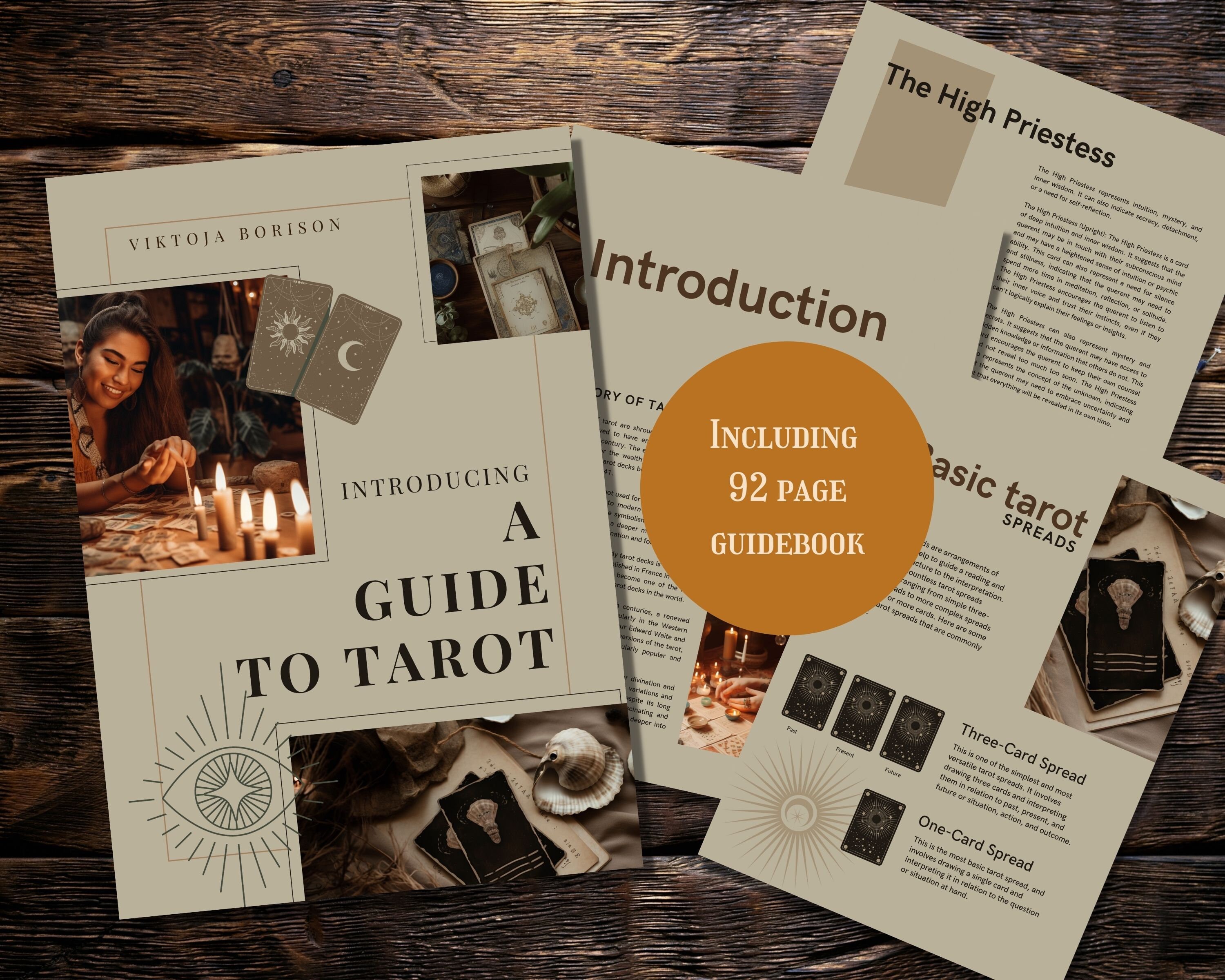 In addition to the tarot deck, you'll receive a comprehensive 92-page guidebook, complete with an introduction to tarot, the history of tarot, types of tarot decks, basic tarot spreads, and more. The guidebook also includes card meanings and interpretations for both the Major and Minor Arcana, as well as advanced tarot techniques such as using reversals.