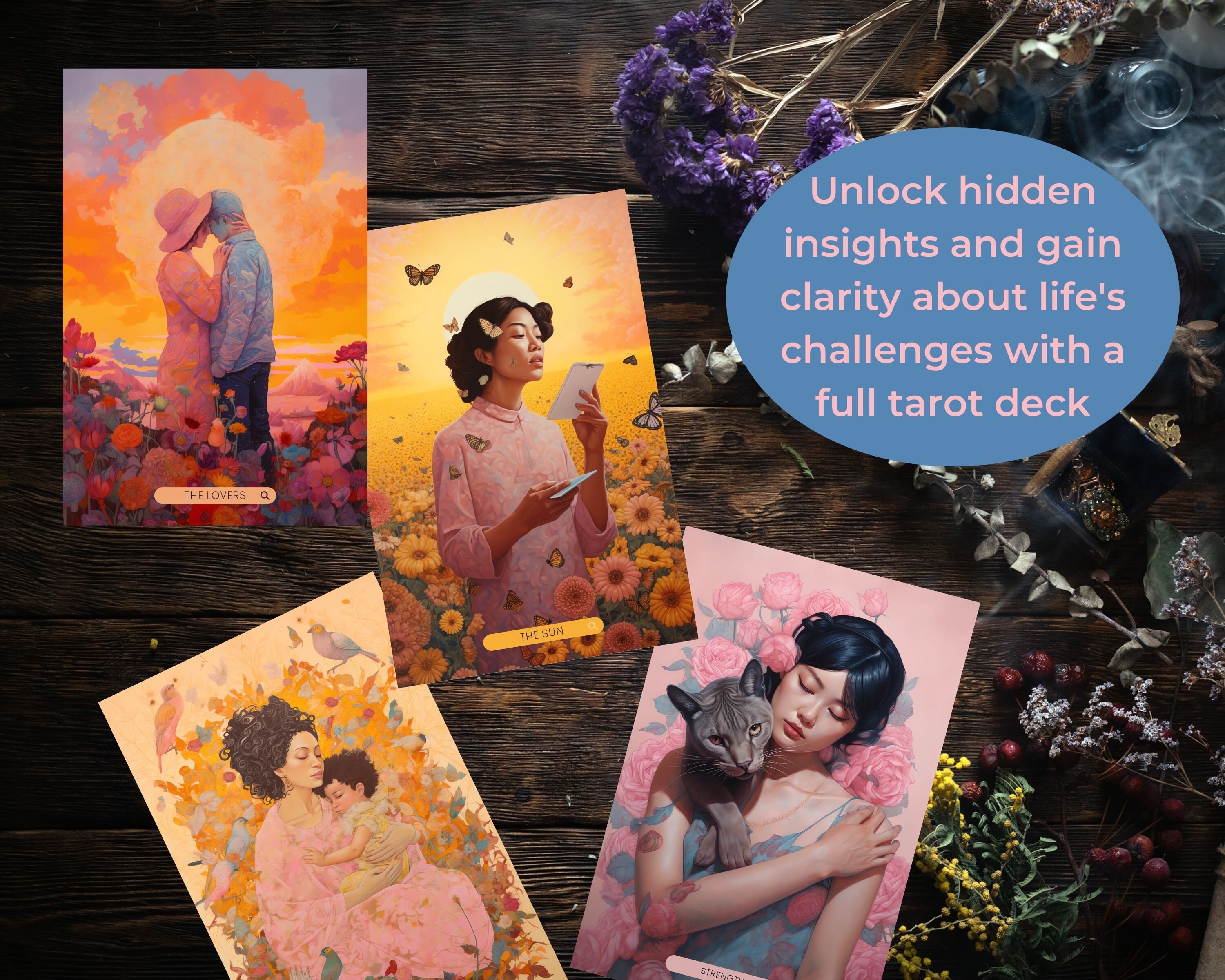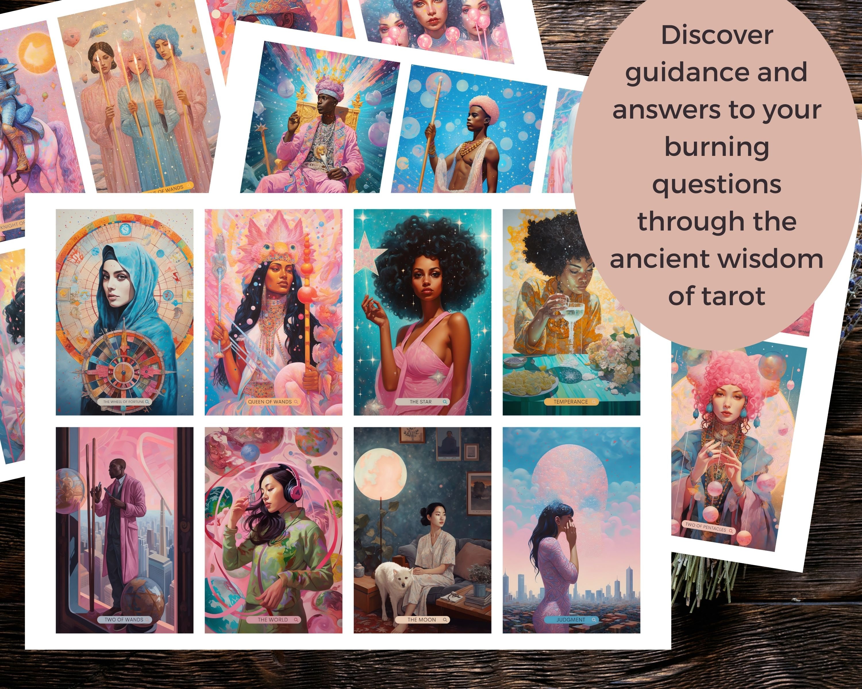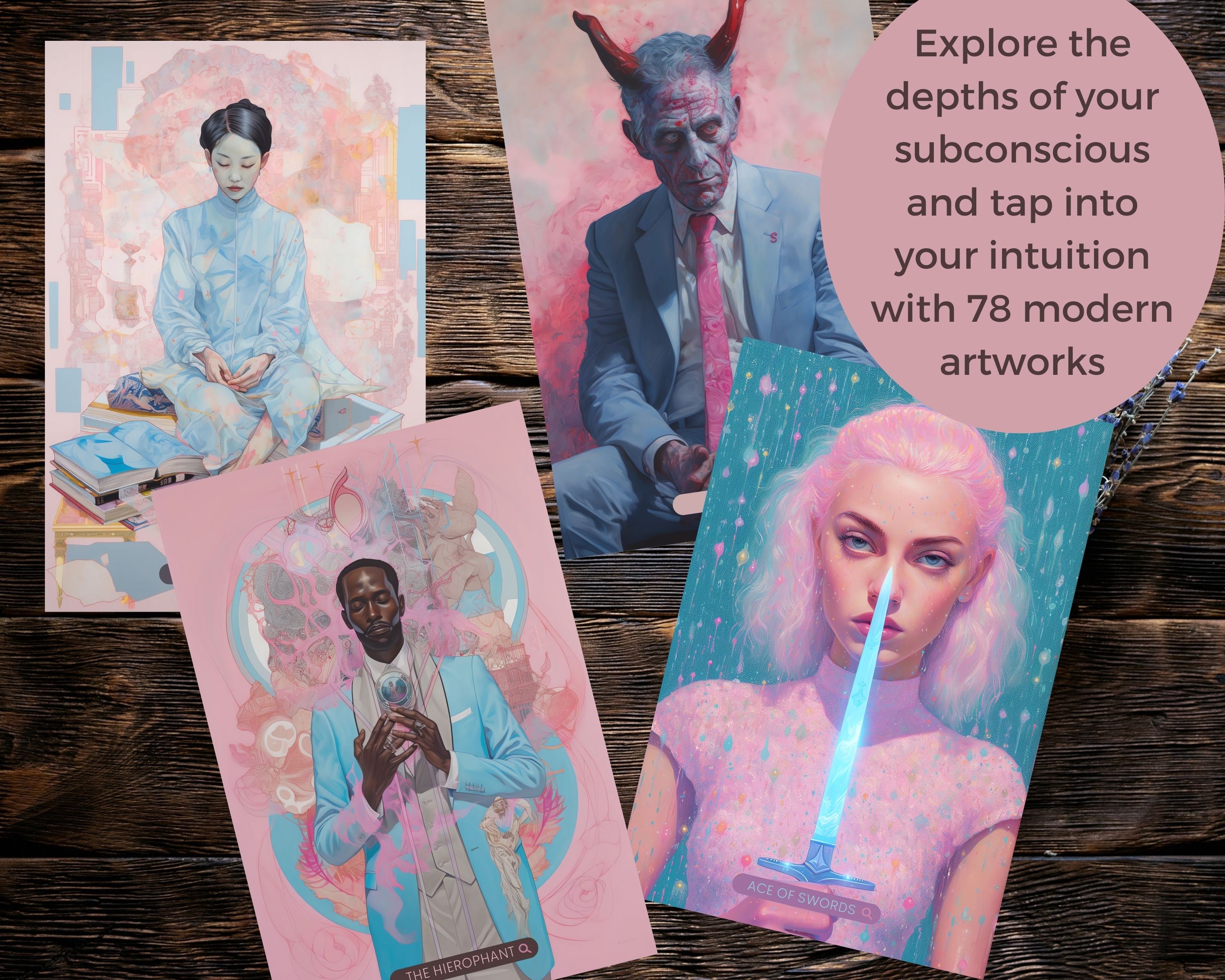 This exquisite set features 78 modern artworks, each beautifully crafted to captivate your imagination and illuminate the hidden realms of your psyche.
