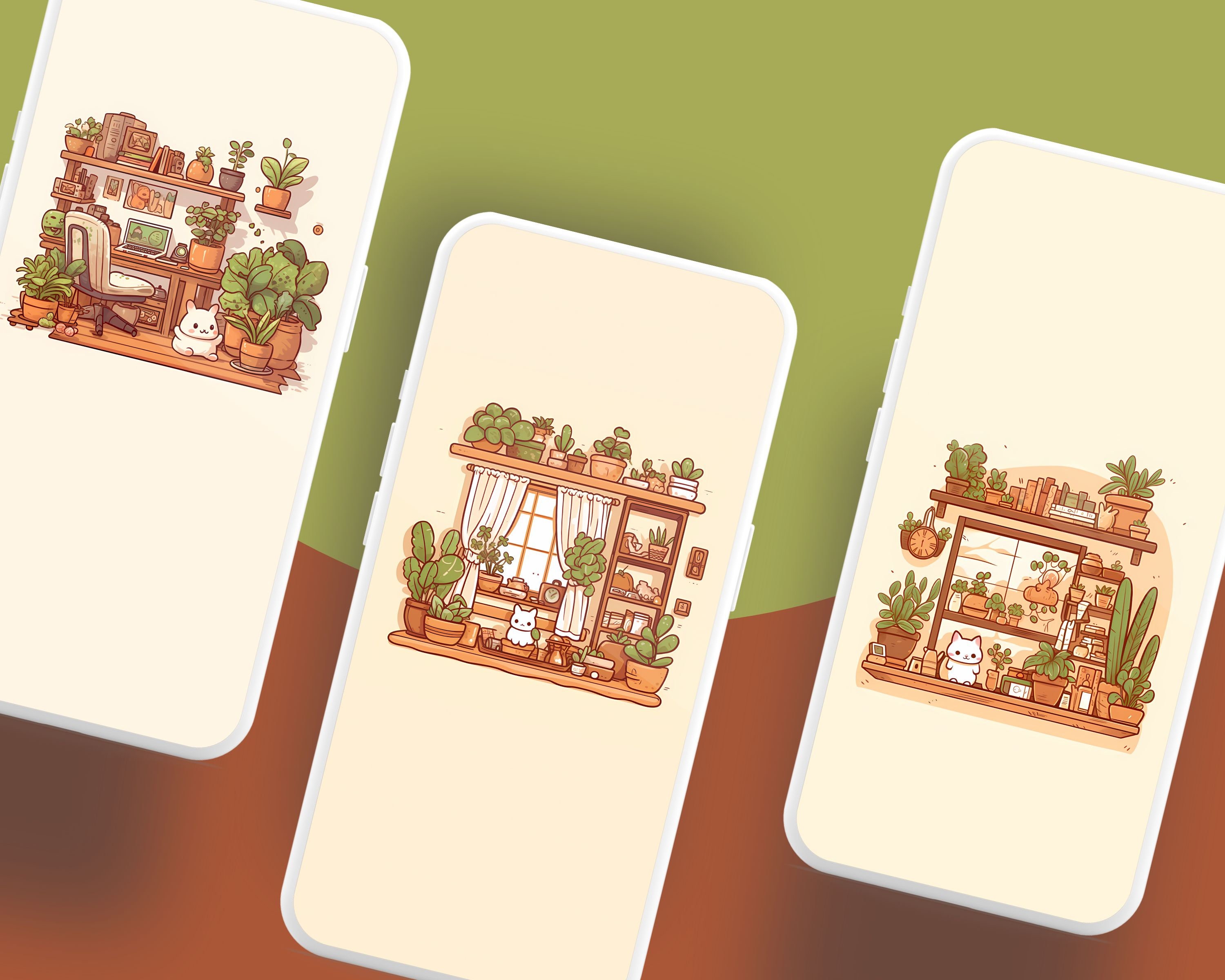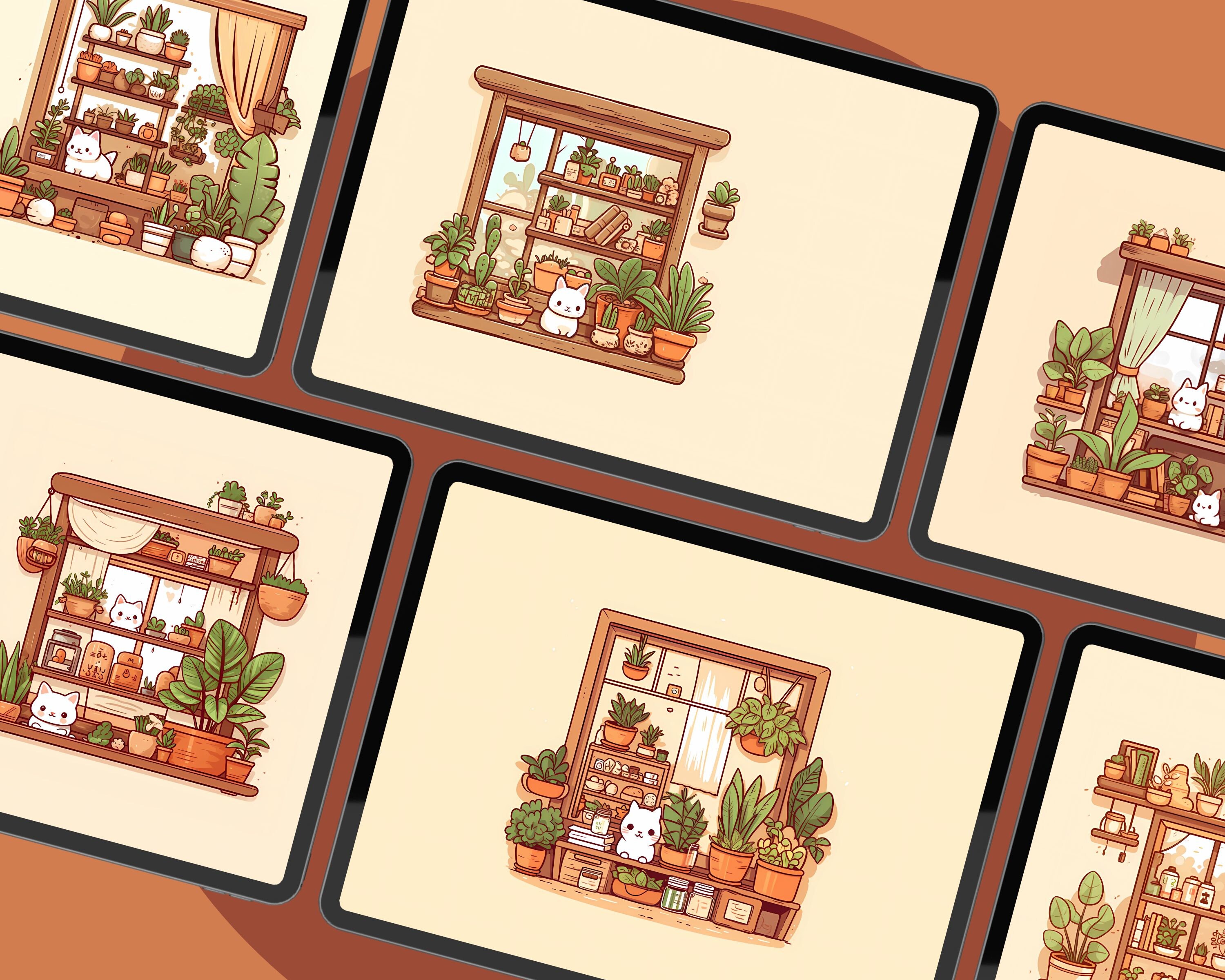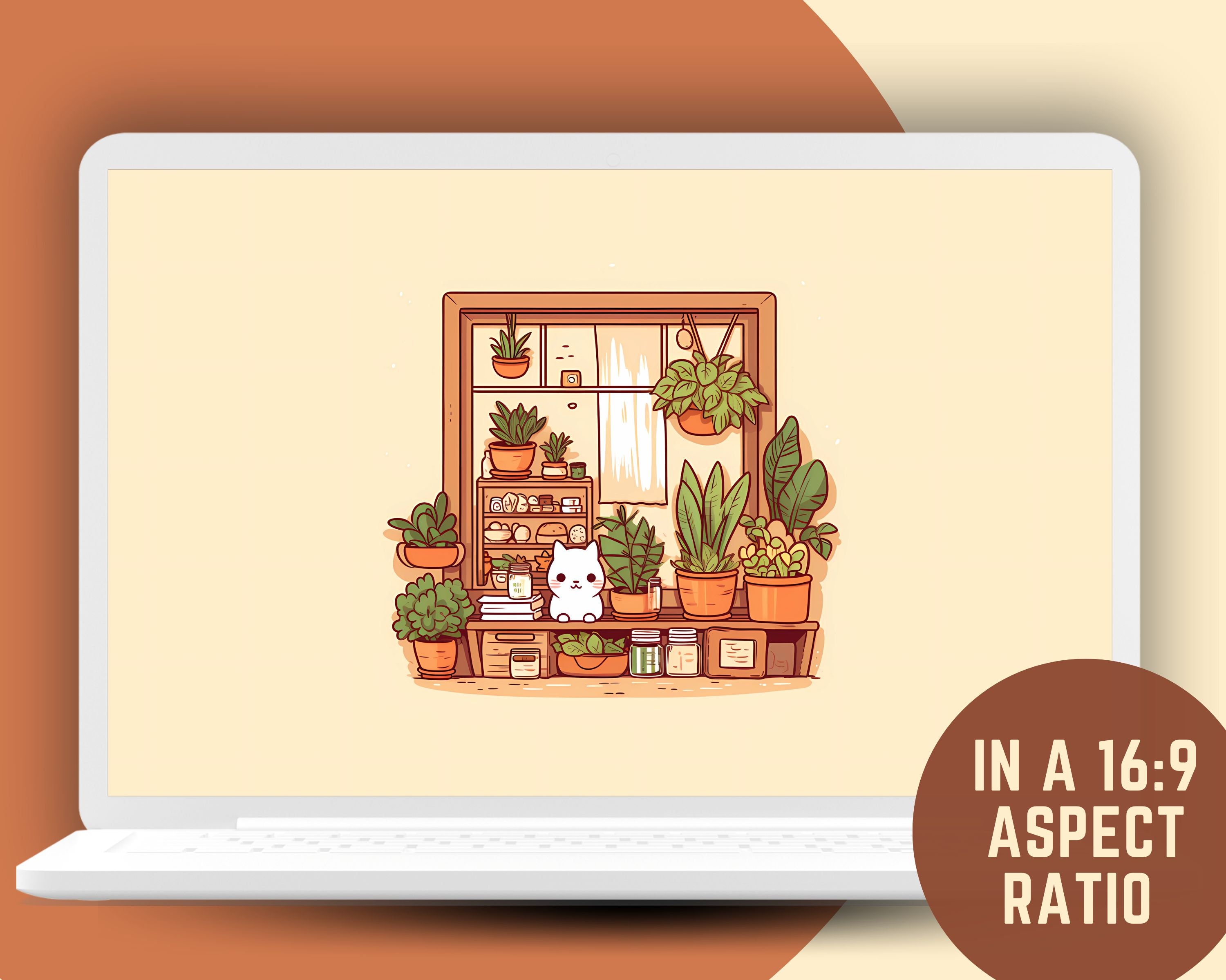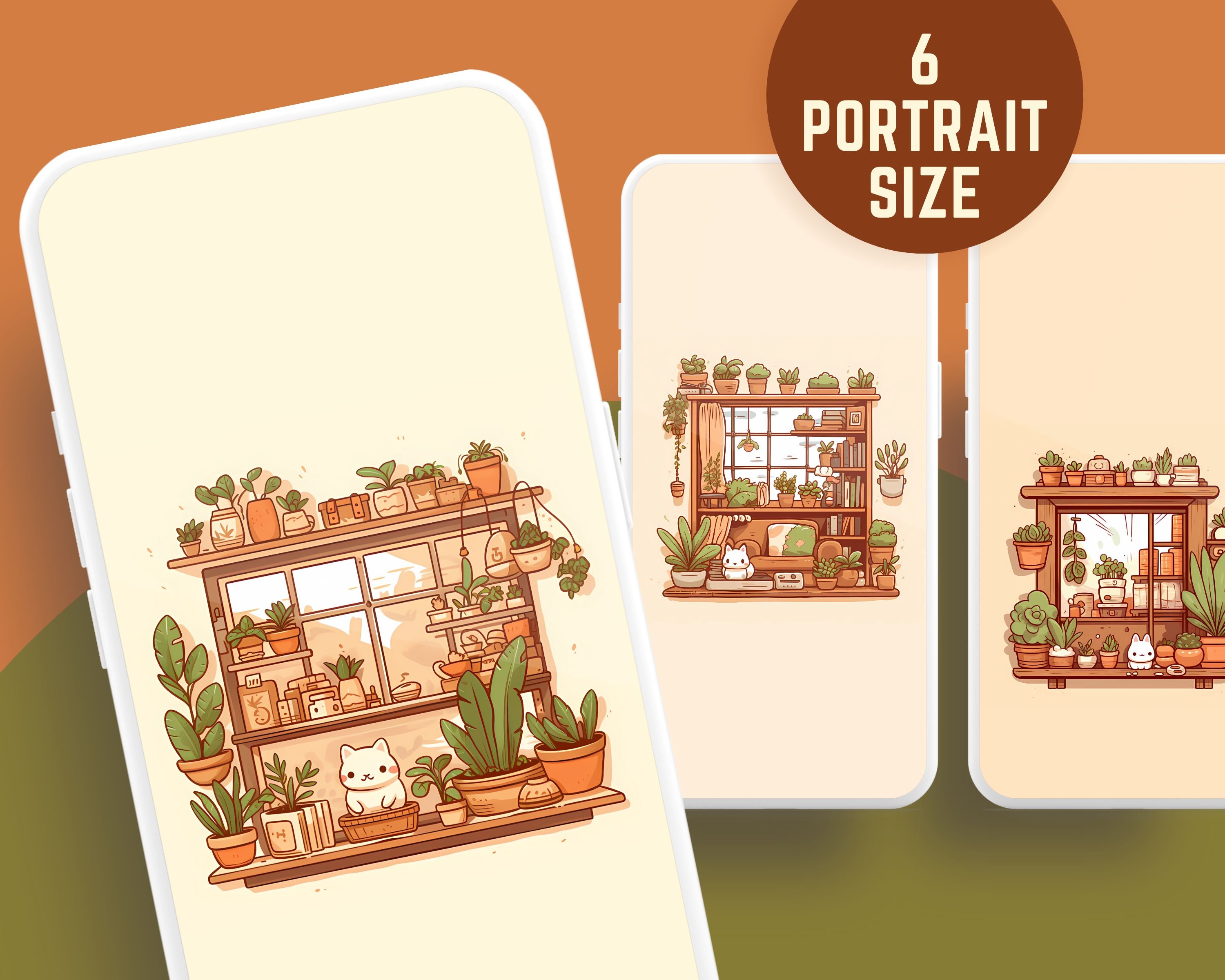 Bring a touch of magic to your devices with this set of 12 Studio kawaii Cats, plants and books cozy wallpapers! Featuring cute cats in cozy settings, these high-res JPG files will fit perfectly on your phone or computer/tablet screens.