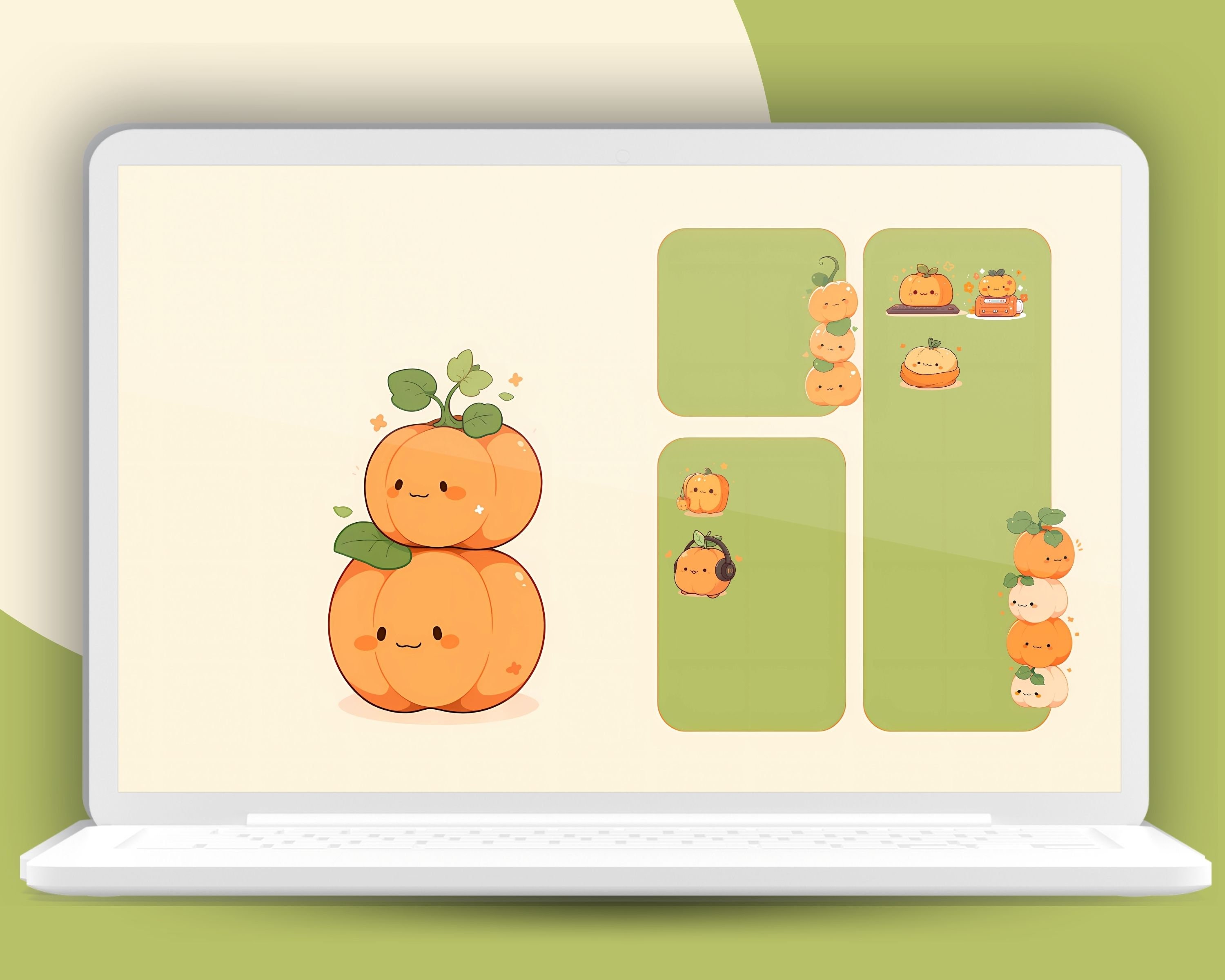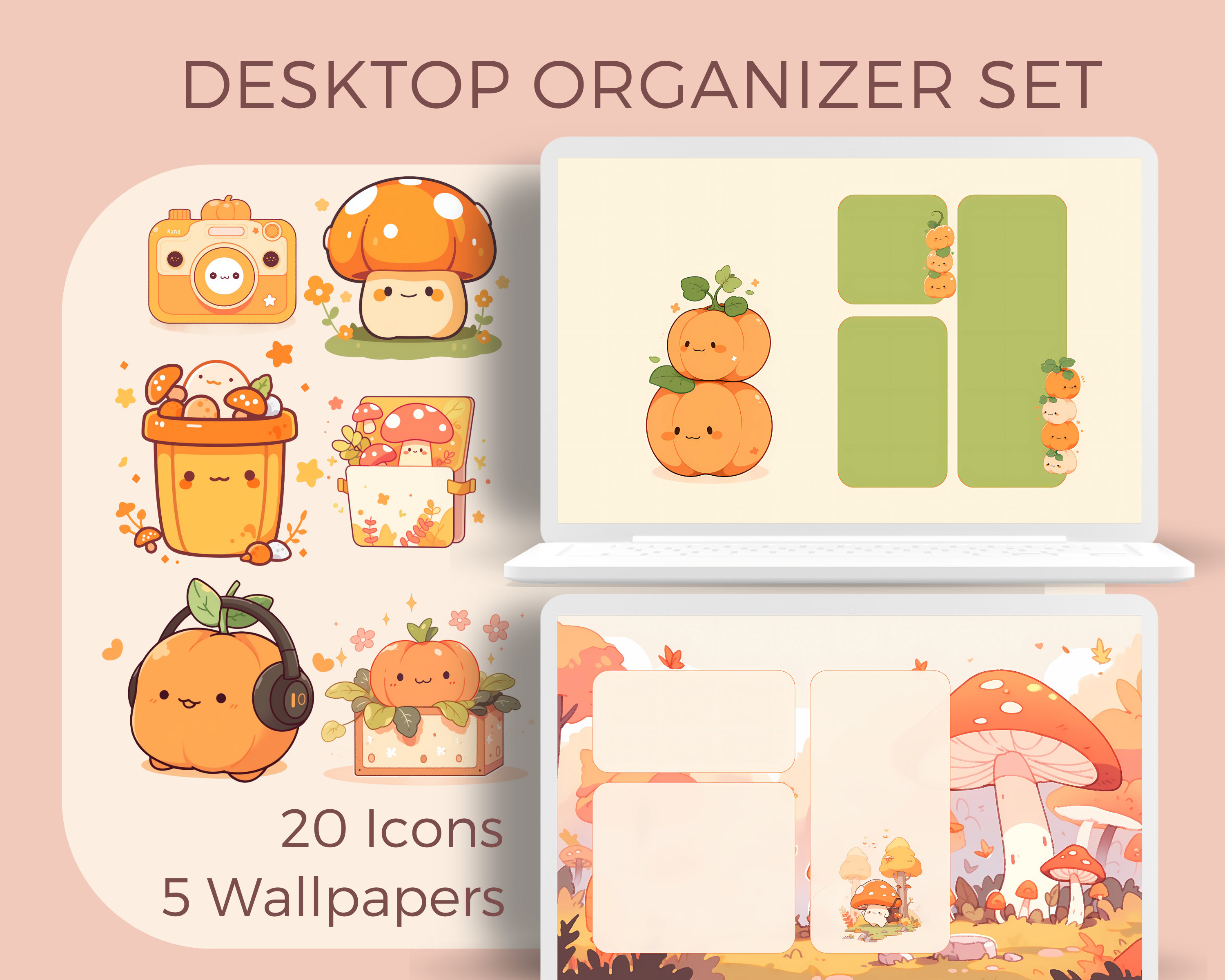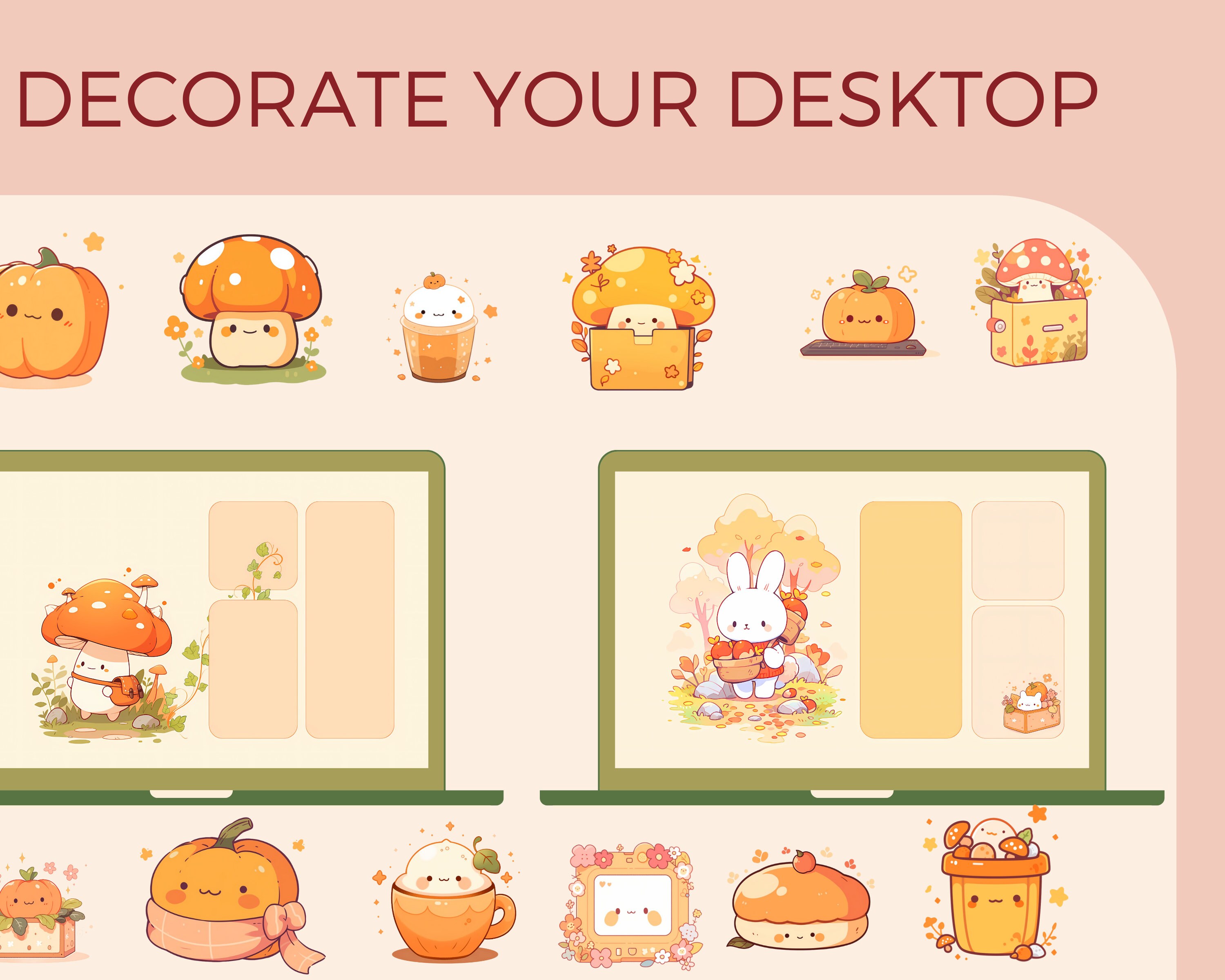 Kawaii Autumn Desktop Organizer Set: Pumpkin Icons & Wallpapers (Digital Download)