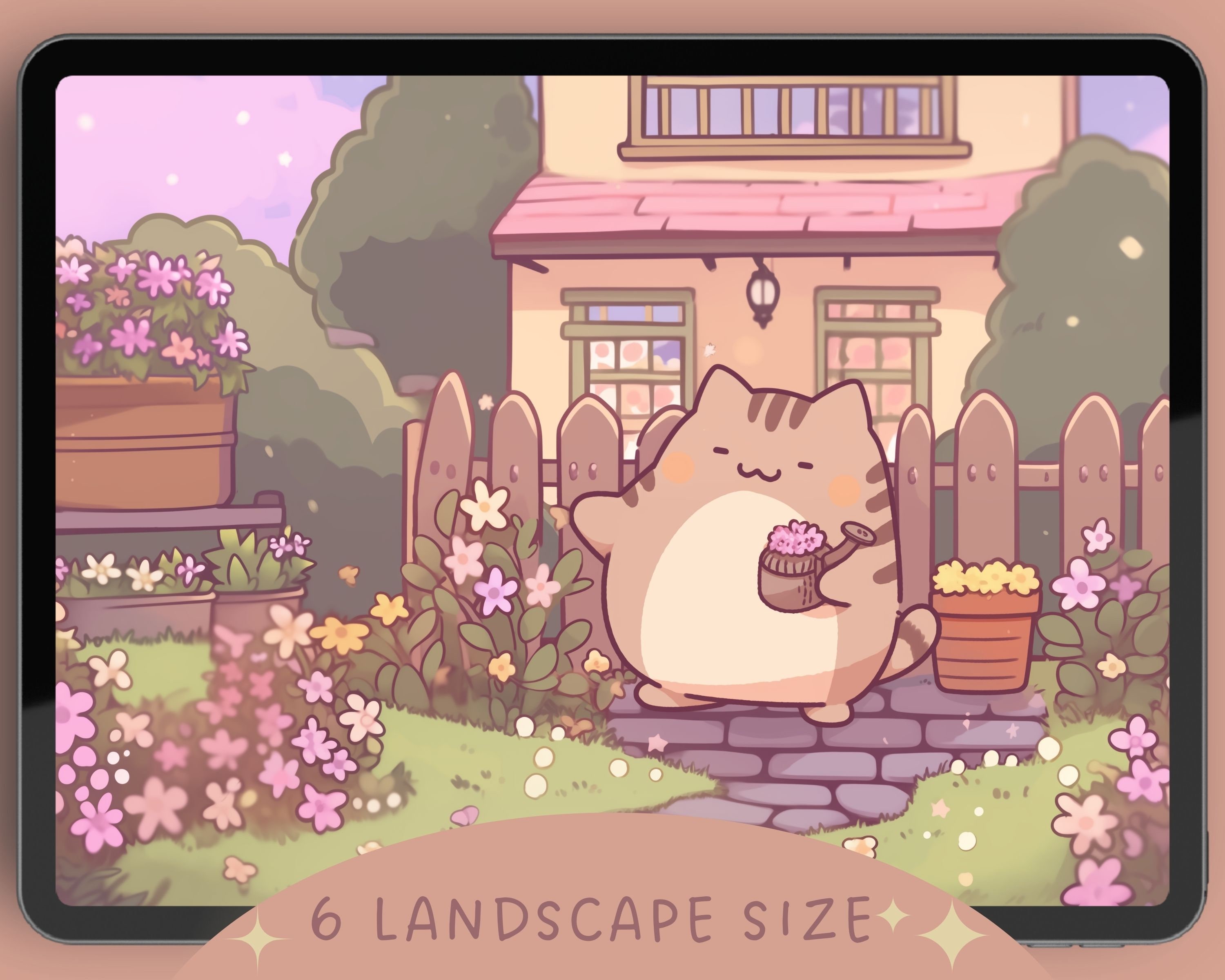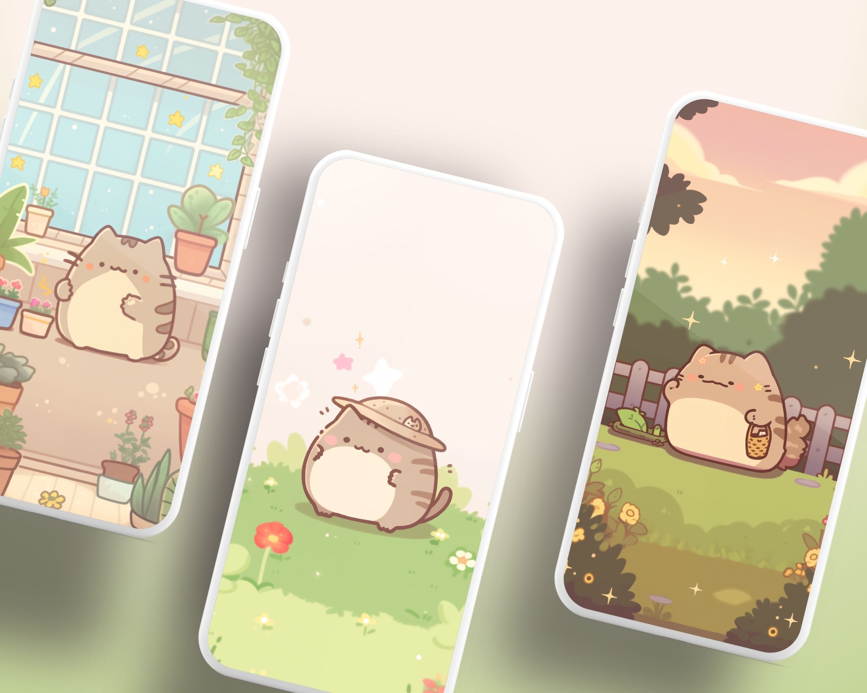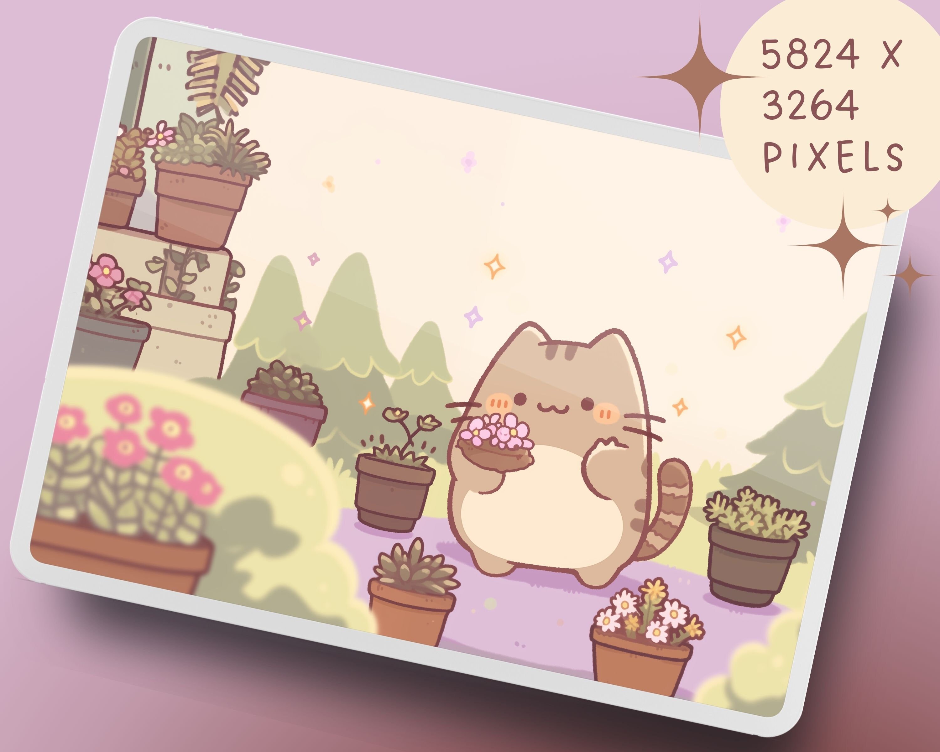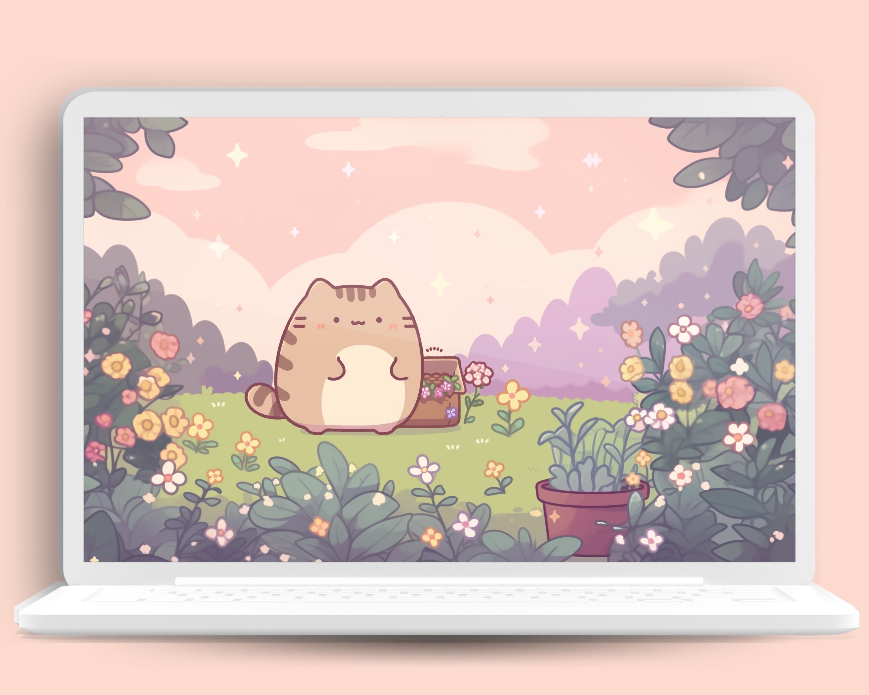 Kawaii Garden Cat Wallpaper: Pastel Pink Screensaver (Digital Download)