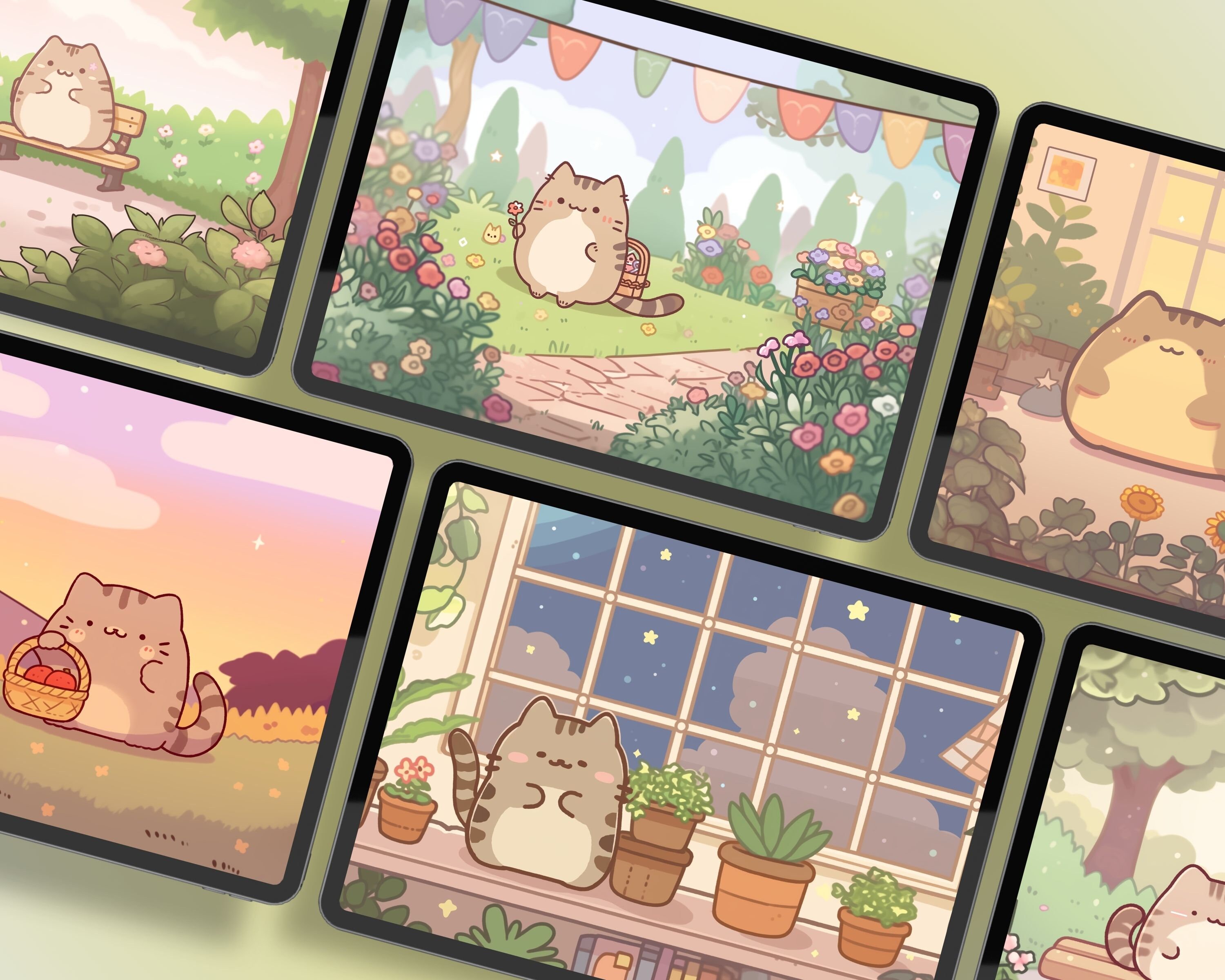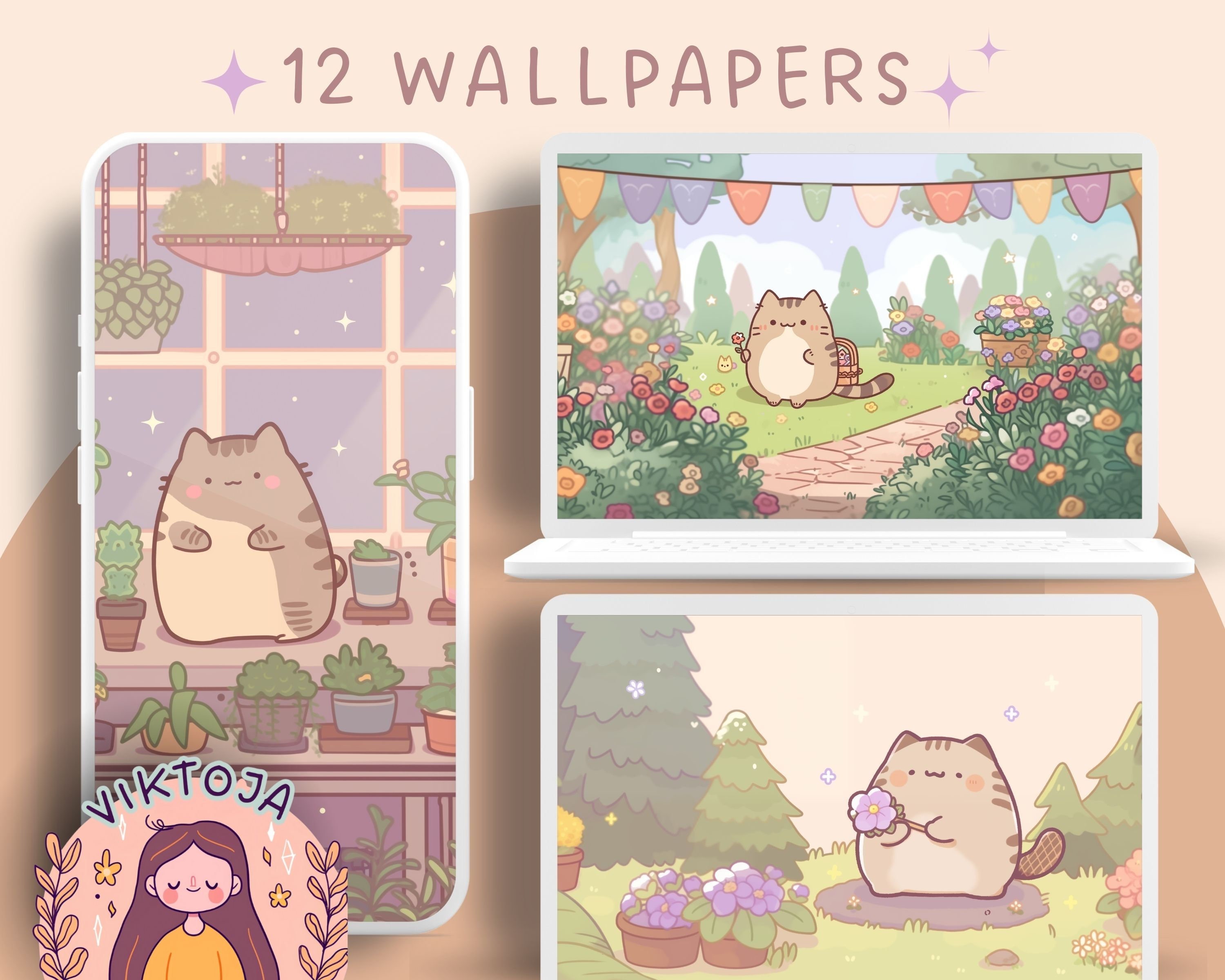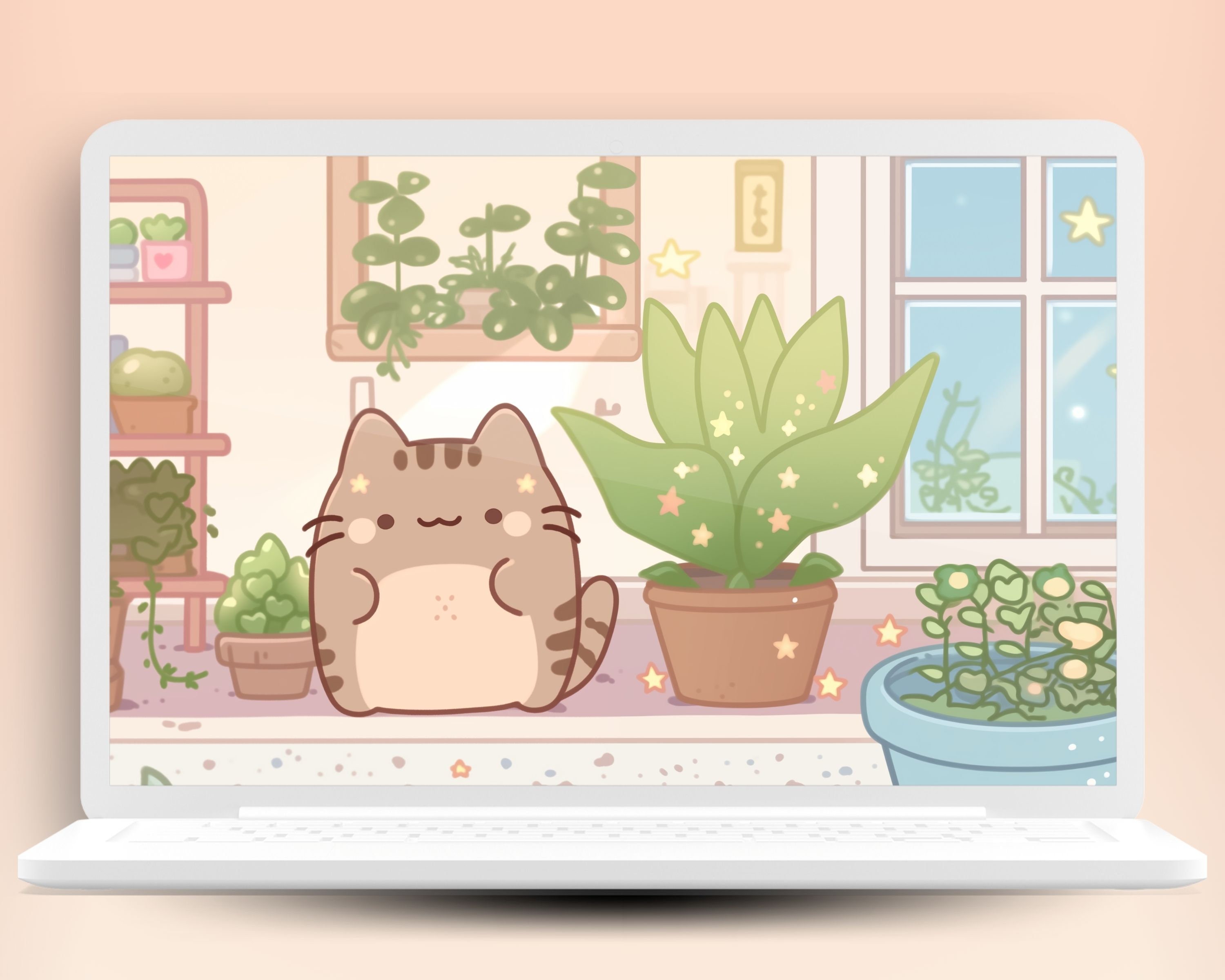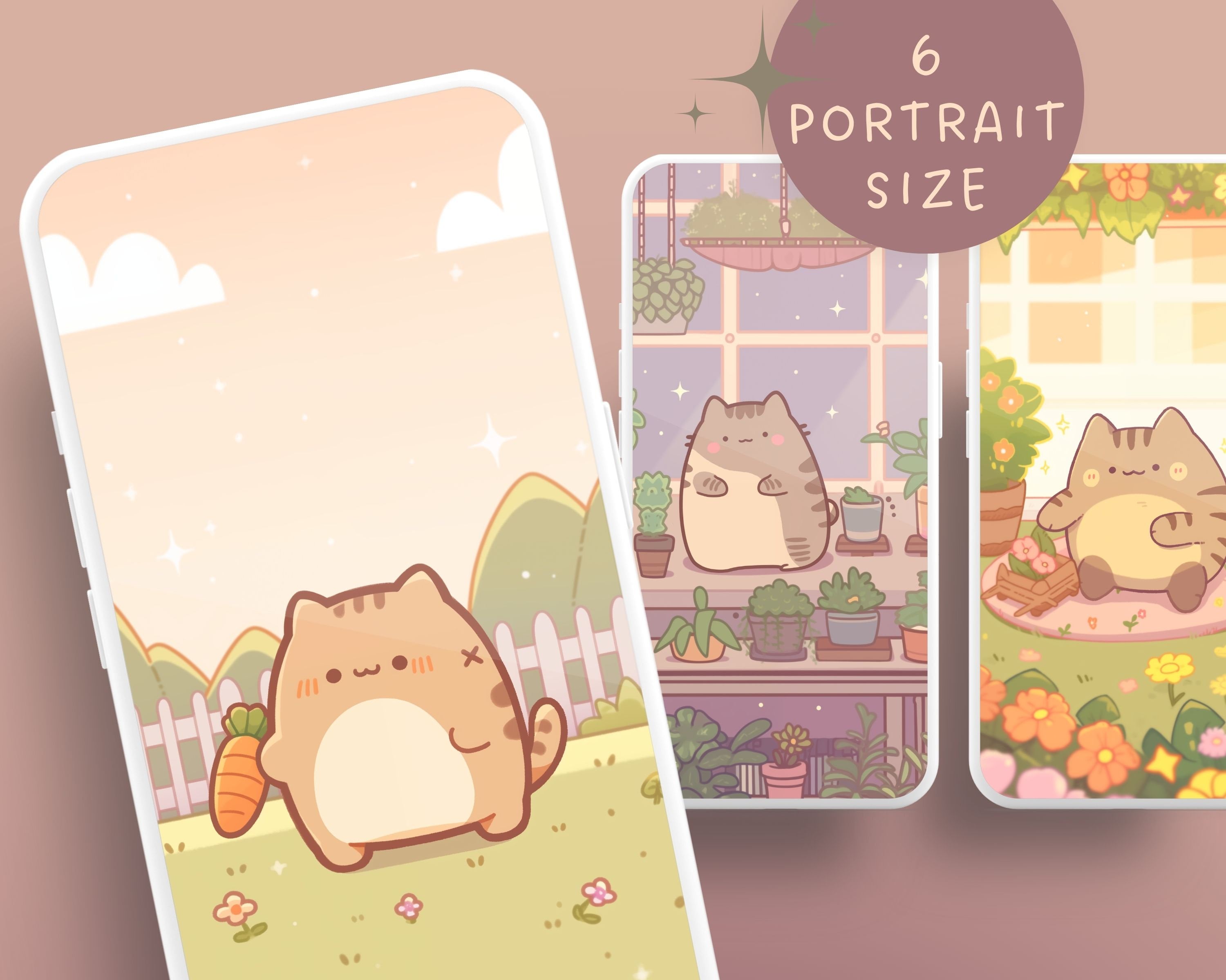 Kawaii Garden Cat Wallpaper: Pastel Pink Screensaver (Digital Download)