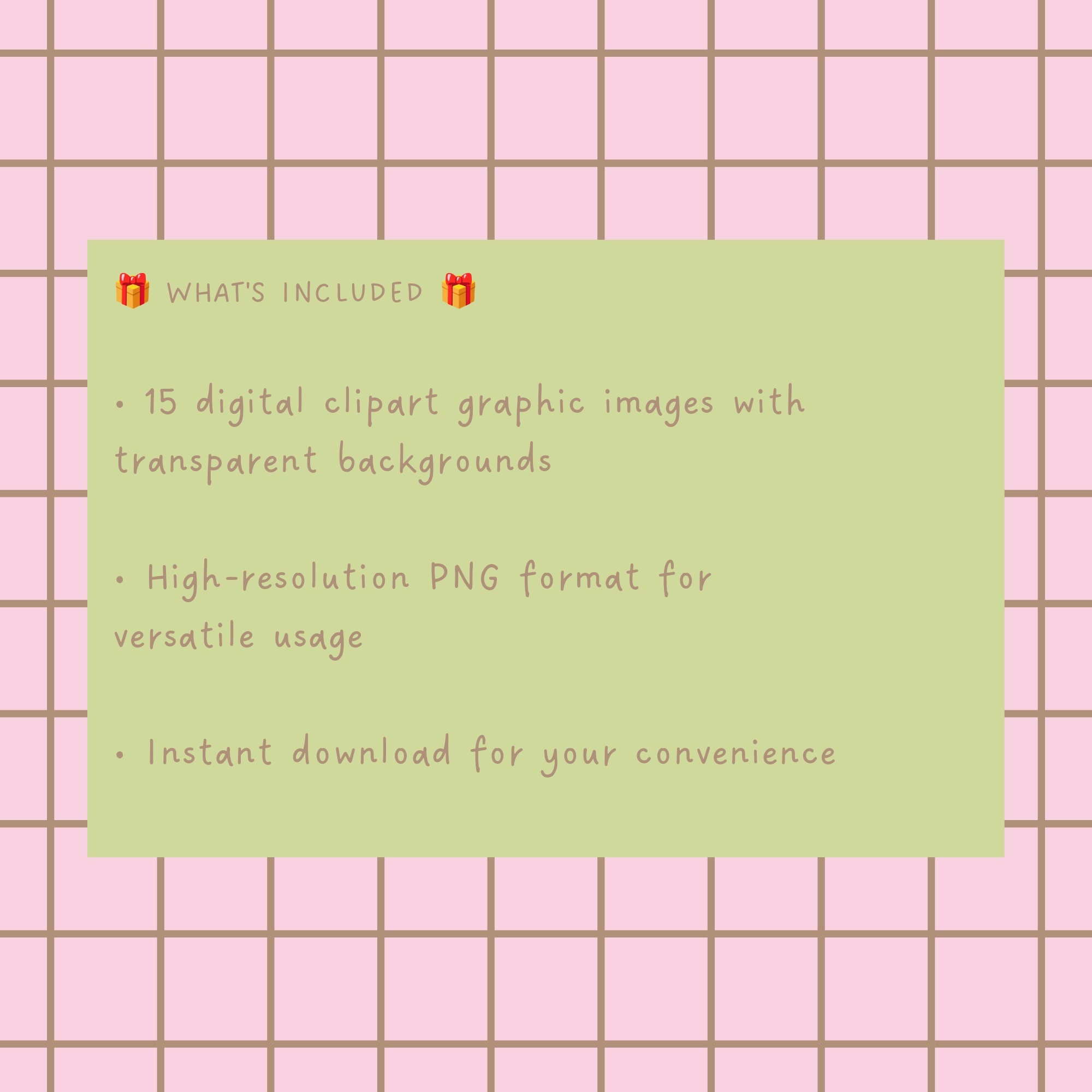 Featuring 15 lovable characters, these high-quality illustrations are perfect for bringing a touch of whimsy to your creative projects. With PNG format included, you'll have the flexibility to use them in various ways. Let your imagination soar as you craft personalized cards, invitations, digital designs, and more!