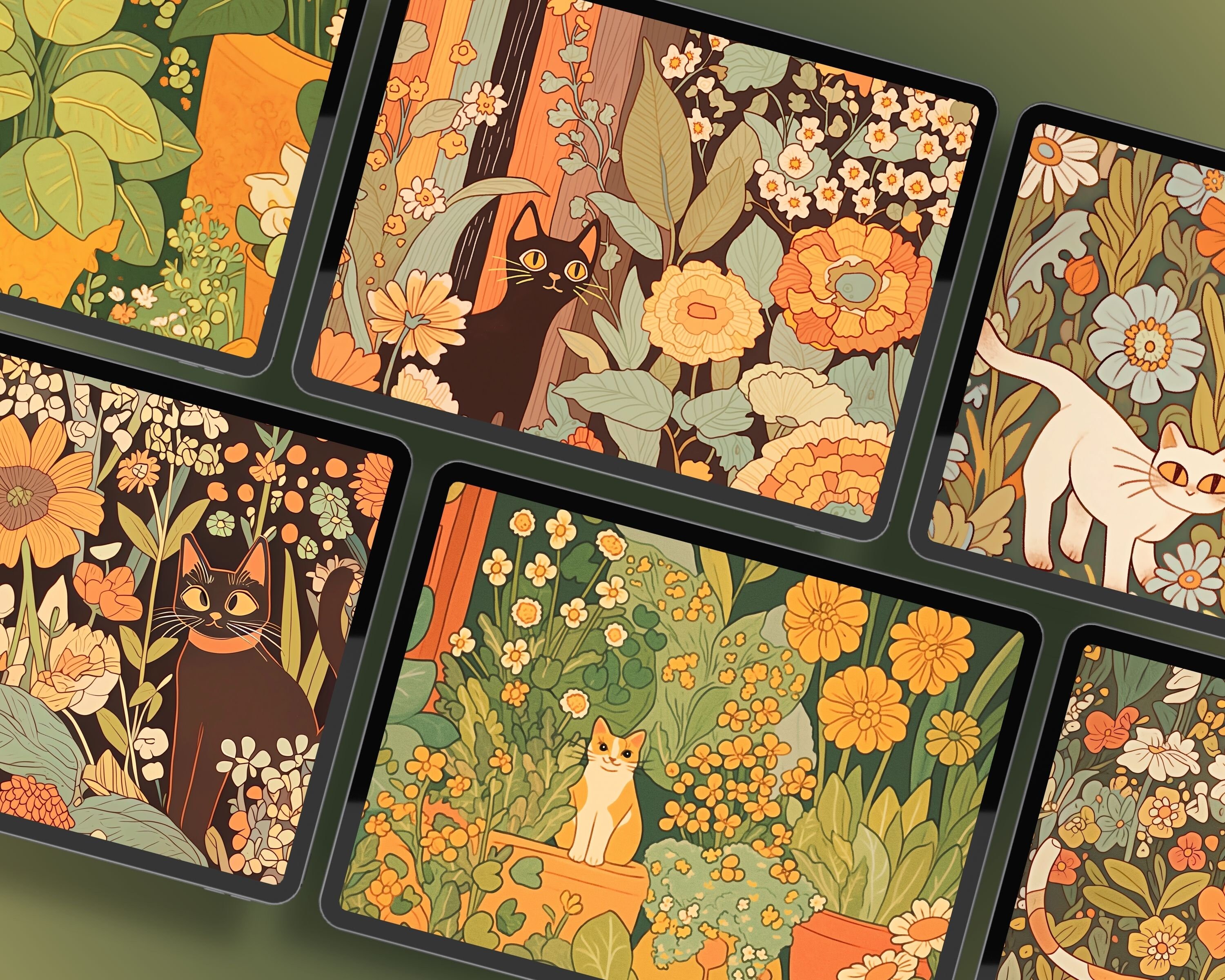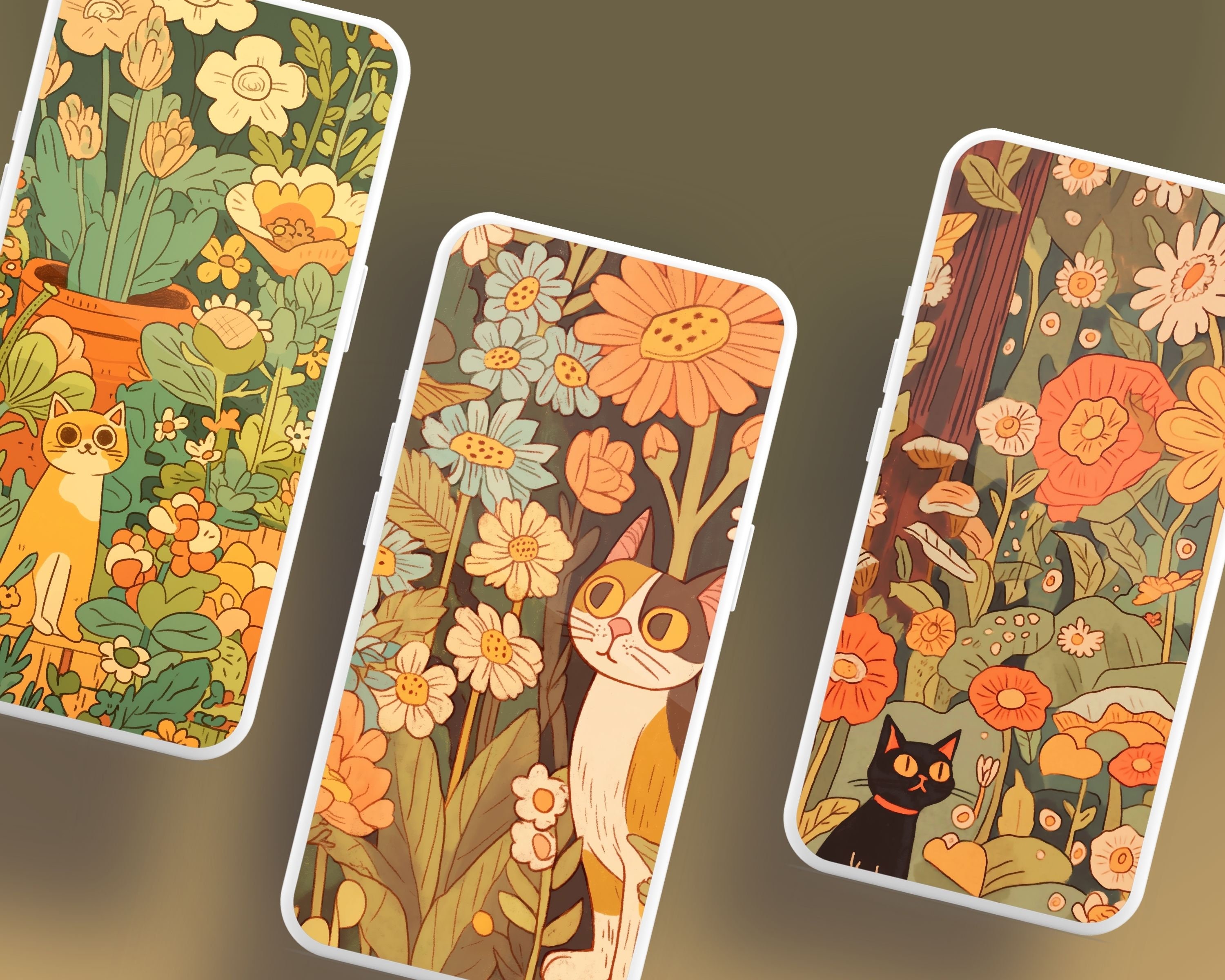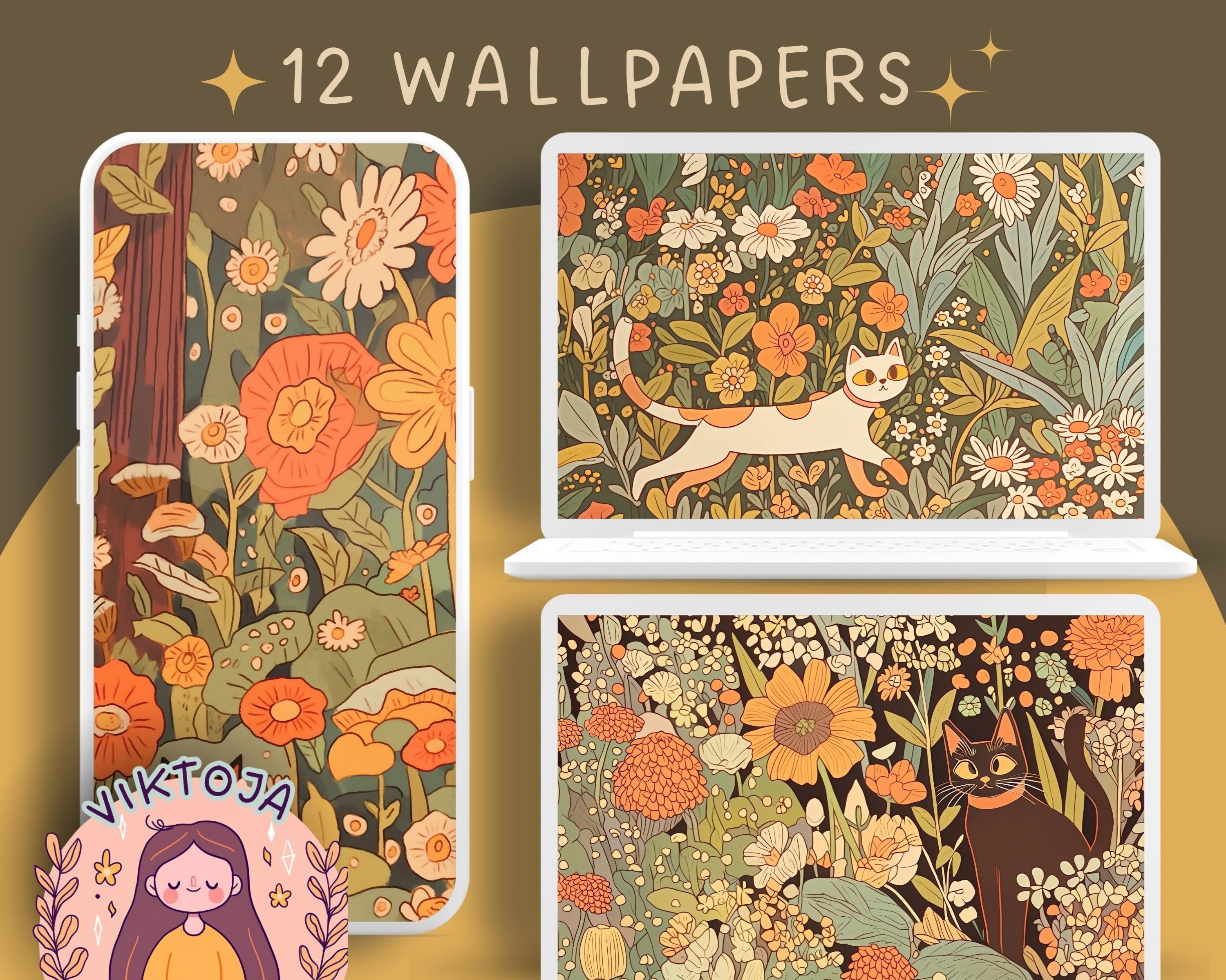Cottagecore Cats Wallpaper Bundle: Cozy Floral Backgrounds (Digital Download)