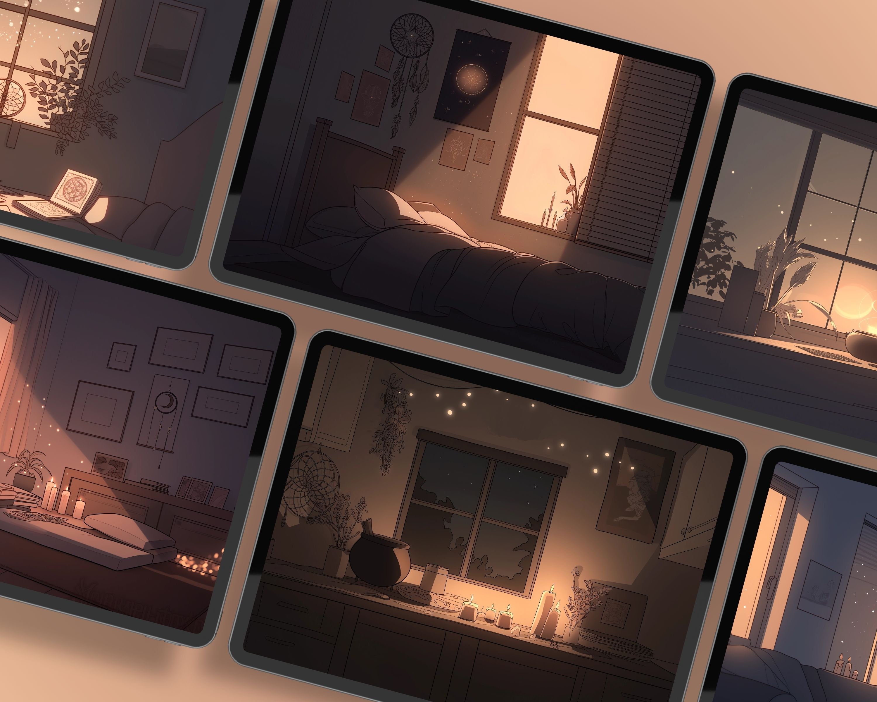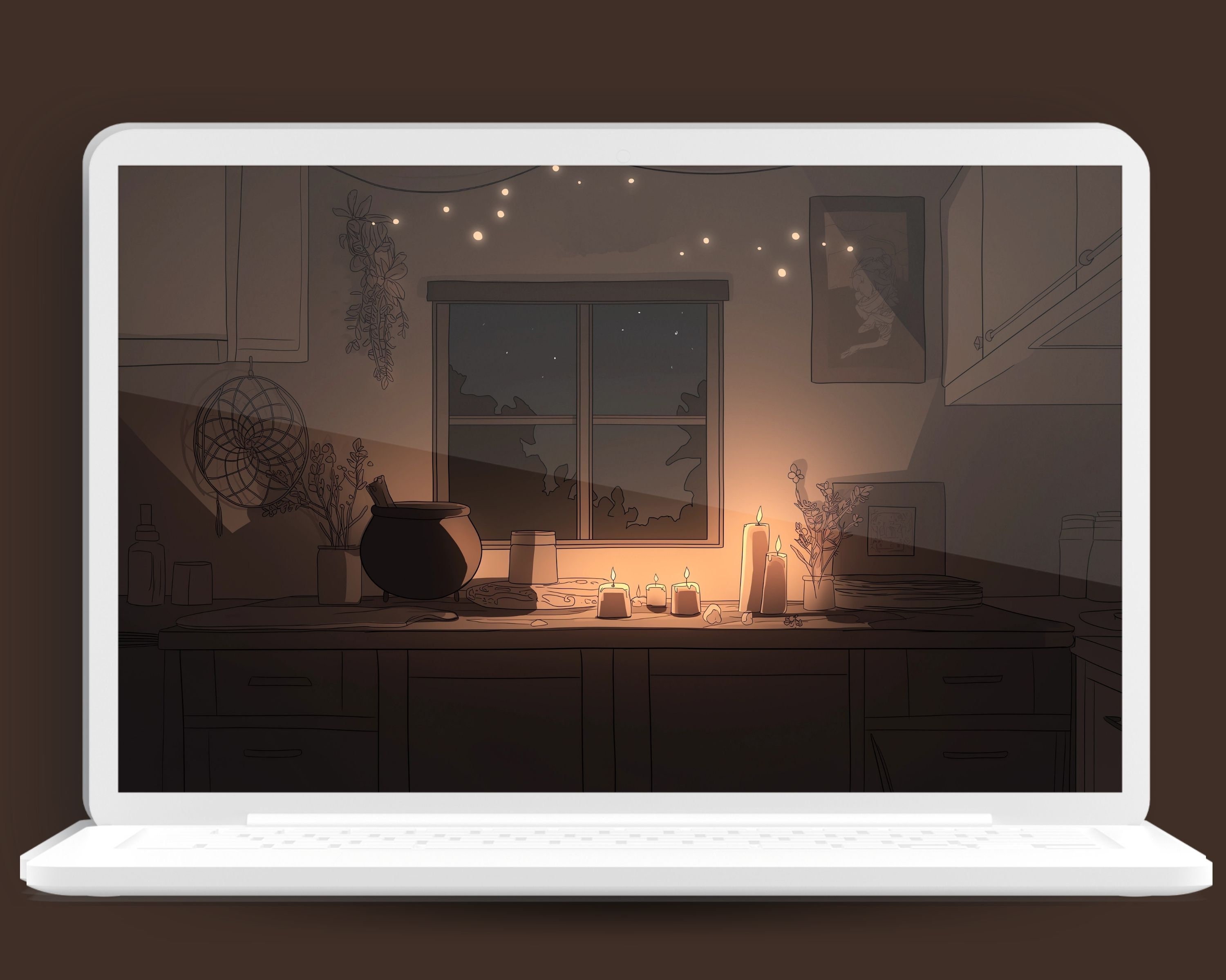 Bring a touch of coziness to your devices with this set of 12 witchy room wallpapers! Featuring beautiful aesthetic scenes these high-res JPG files will fit perfectly on your phone or computer/tablet screens.