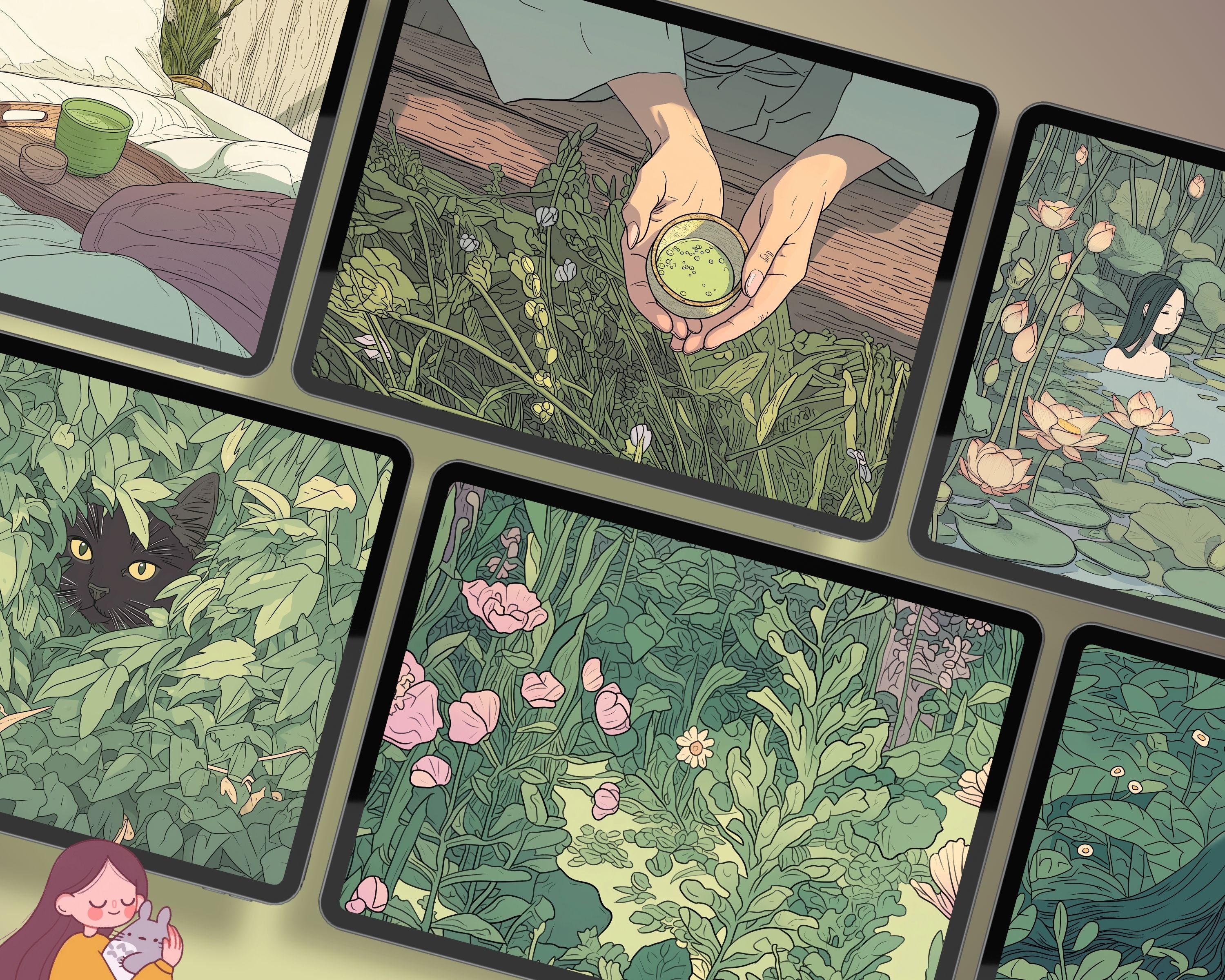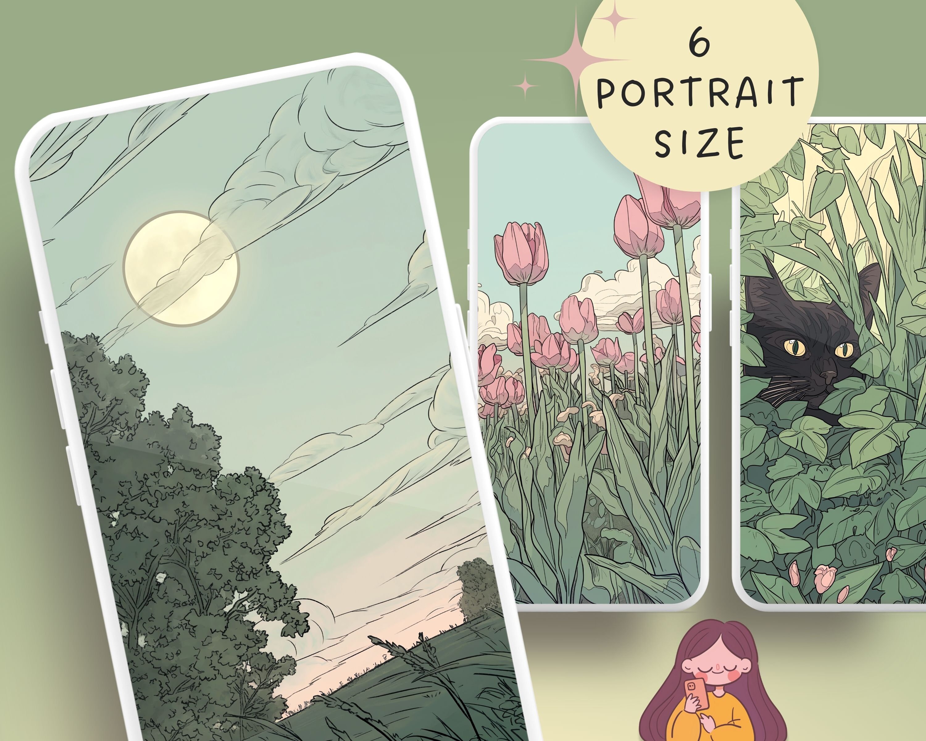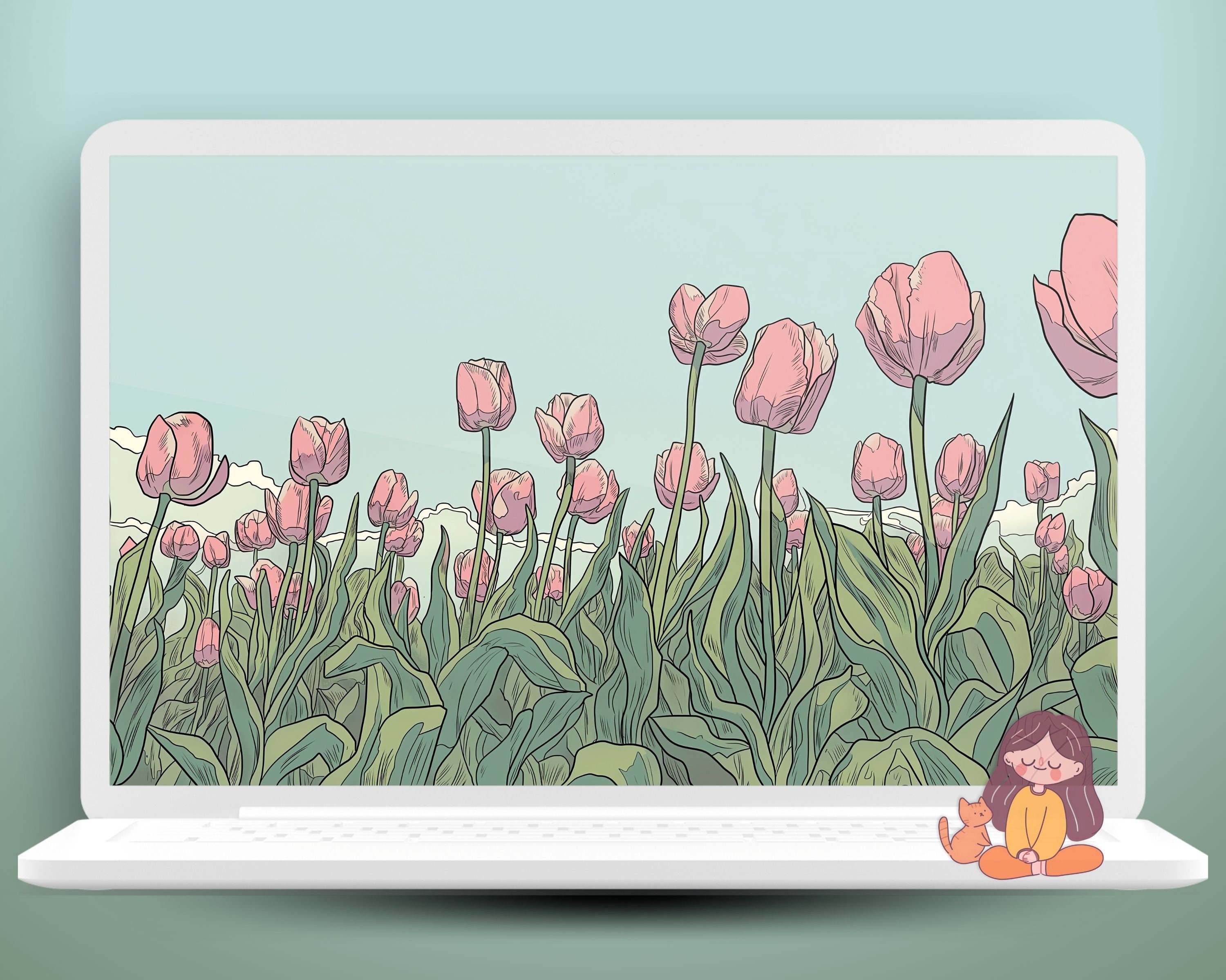 Matcha Green Aesthetic Wallpaper: Lofi Anime, Cute Cat, Tulips (Digital Download)
