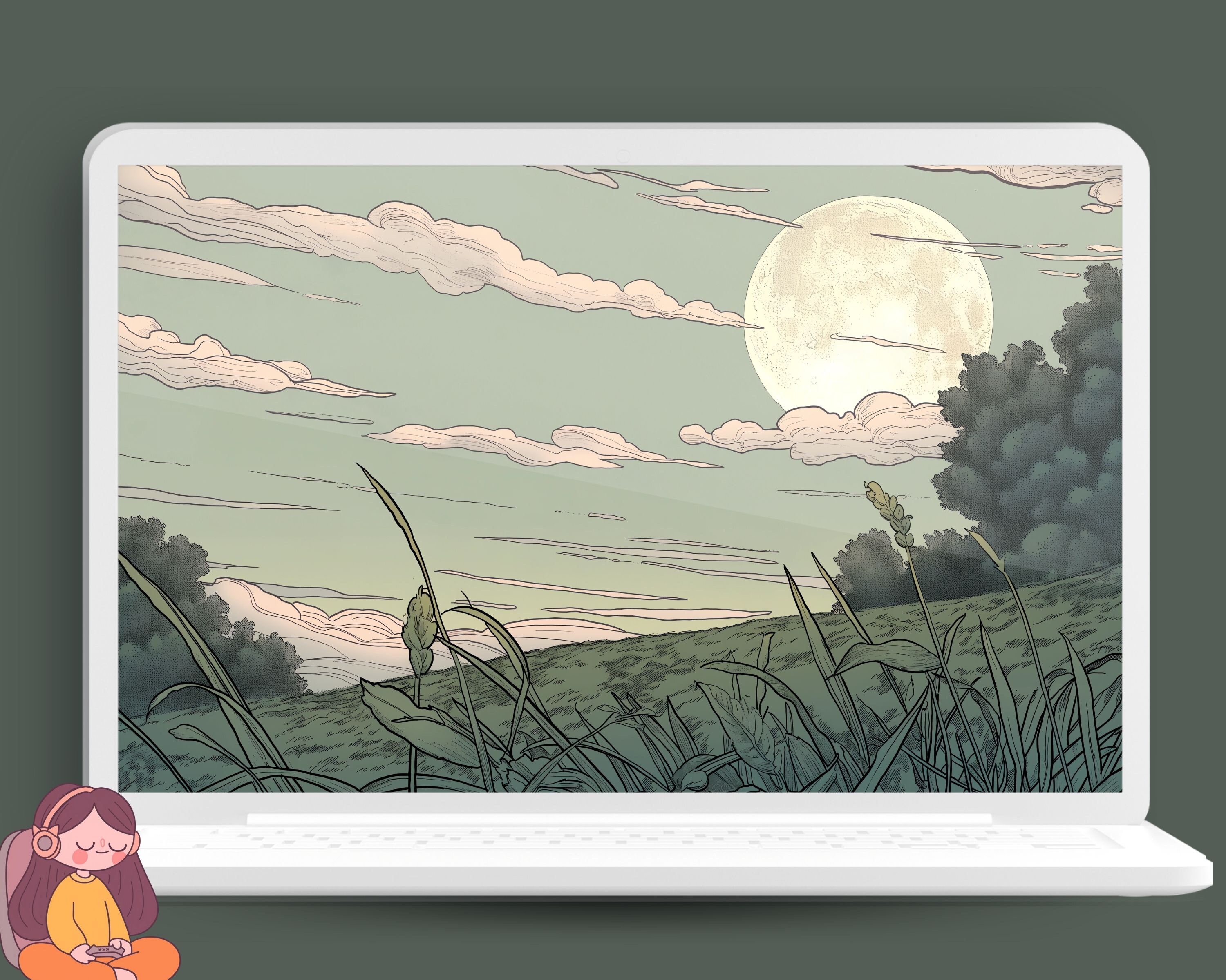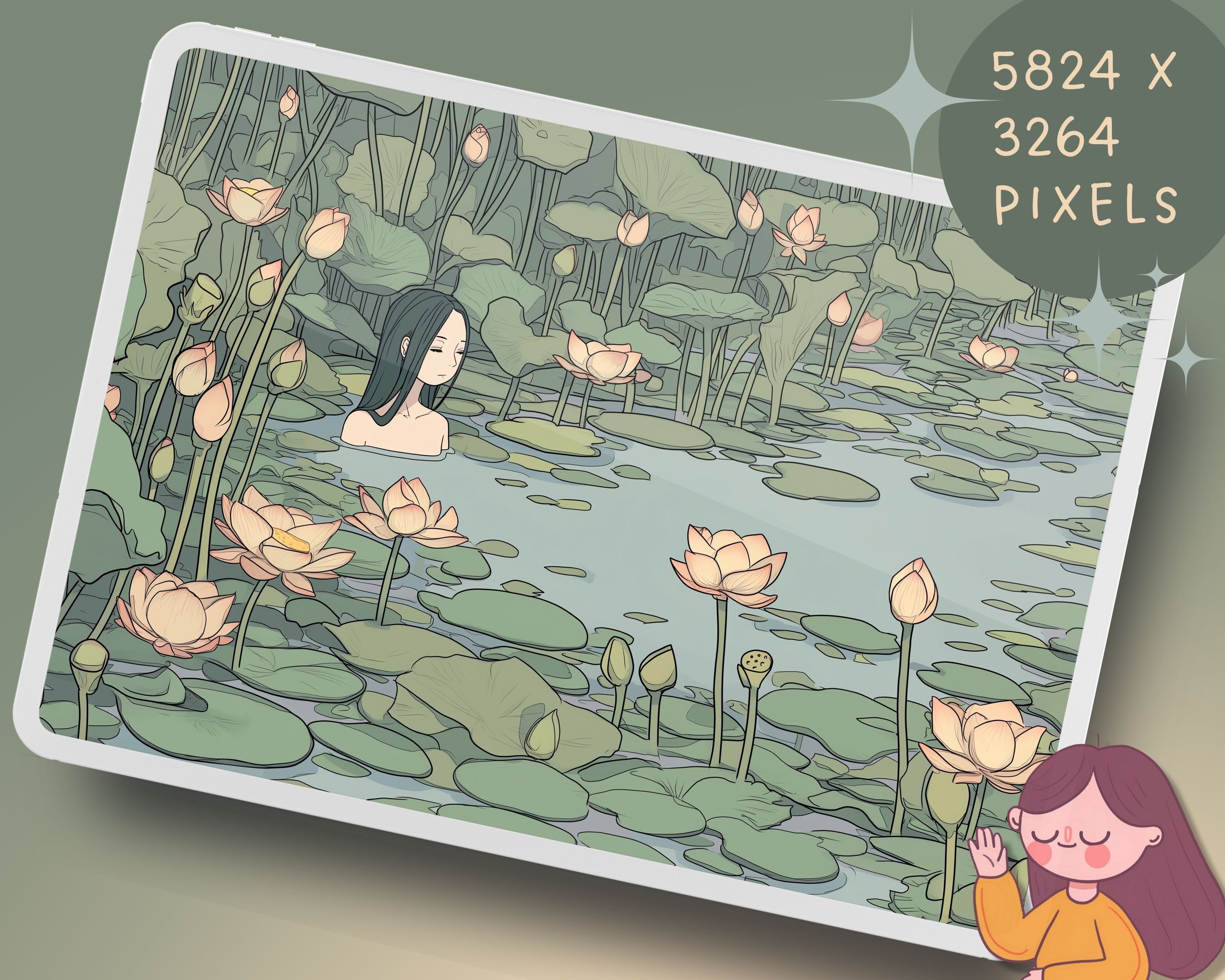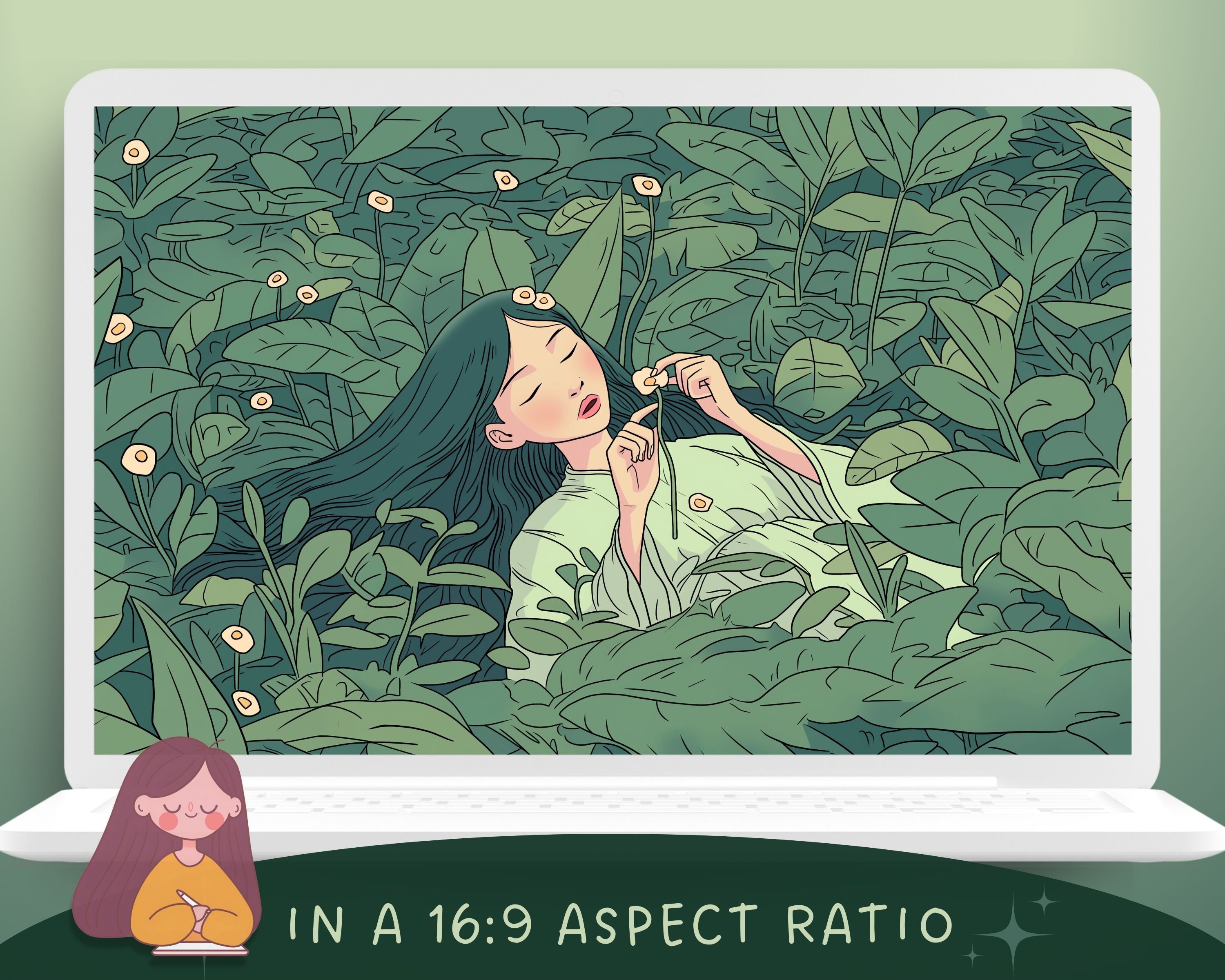 Matcha Green Aesthetic Wallpaper: Lofi Anime, Cute Cat, Tulips (Digital Download)