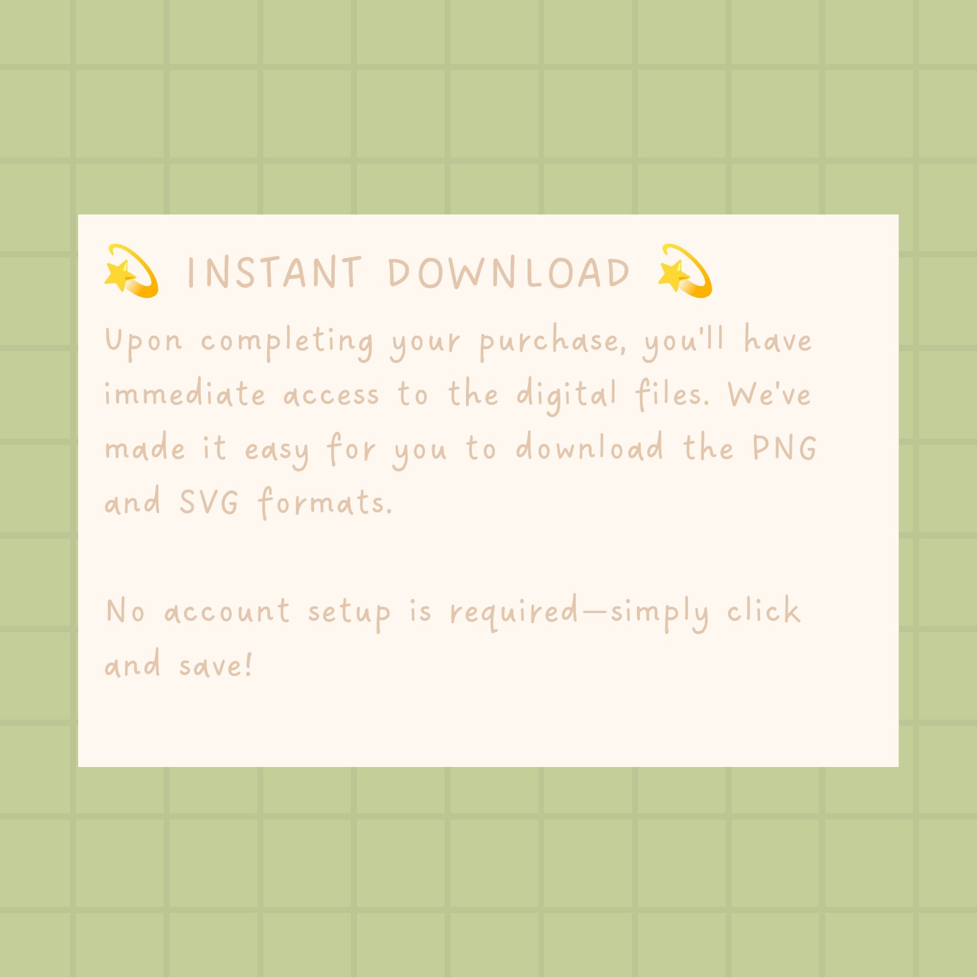 Upon completing your purchase, you'll have immediate access to the digital files. We've made it easy for you to download the PNG and SVG formats. No account setup is required—simply click and save!