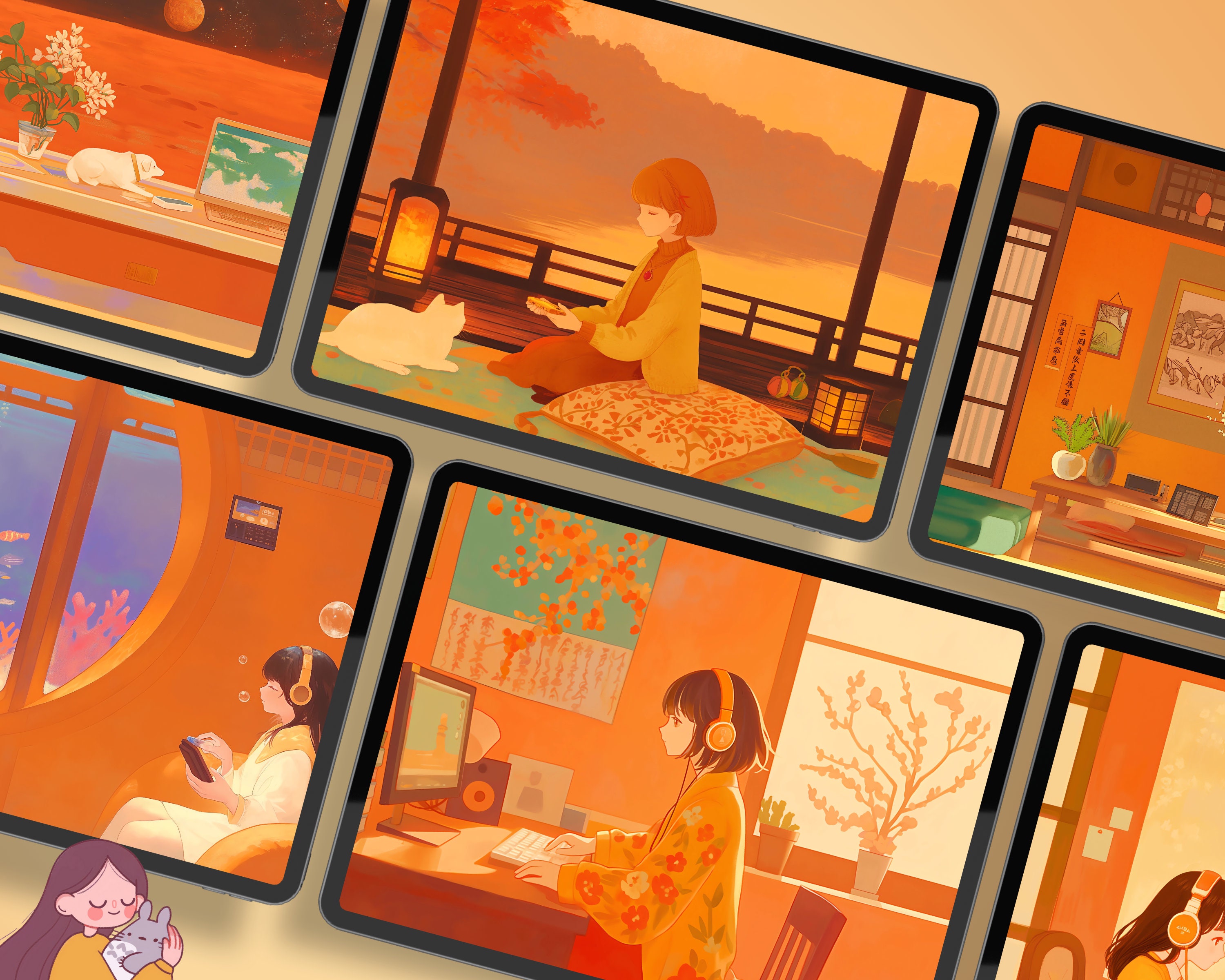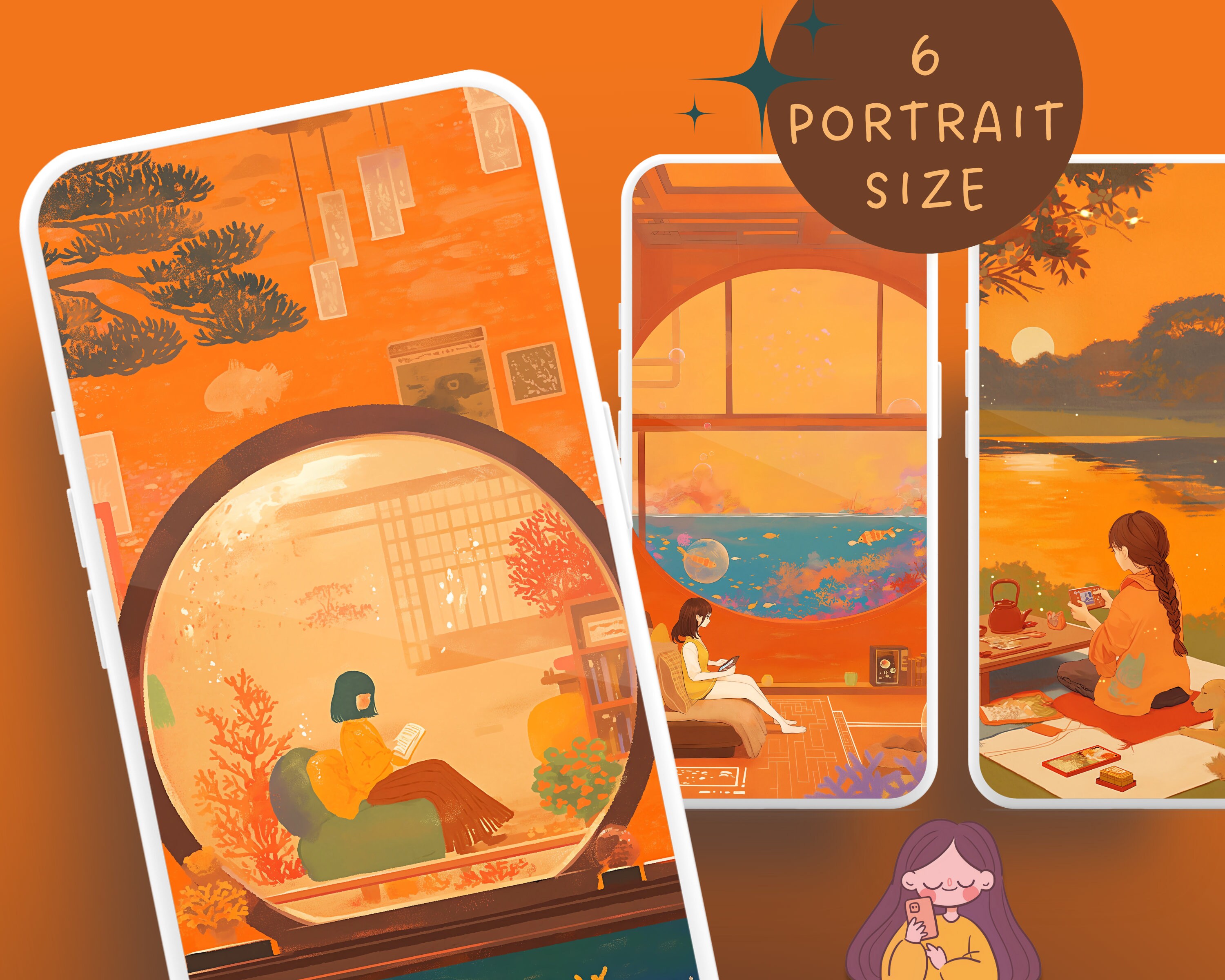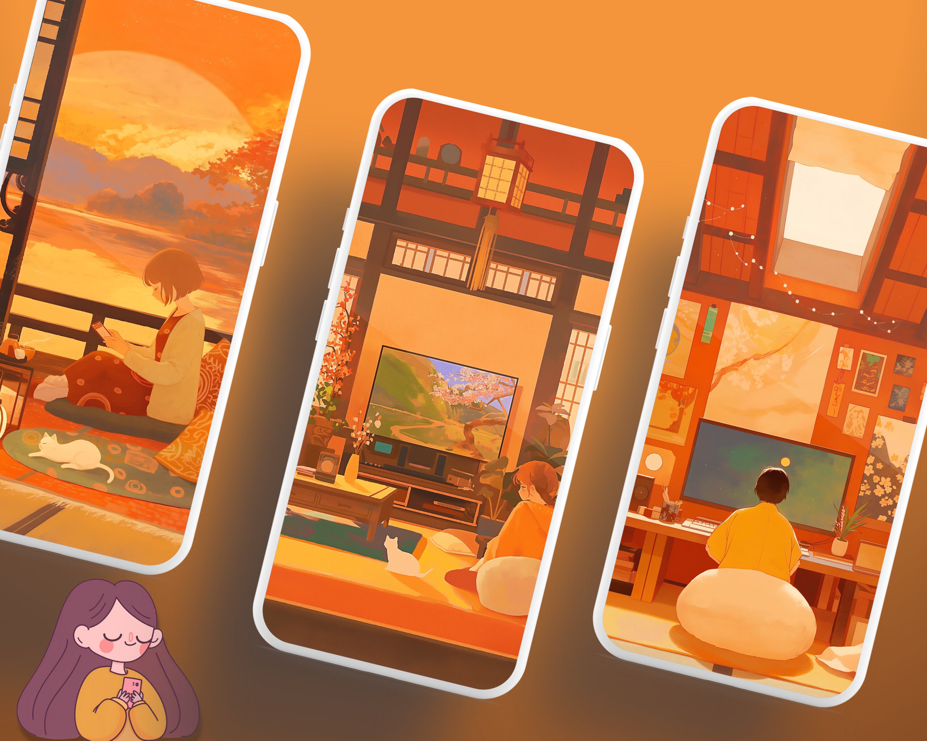 Bring a touch of coziness to your devices with this set of 12 orange dreamy pastel wallpapers! Featuring beautiful aesthetic scenes these high-res JPG files will fit perfectly on your phone or computer/tablet screens.