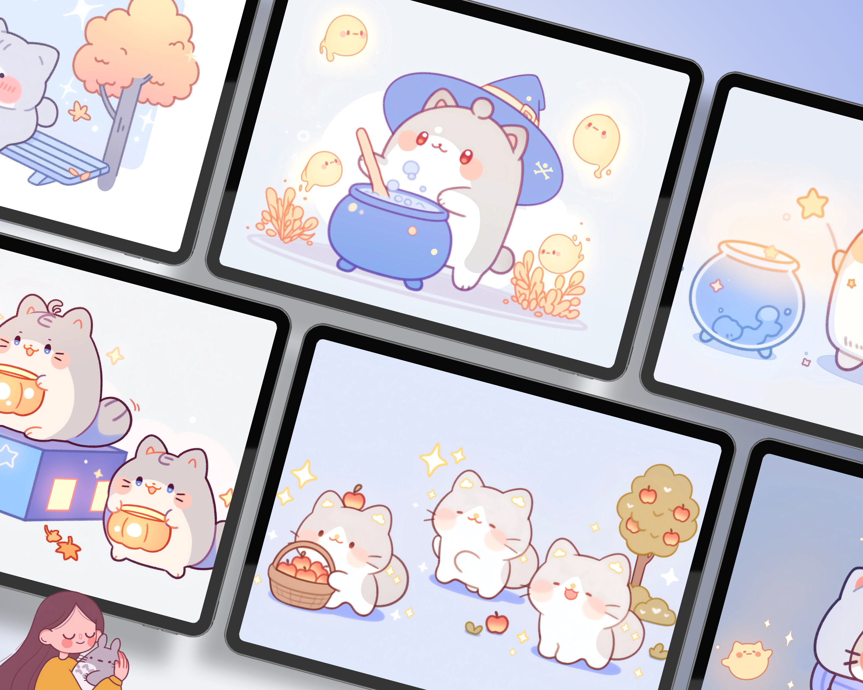 Bring a touch of magic to your devices with this set of 12 pumpkin cats wallpapers! These high-res JPG files will fit perfectly on your phone or computer/tablet screens.