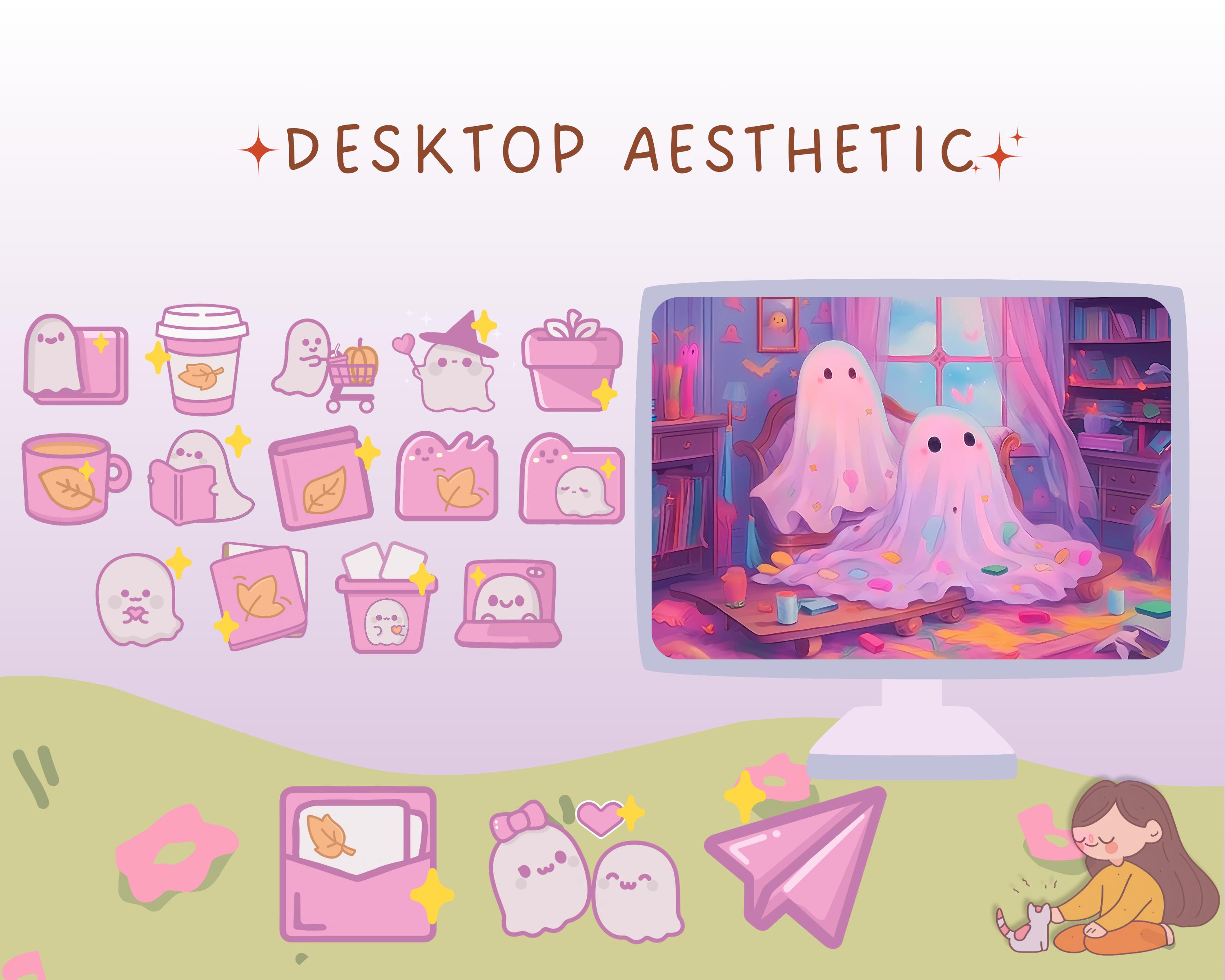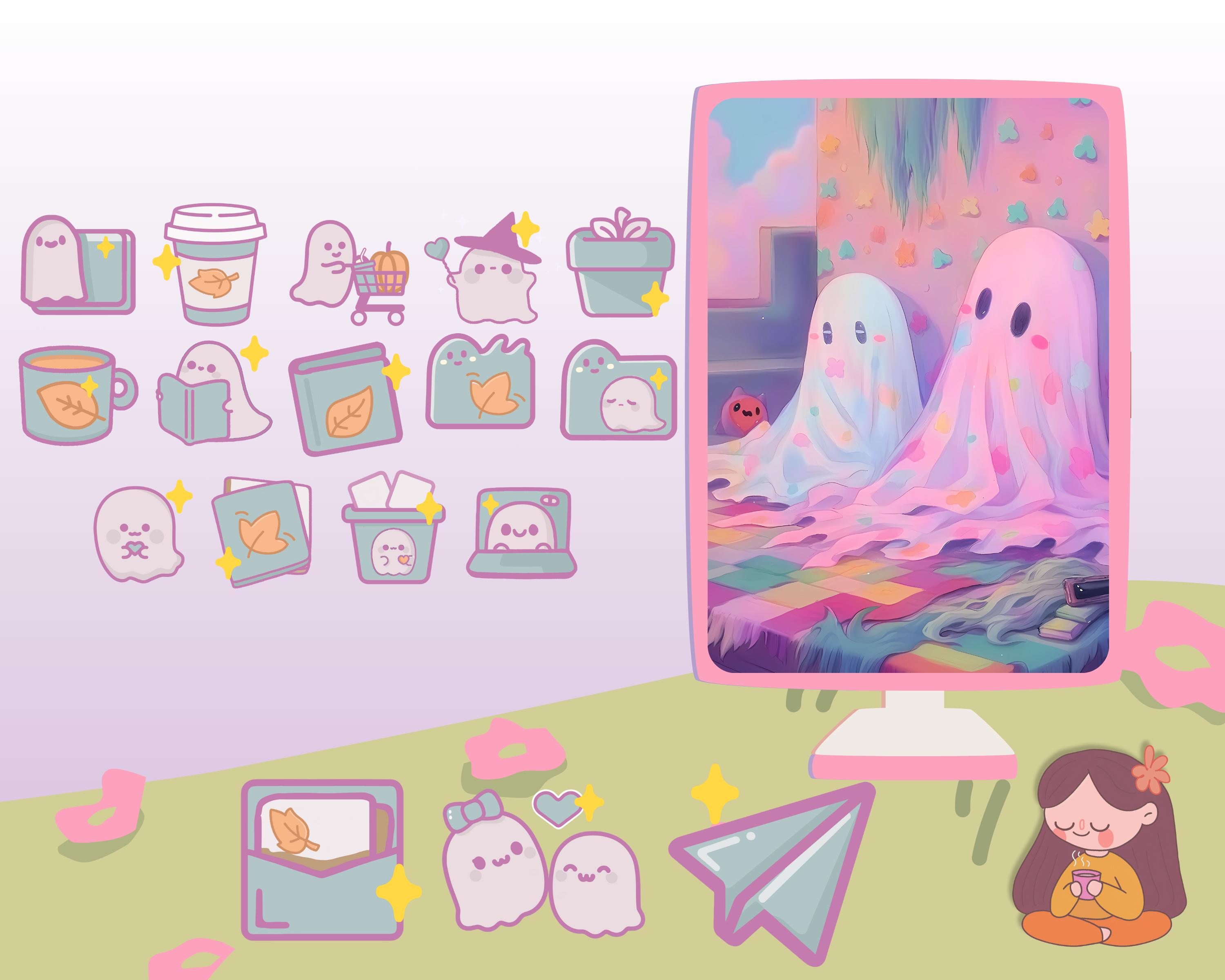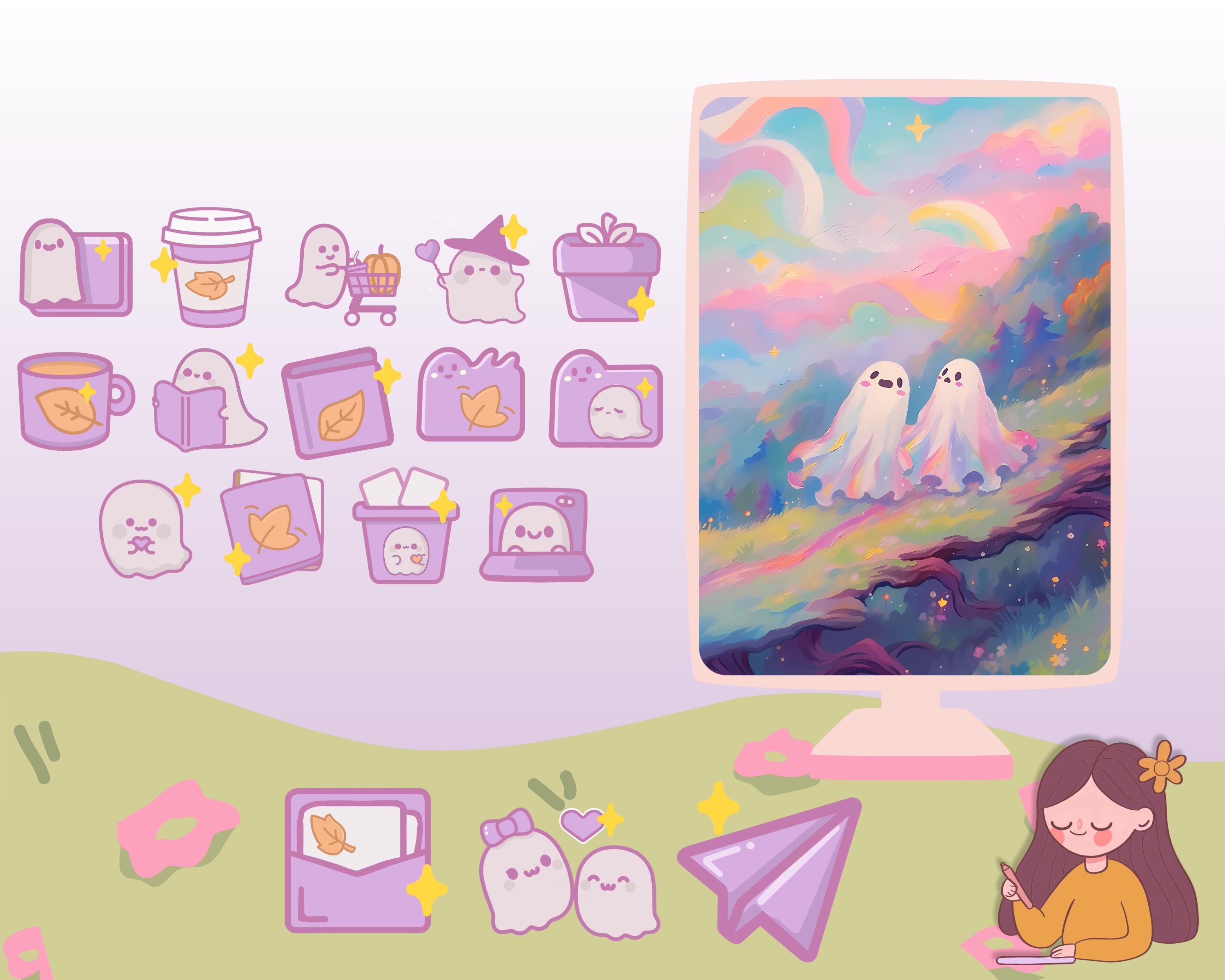 Pastel Ghost Desktop Wallpaper & Kawaii Icons (Digital Download)