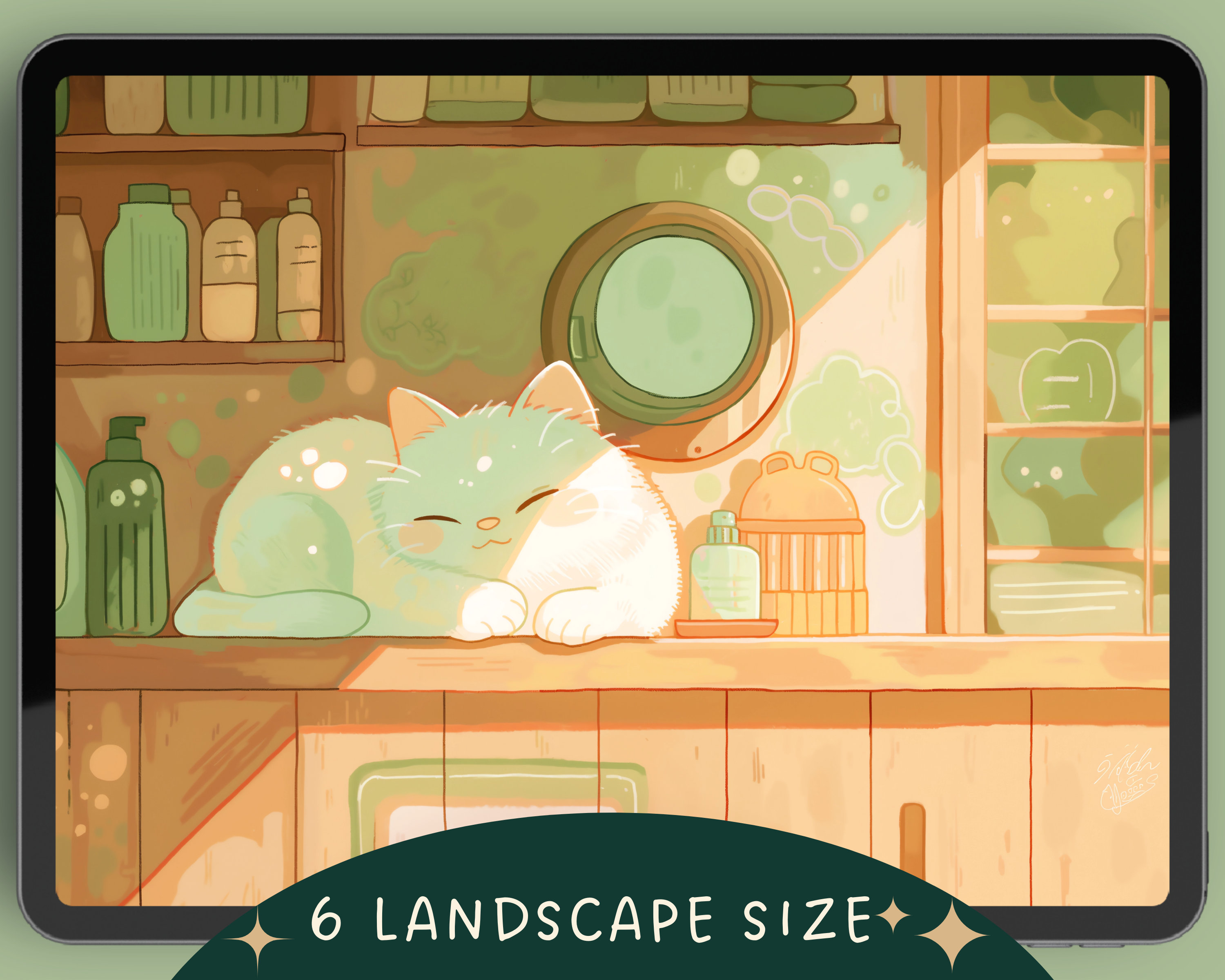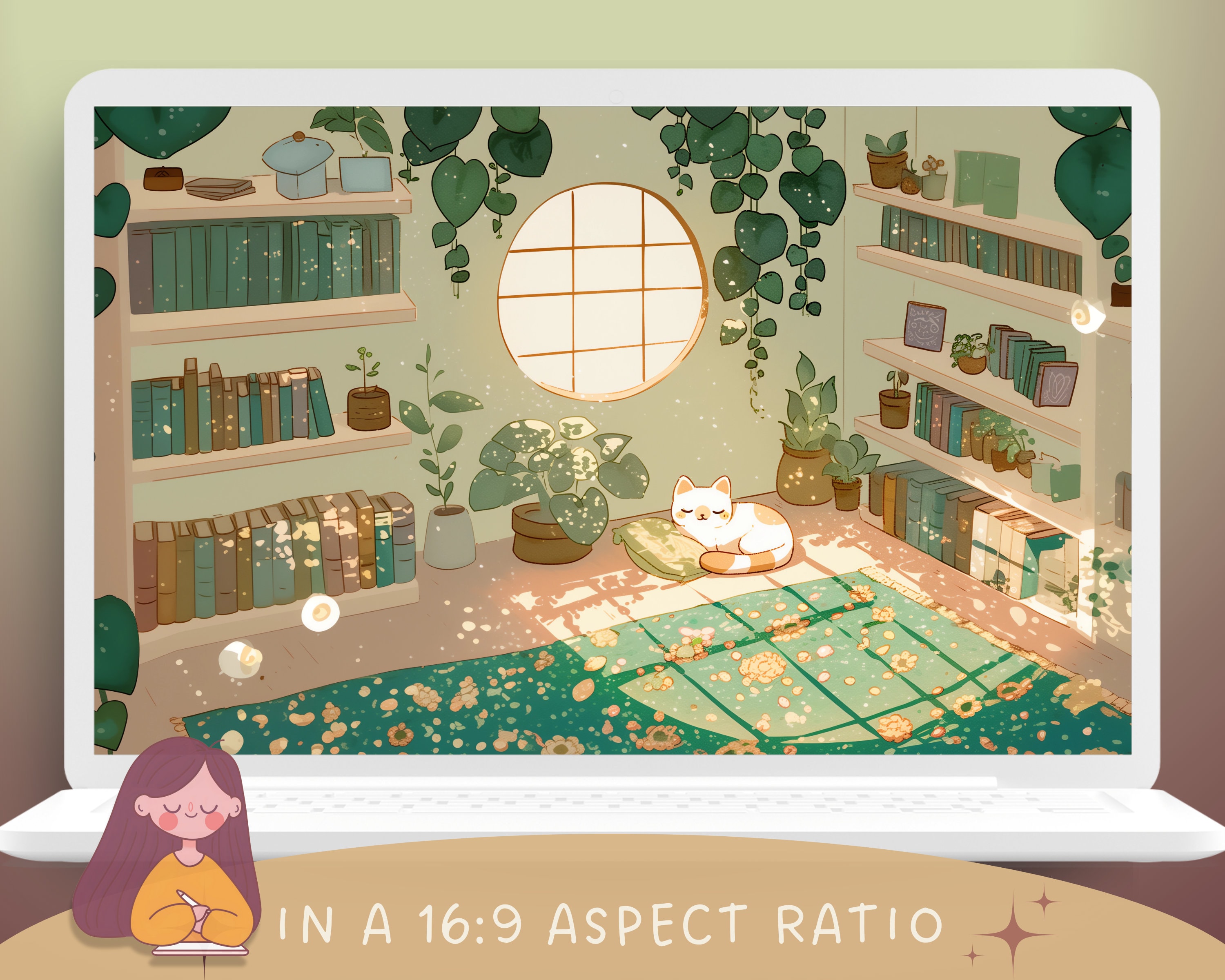 Bring a touch of magic to your devices with this set of 12 Studio Cats, plants and books cozy wallpapers! Featuring cute cats in cozy settings, these high-res JPG files will fit perfectly on your phone or computer/tablet screens.