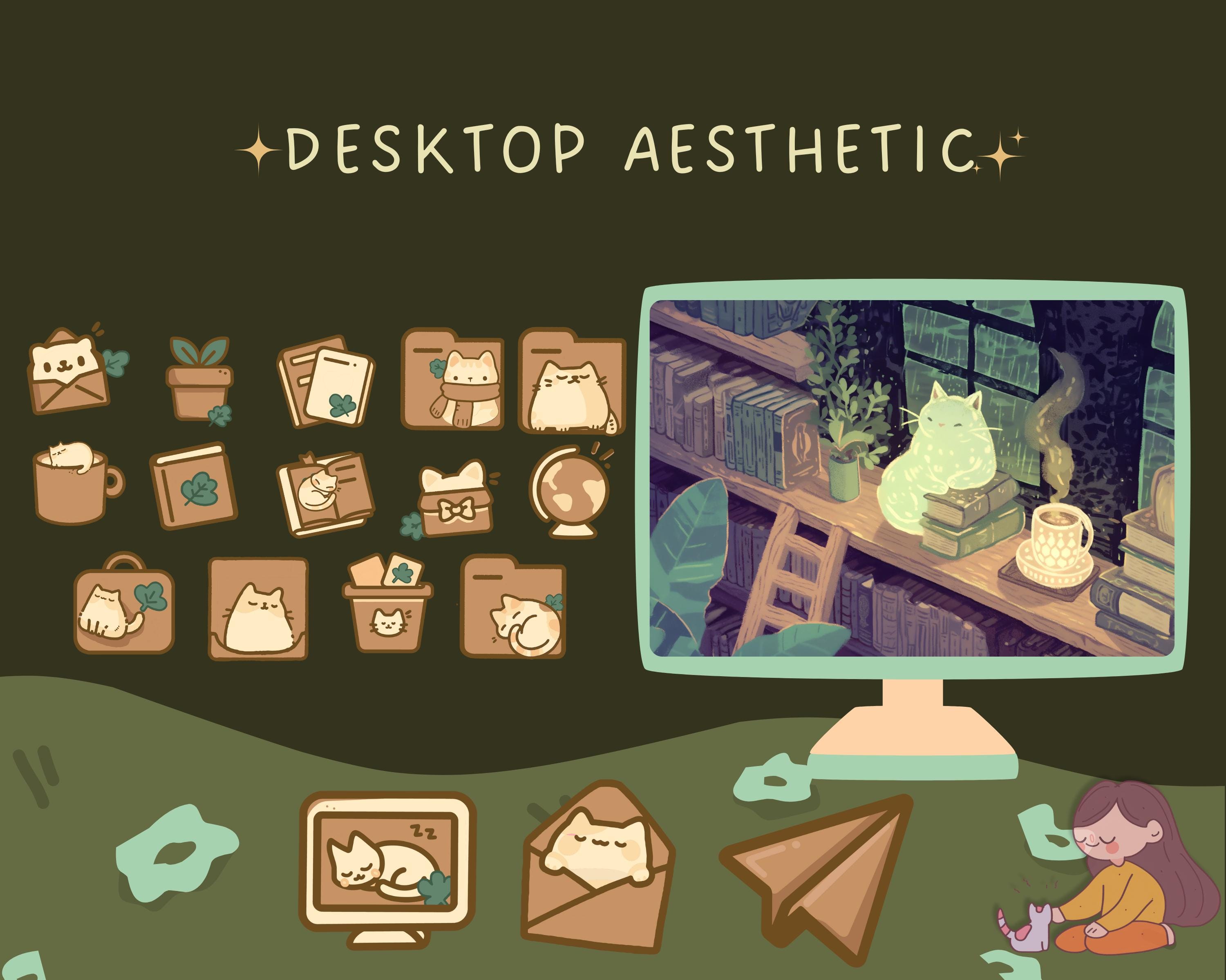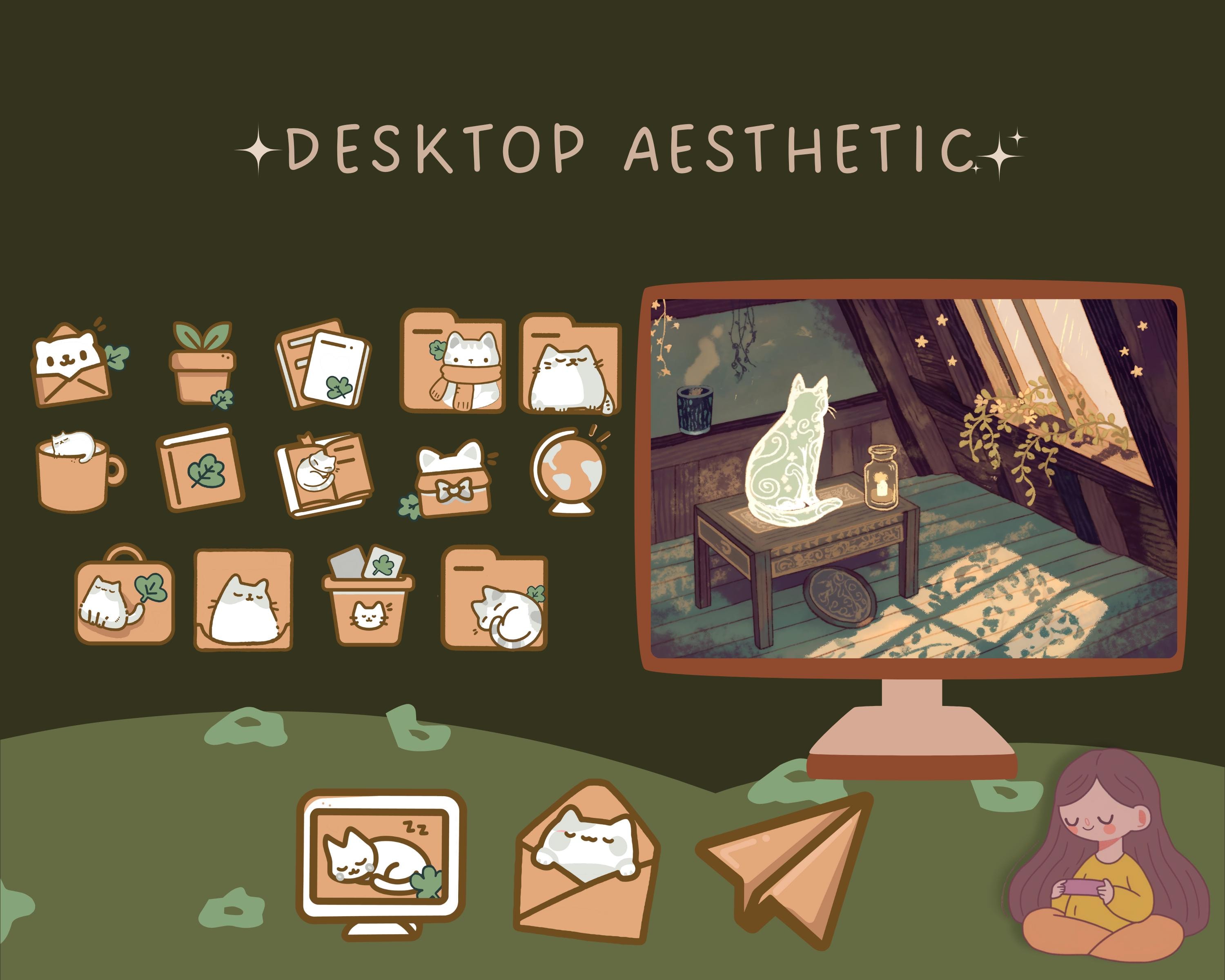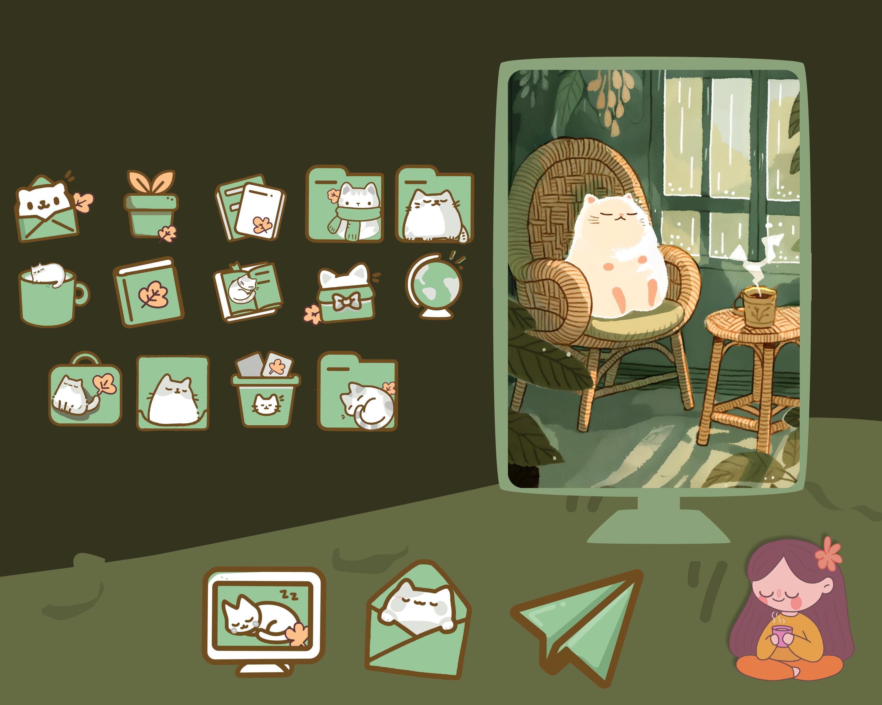 Cozy Cat Desktop Wallpaper Bundle: Boho Kawaii Icons (Digital Download)