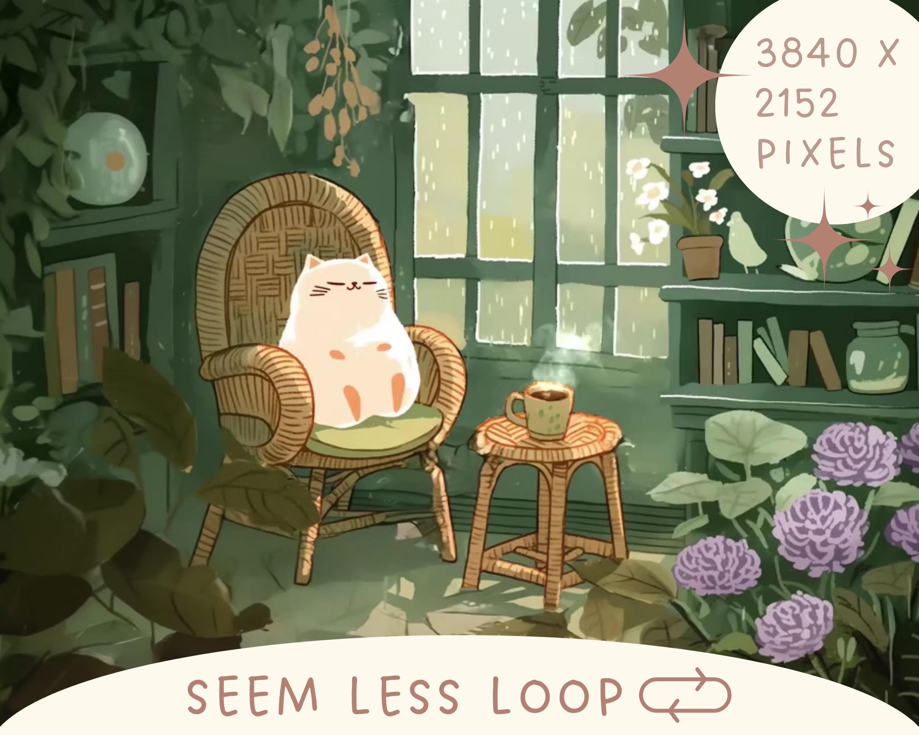 Cozy Lofi Cat Animated Vtuber Background: Rain & Plants Stream Overlay