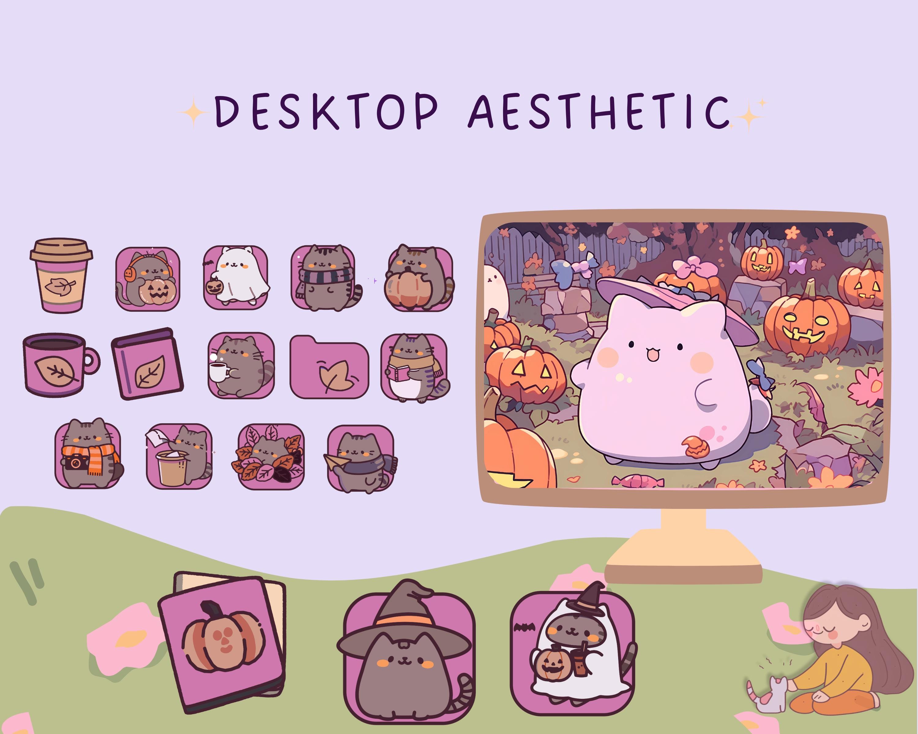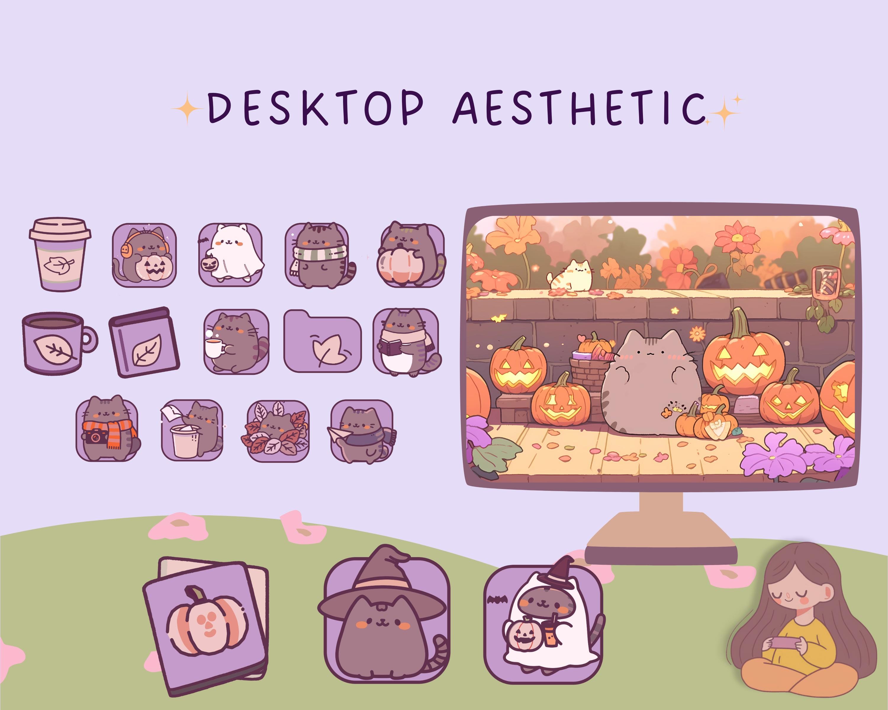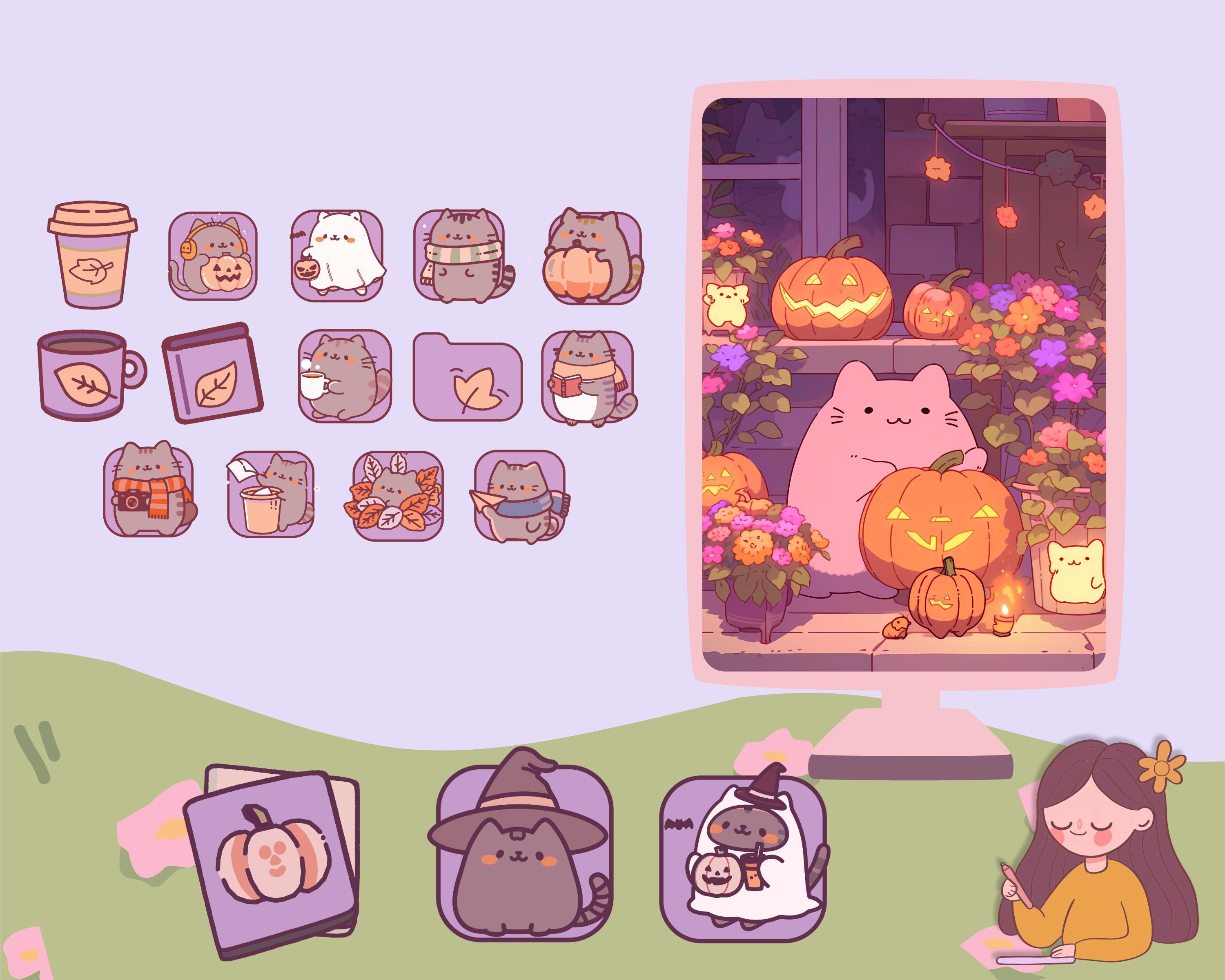 Pumpkin Cat Desktop Wallpaper & Icons, Kawaii Fall Theme (Digital Download)