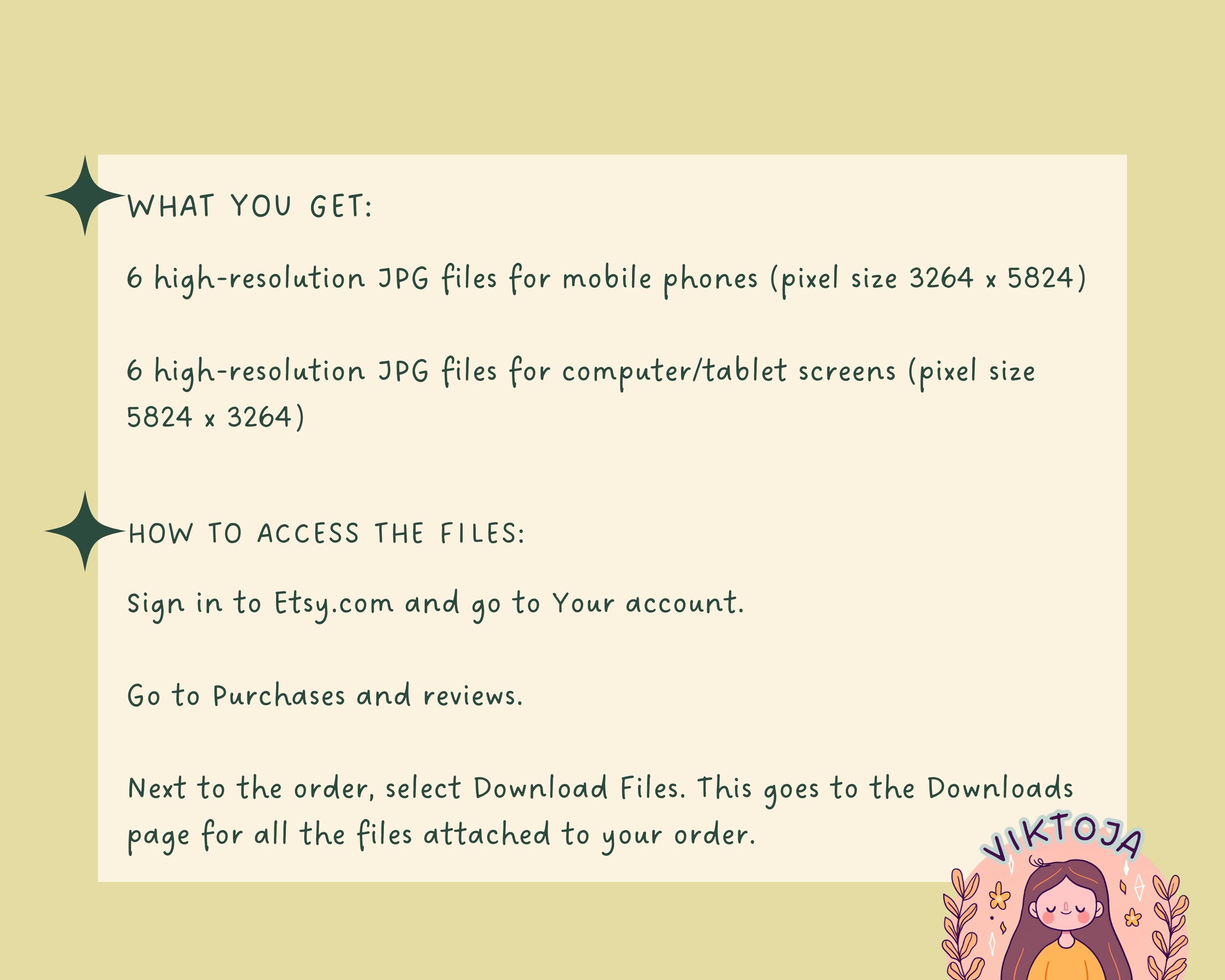 After purchase, you'll receive a PDF file with a link to download your wallpapers.