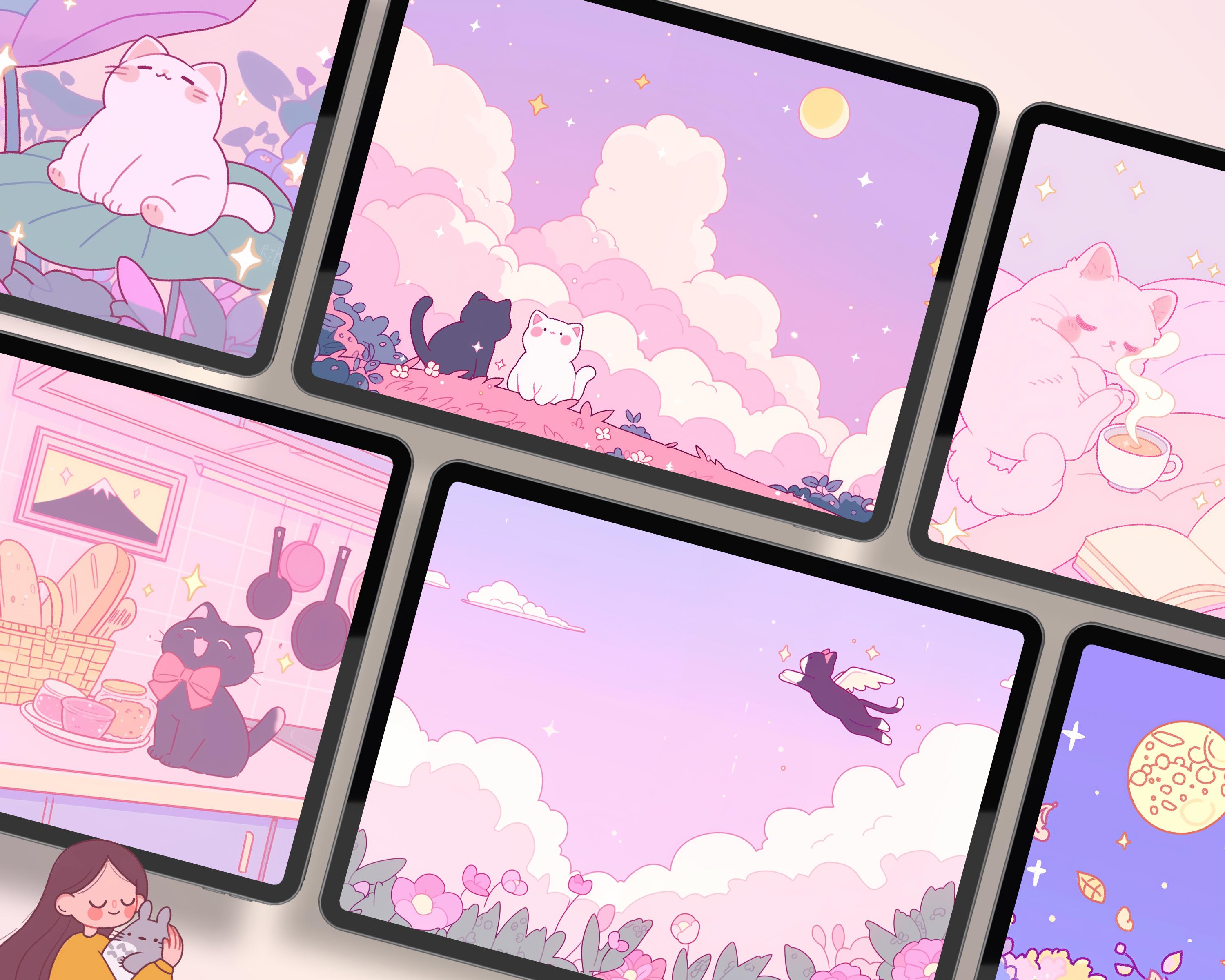 Bring a touch of magic to your devices with this set of 12 cozy wallpapers! Featuring cute cats in cozy settings, these high-res JPG files will fit perfectly on your phone or computer/tablet screens.