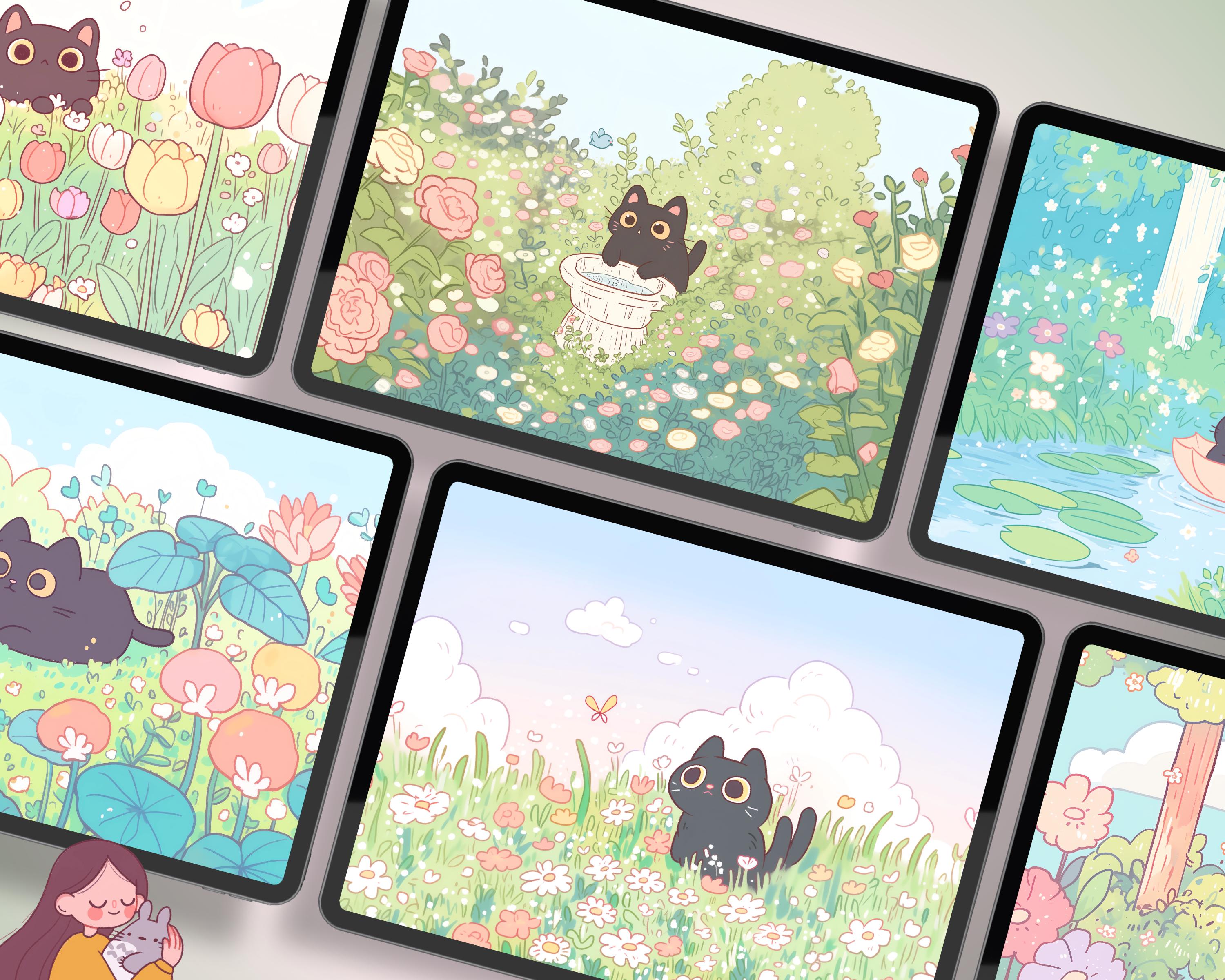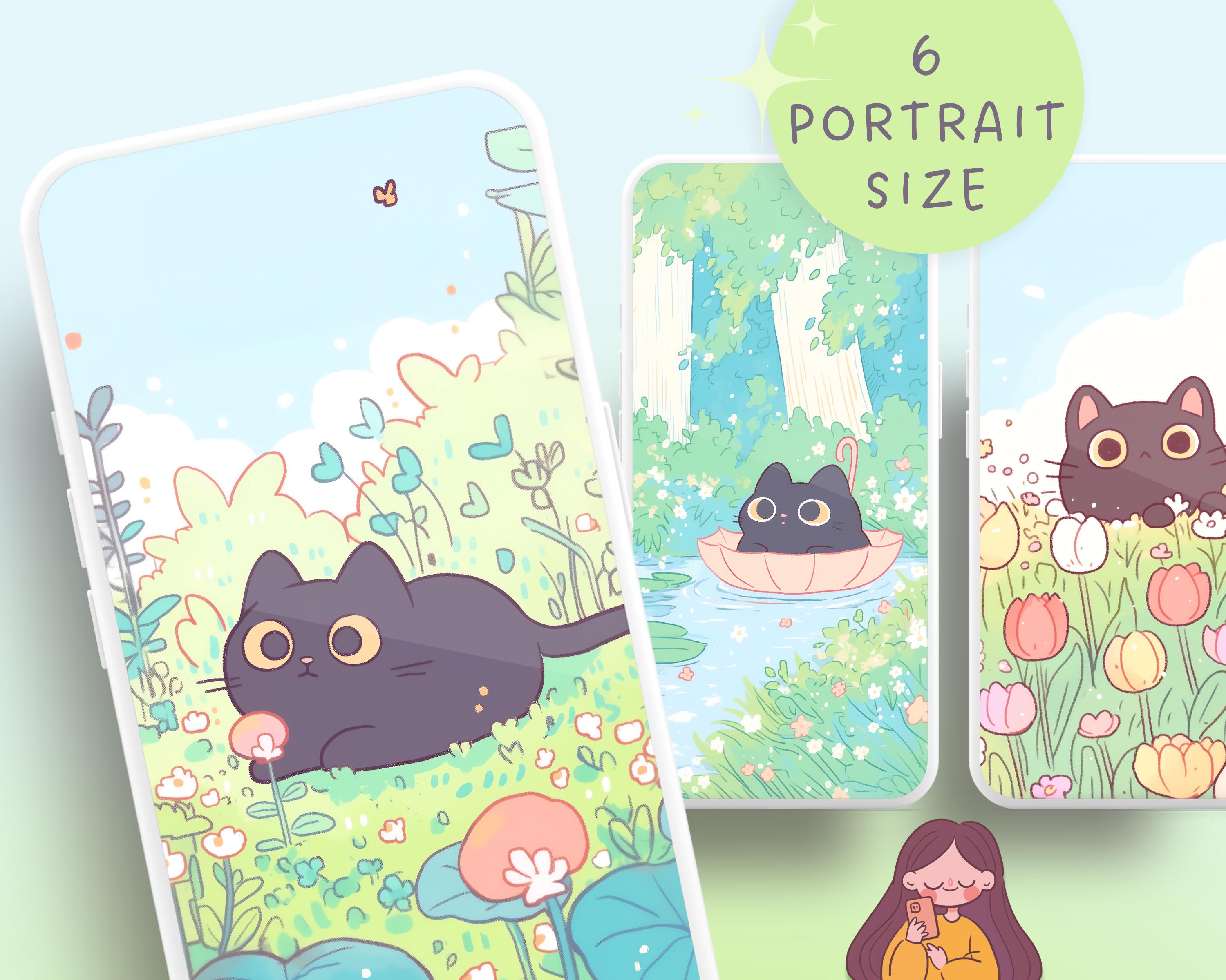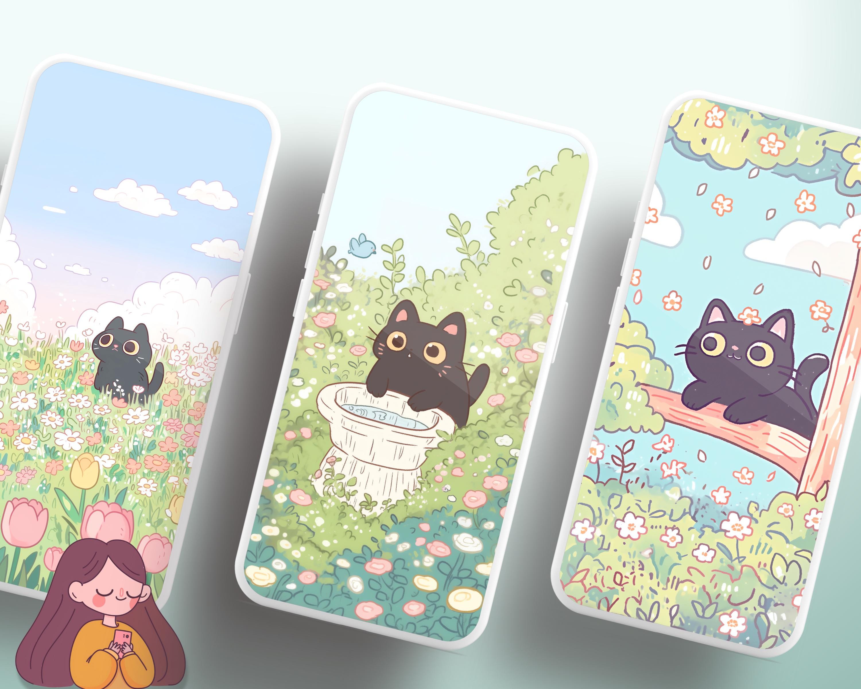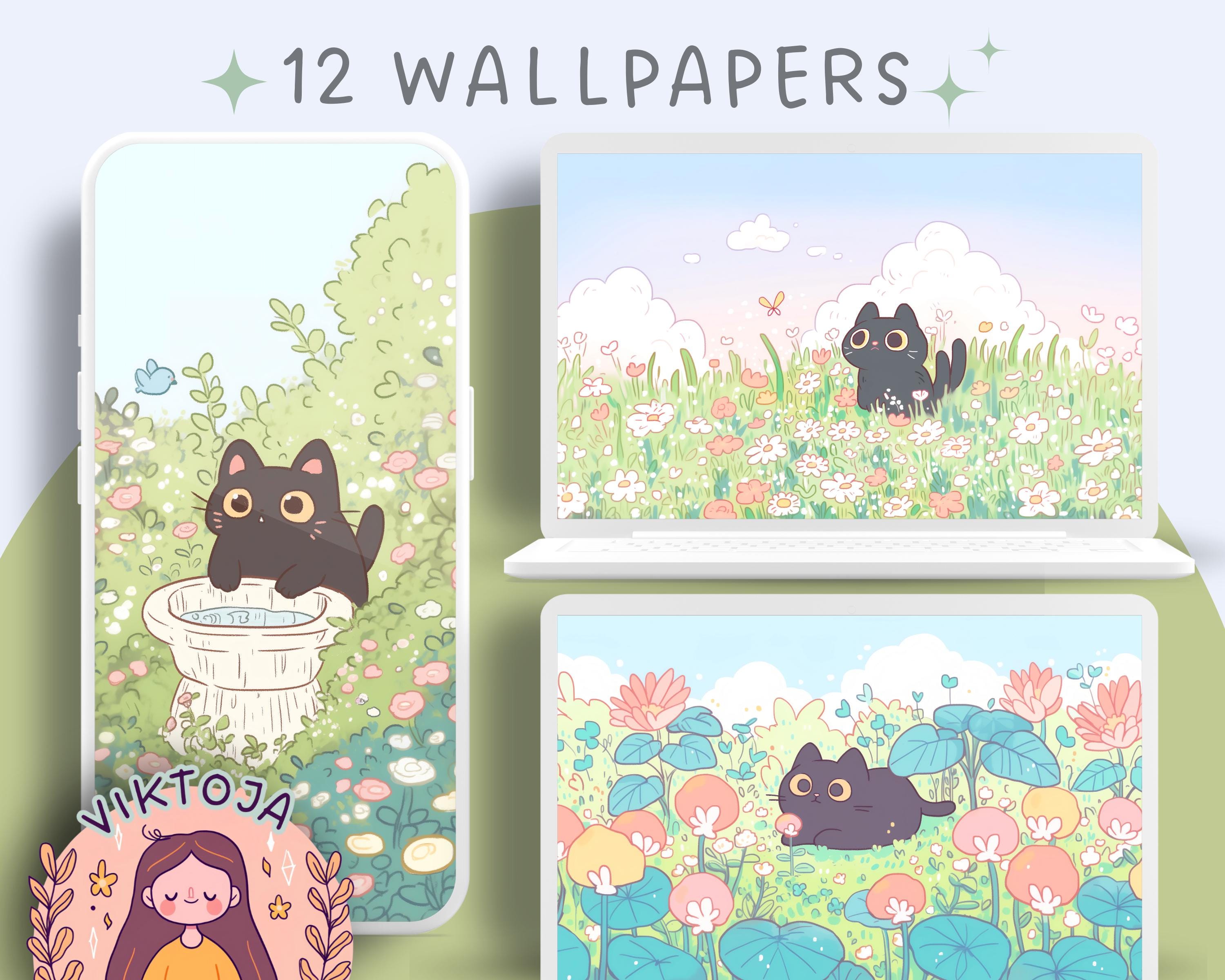 Kawaii Black Cat Spring Flower Wallpaper: 12 Pastel Phone & Desktop Backgrounds (Digital Download)