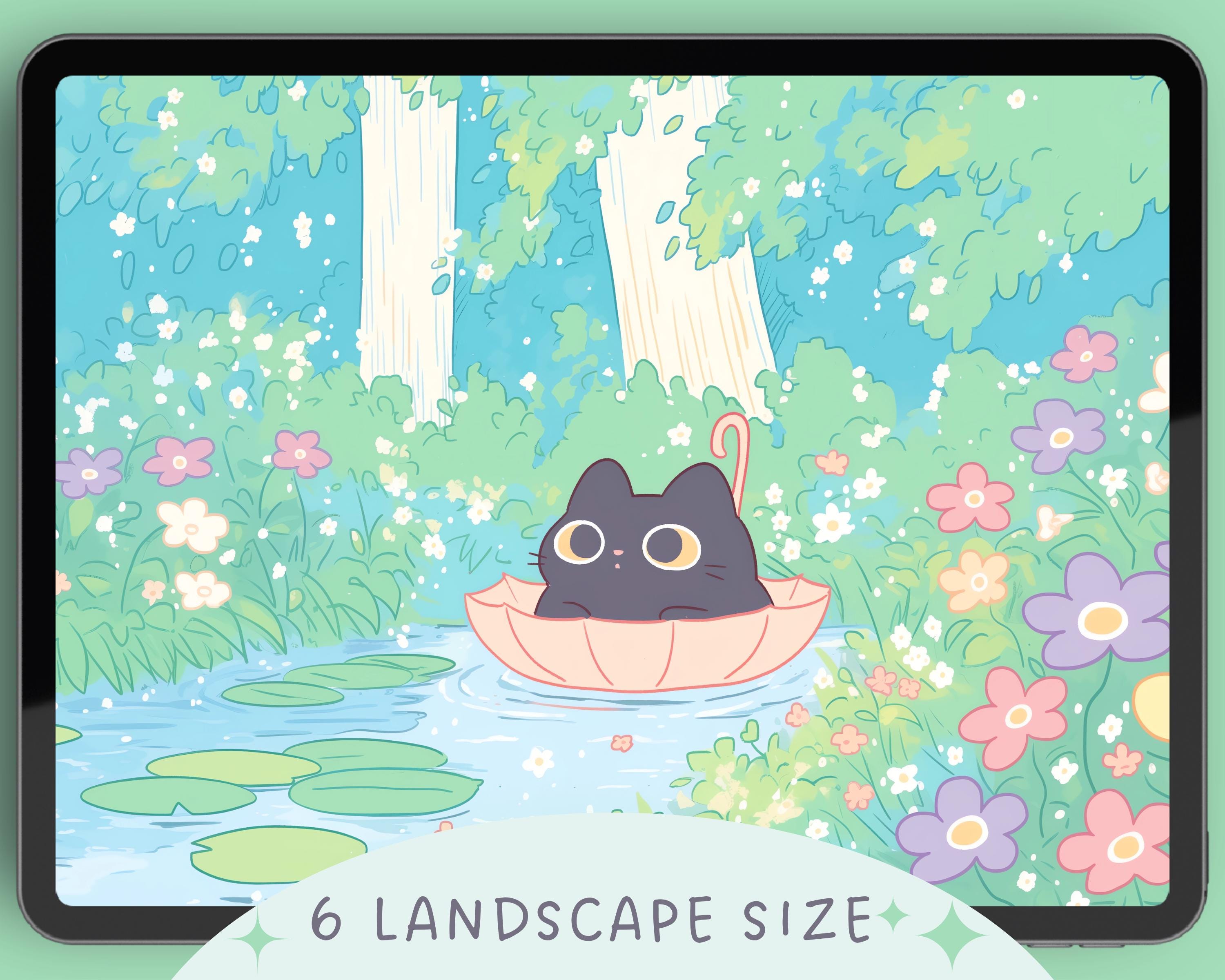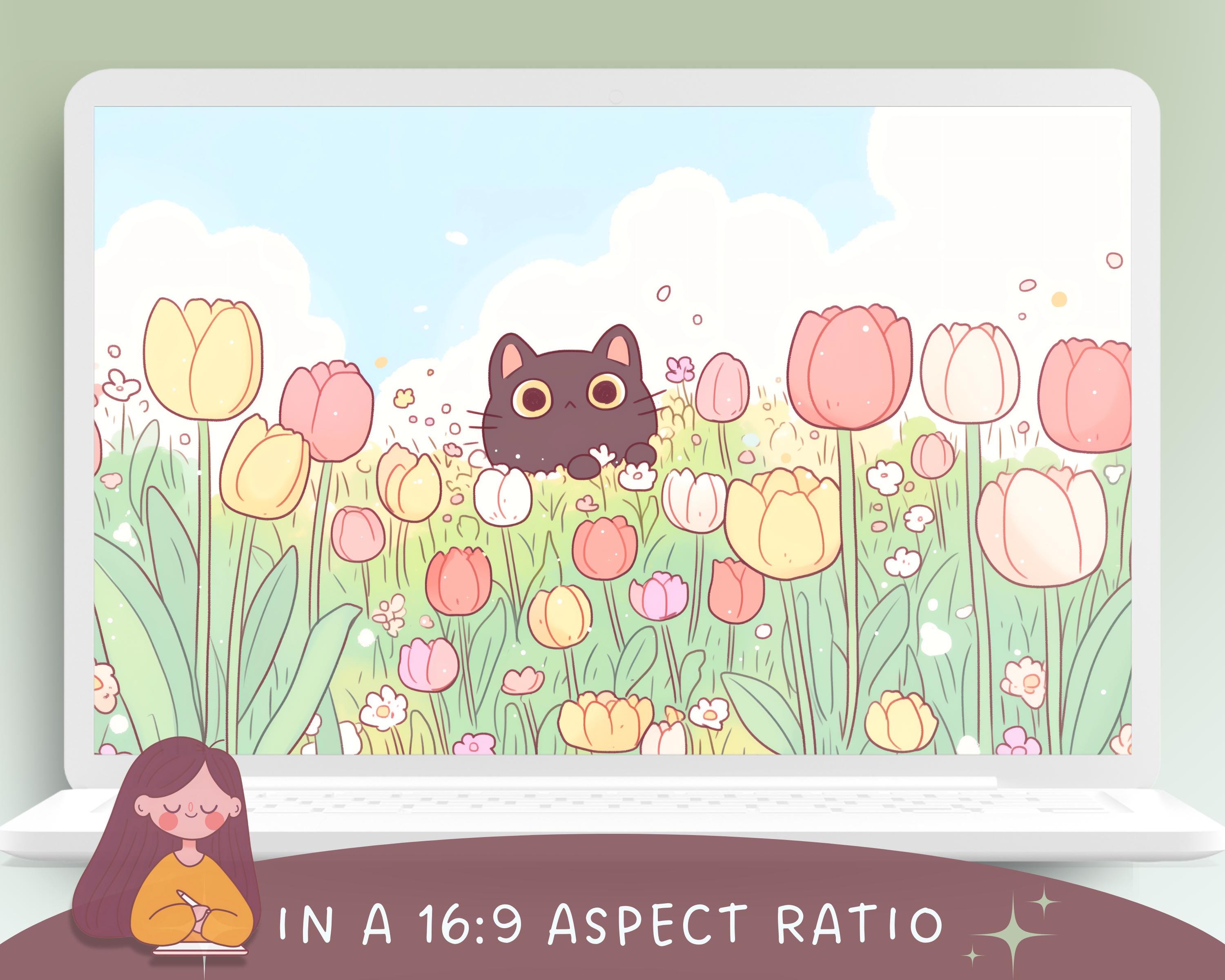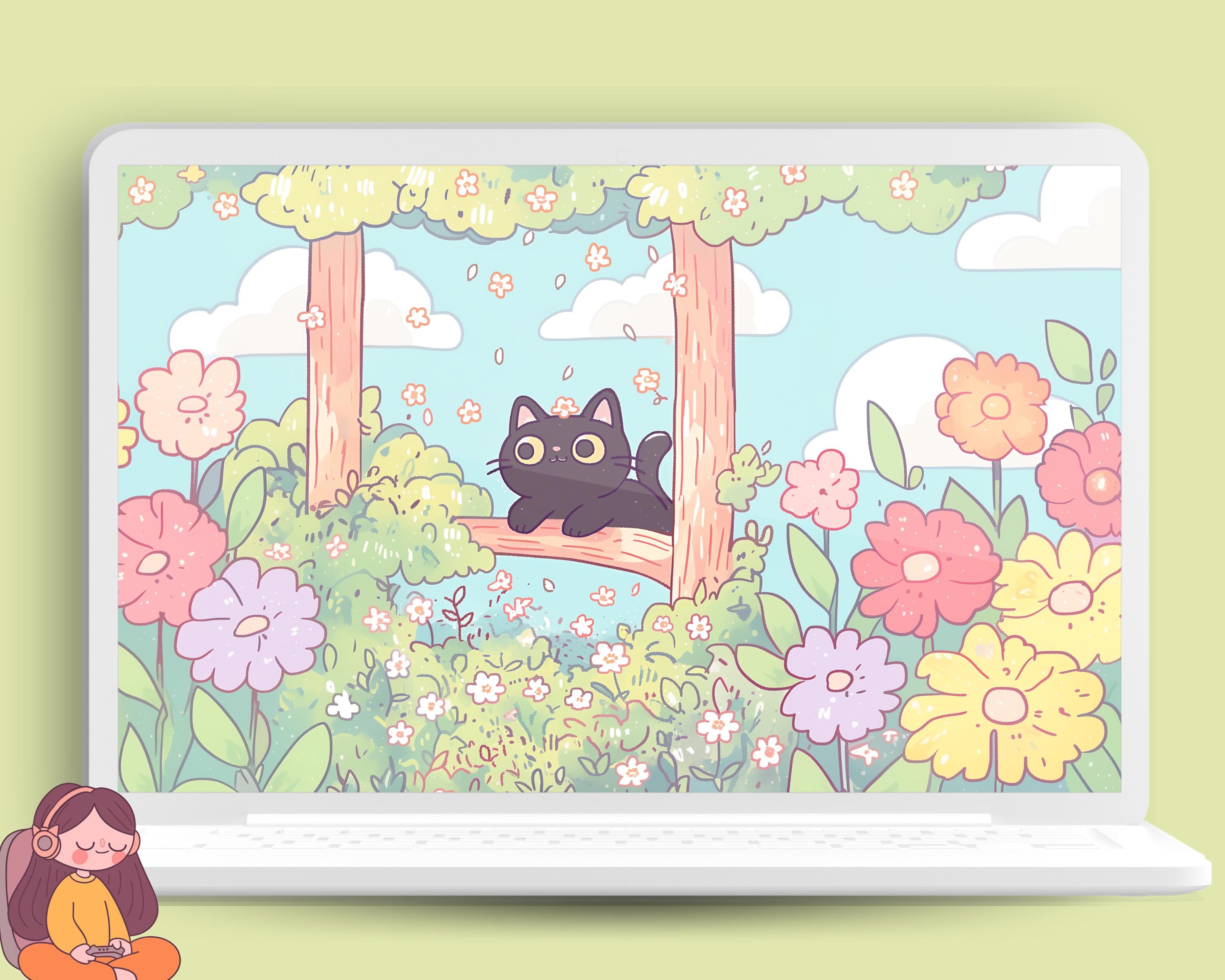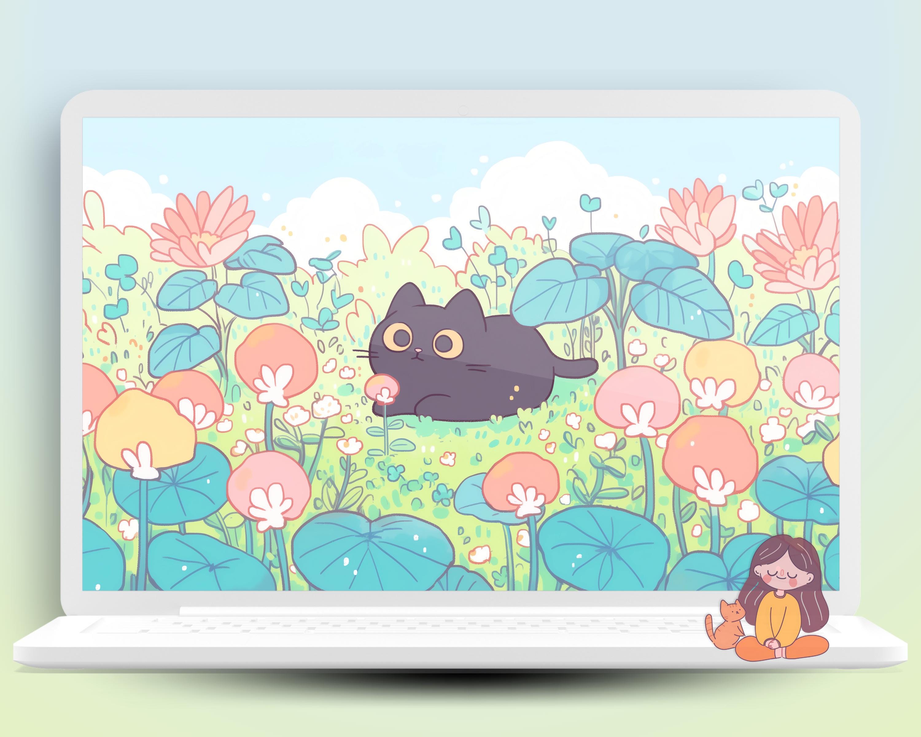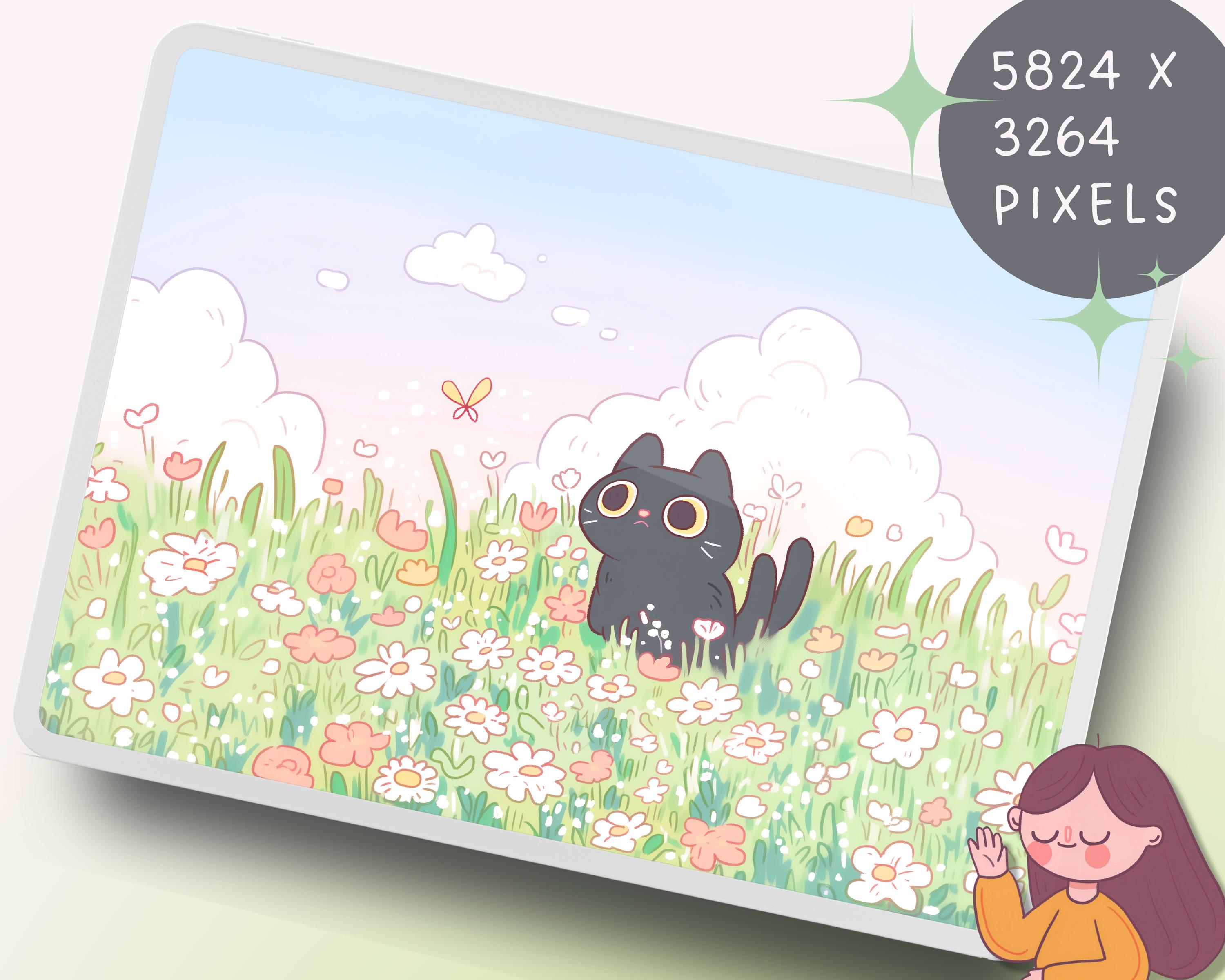 Kawaii Black Cat Spring Flower Wallpaper: 12 Pastel Phone & Desktop Backgrounds (Digital Download)