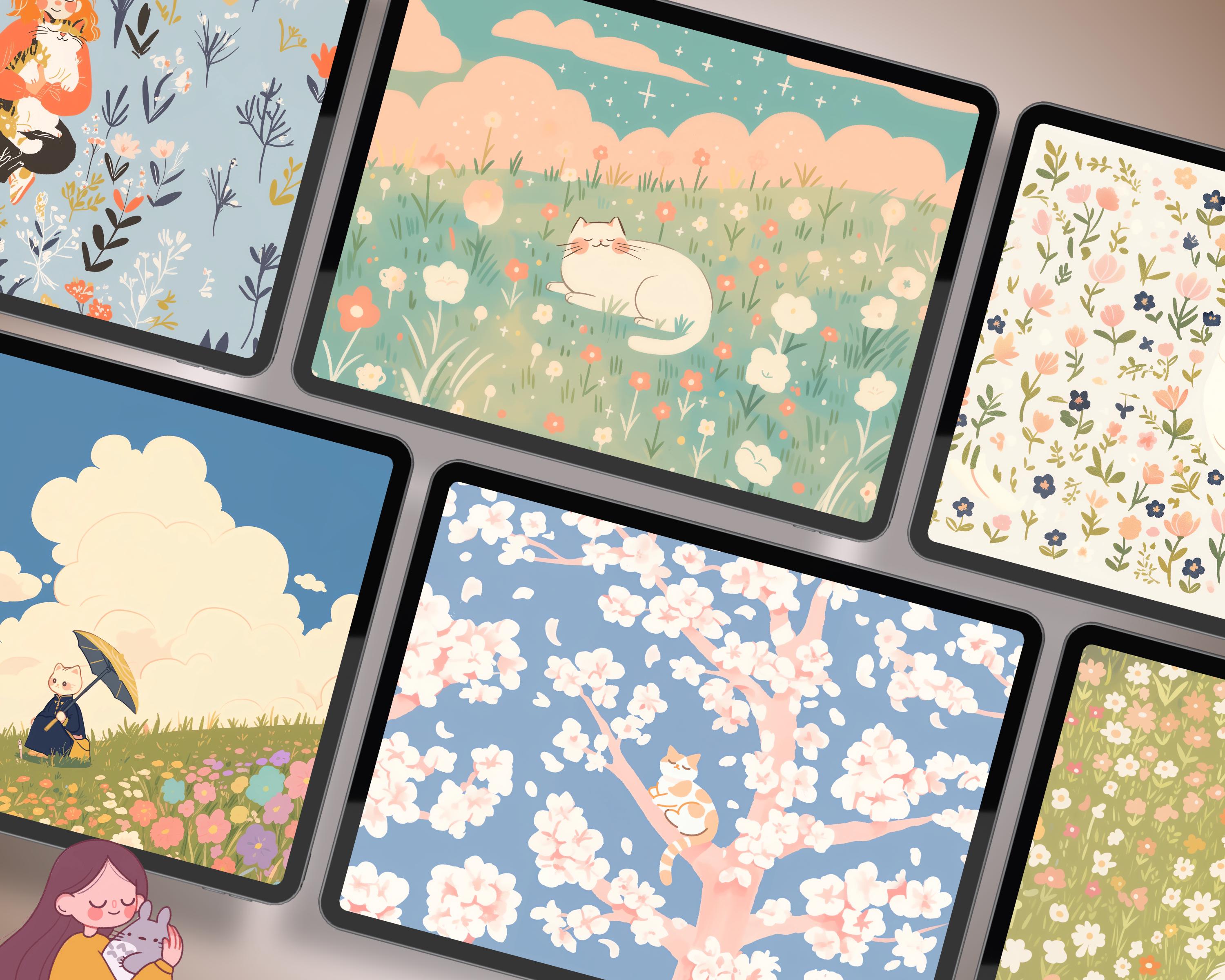 Bring a touch of magic to your devices with this set of 12 Spring cats, plants and books cozy wallpapers! Featuring cute cats in cozy settings, these high-res JPG files will fit perfectly on your phone or computer/tablet screens.