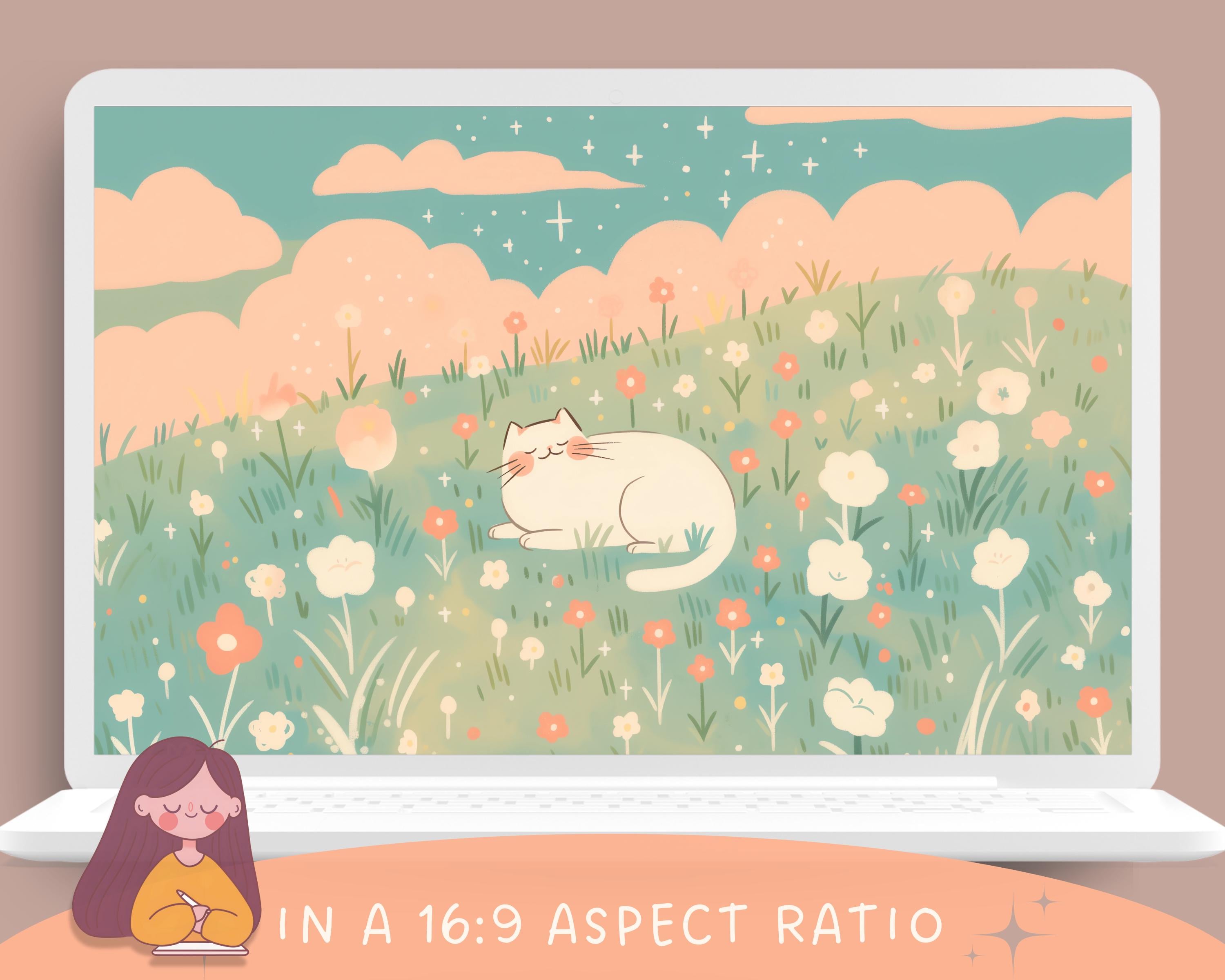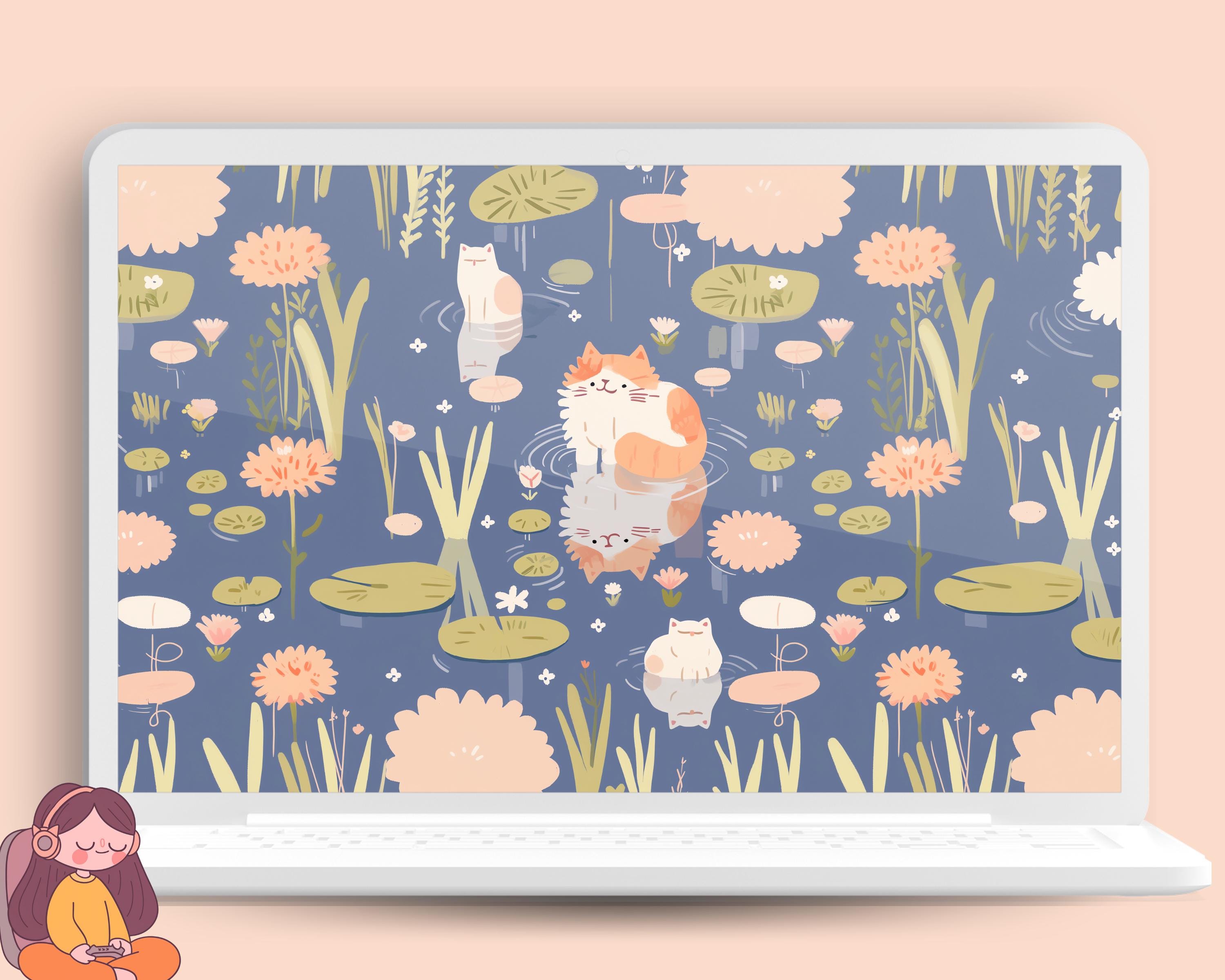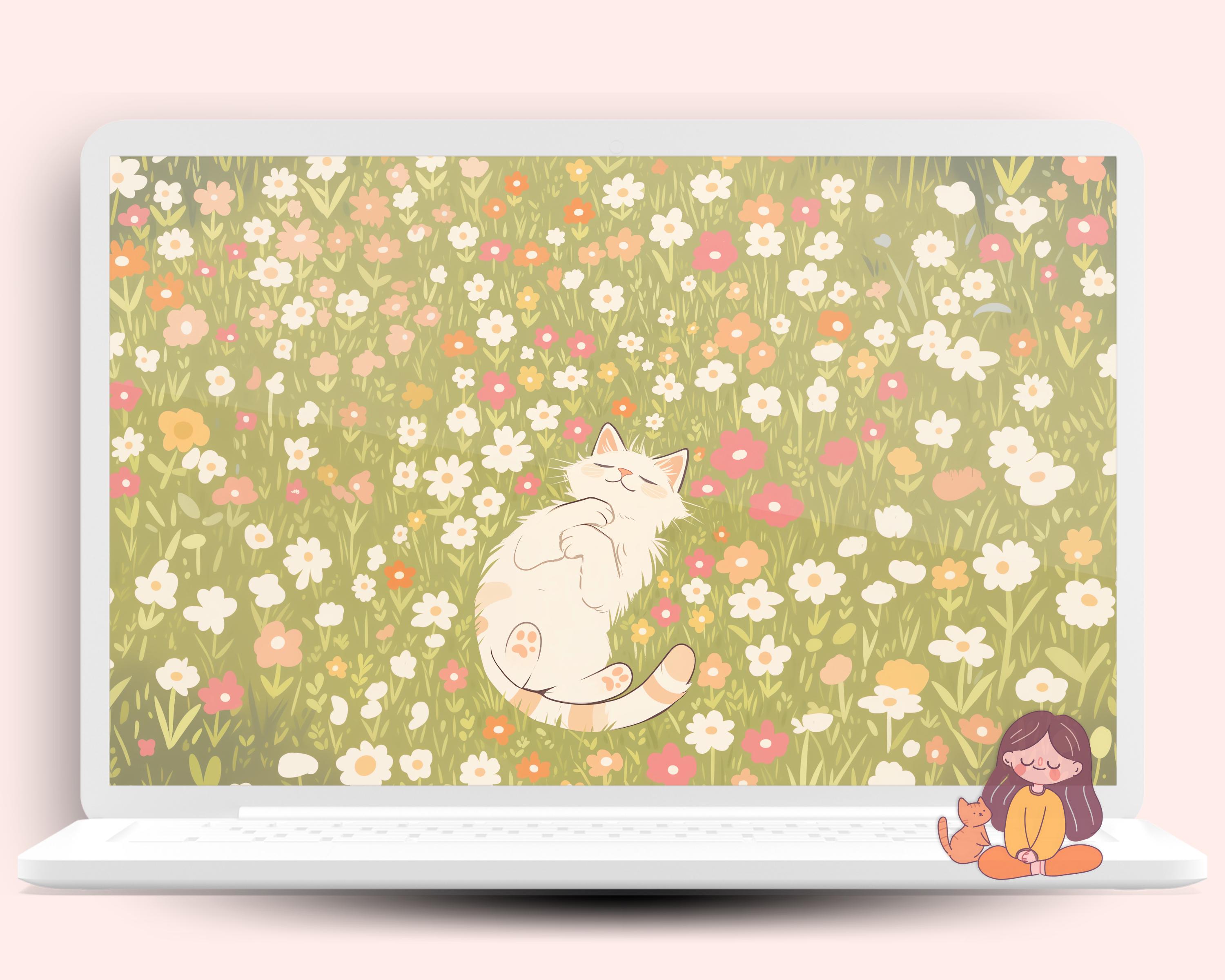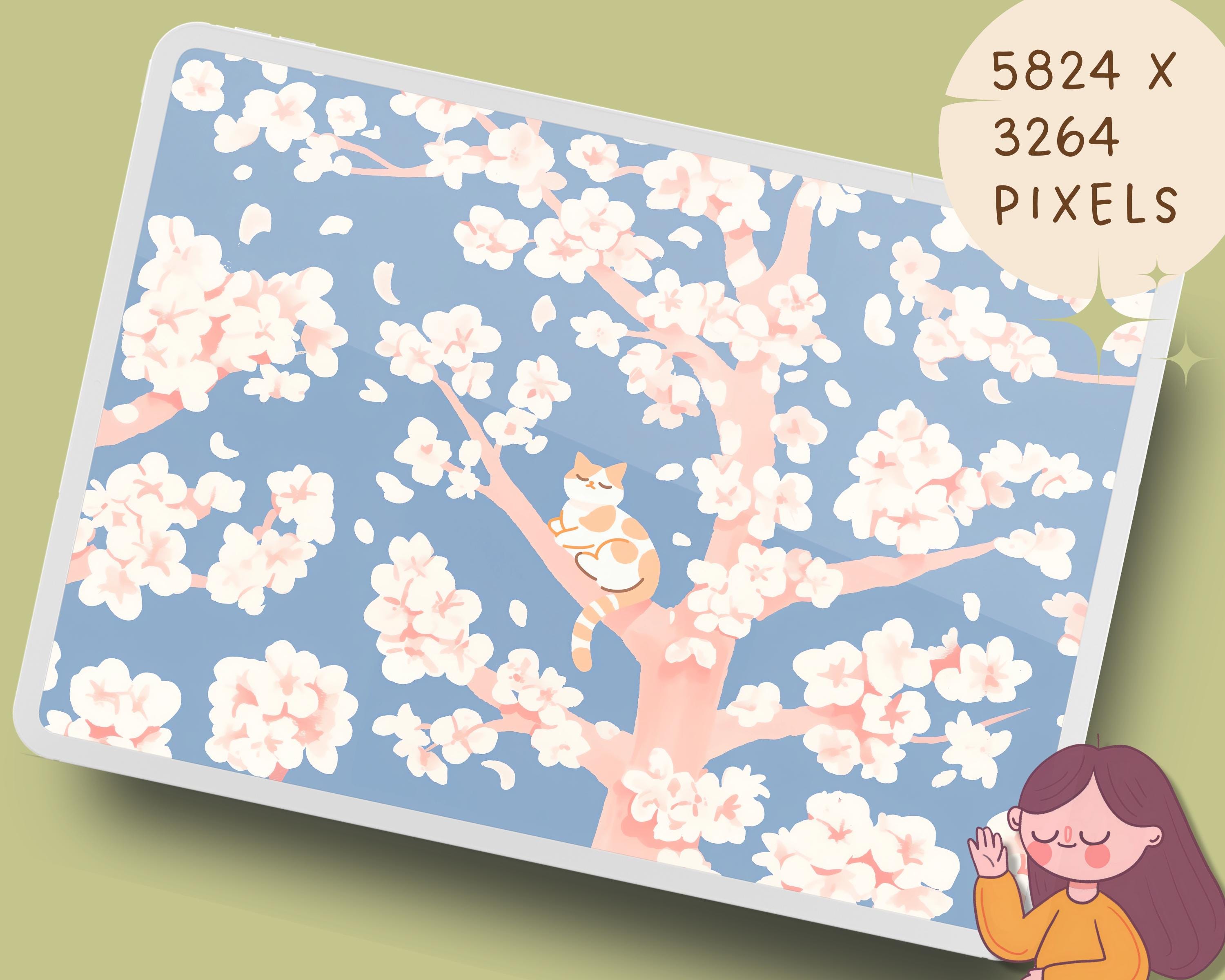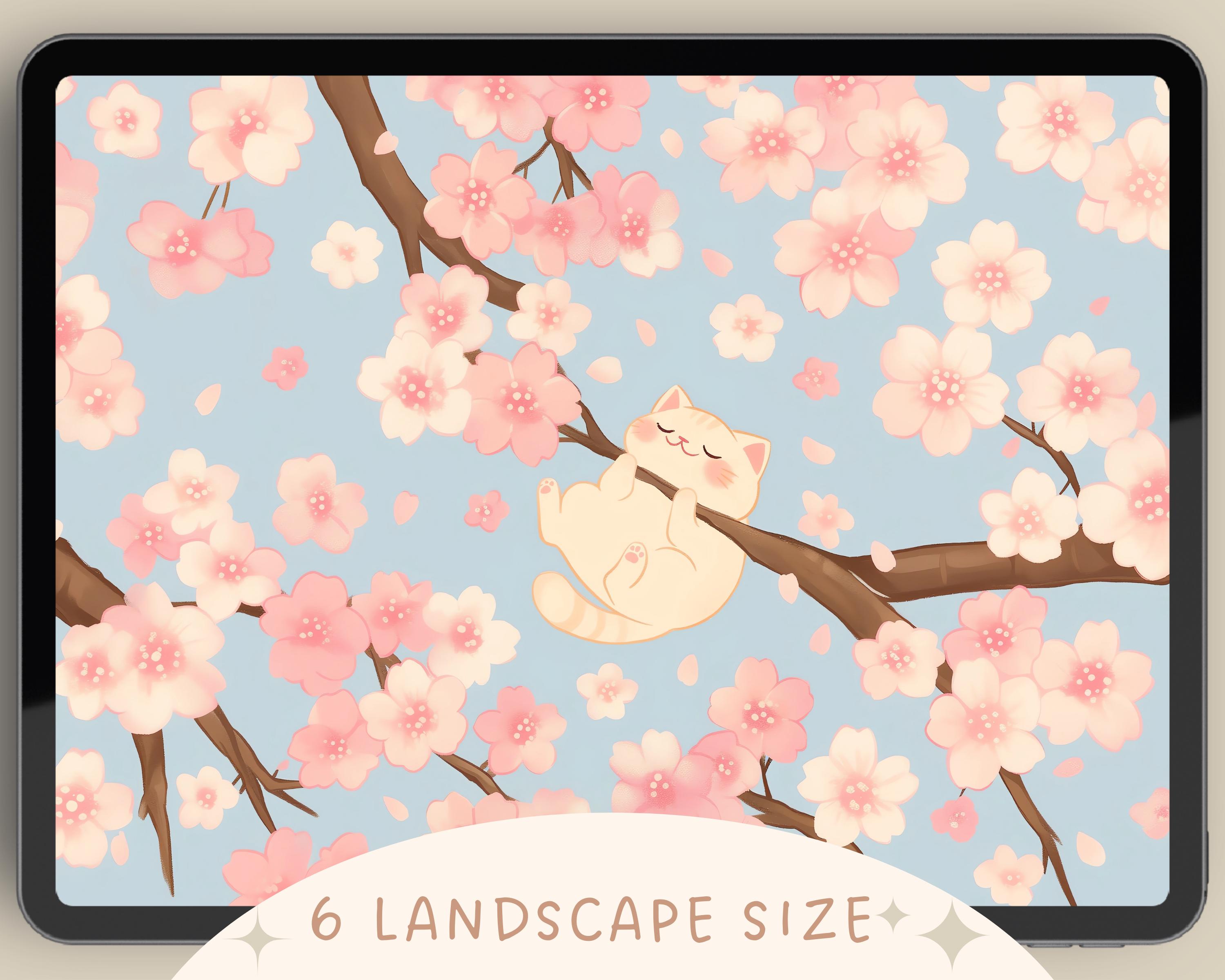 Spring Cat Wallpaper: Sakura, Books, Cozy Desktop Backgrounds (Digital Download)