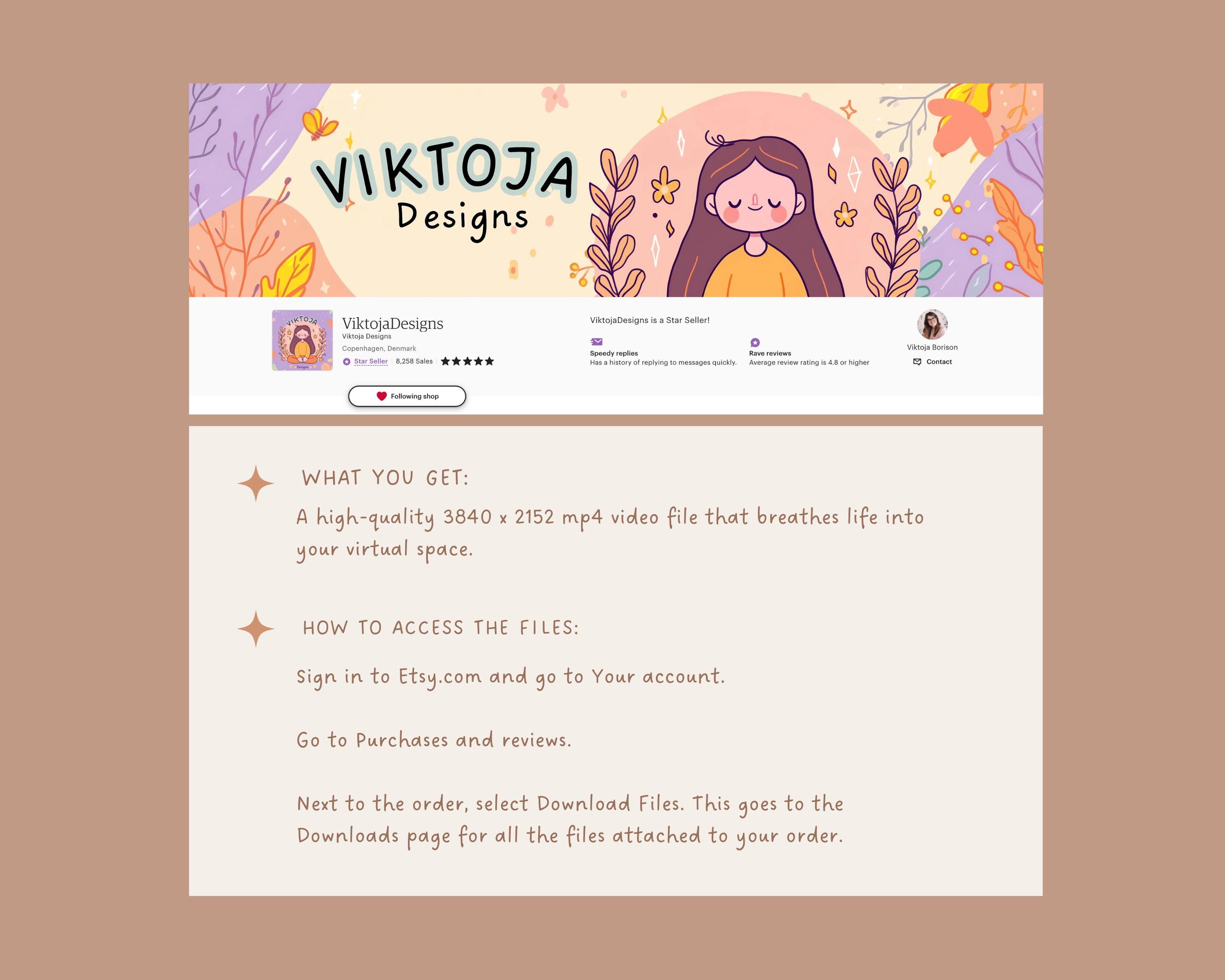- A high-quality 3840 x 2152 mp4 video file that breathes life into your virtual space. 🌟