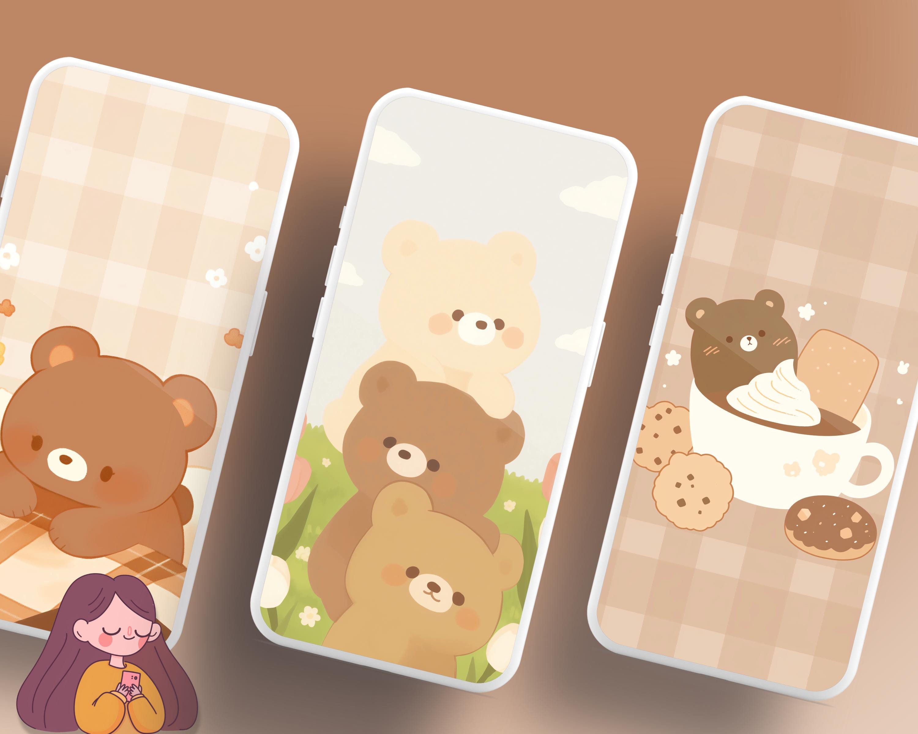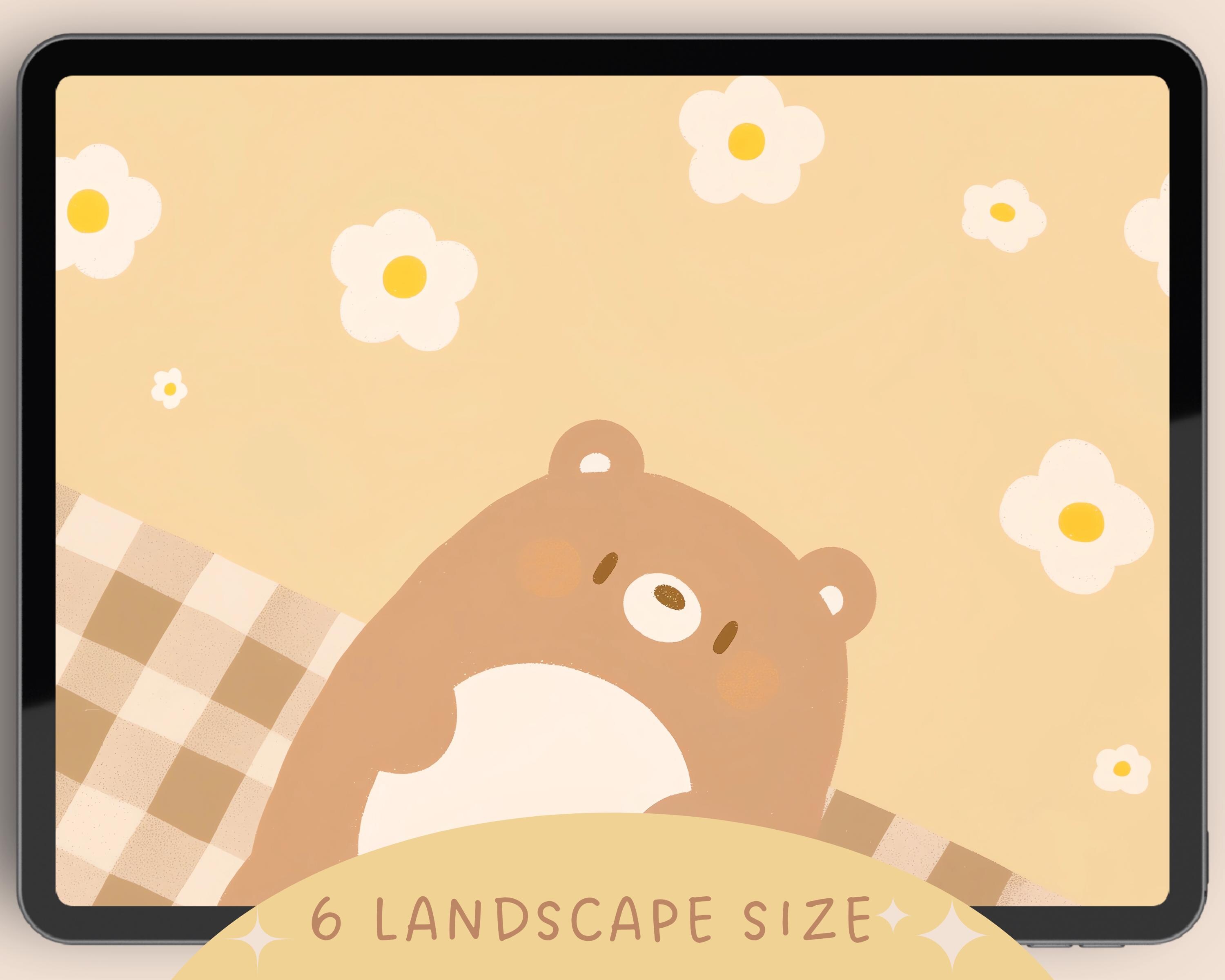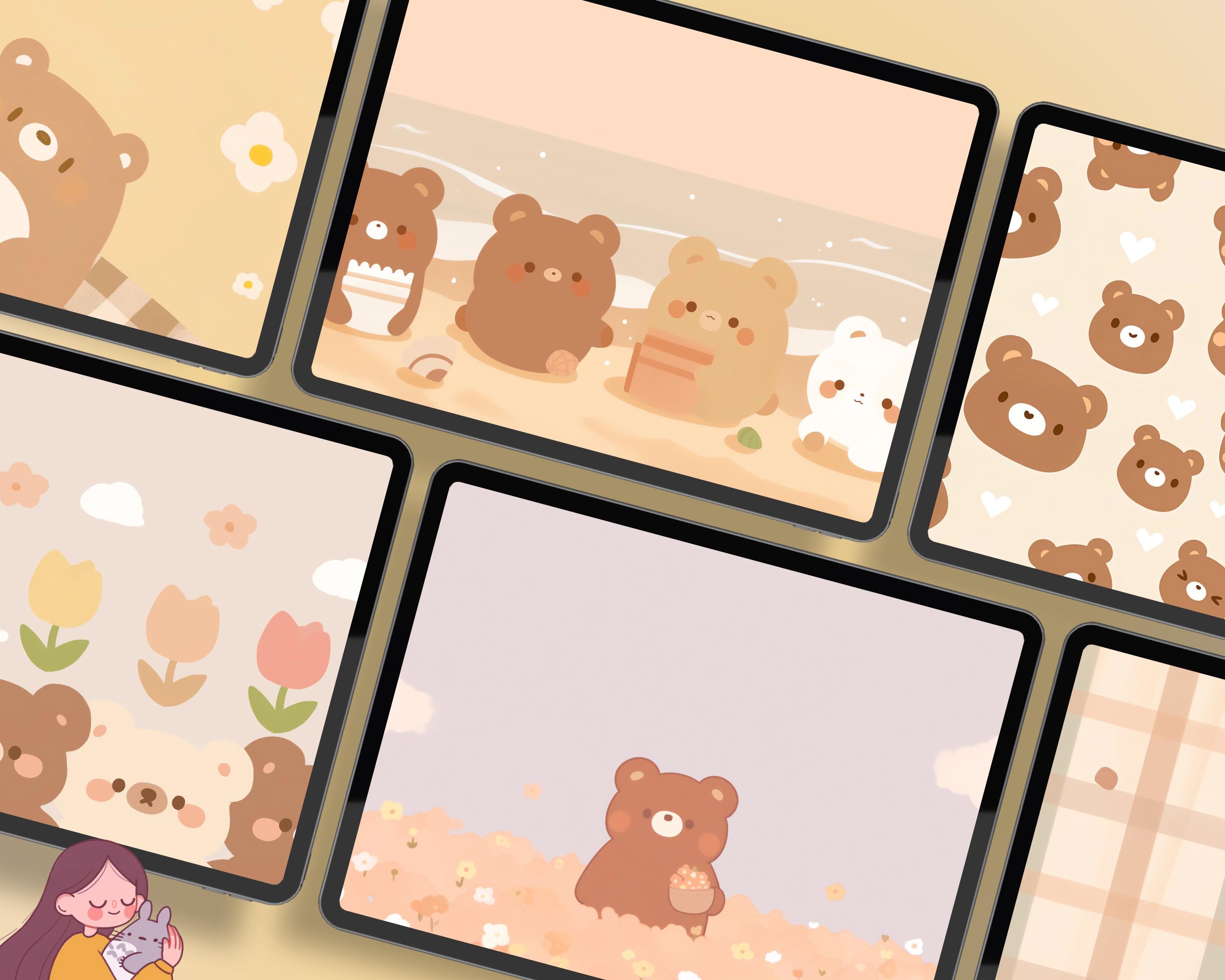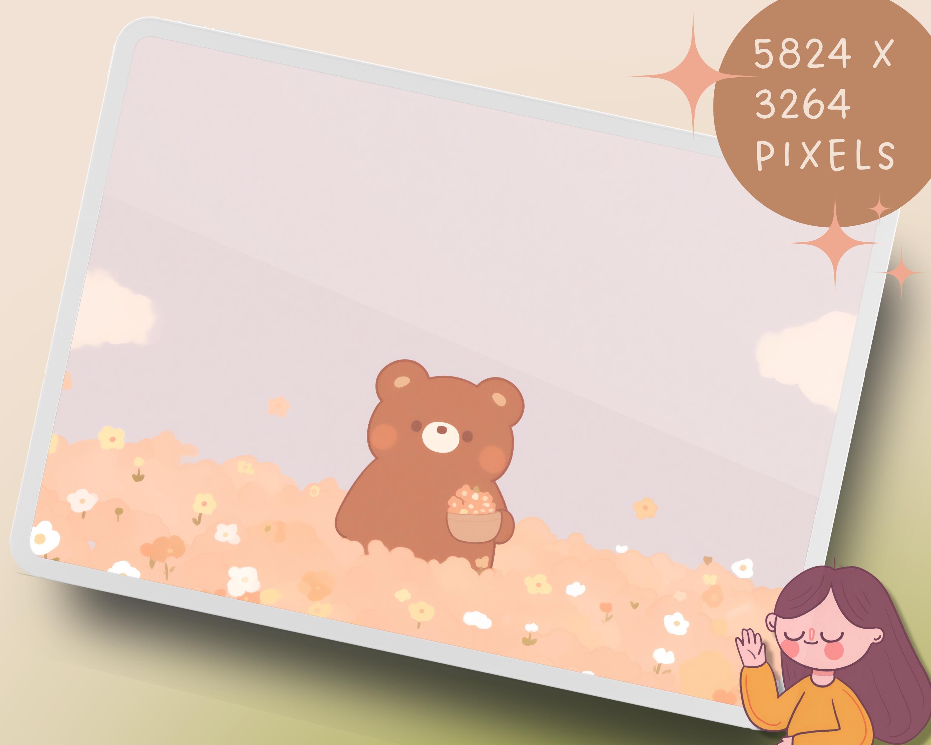 Kawaii Brown Bear Wallpaper: Pastel Flower Backgrounds (Digital Download)