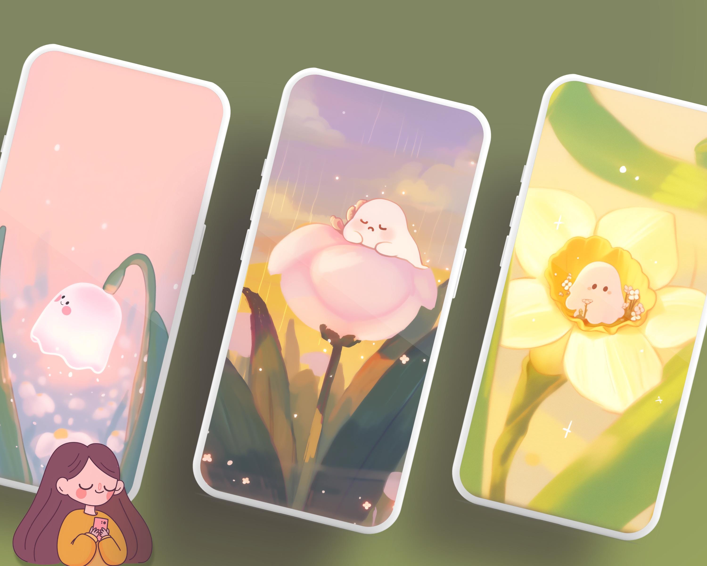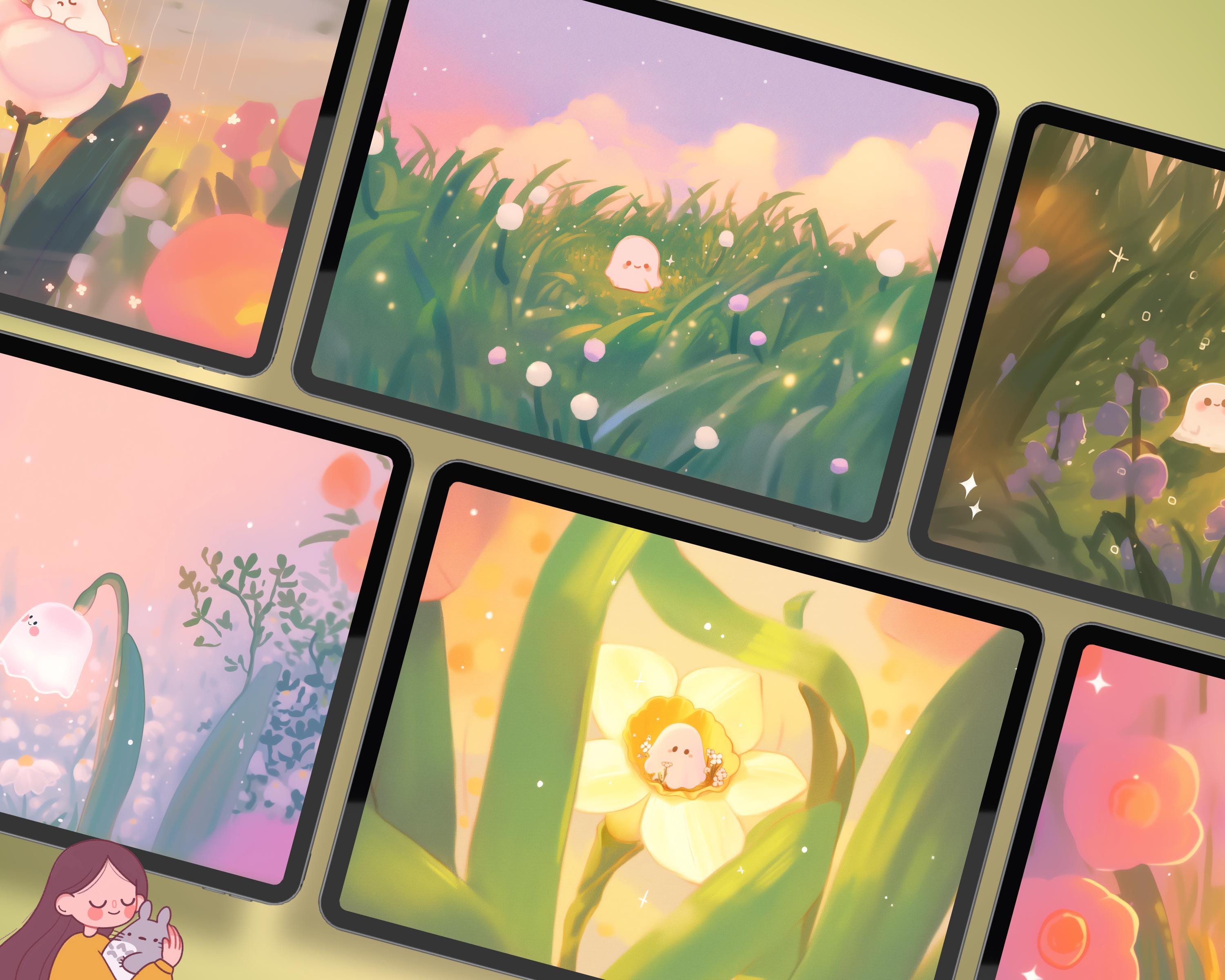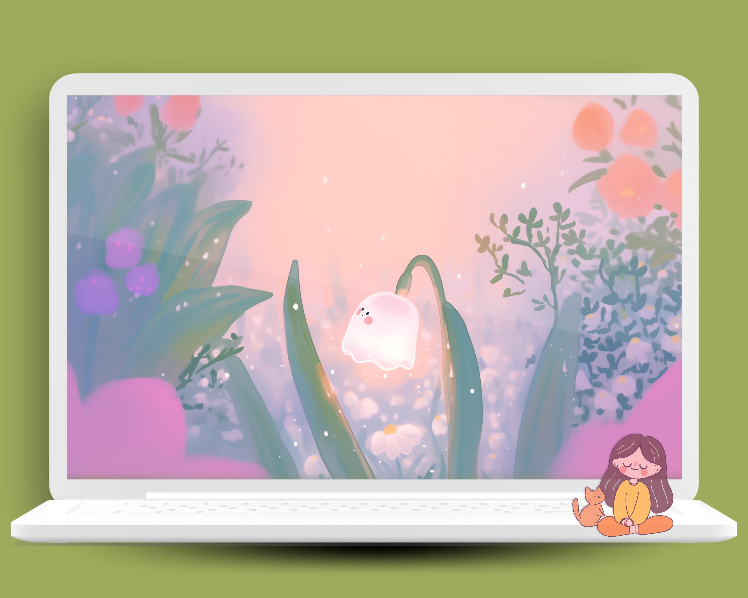 Kawaii Spring Ghost Wallpaper, Pastel Flower Screensaver (Digital Download)