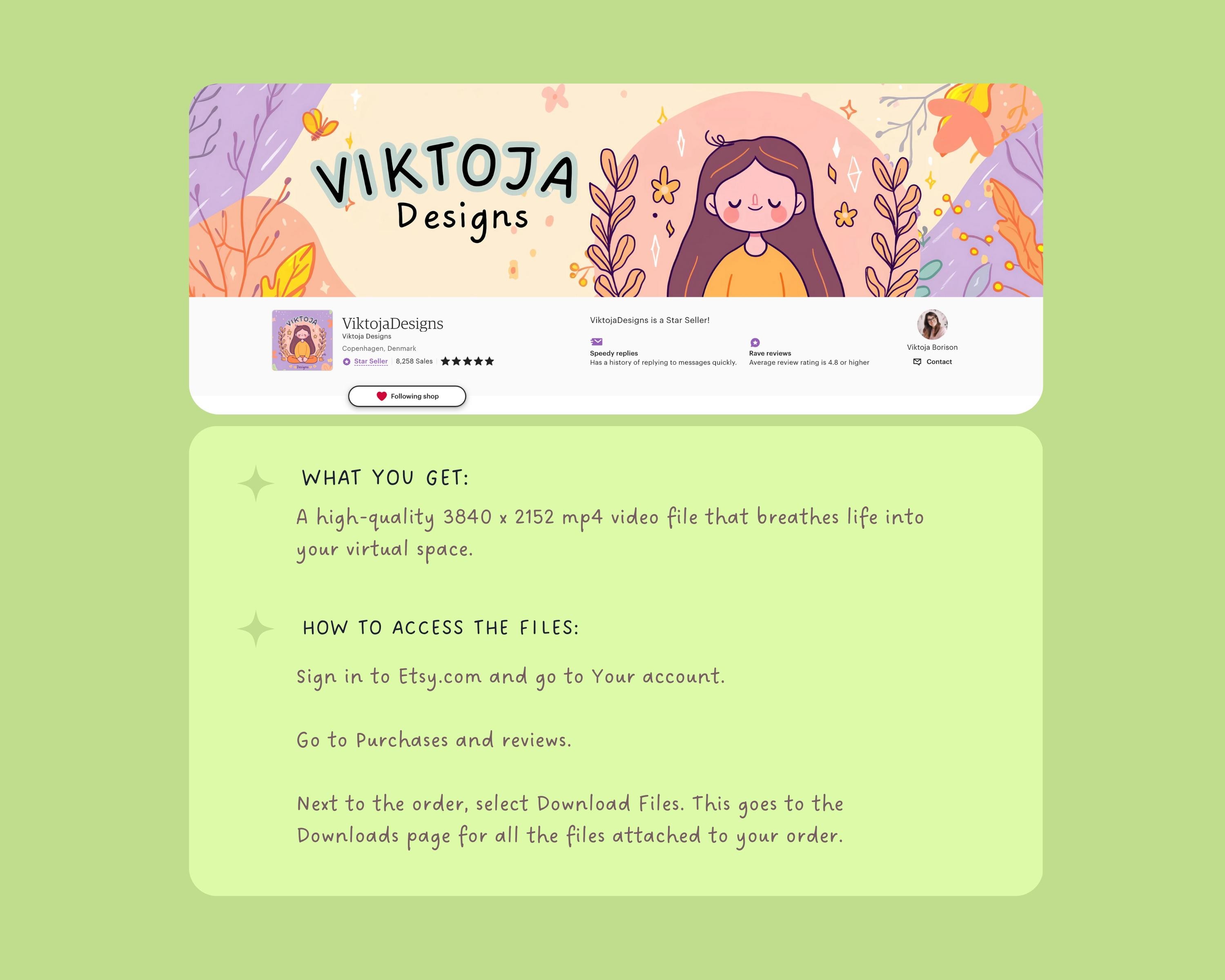 - A high-quality 3840 x 2152 mp4 video file that breathes life into your virtual space. 🌟