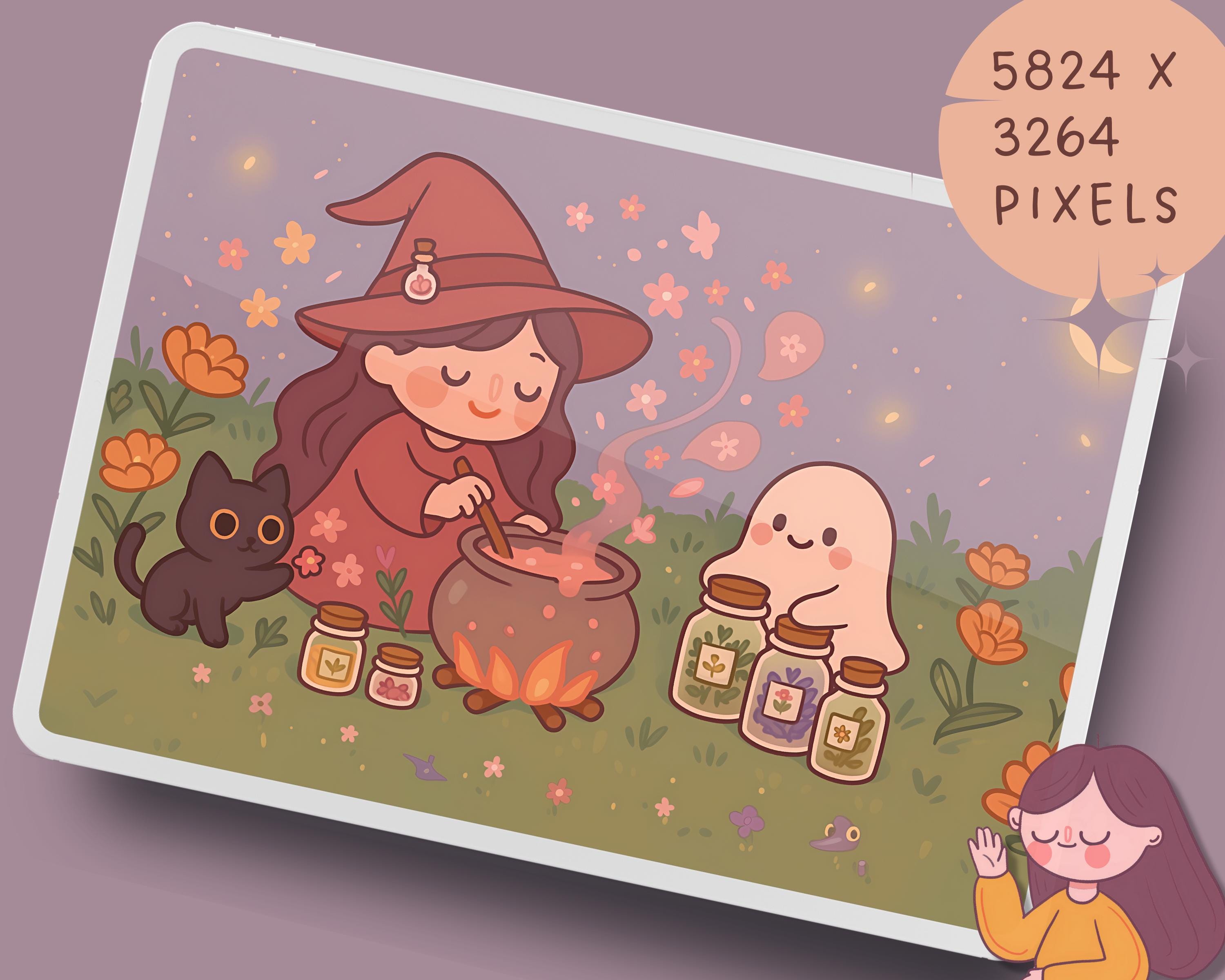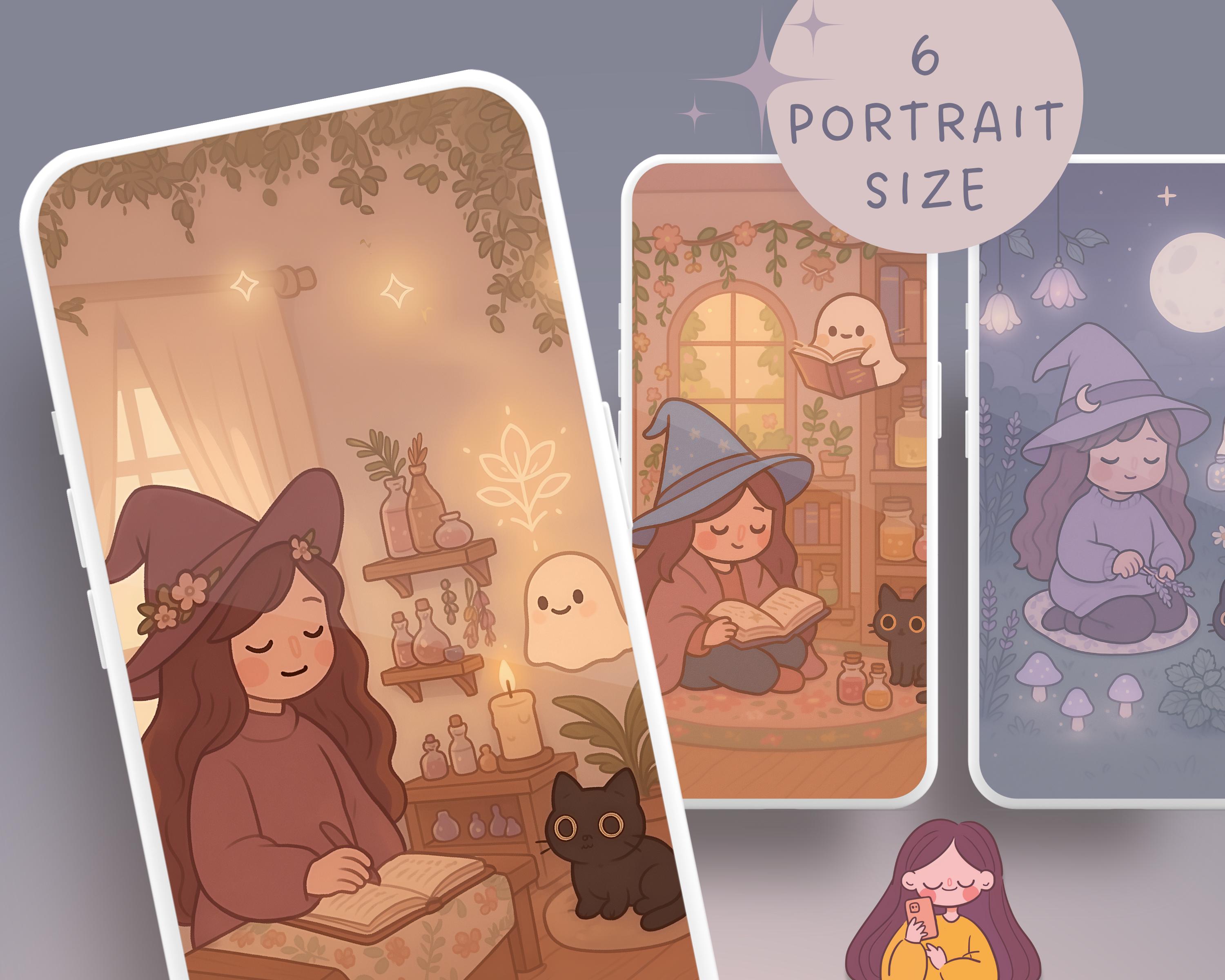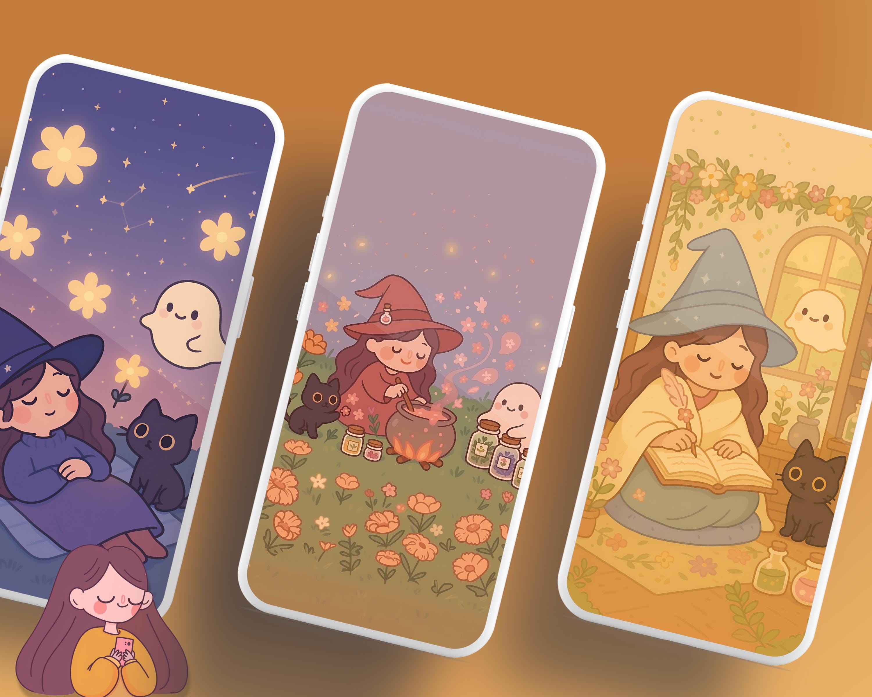 Kawaii Witch Wallpaper Set for Phone & Desktop (Digital Download)