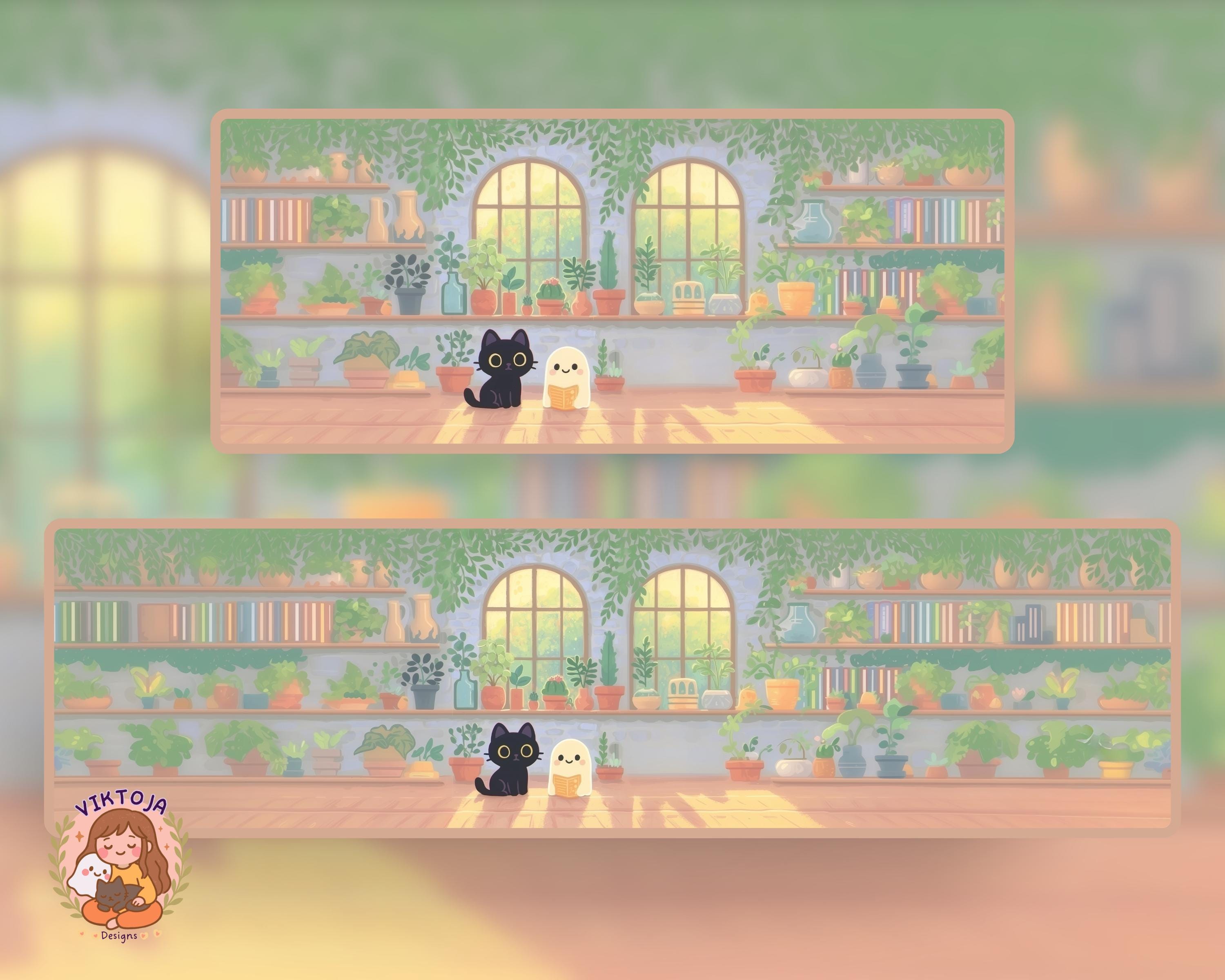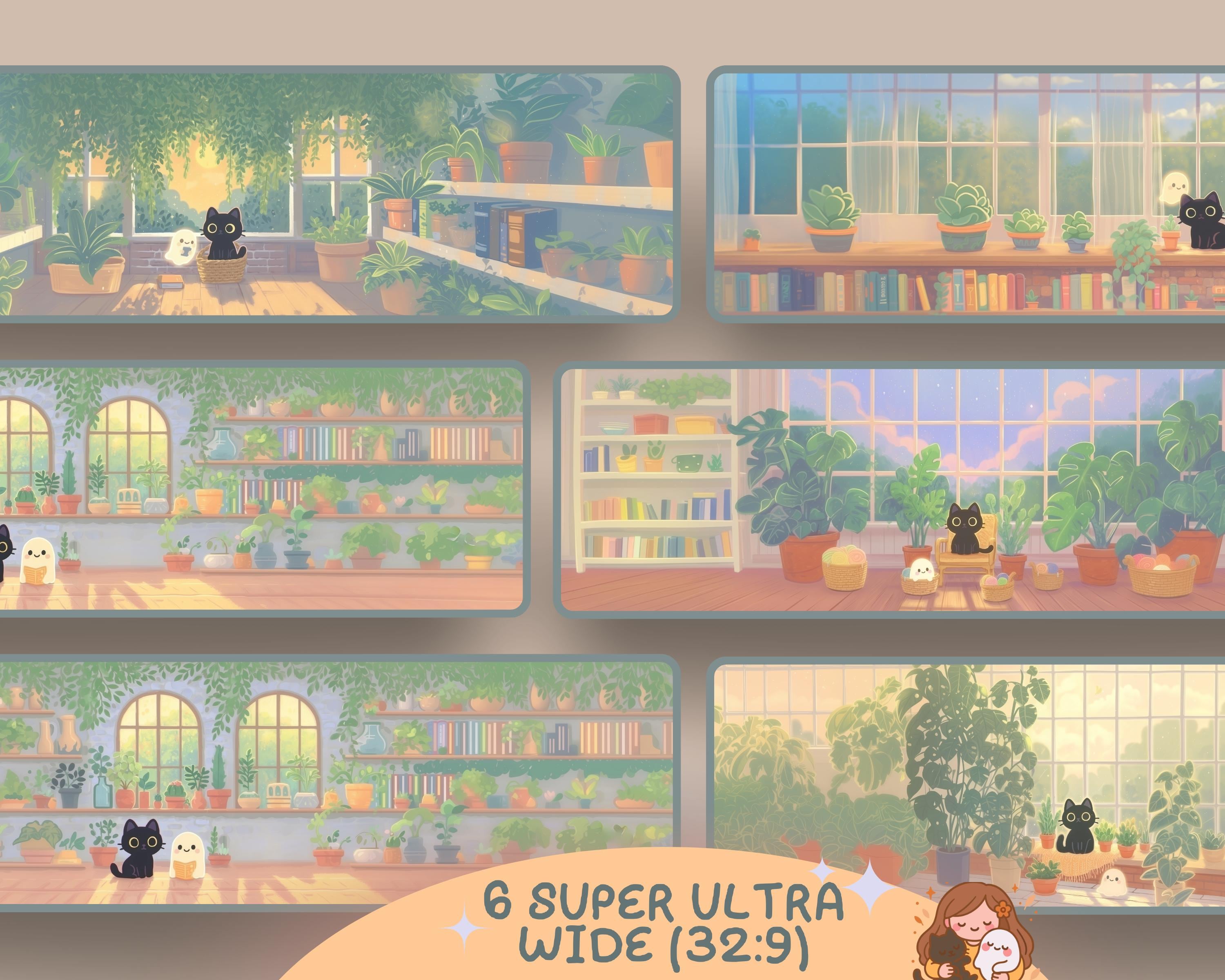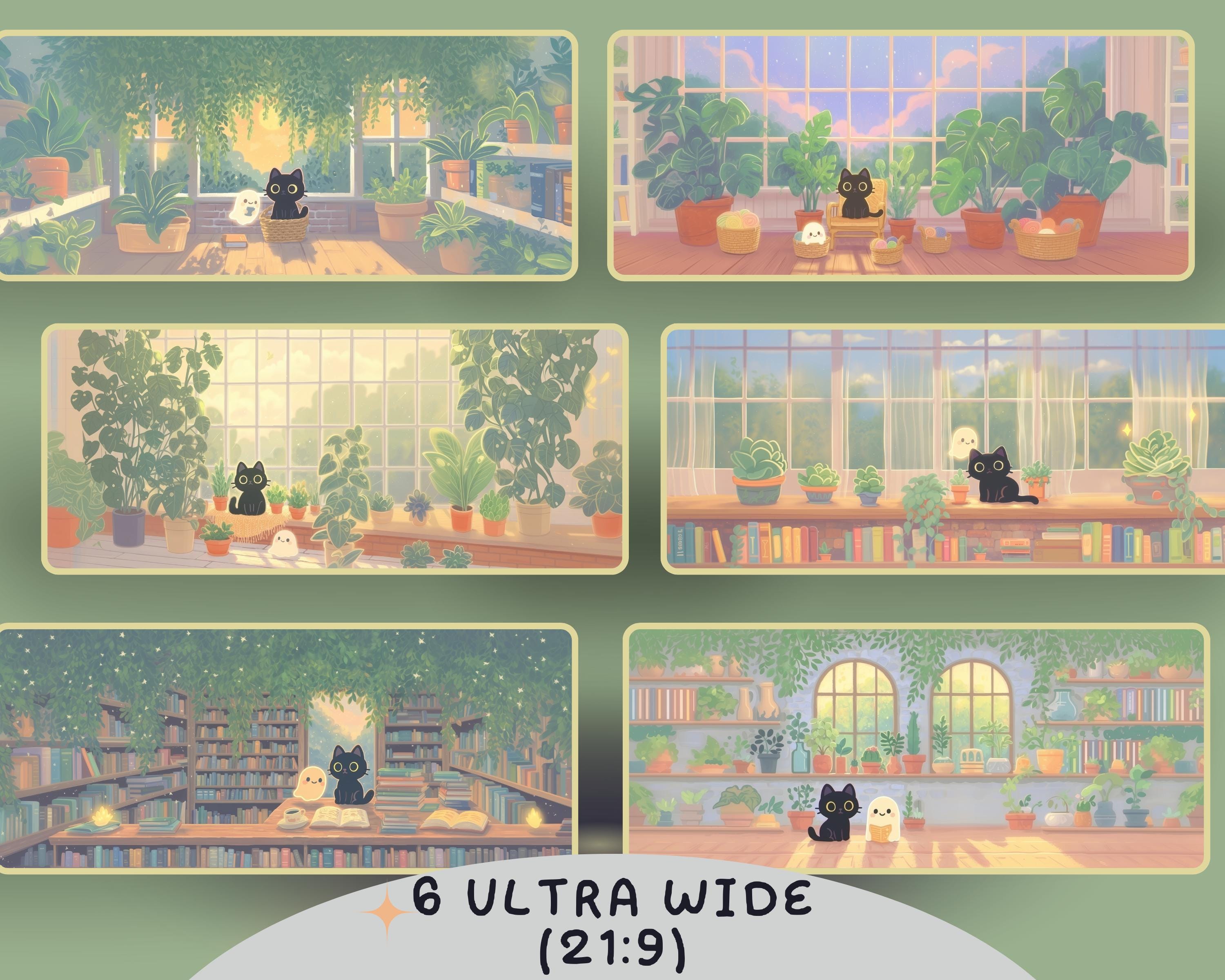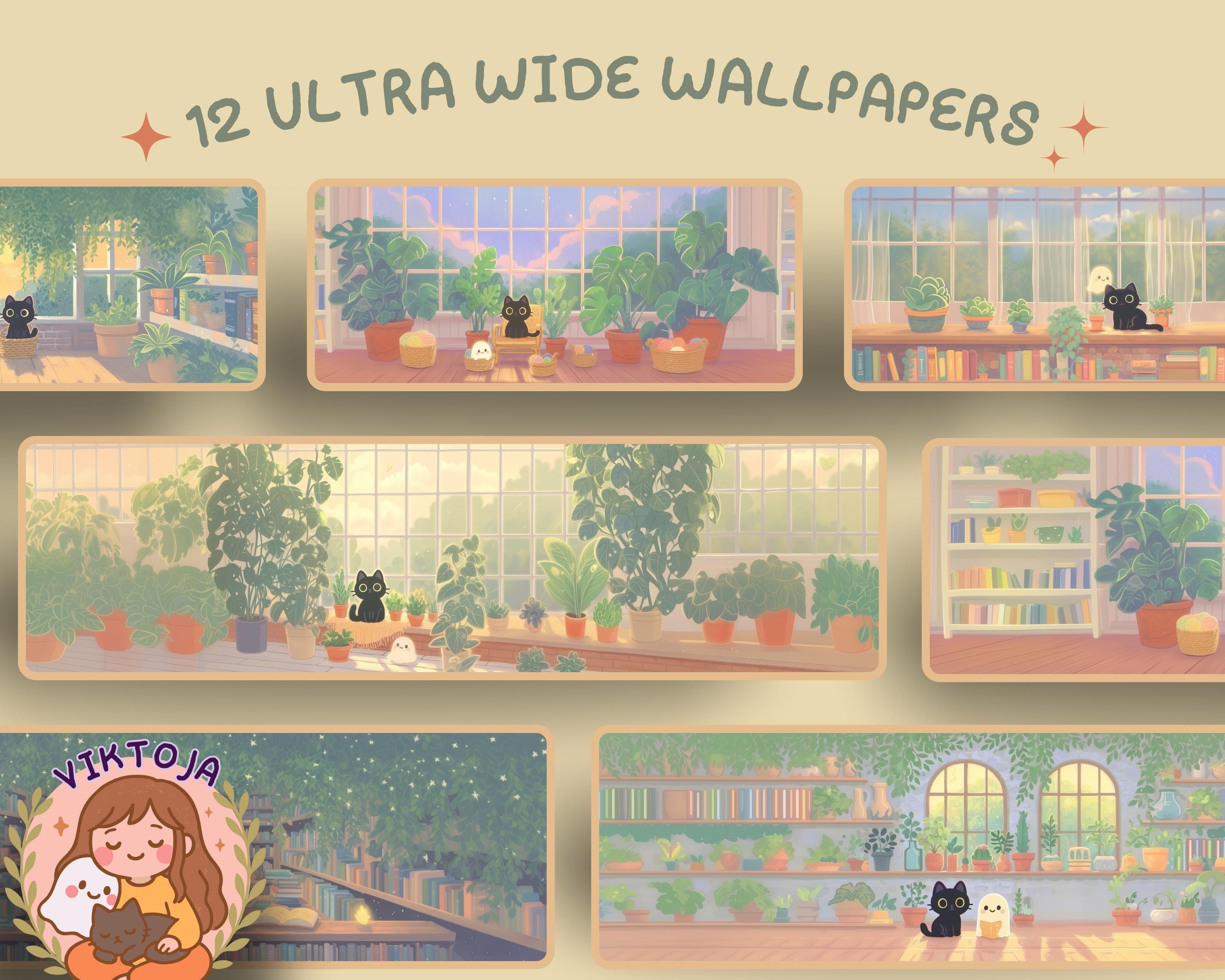 Ultrawide Desktop Wallpaper: Ghostly Plants, Books, Cozy Kawaii (Digital Download, 12 PNGs