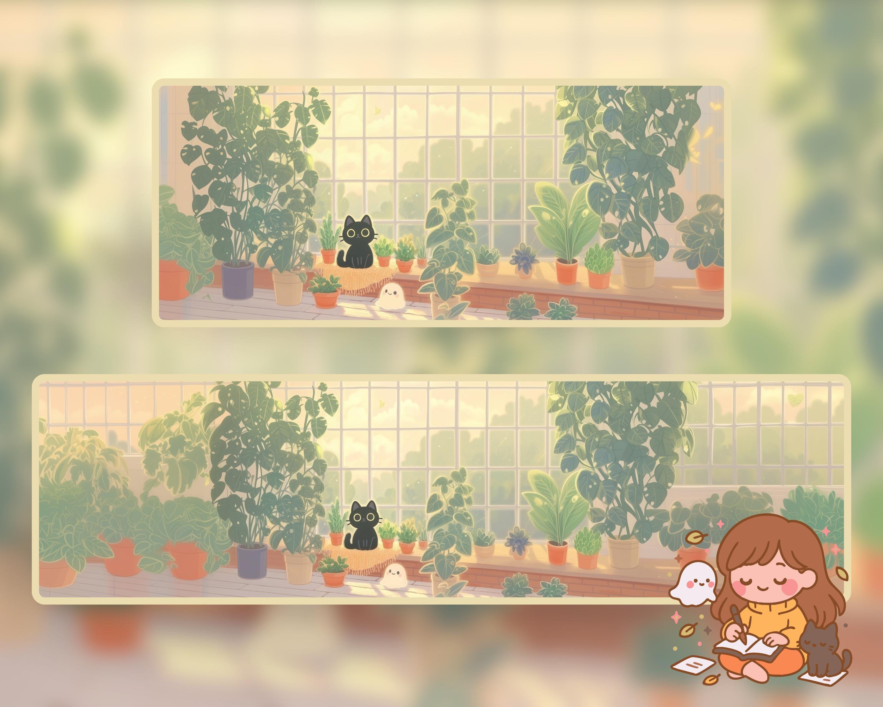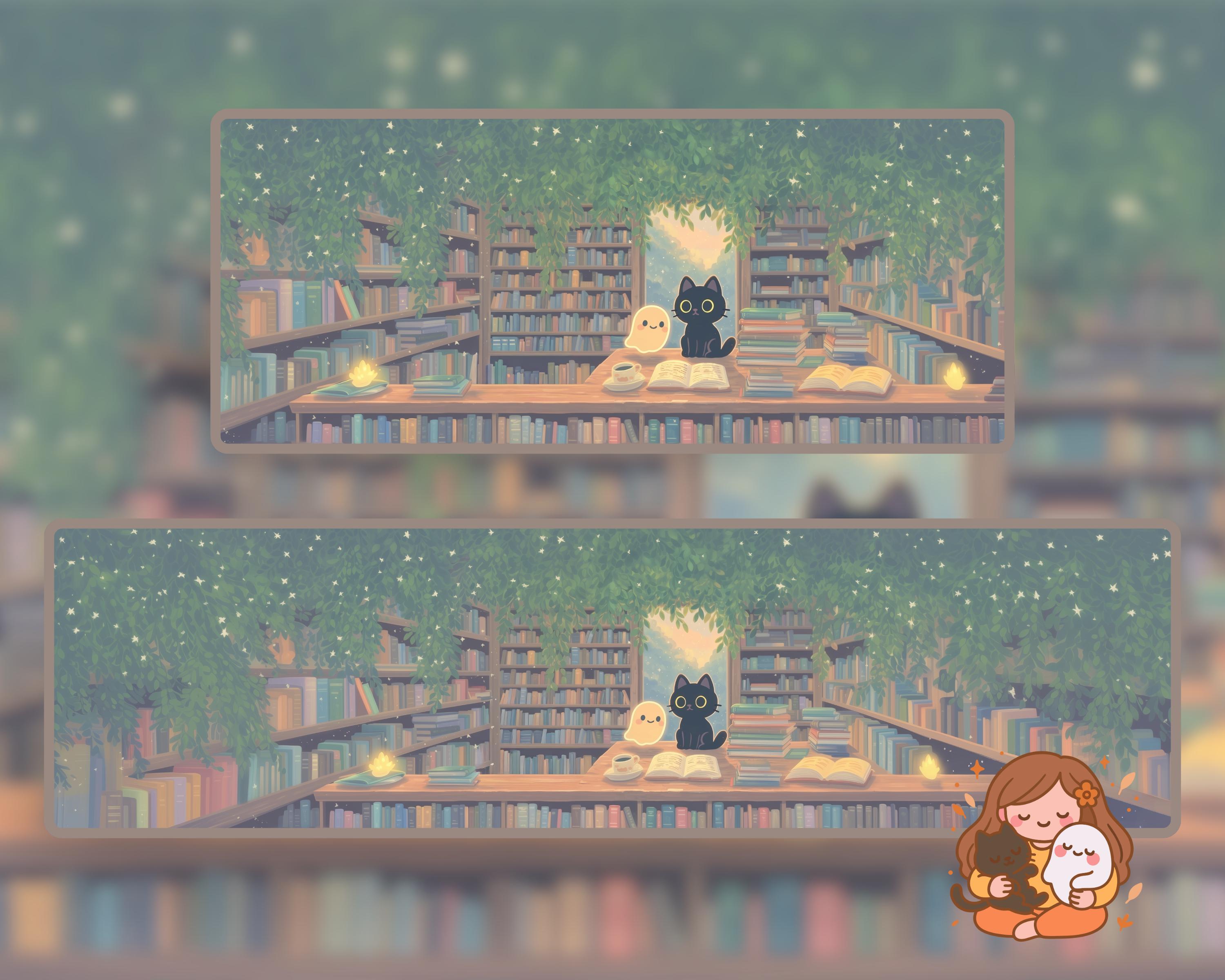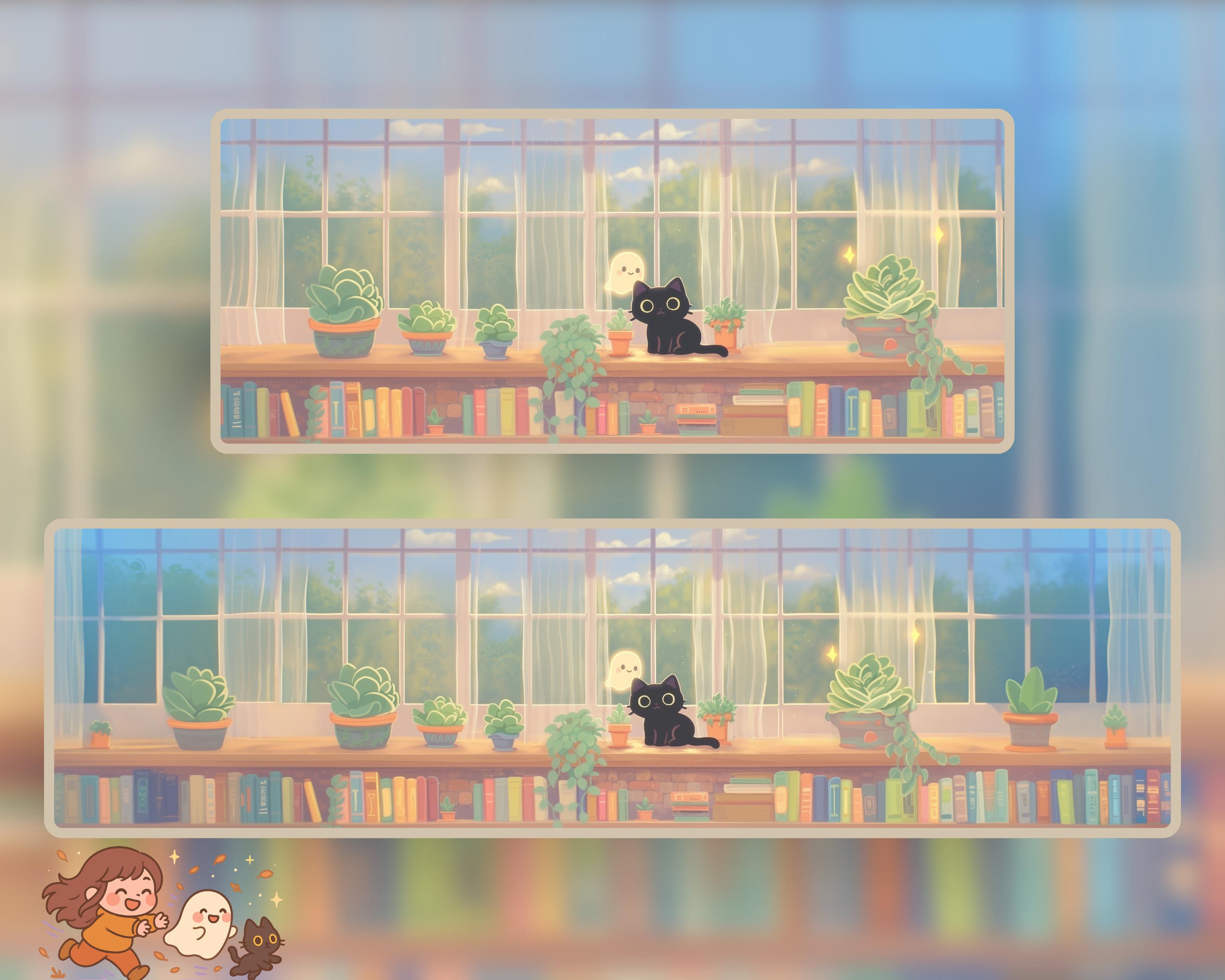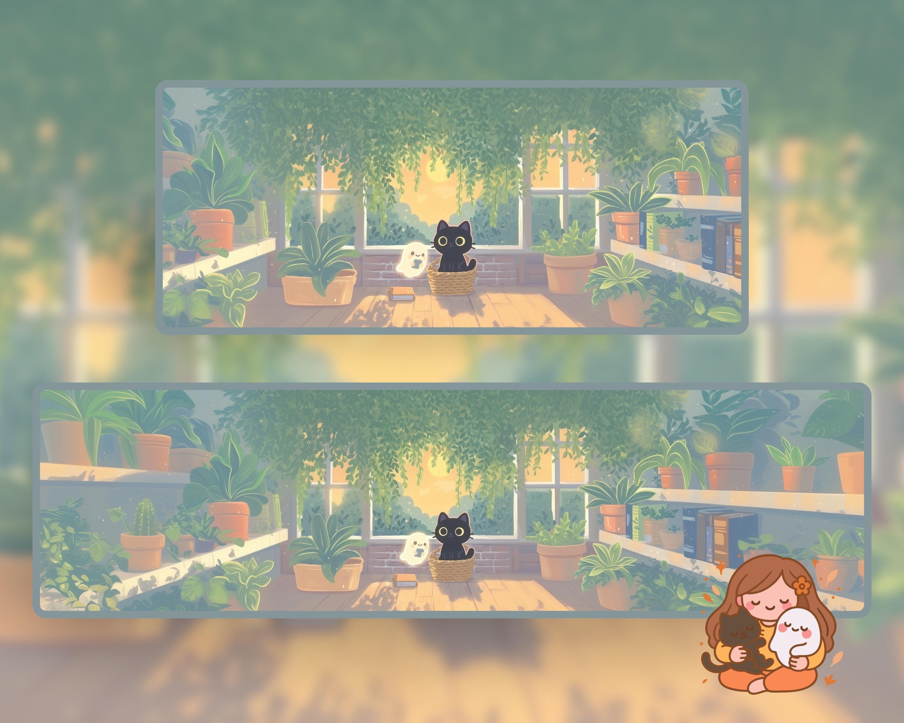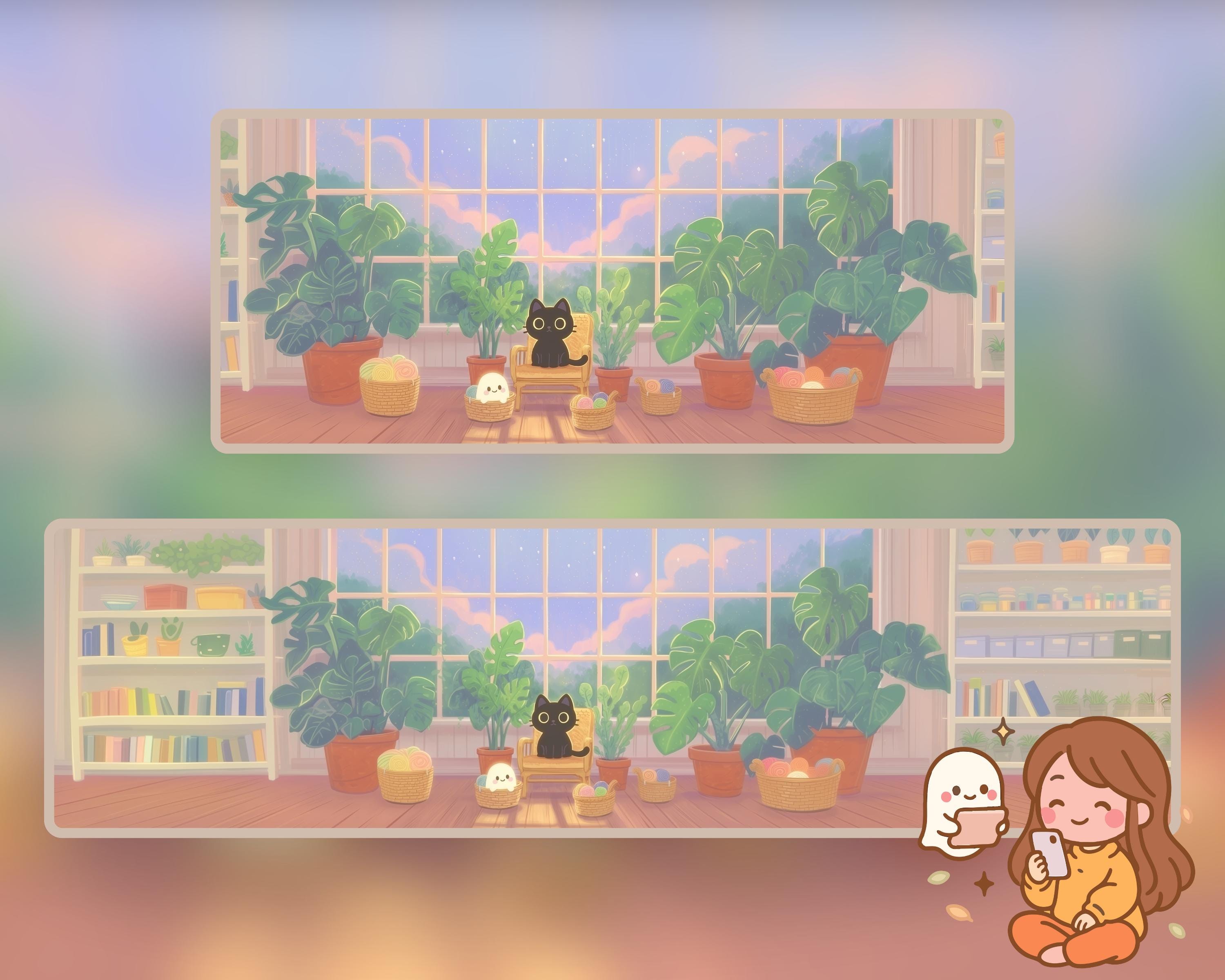 Ultrawide Desktop Wallpaper: Ghostly Plants, Books, Cozy Kawaii (Digital Download, 12 PNGs