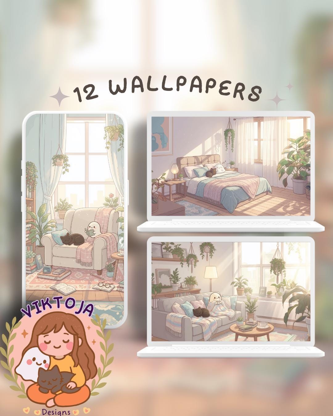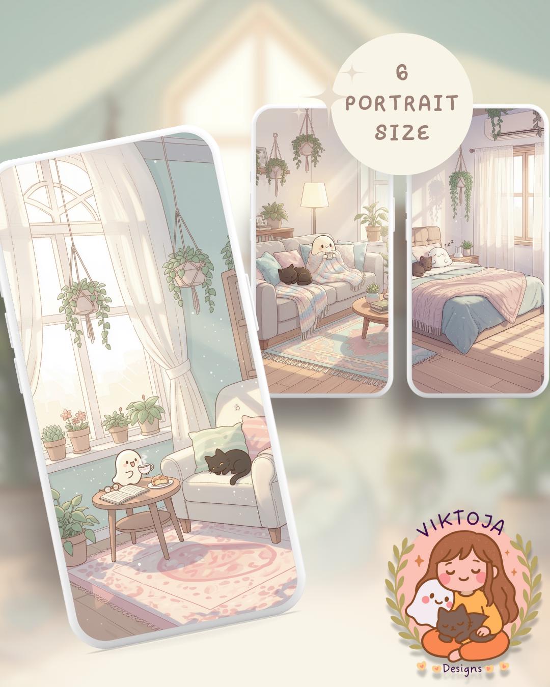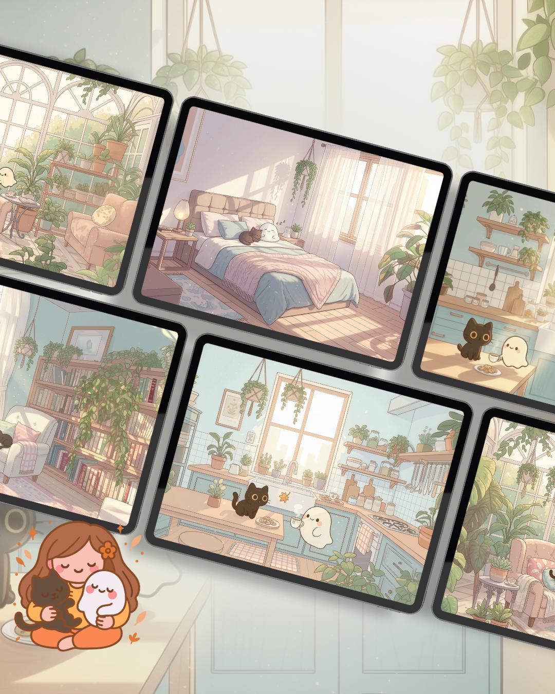 Bring a touch of magic to your devices with this set of 12 Studio Cats, plants and books cozy wallpapers! Featuring cute cats in cozy settings, these high-res JPG files will fit perfectly on your phone or computer/tablet screens.