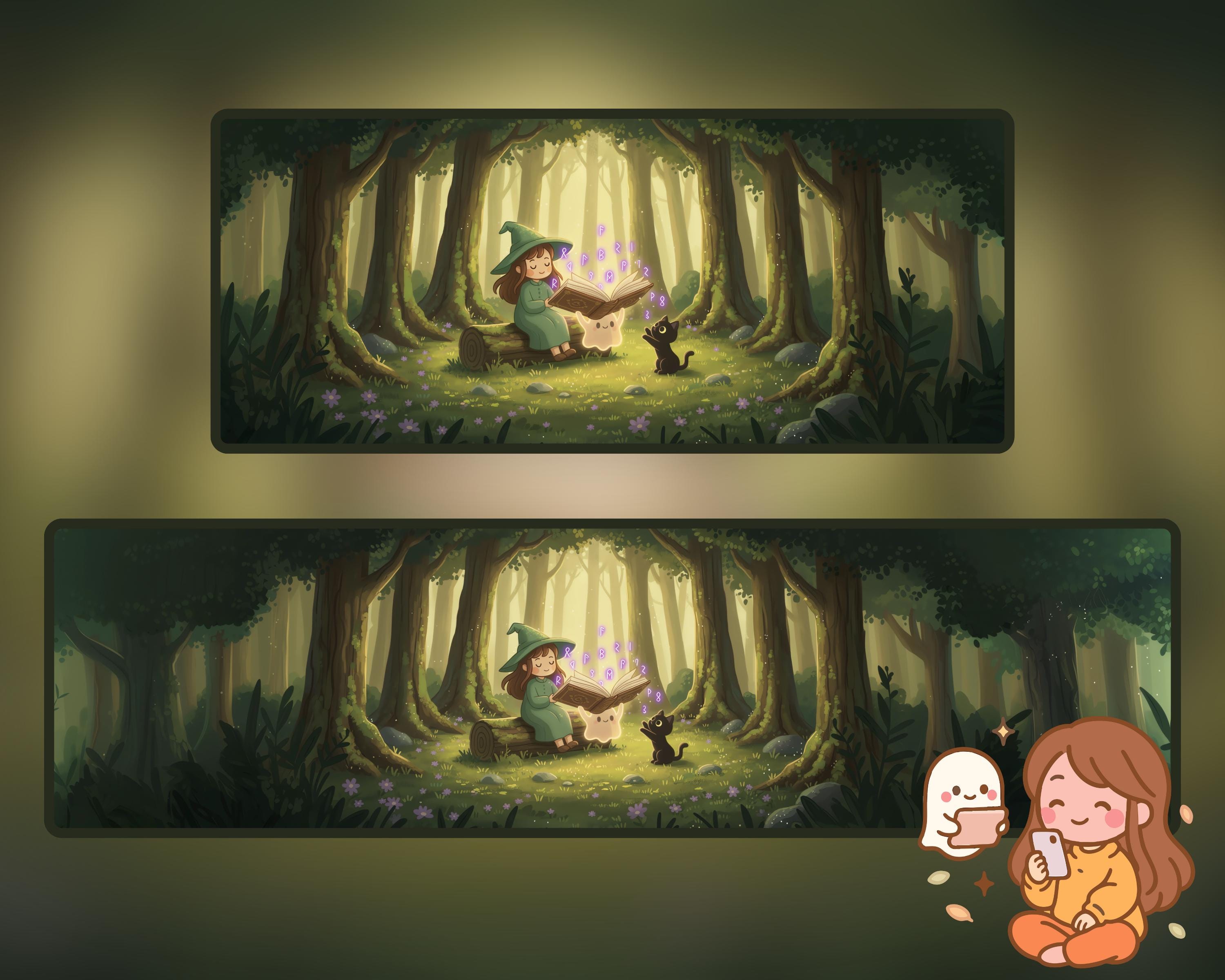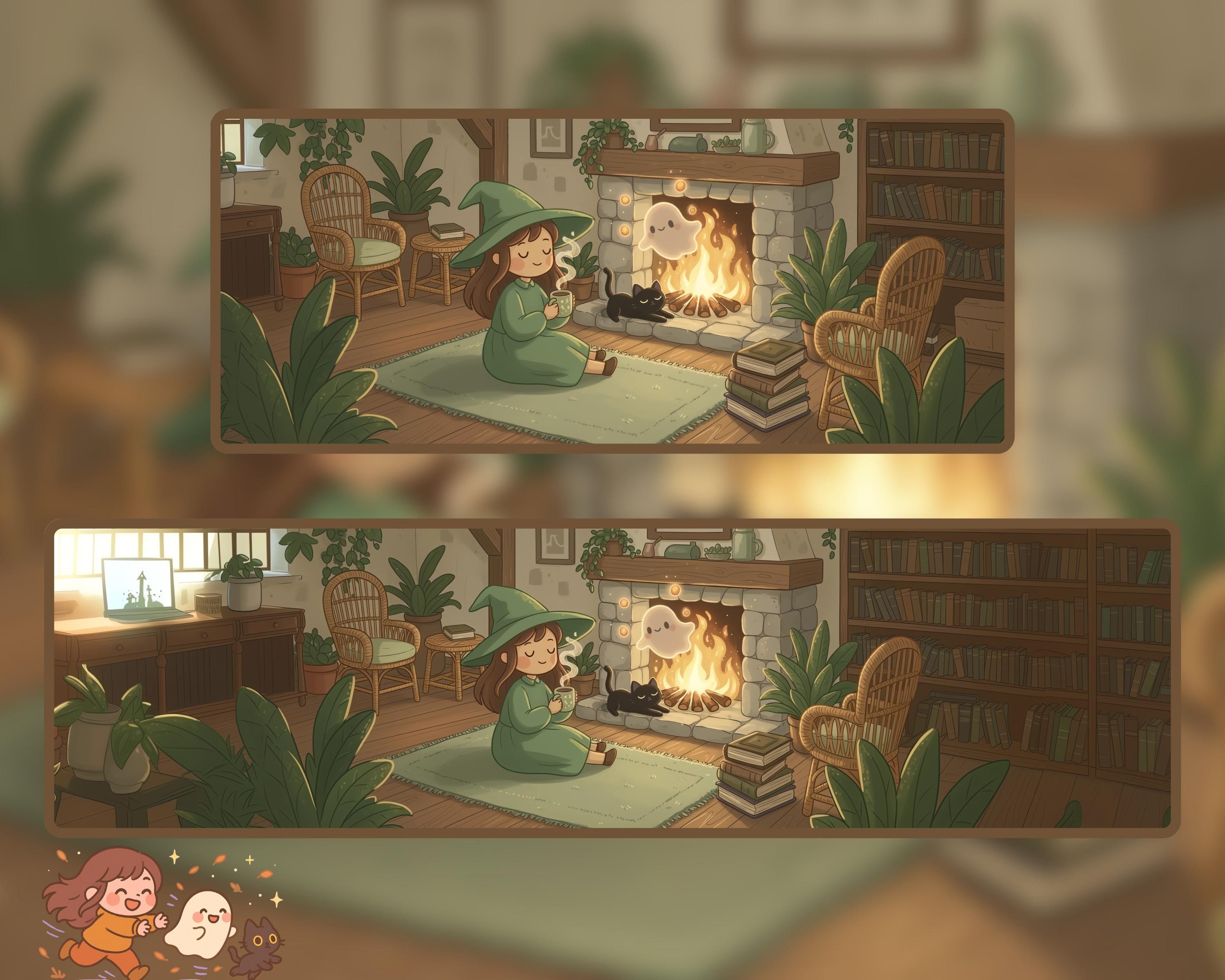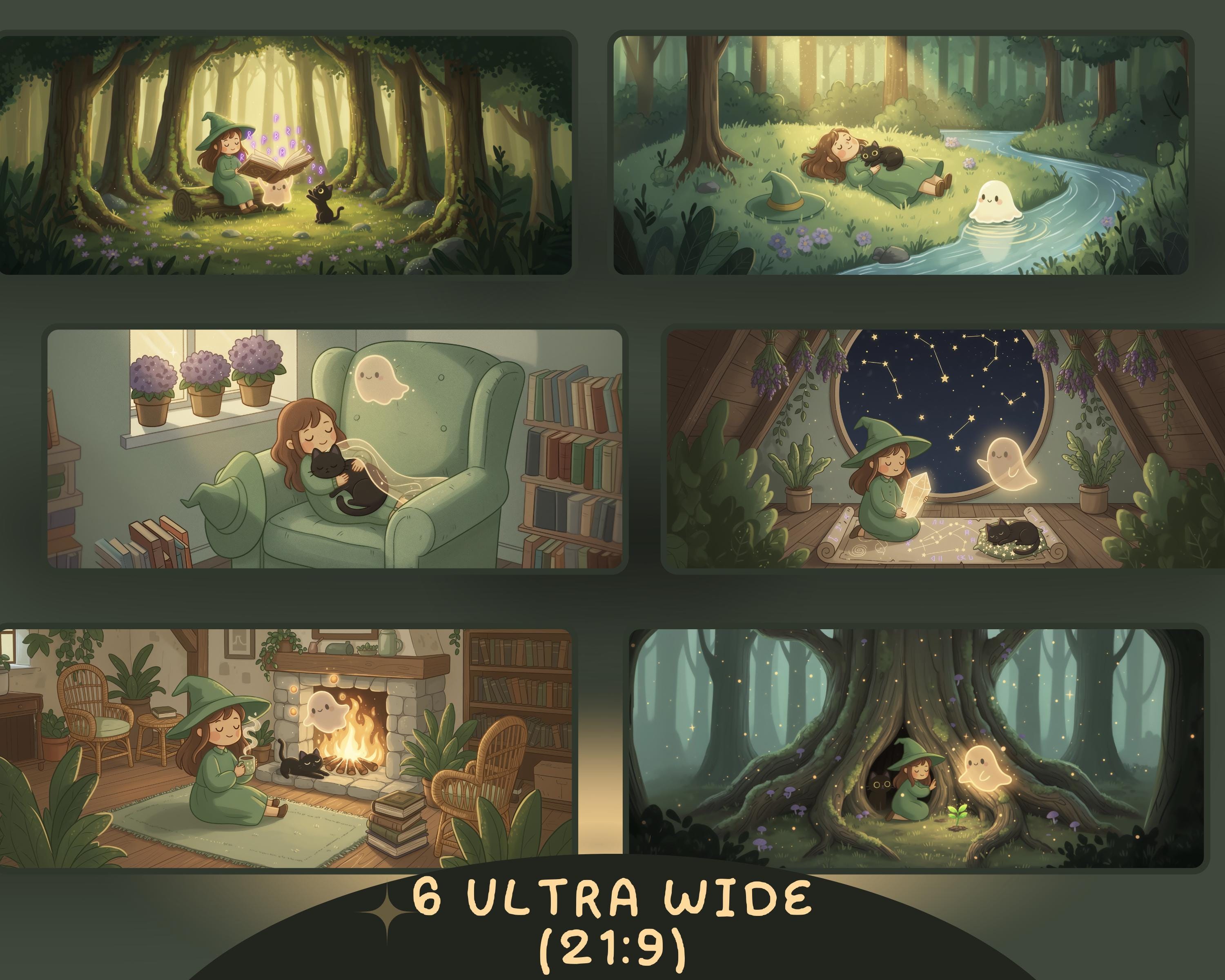 Kawaii Halloween Ultrawide Wallpaper: Witch, Cat & Ghost (Digital Download)