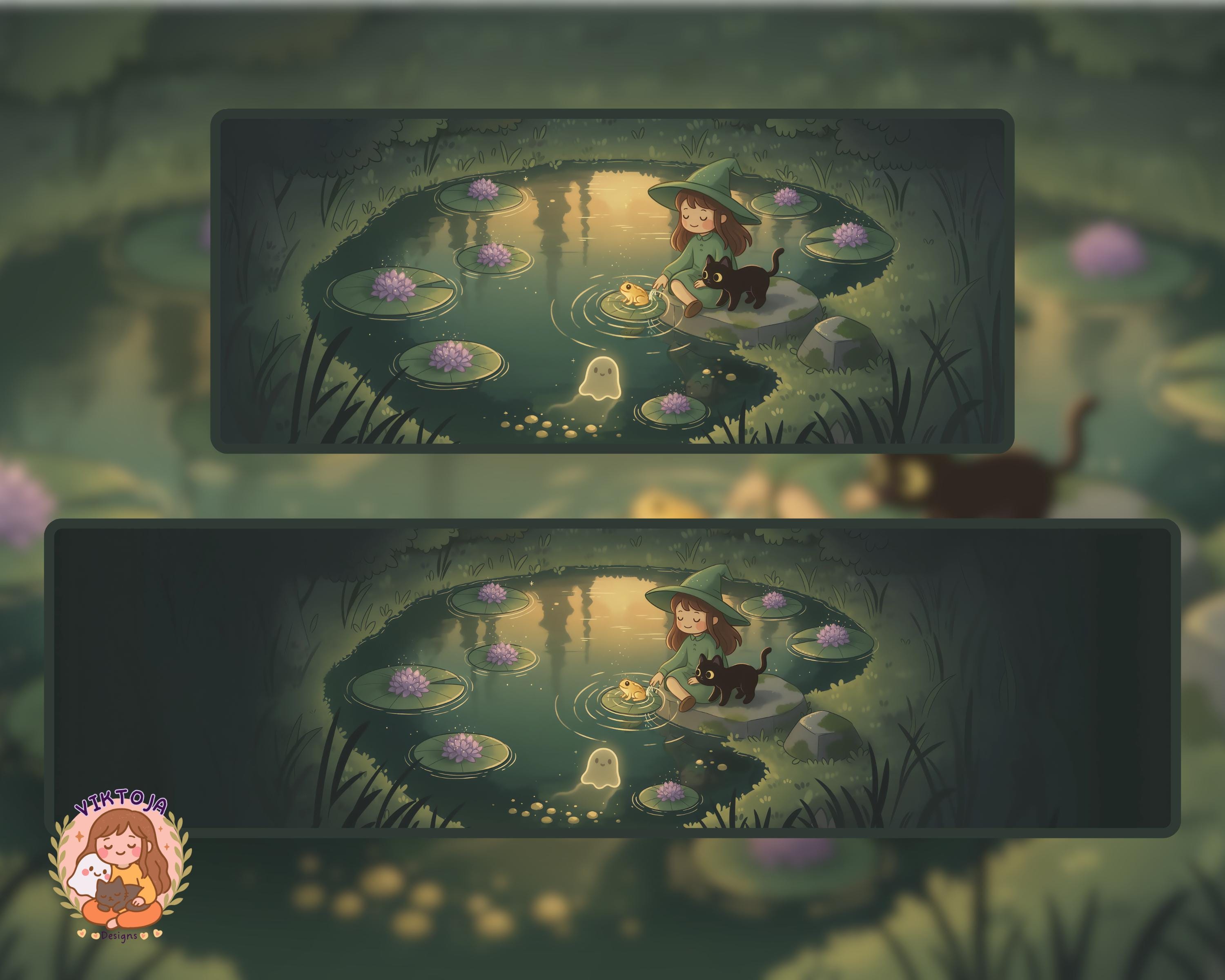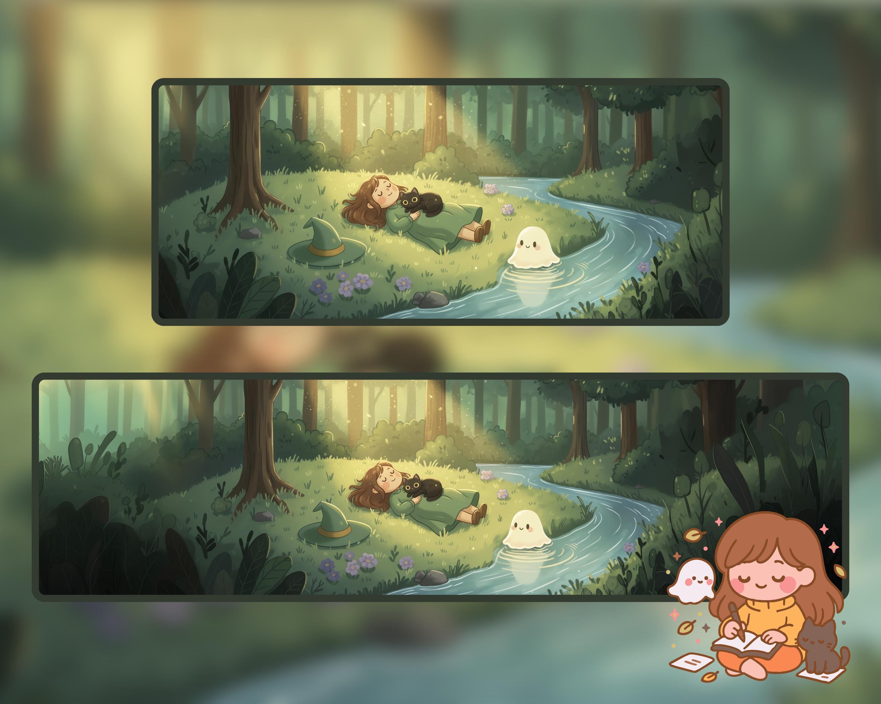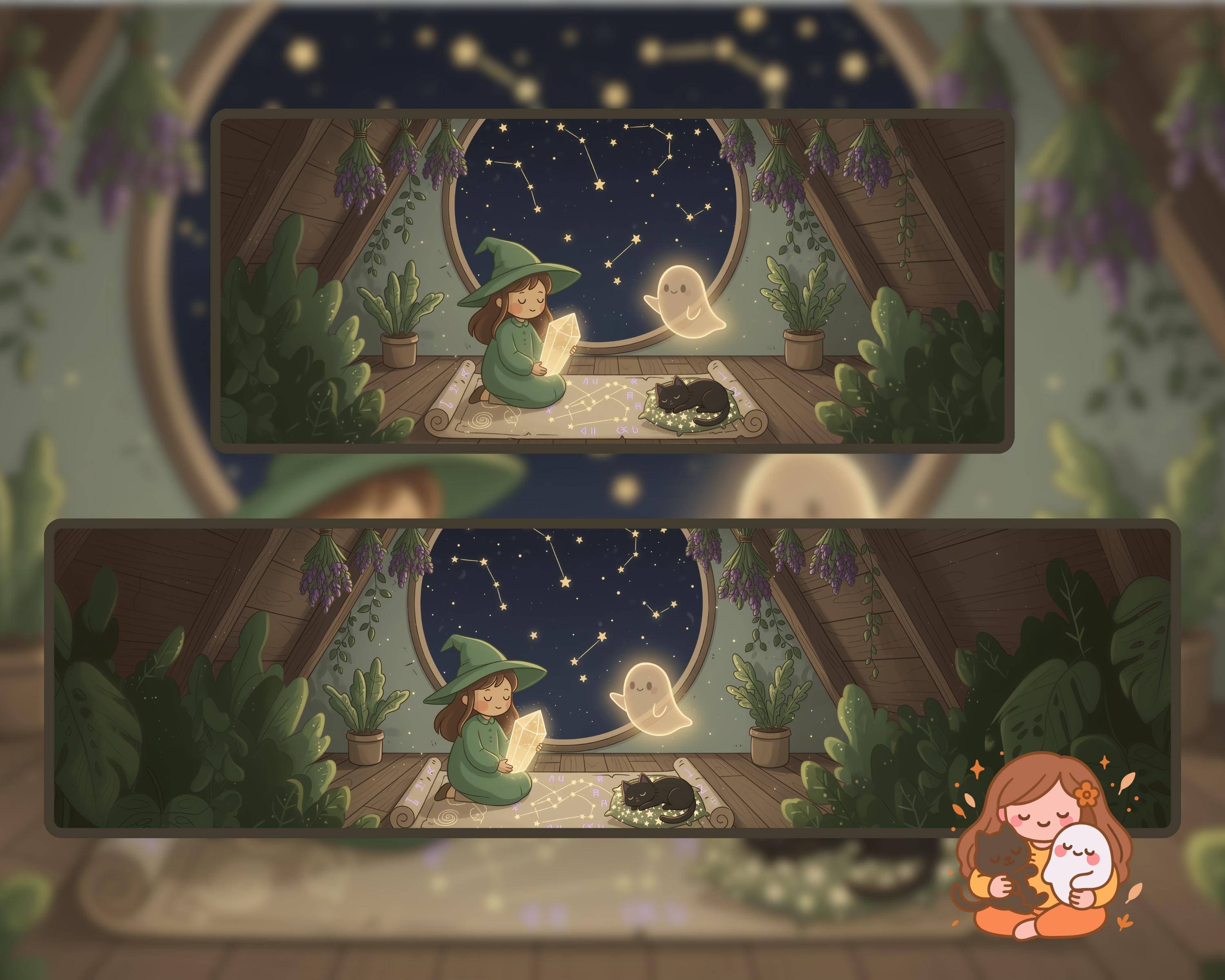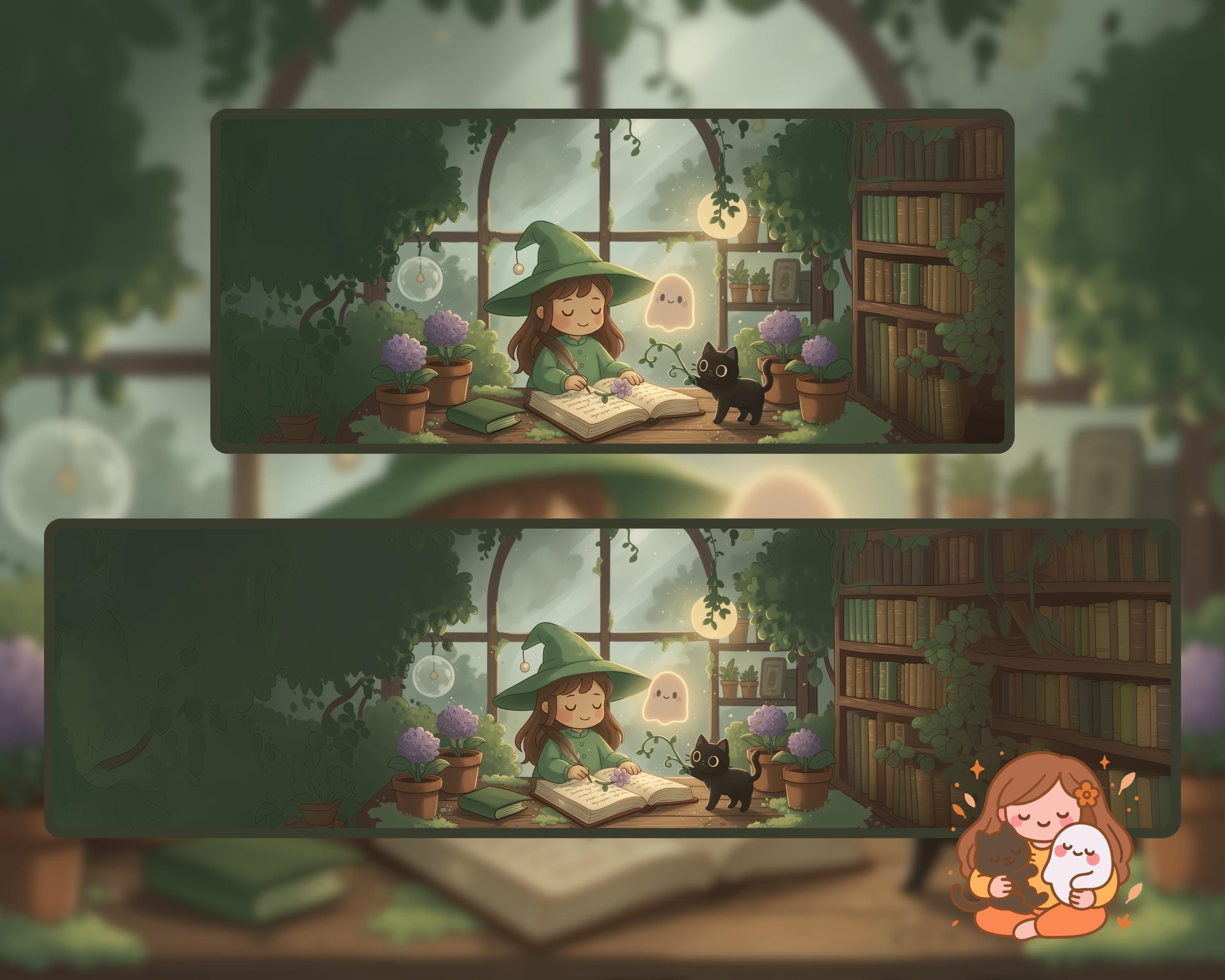 Kawaii Halloween Ultrawide Wallpaper: Witch, Cat & Ghost (Digital Download)
