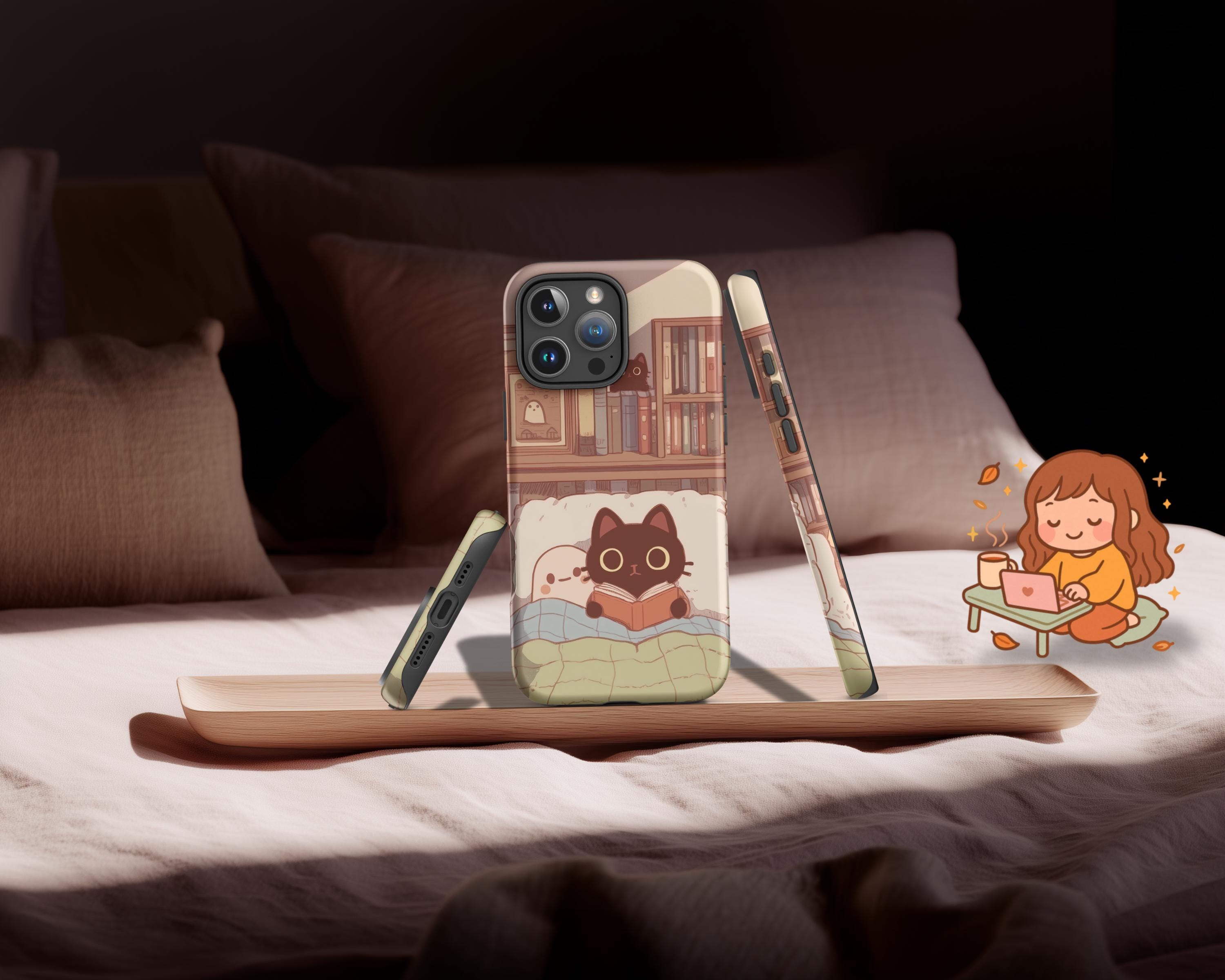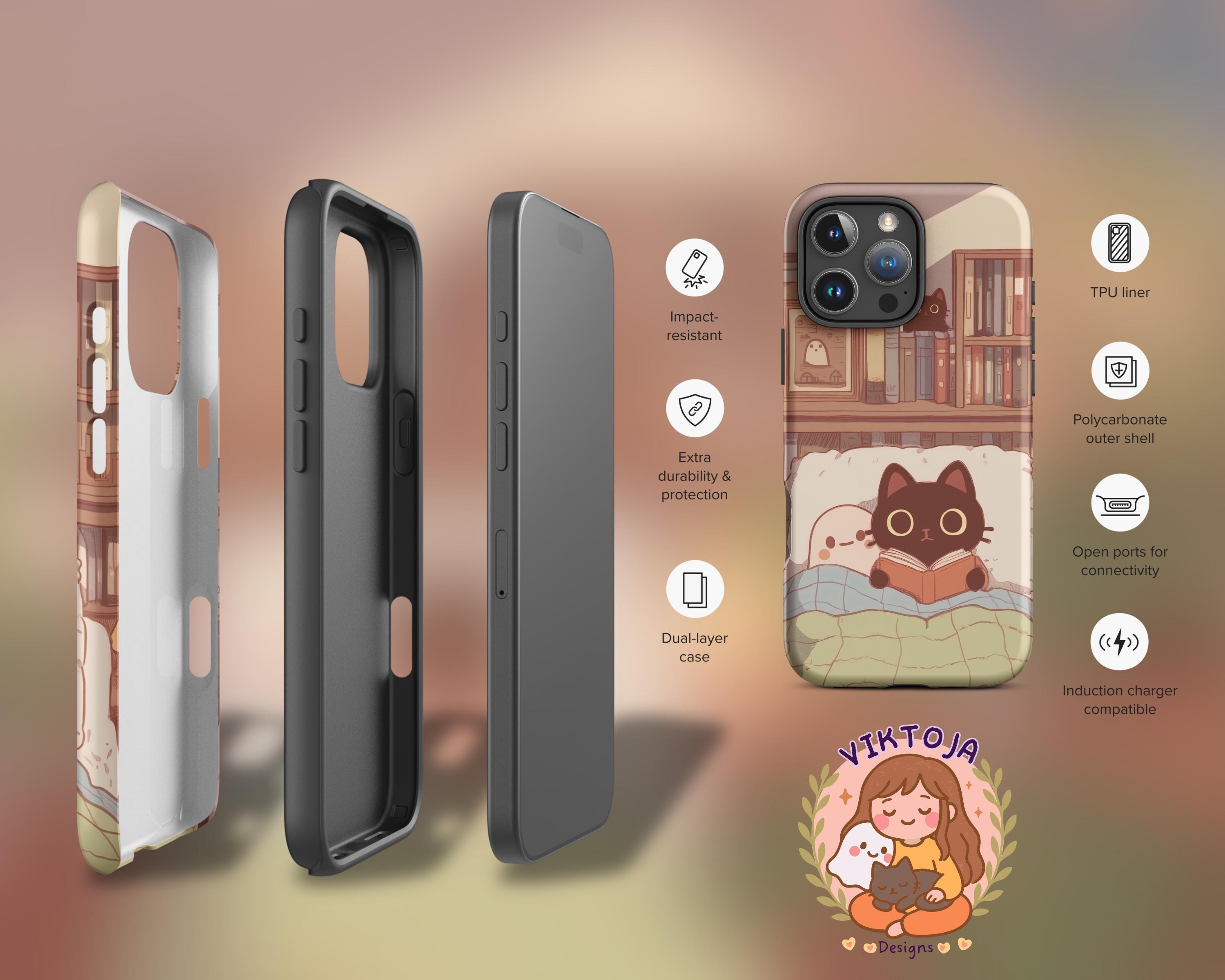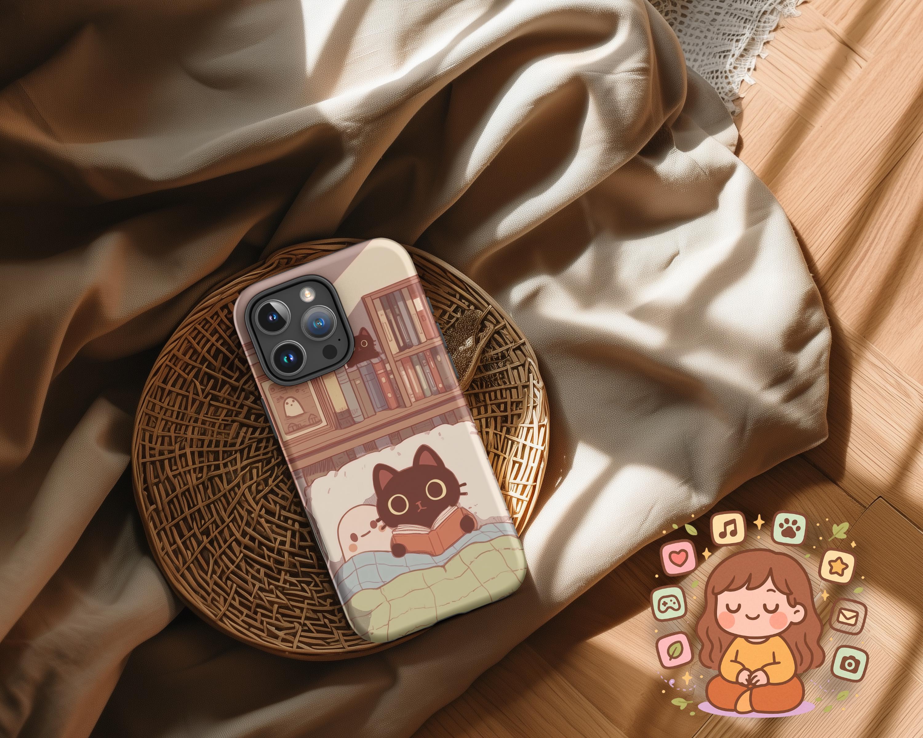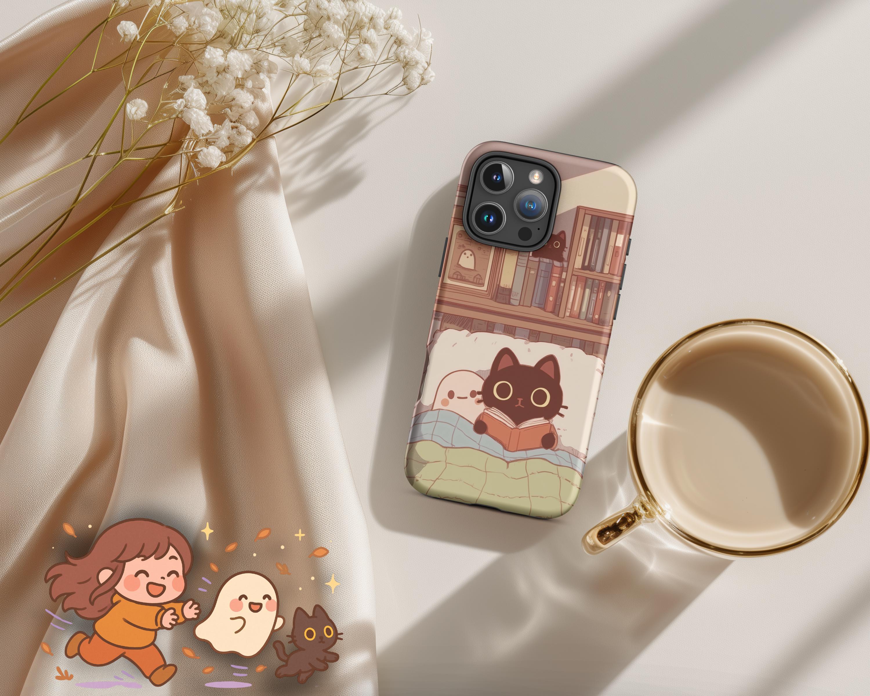 Cozy Cat and Ghost iPhone Case Light Academia Tough Case for Apple iPhone Book Lover Reading Art Dark Academia Gift for Reader