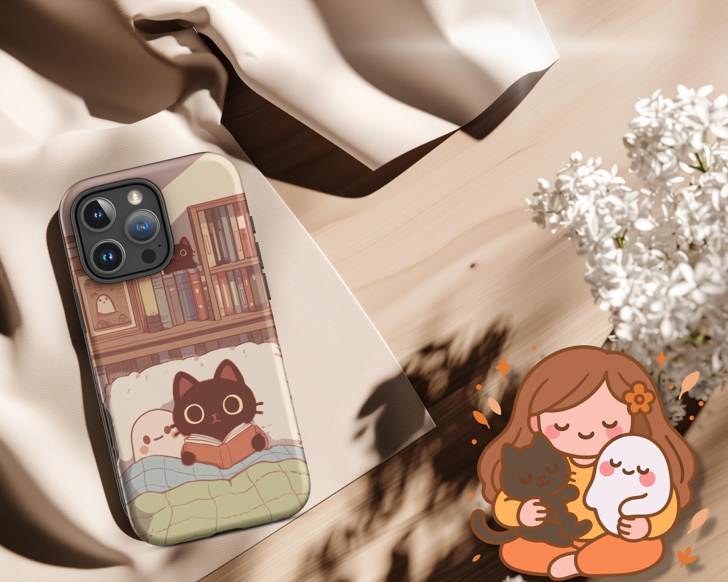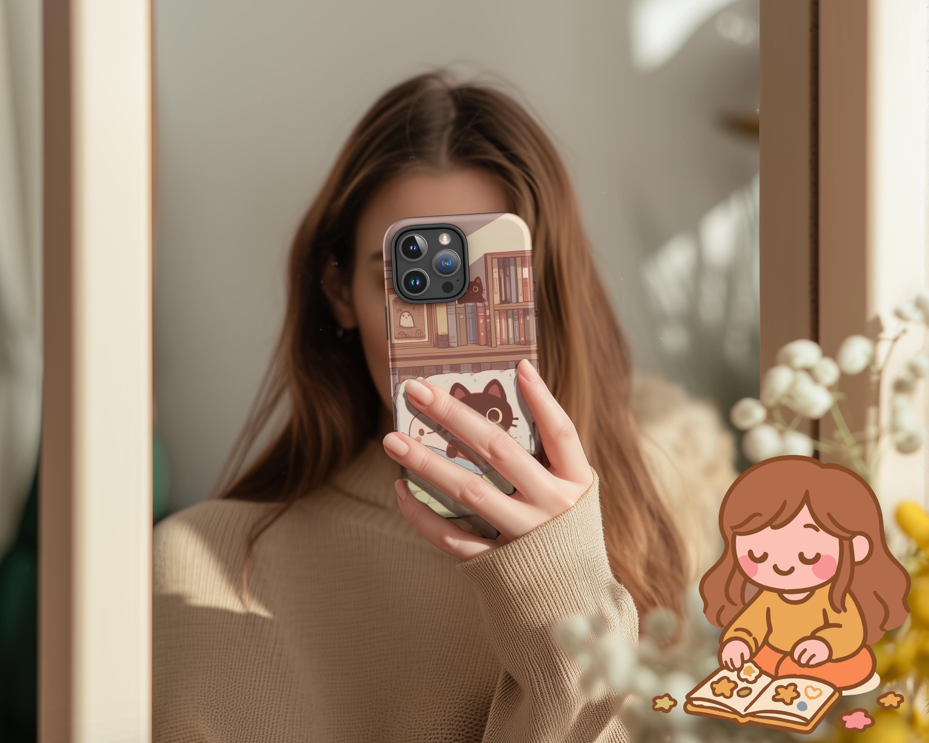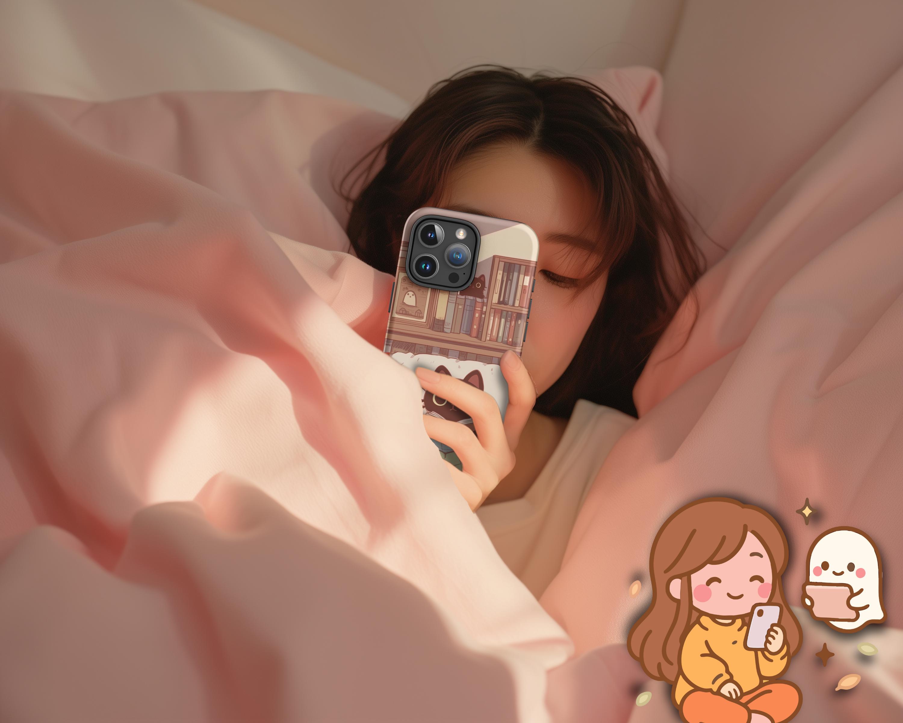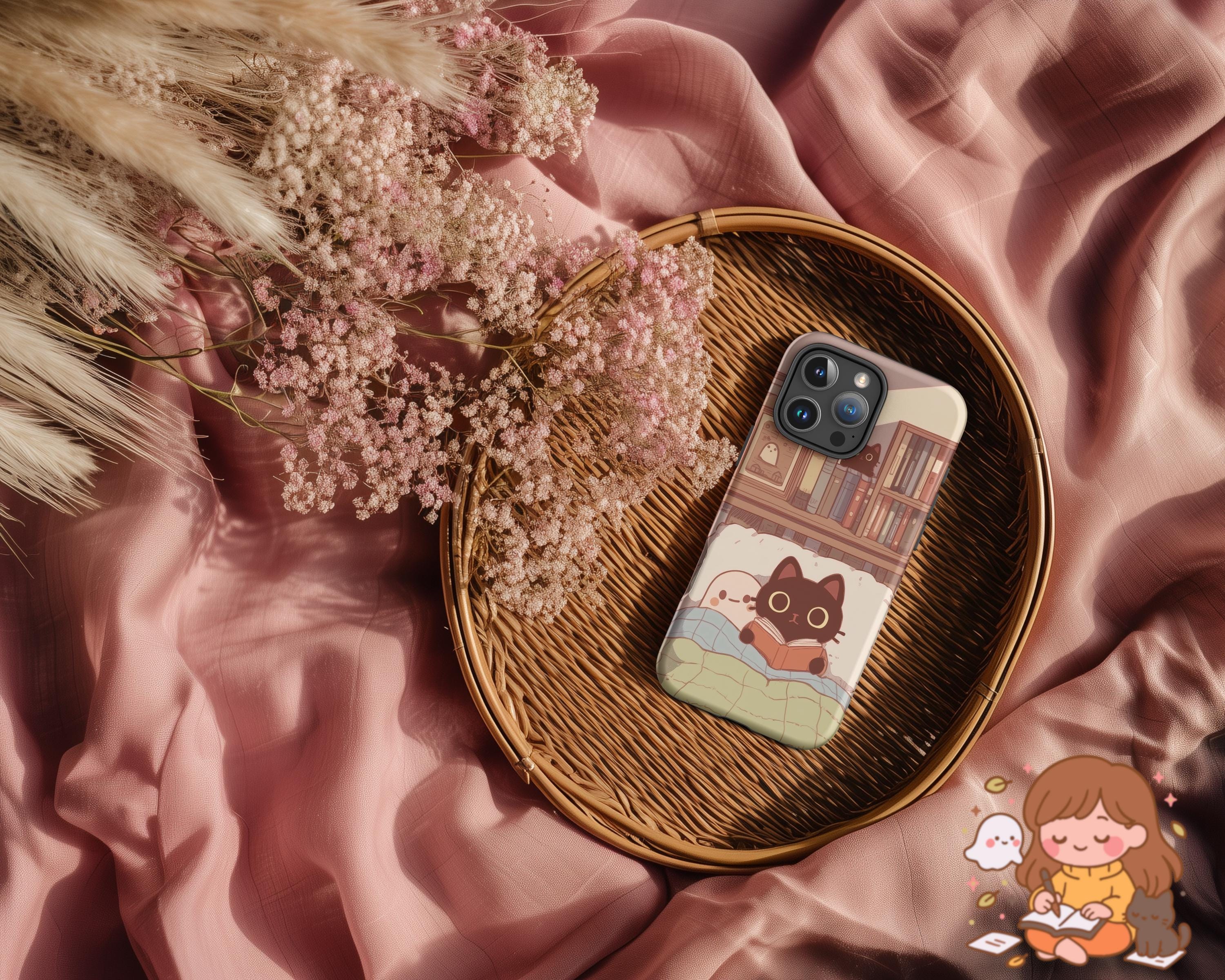 Cozy Cat and Ghost iPhone Case Light Academia Tough Case for Apple iPhone Book Lover Reading Art Dark Academia Gift for Reader