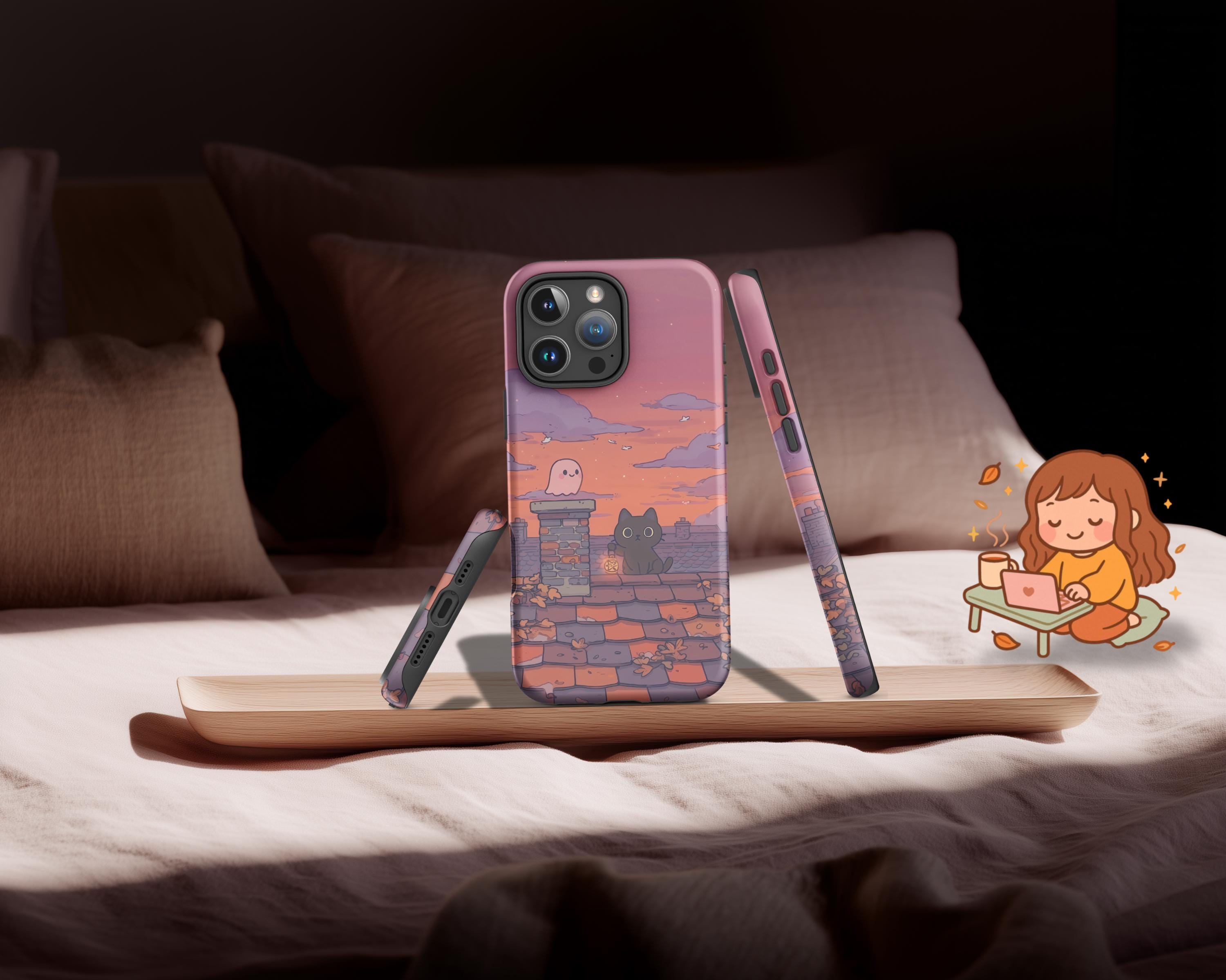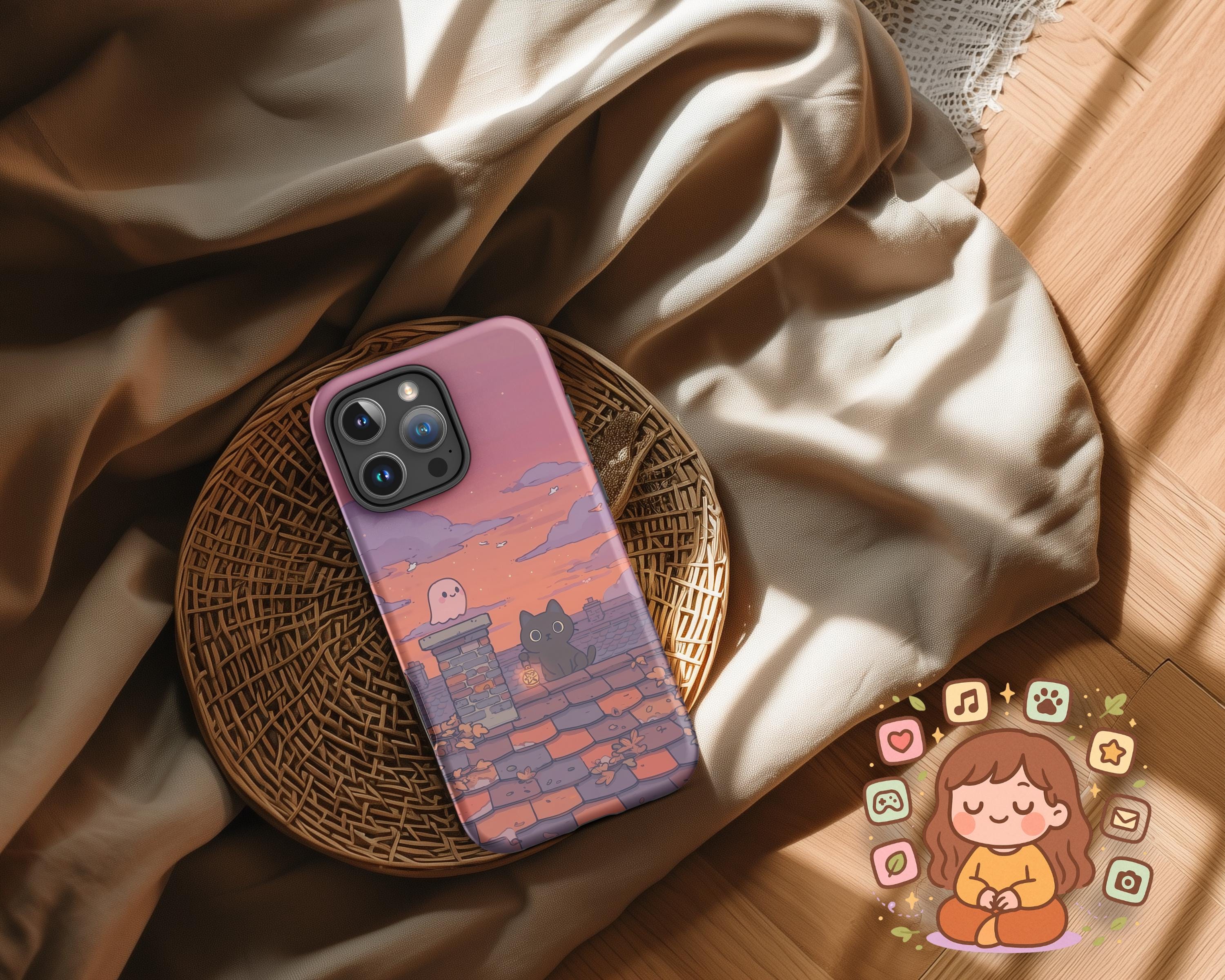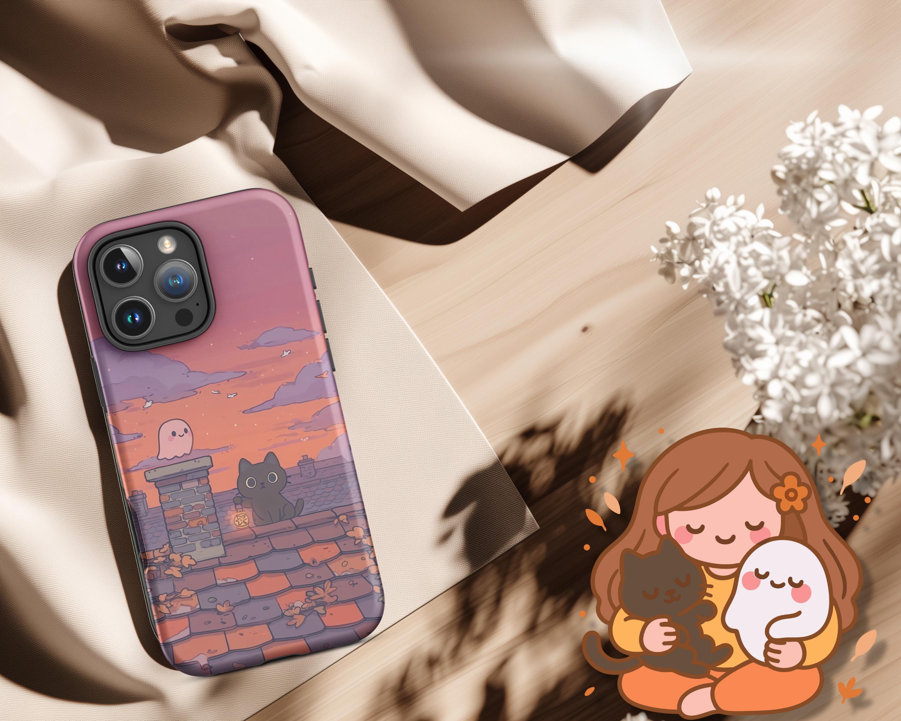 Autumn Cat & Ghost iPhone Case: Spooky Fall Sunset Rooftop Art