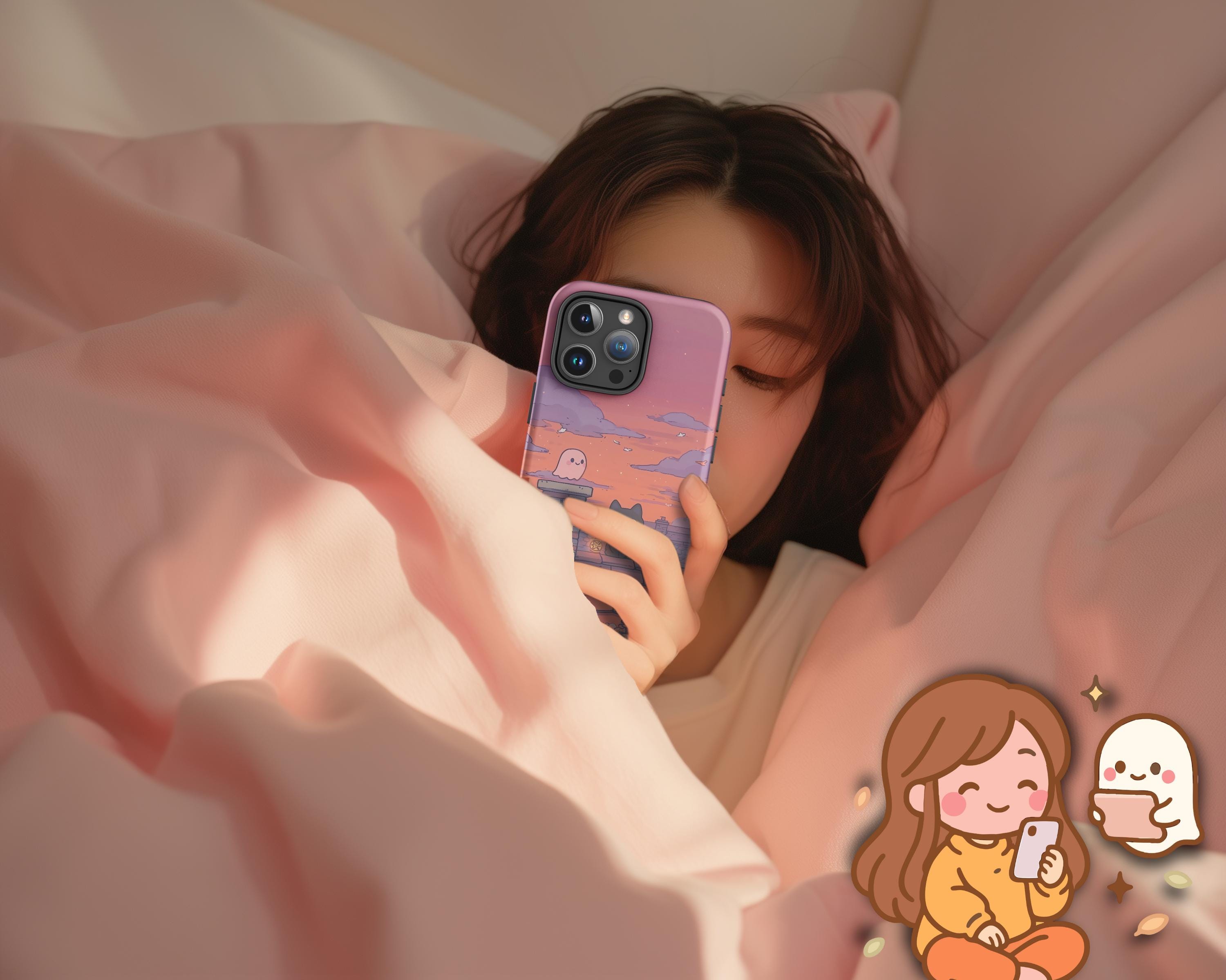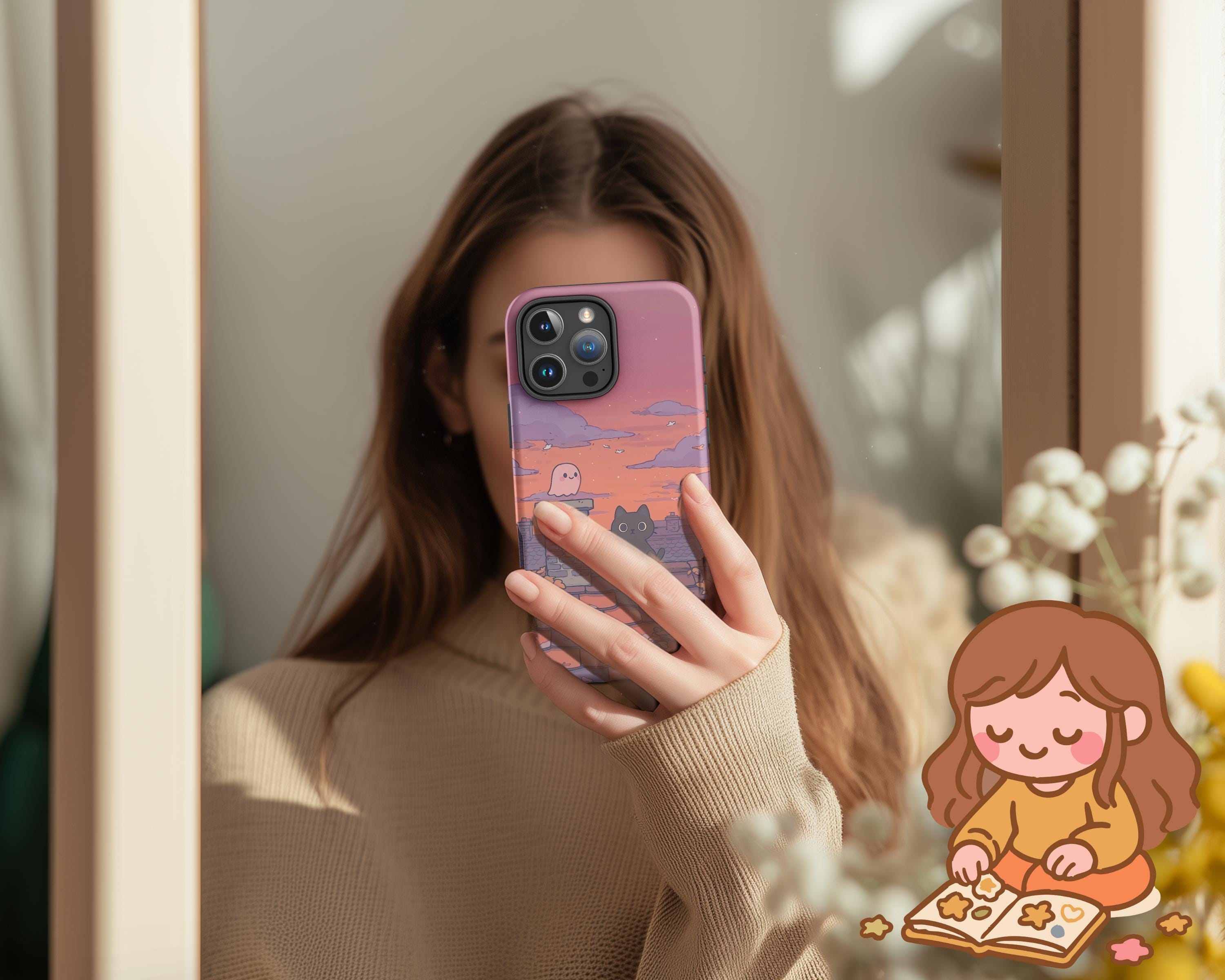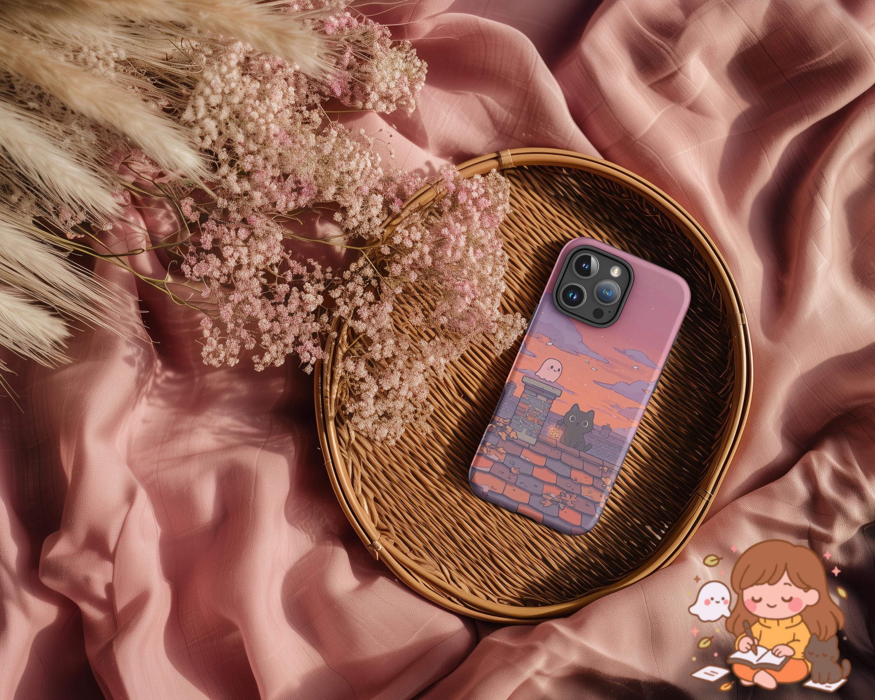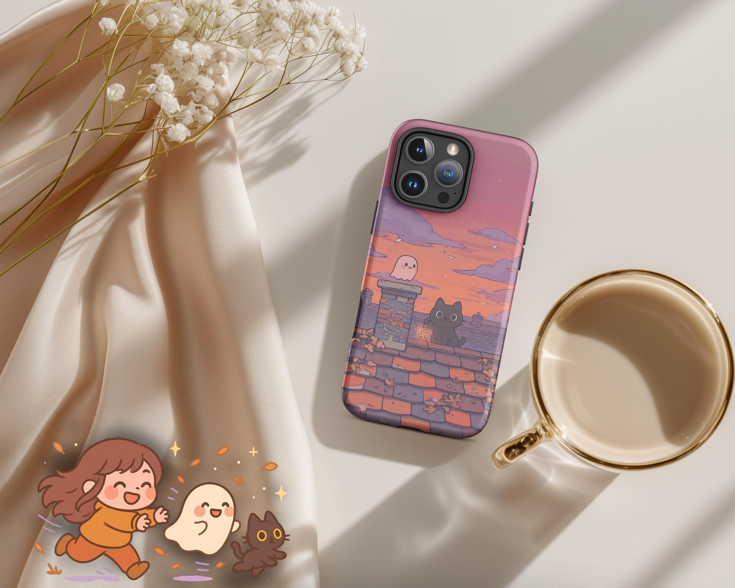 Autumn Cat & Ghost iPhone Case: Spooky Fall Sunset Rooftop Art