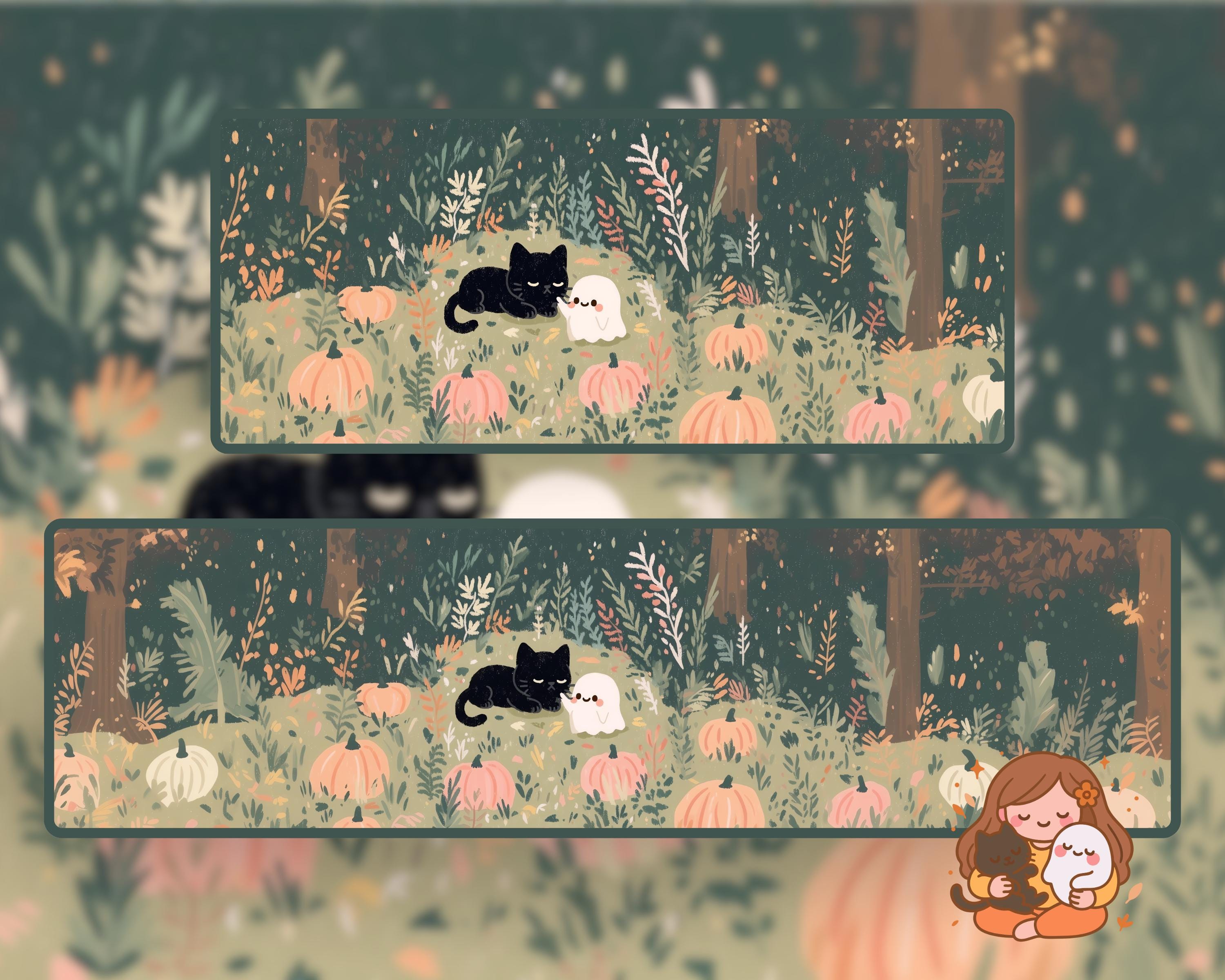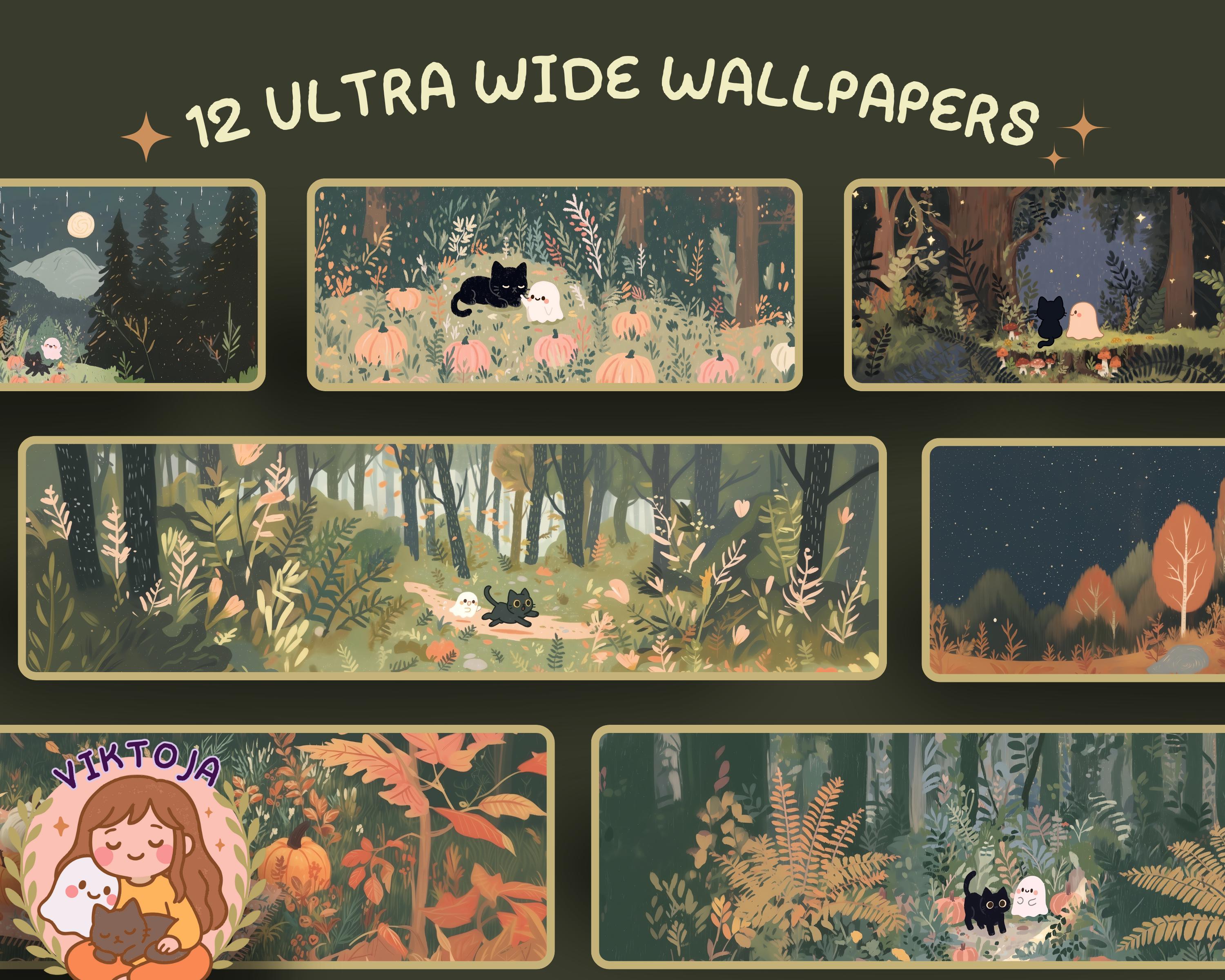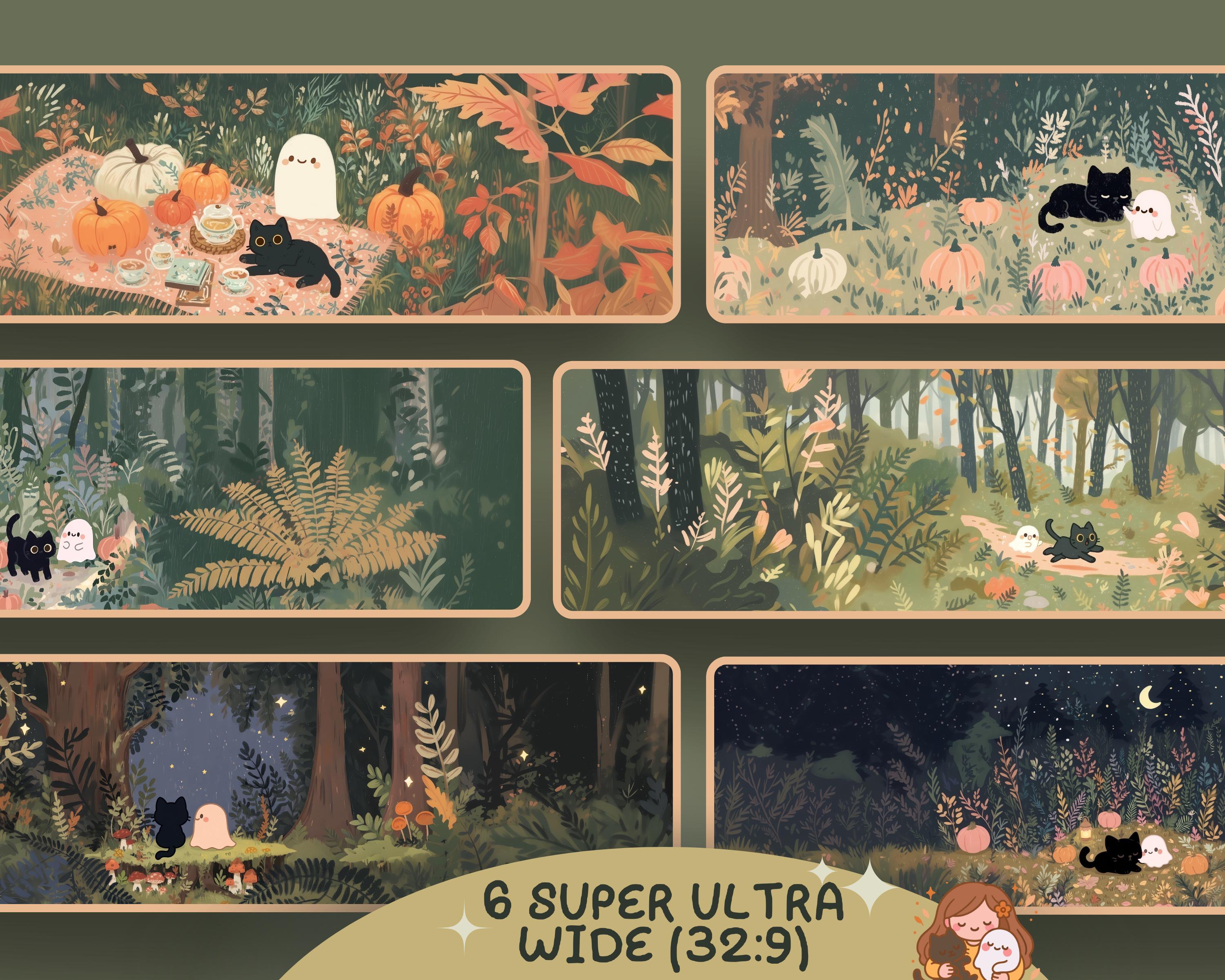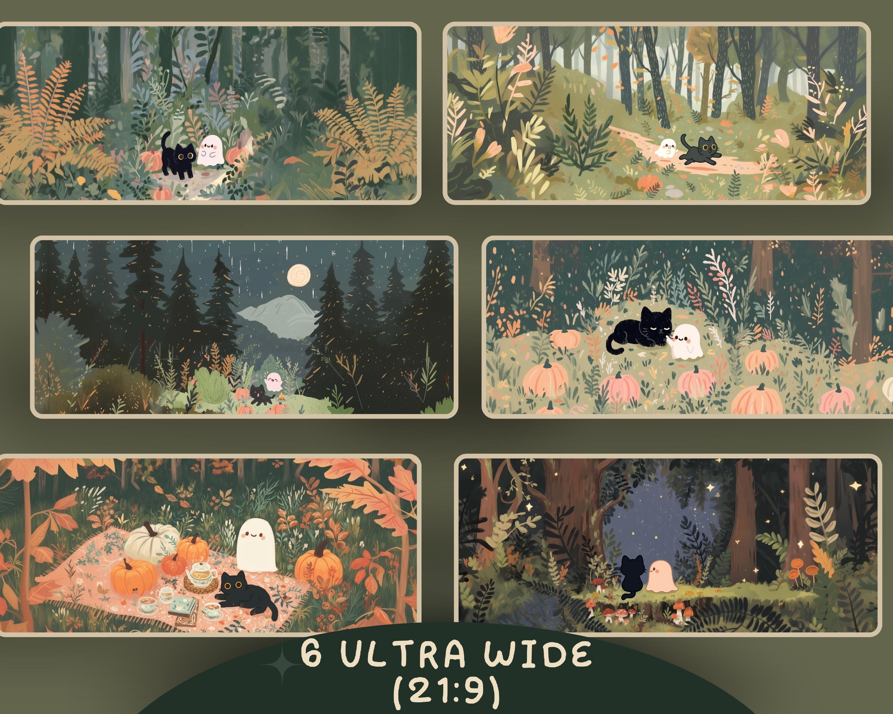 Green autumn Lofi Desktop Wallpaper: Ghostly cat Theme ultrawide (Digital Download 12-Pack)