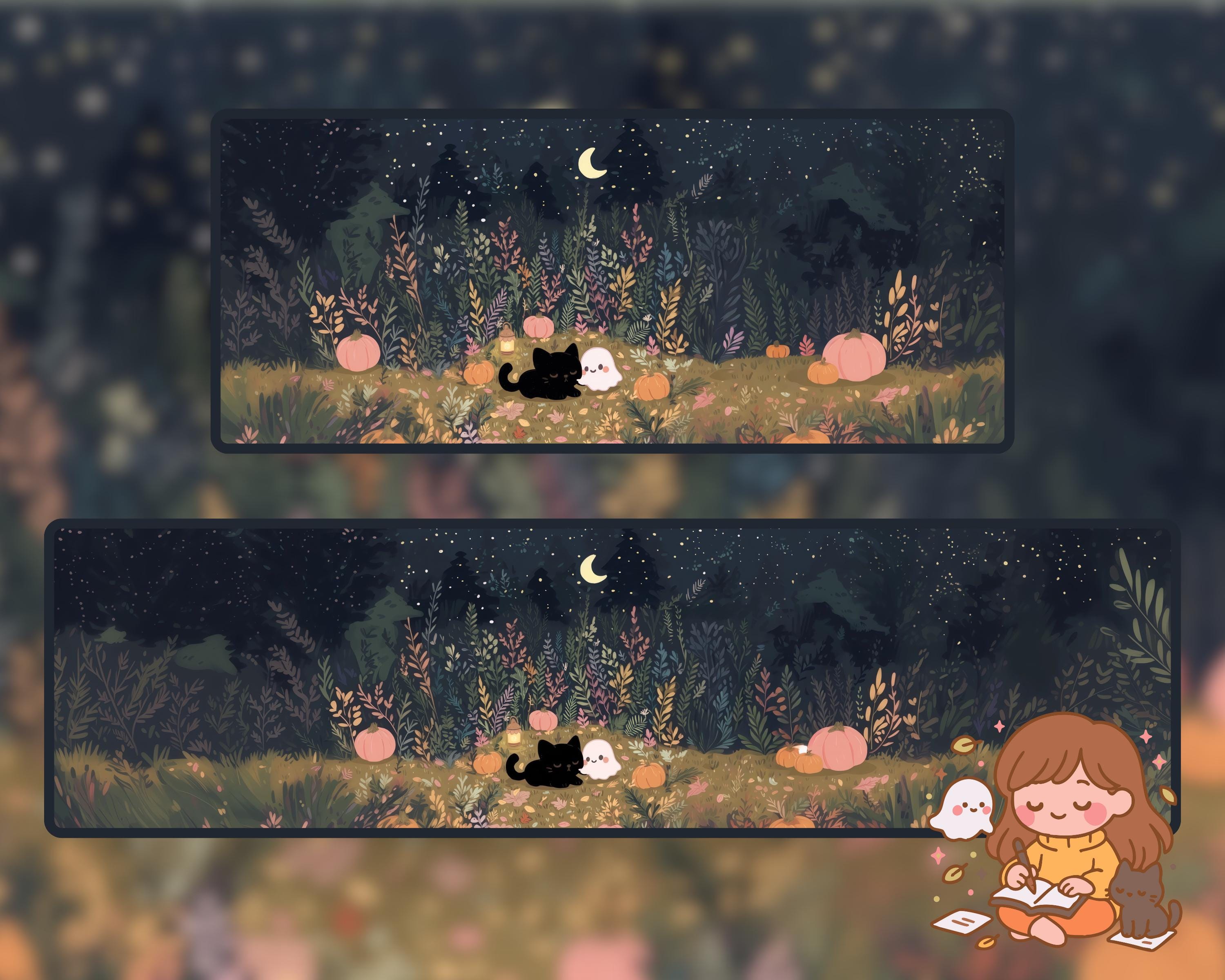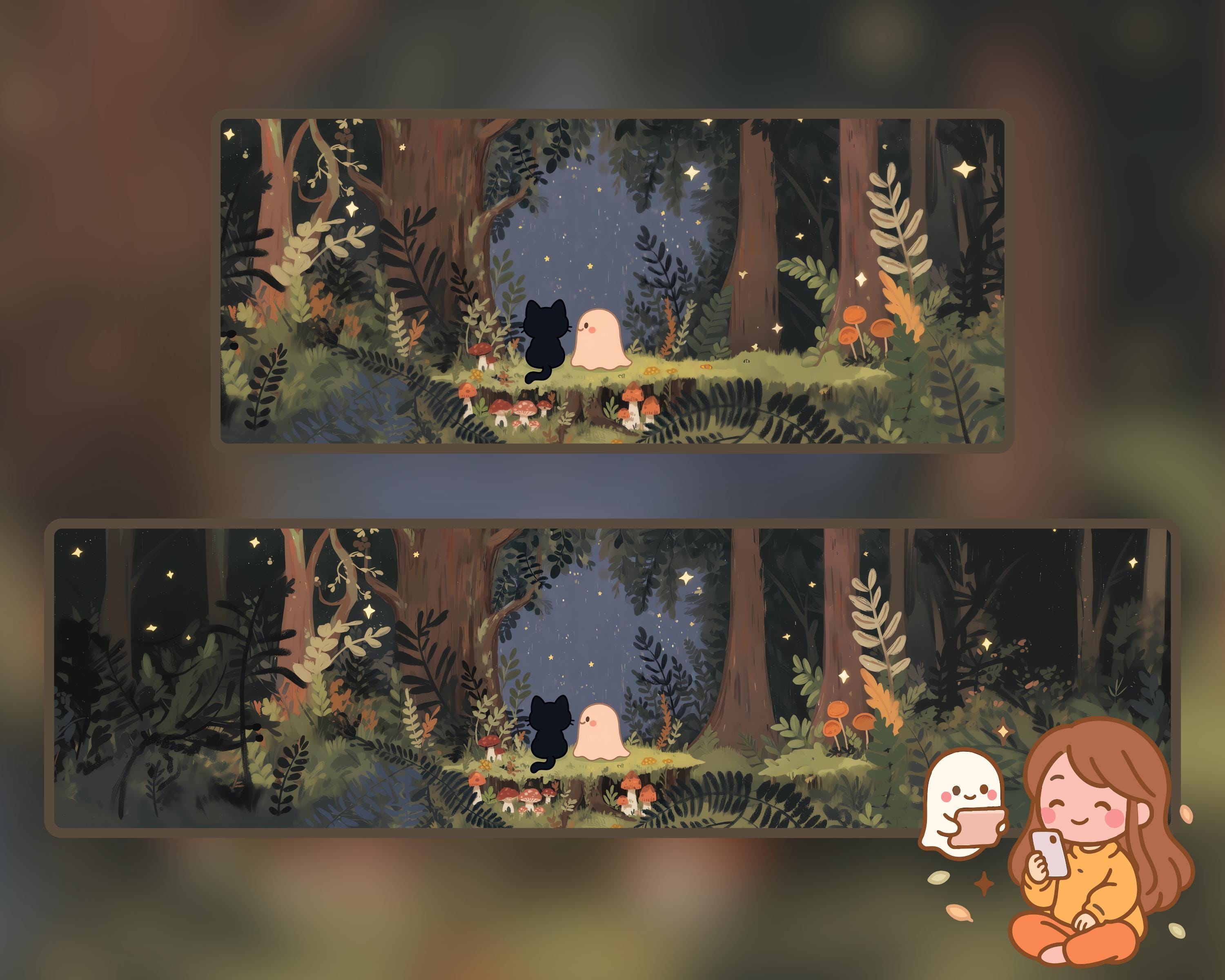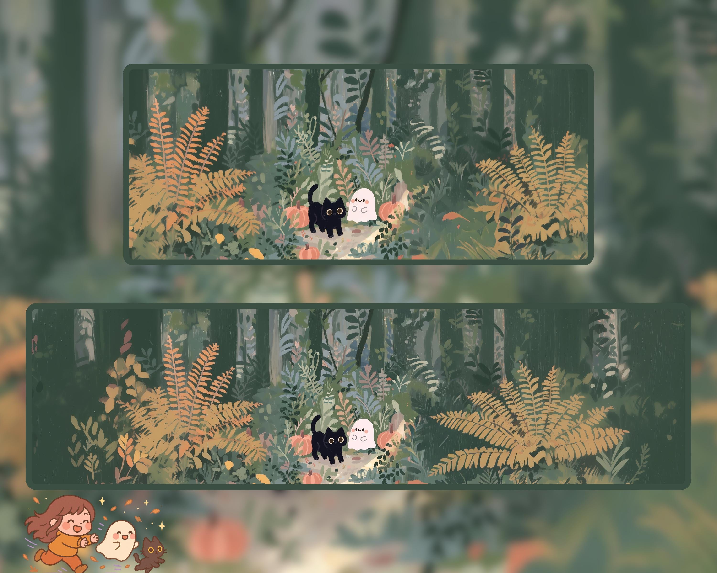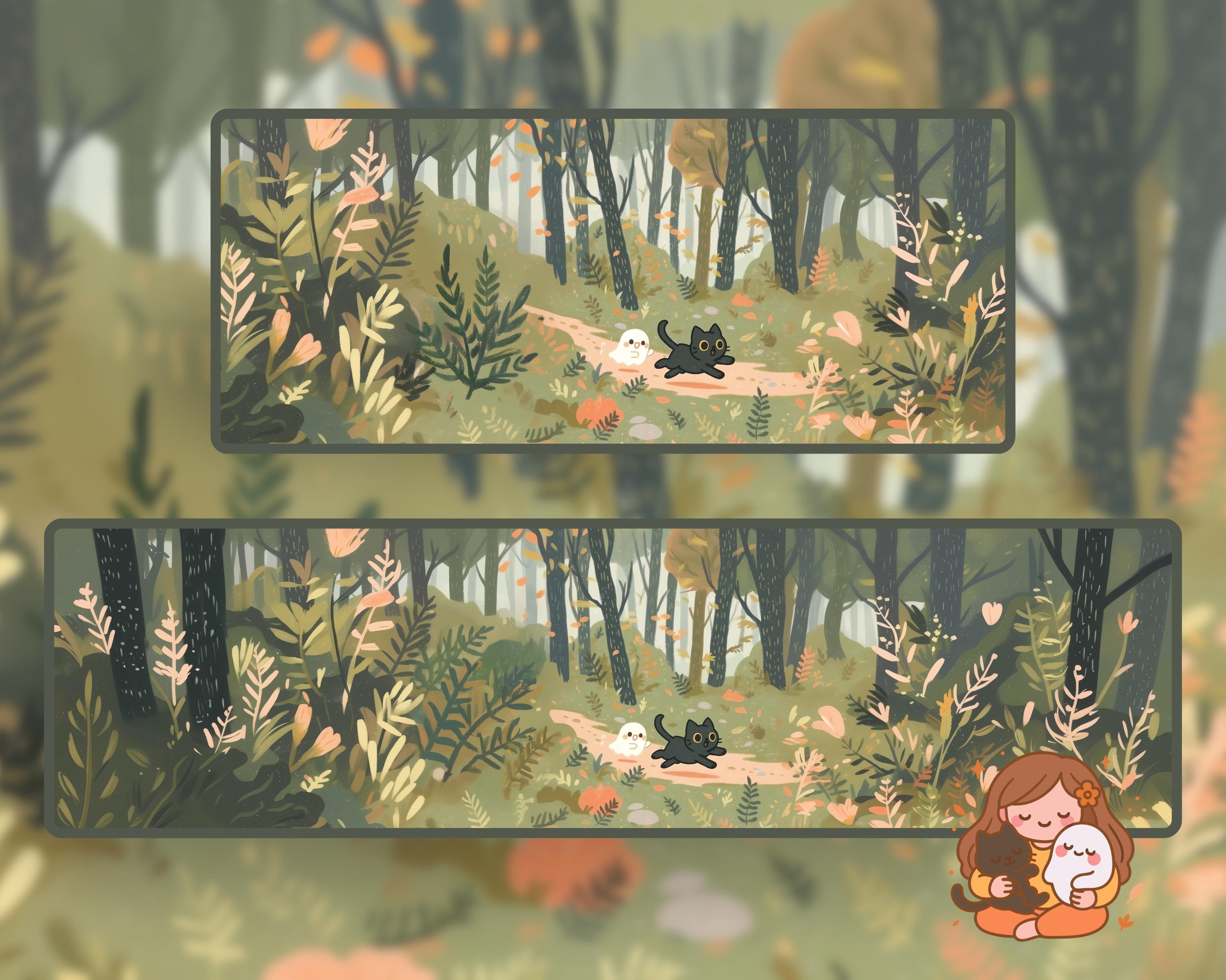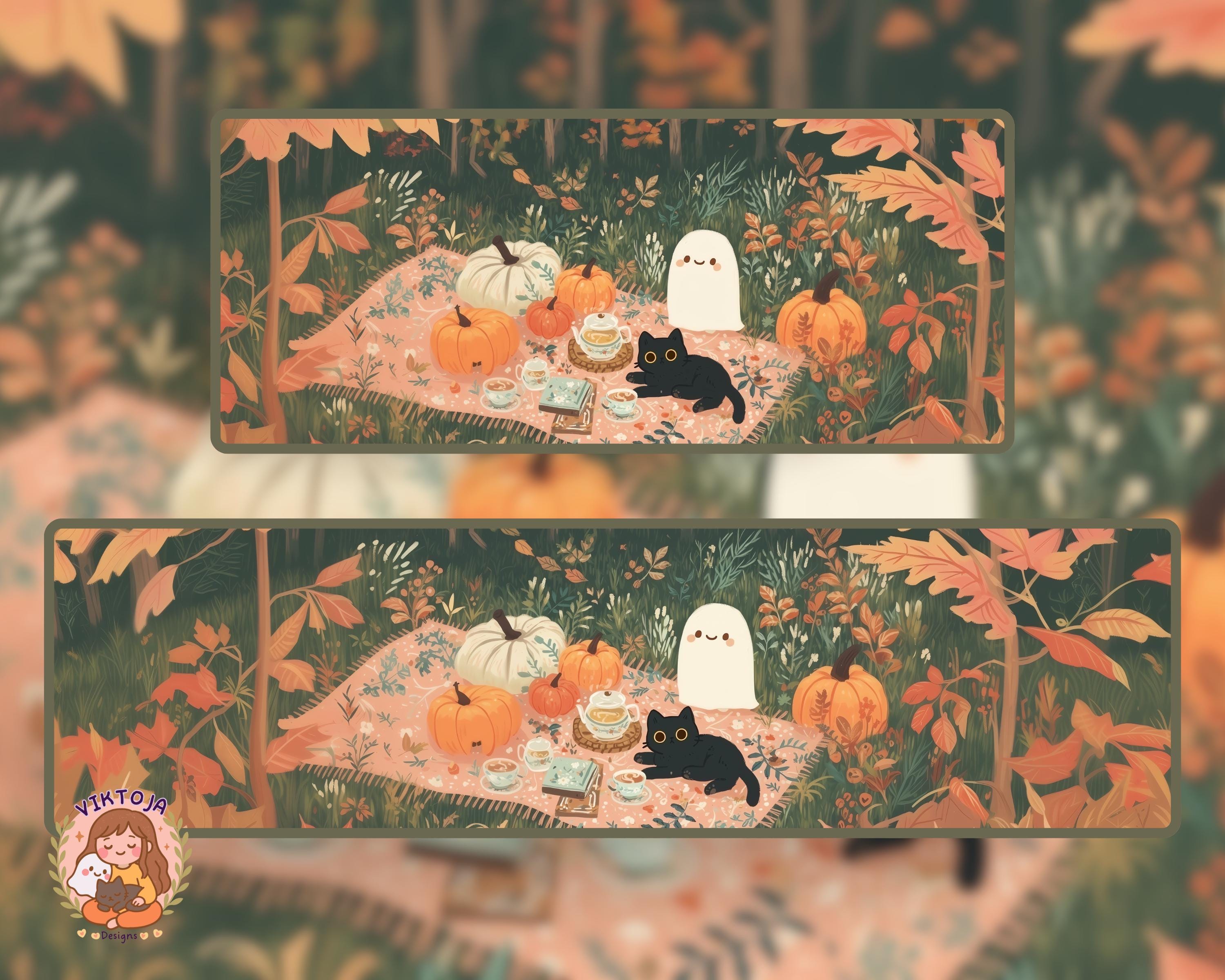 Green autumn Lofi Desktop Wallpaper: Ghostly cat Theme ultrawide (Digital Download 12-Pack)