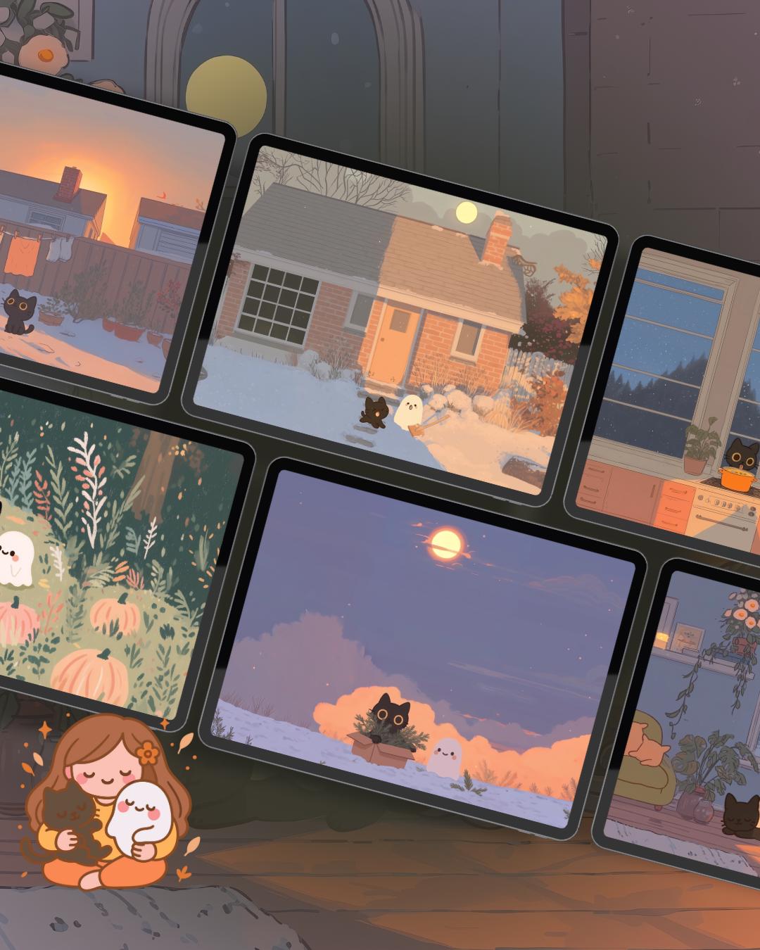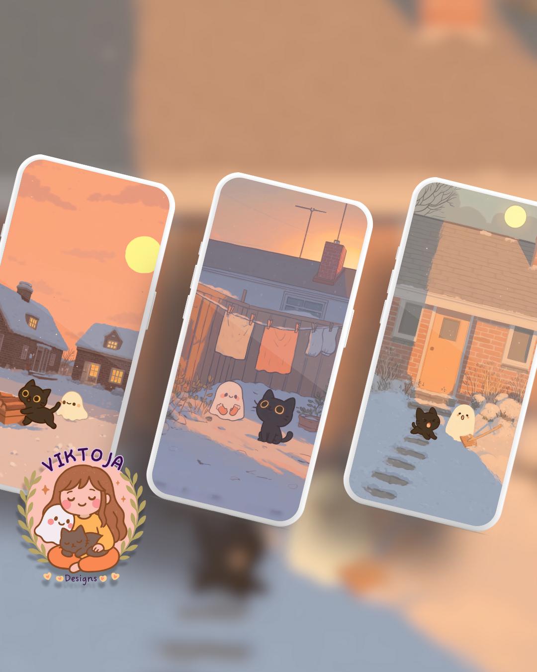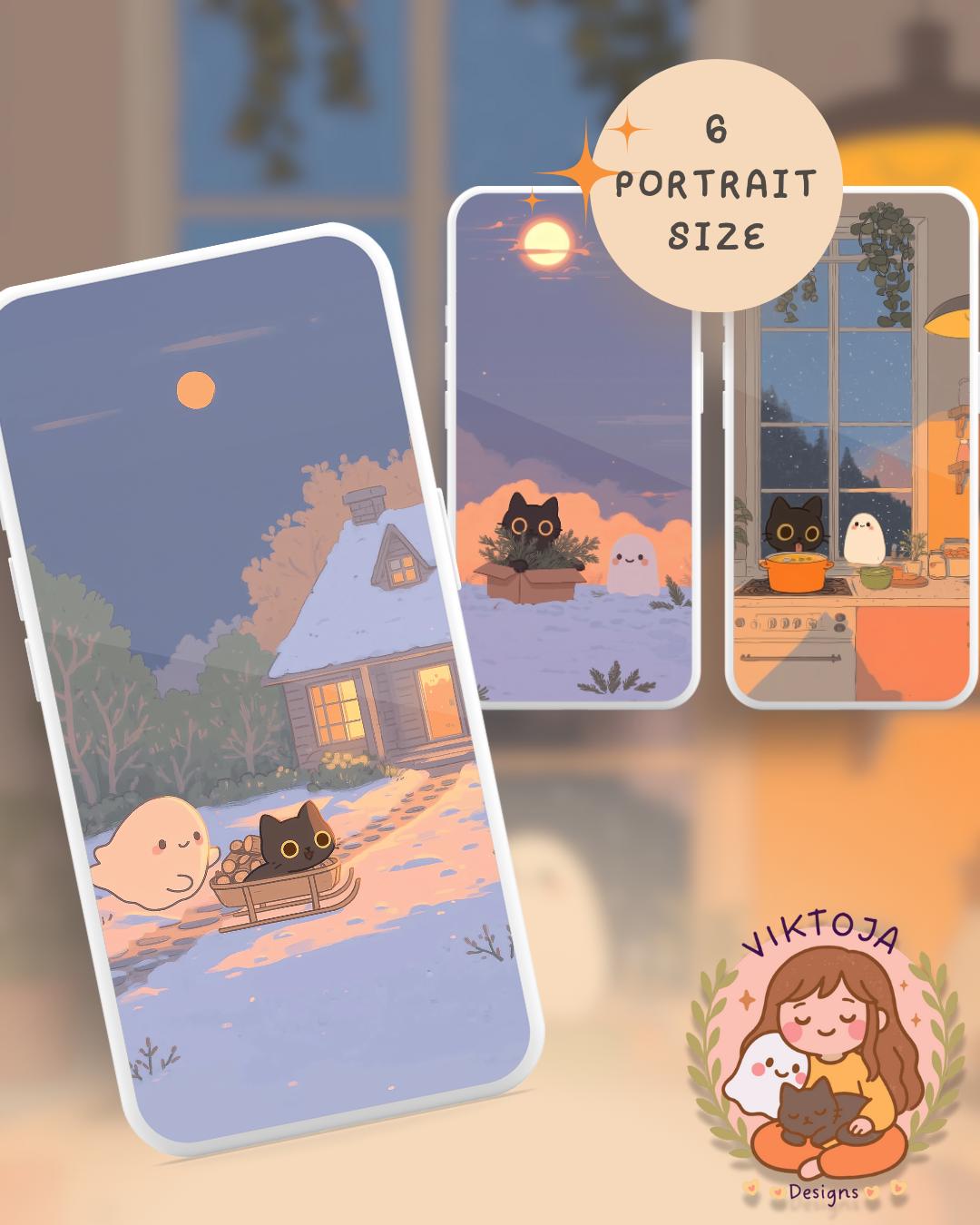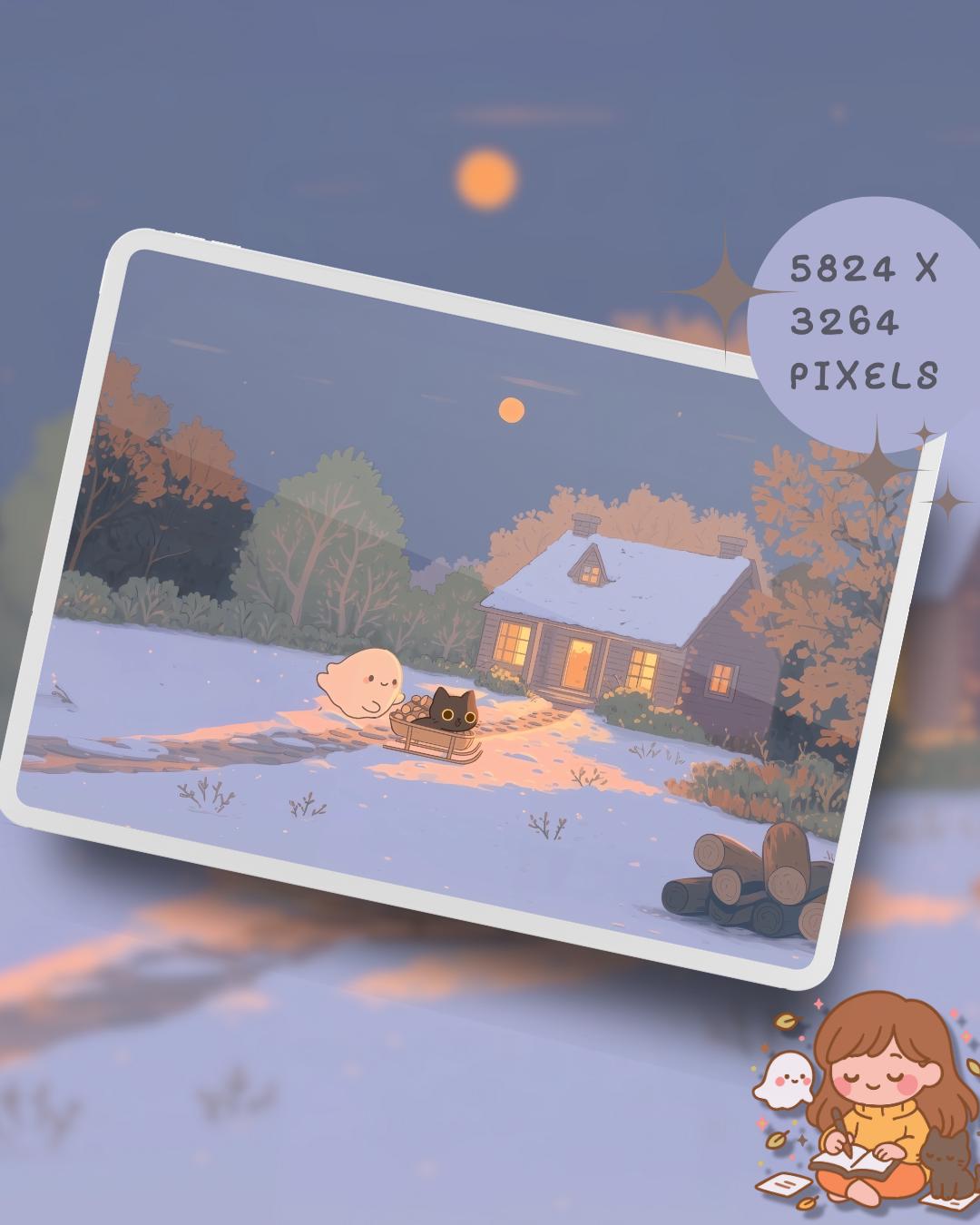 Snowy Cat Lofi Wallpaper: Holiday Desktop & Phone Backgrounds (Digital Download)
