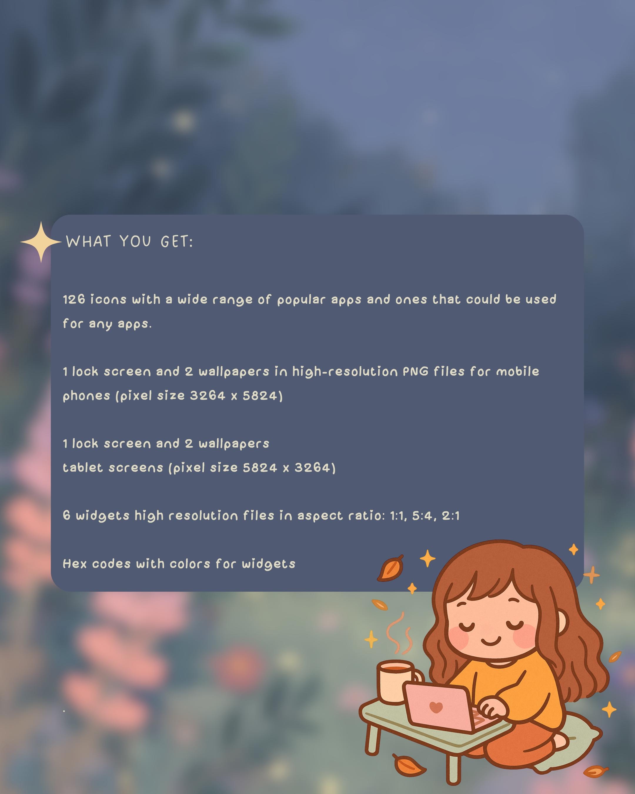 Give your device a fresh look with our awesome icon and wallpaper set for iOS, iPadOS, and Android! This digital download includes 126 stunning icons covering a range of popular apps that can be used to customize any app on your device. You'll get high-resolution PNG files designed for both mobile phones and tablets, so your screens will look fantastic no matter what device you’re using! 📱✨