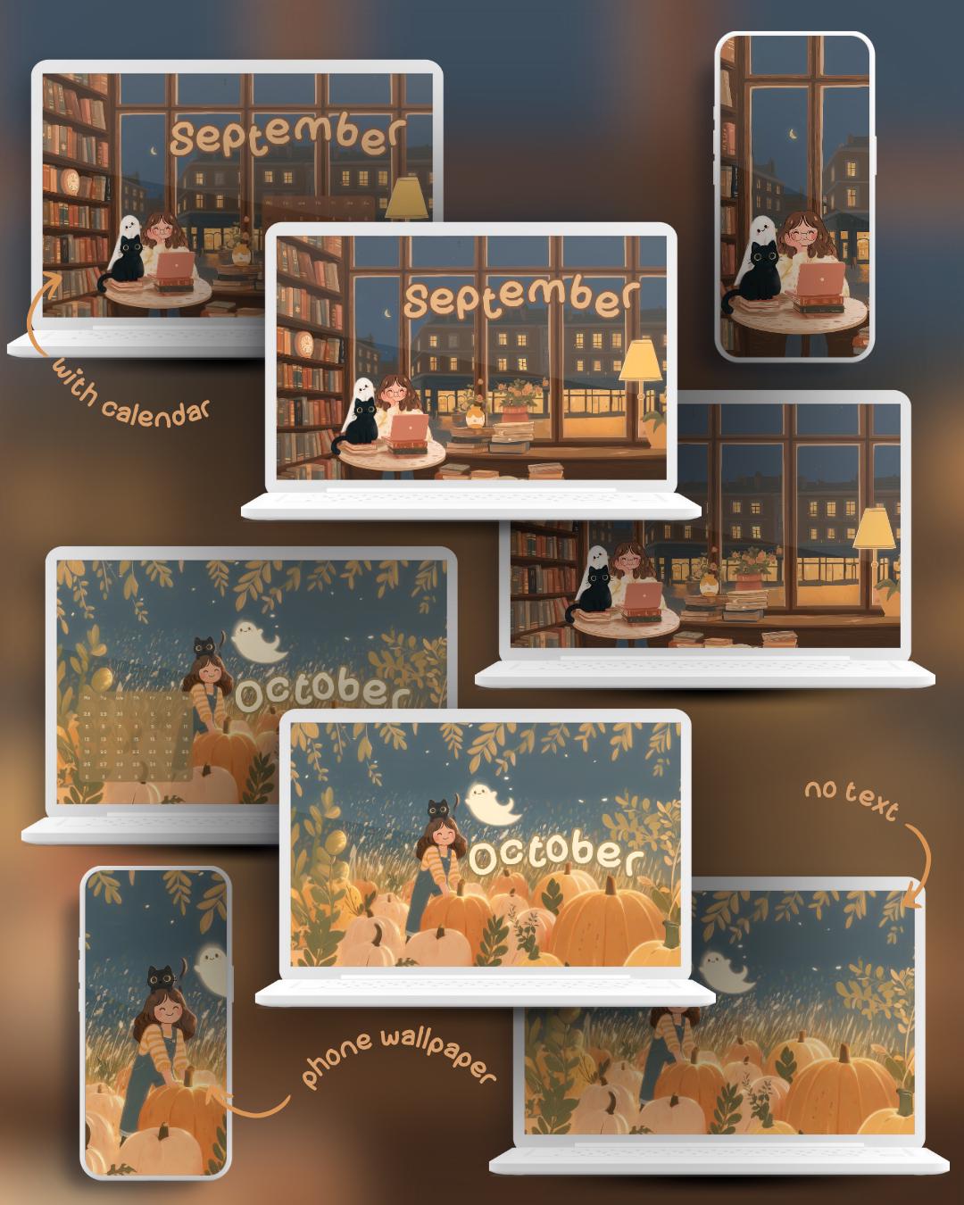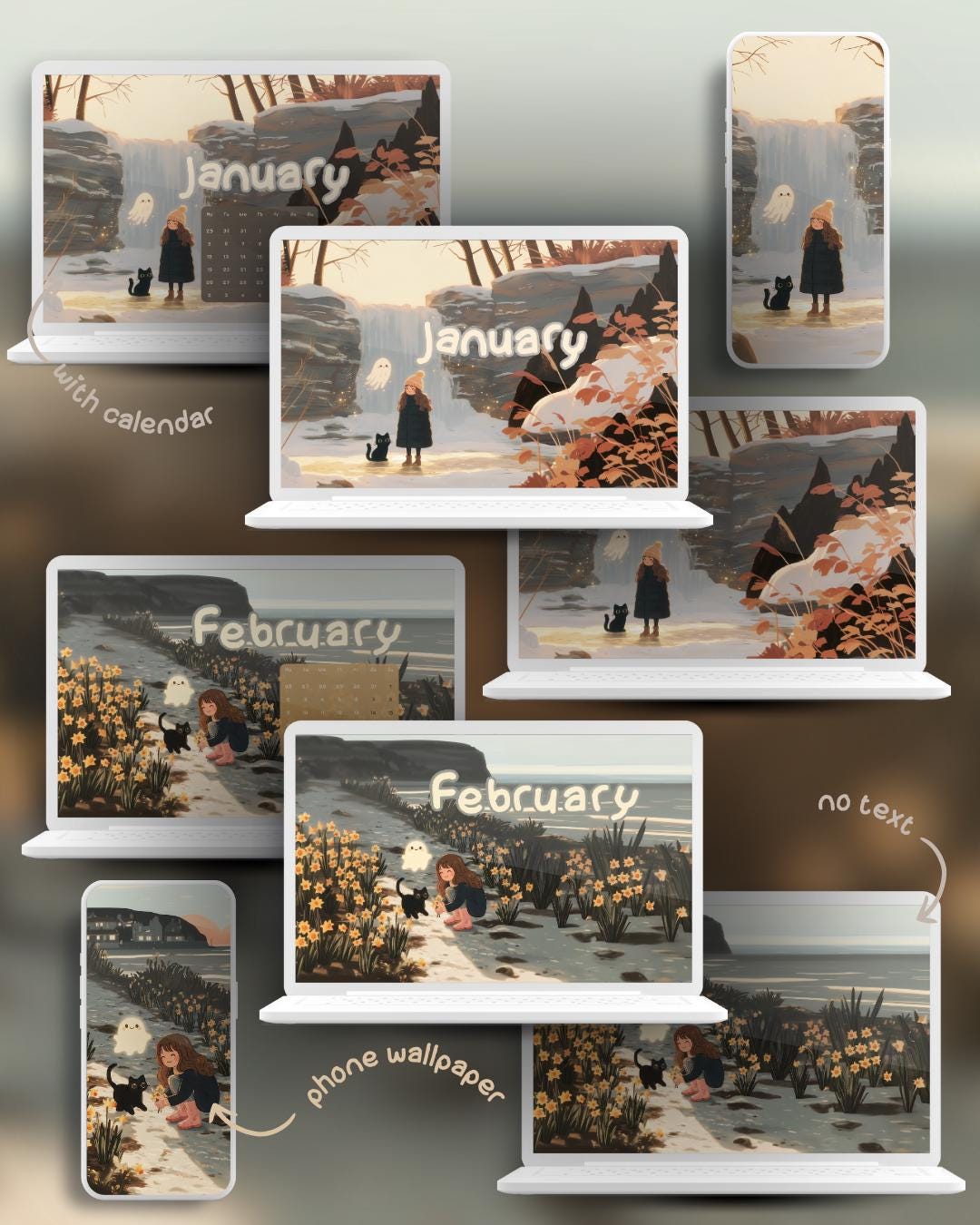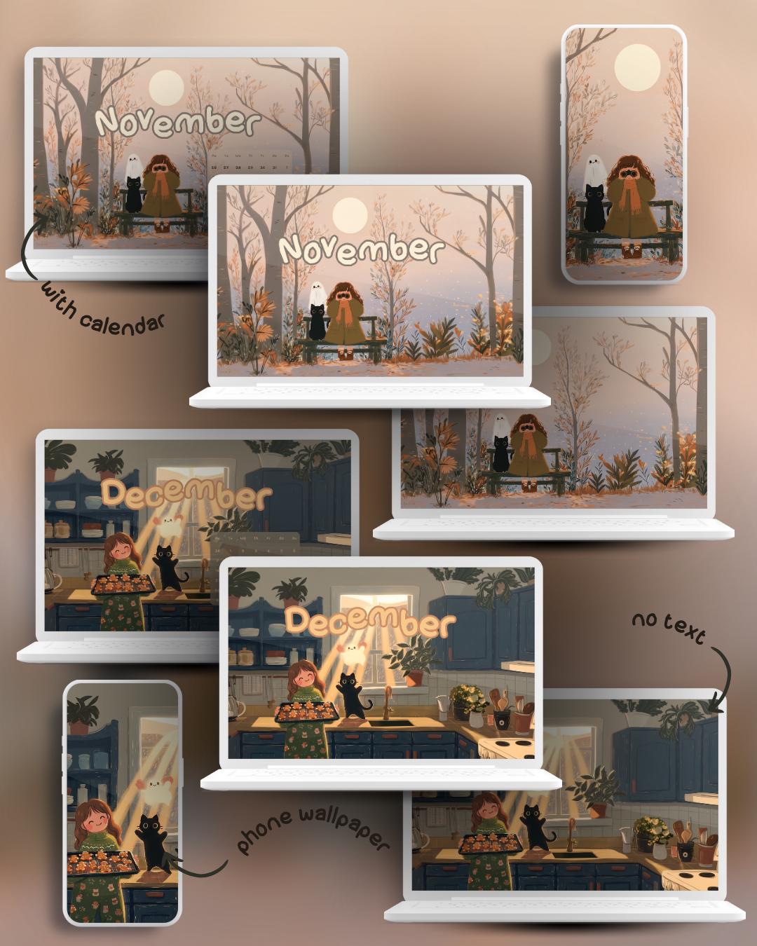 Get ready for a year of cozy adventures with my 2026 Calendar Wallpaper Set! Join Viktoja, her black cat Inky, and their friendly ghost named Ghosty as they journey through the seasons, from snowy winter walks and spring flower fields to pumpkin patches and holiday baking. This comprehensive bundle creates a heartwarming and aesthetic theme for all your devices, keeping you organized and smiling every time you check your screen.