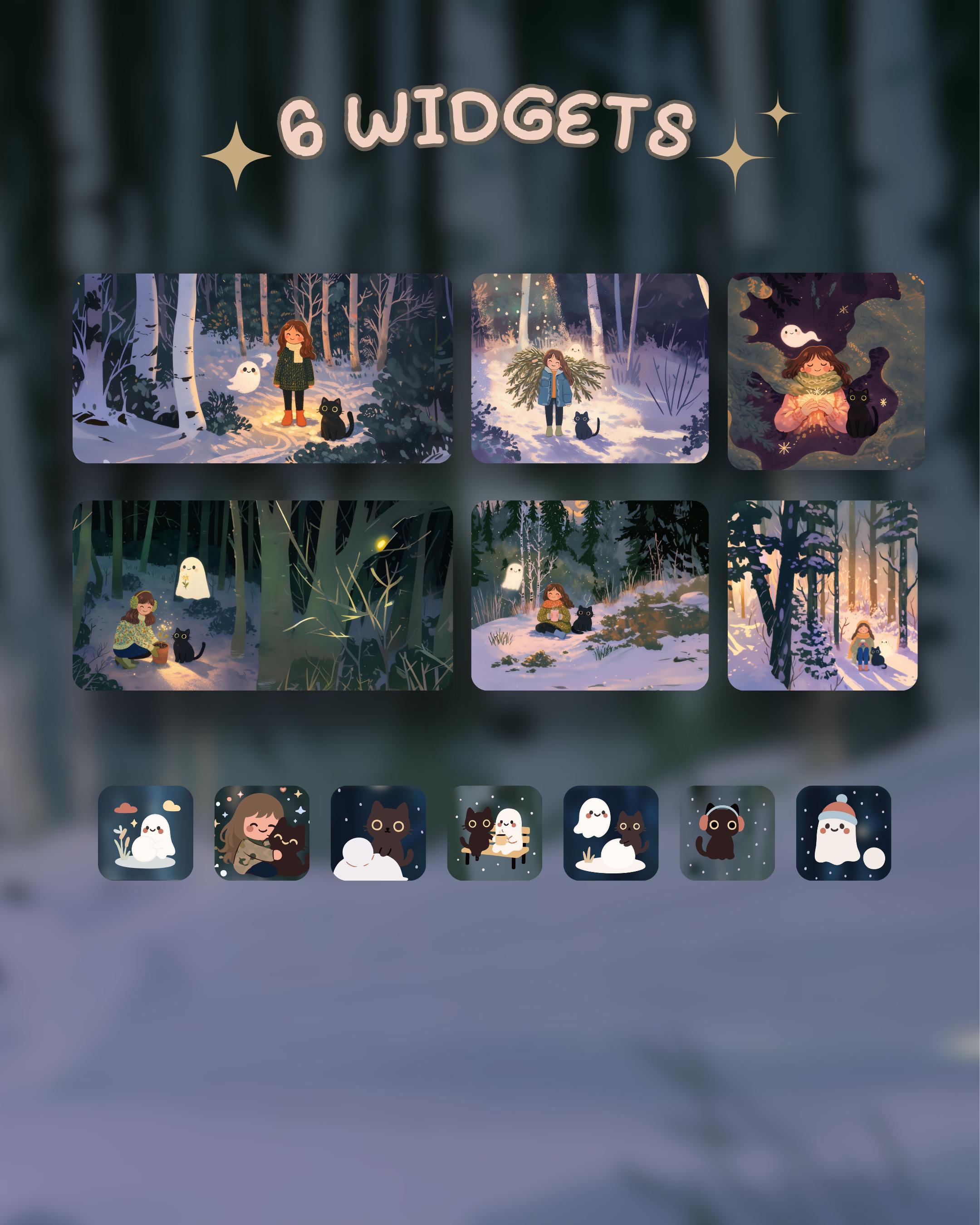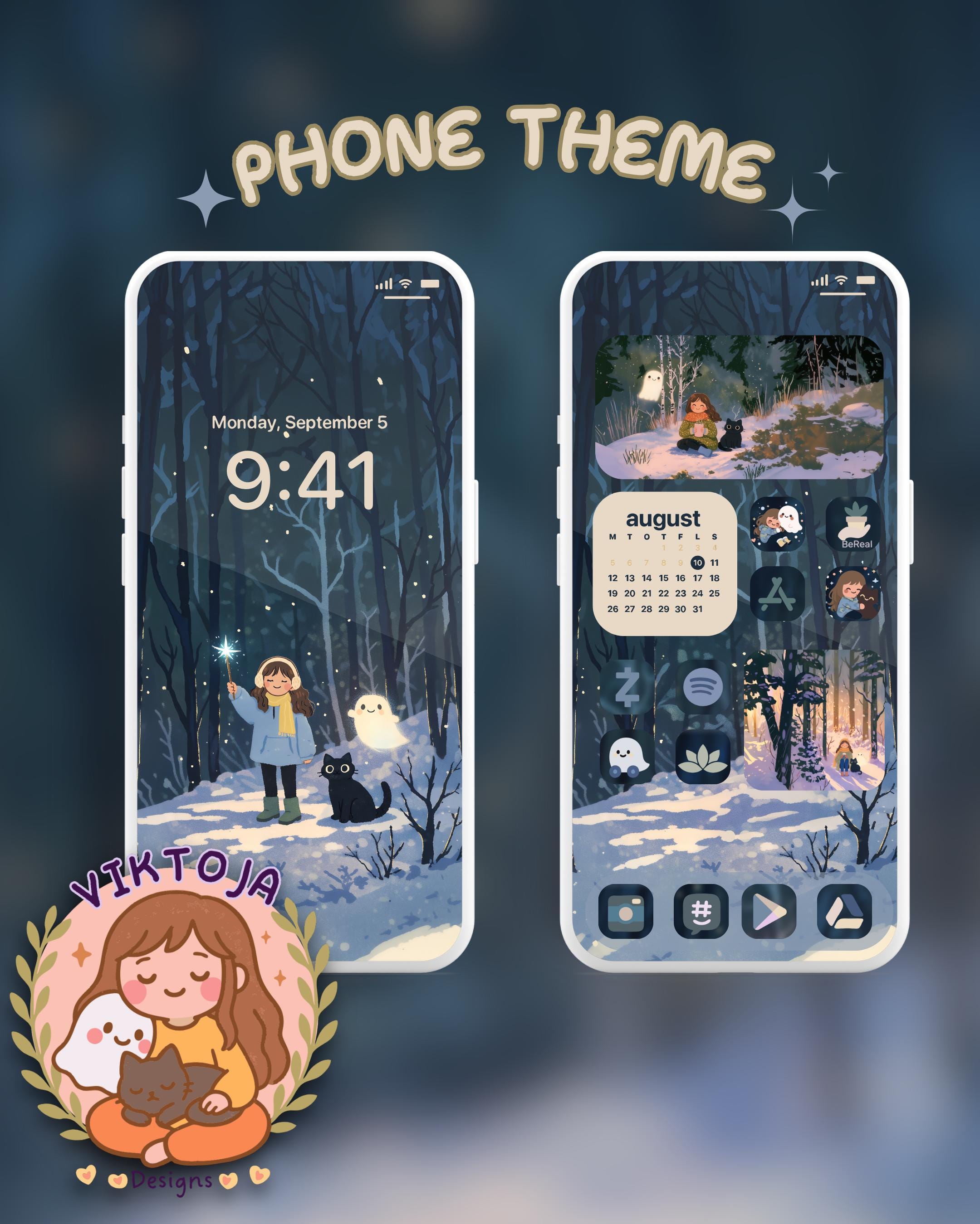 Winter nights Cat Phone Theme: iOS Android Icons & Wallpaper (Digital Download) green, purple, blue.