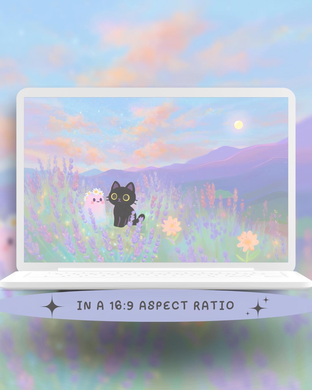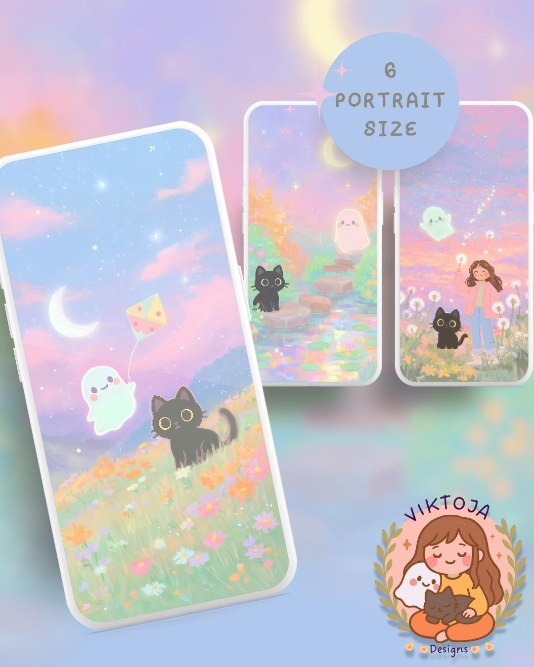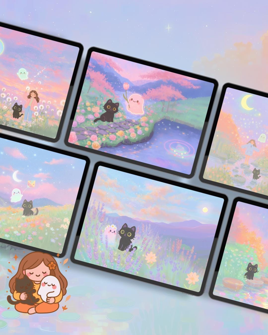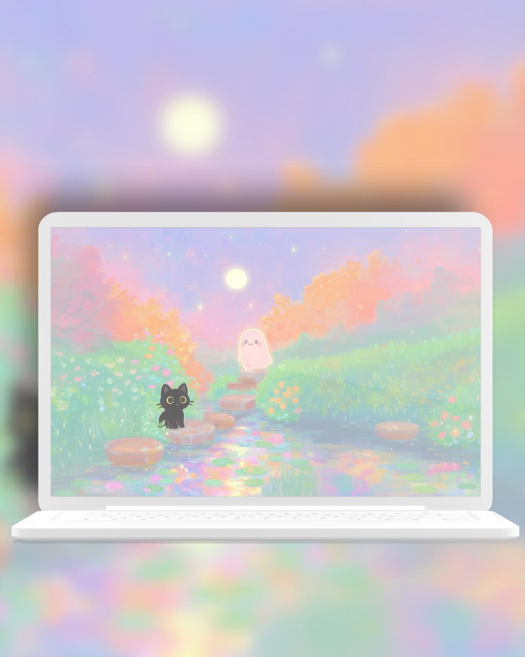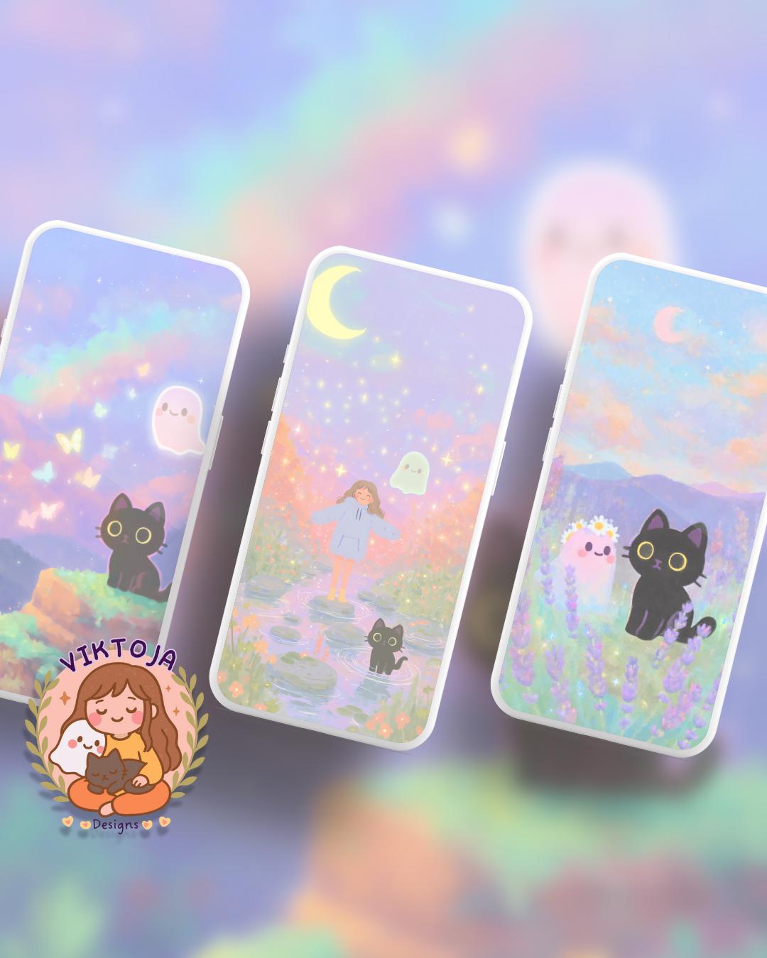 Dreamy Spring Black Cat and ghost Wallpaper: 12 Pastel Phone & Desktop Backgrounds (Digital Download)