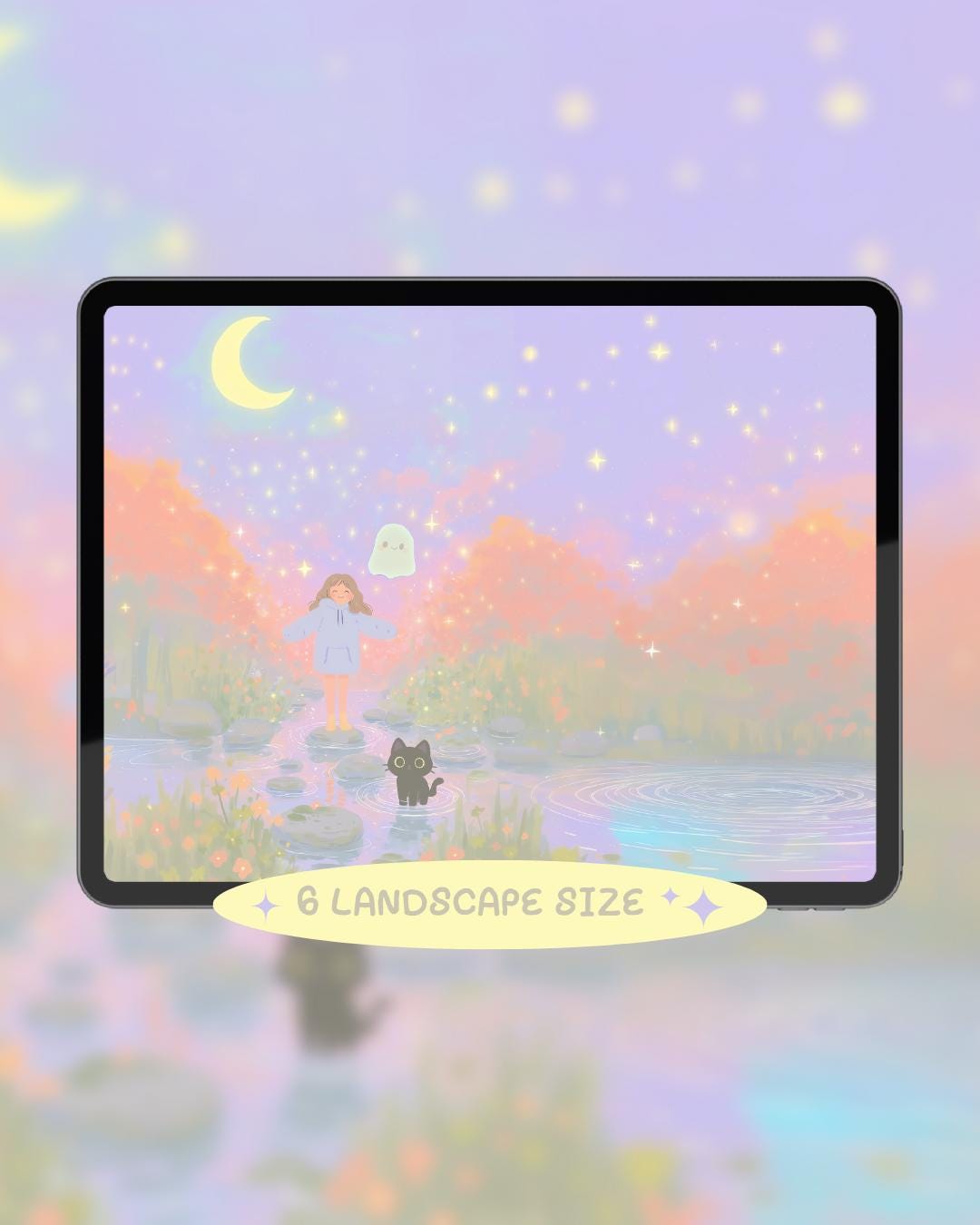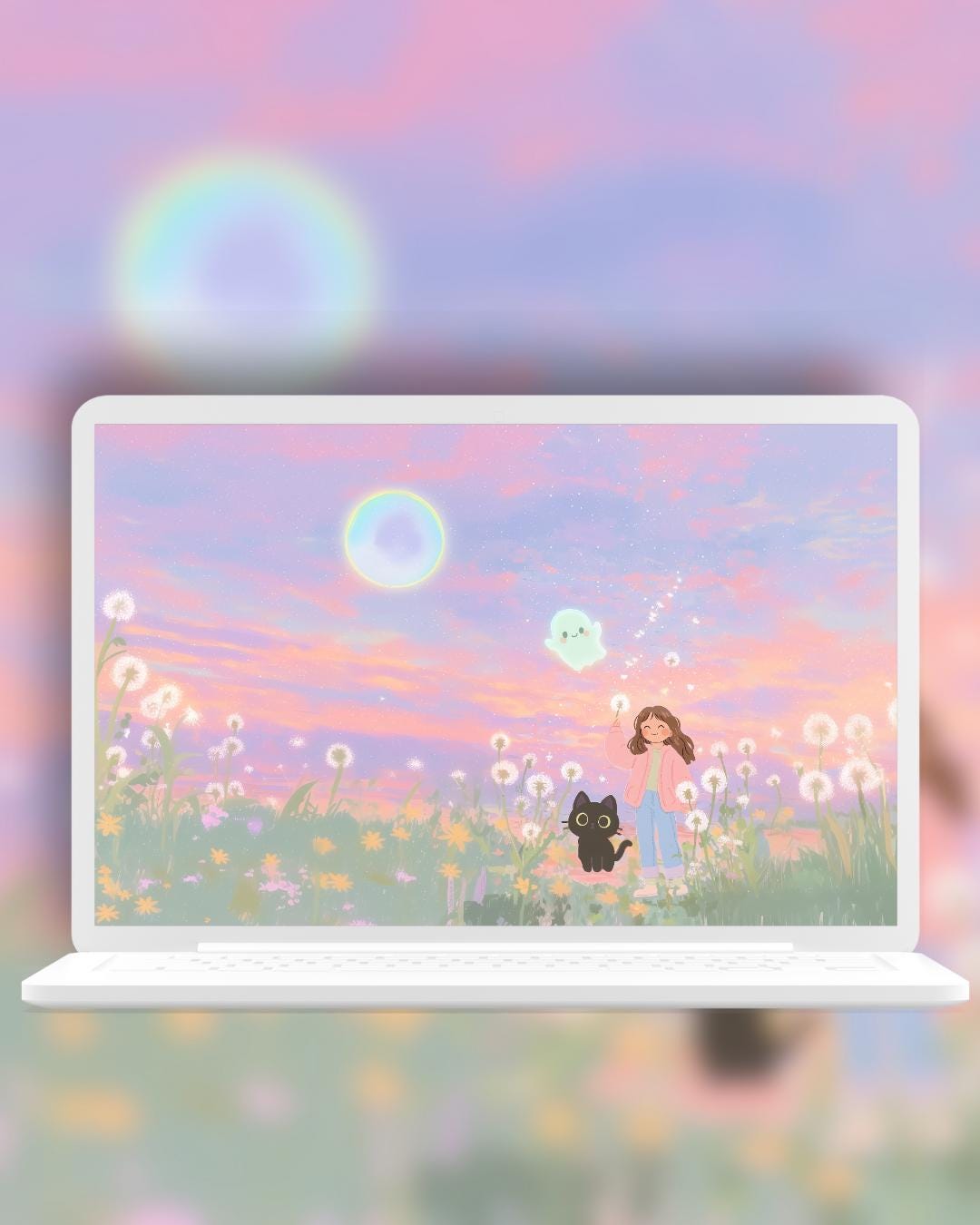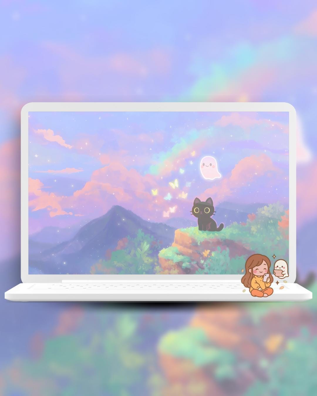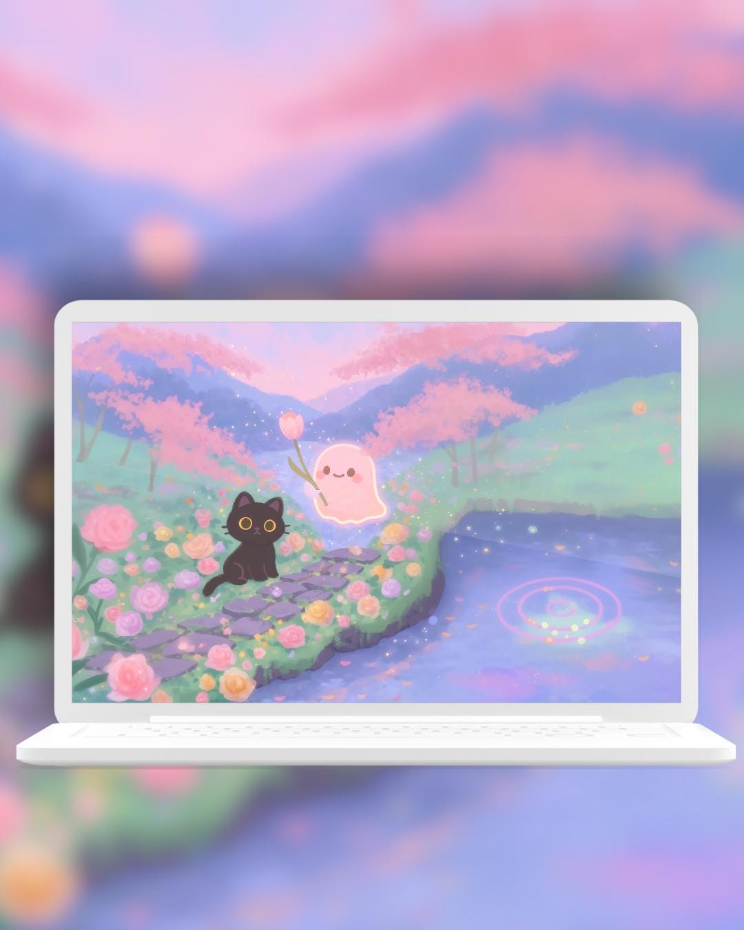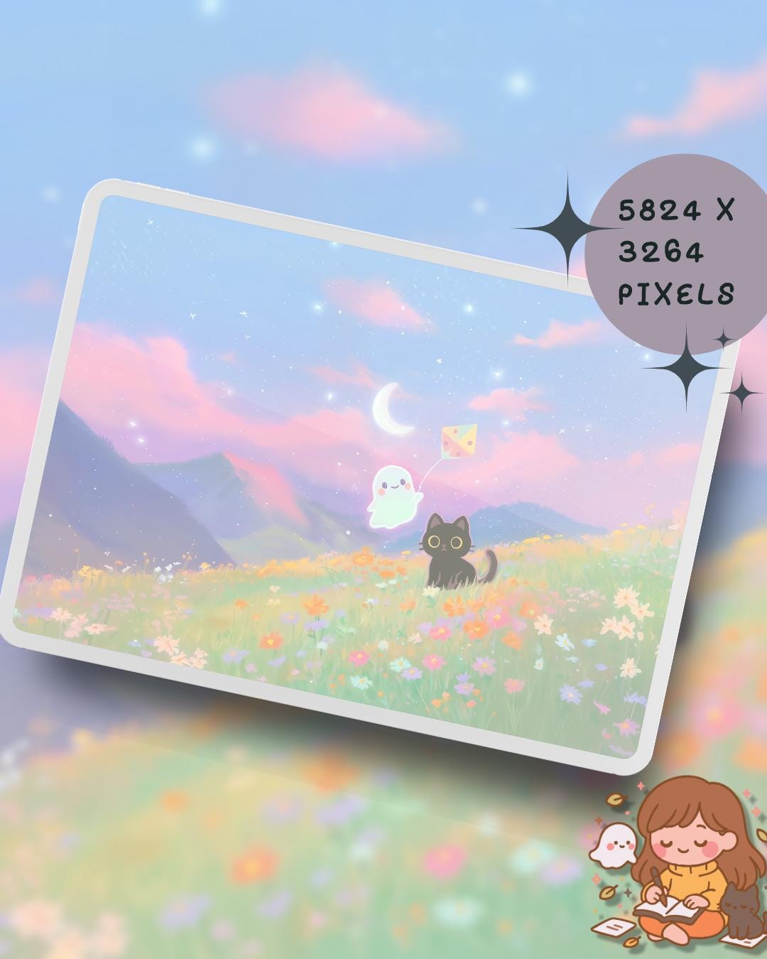 Dreamy Spring Black Cat and ghost Wallpaper: 12 Pastel Phone & Desktop Backgrounds (Digital Download)