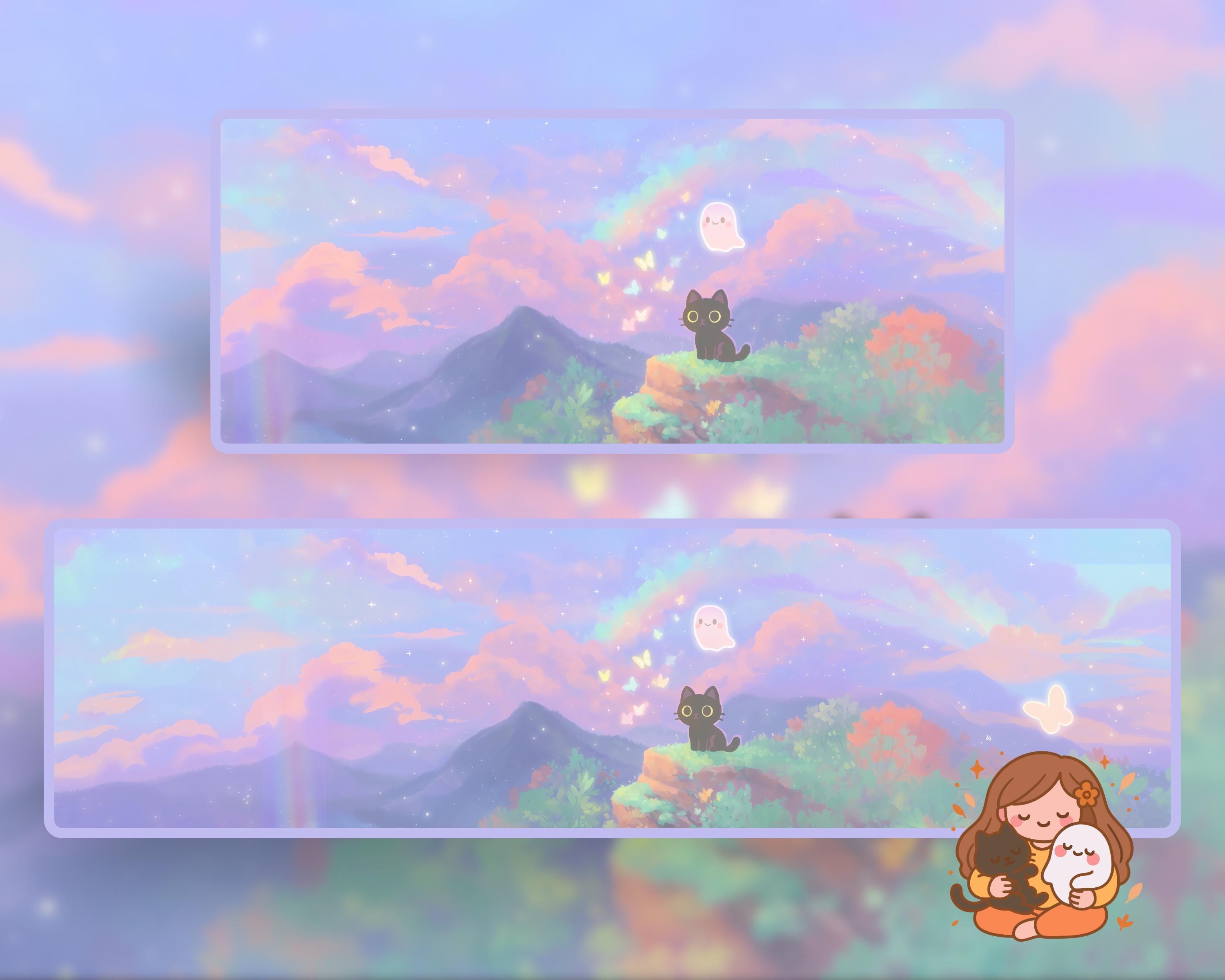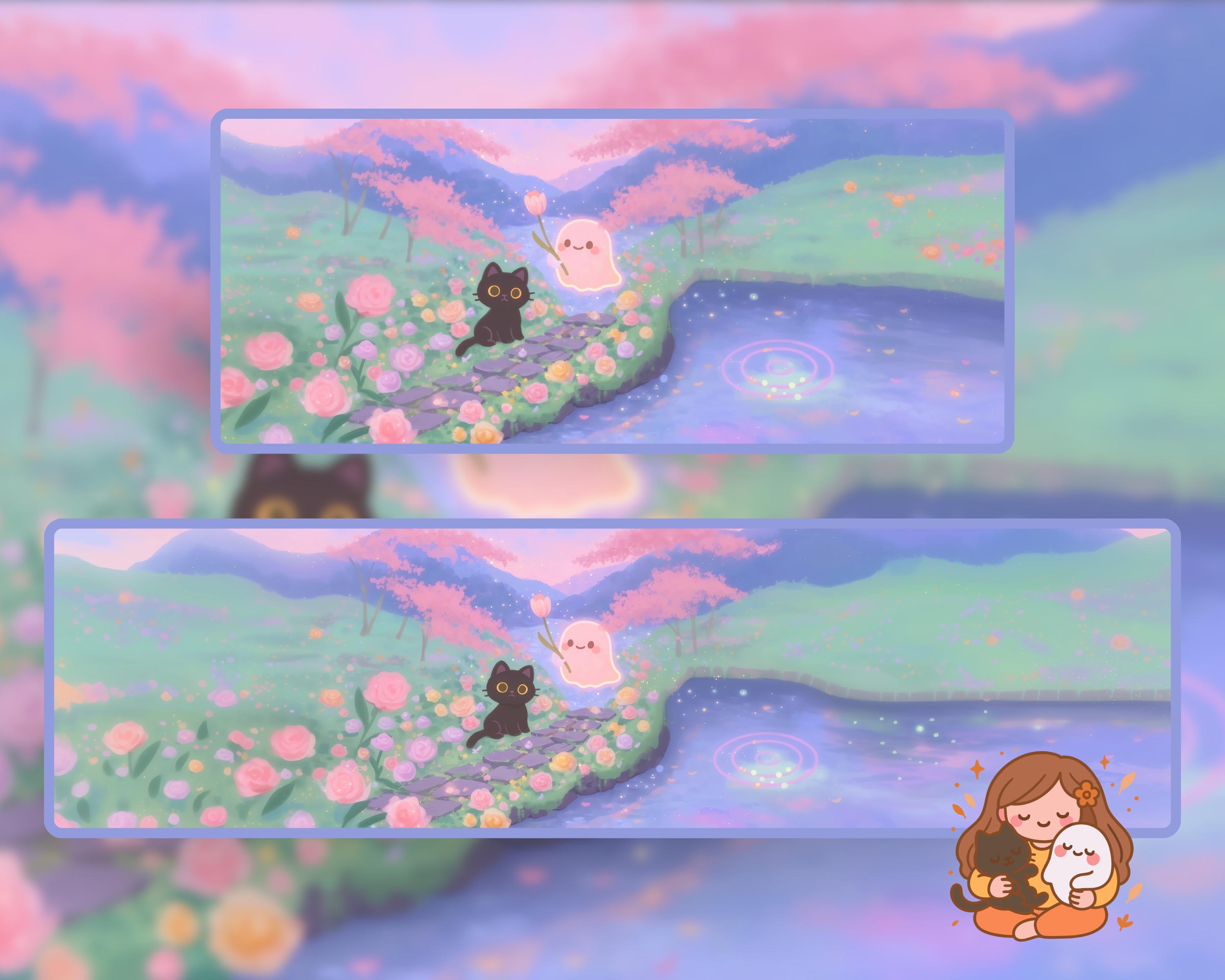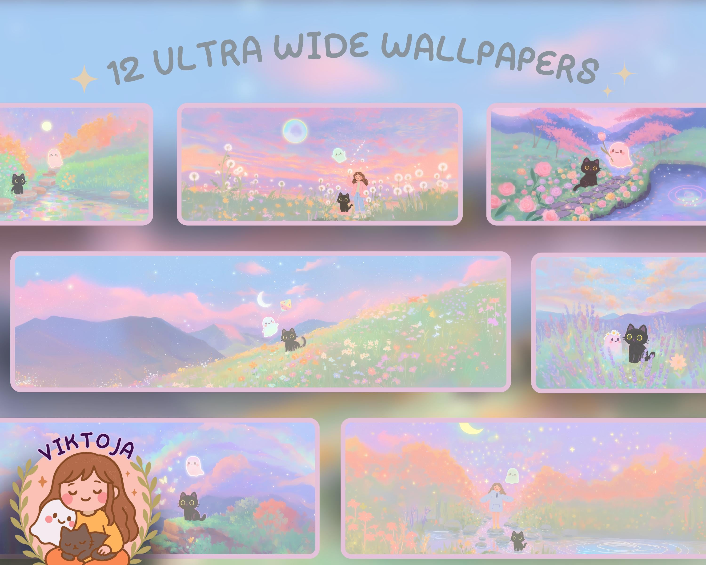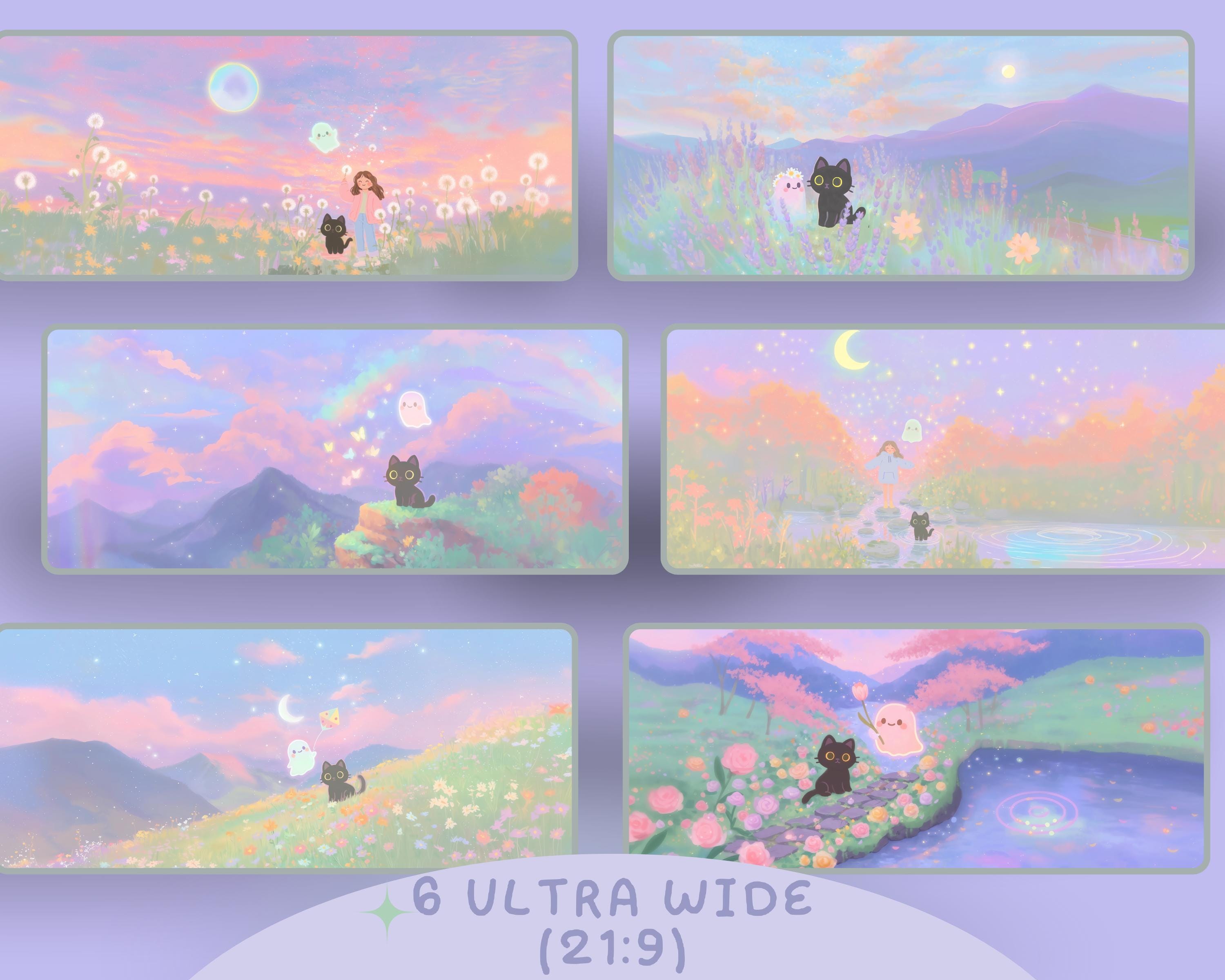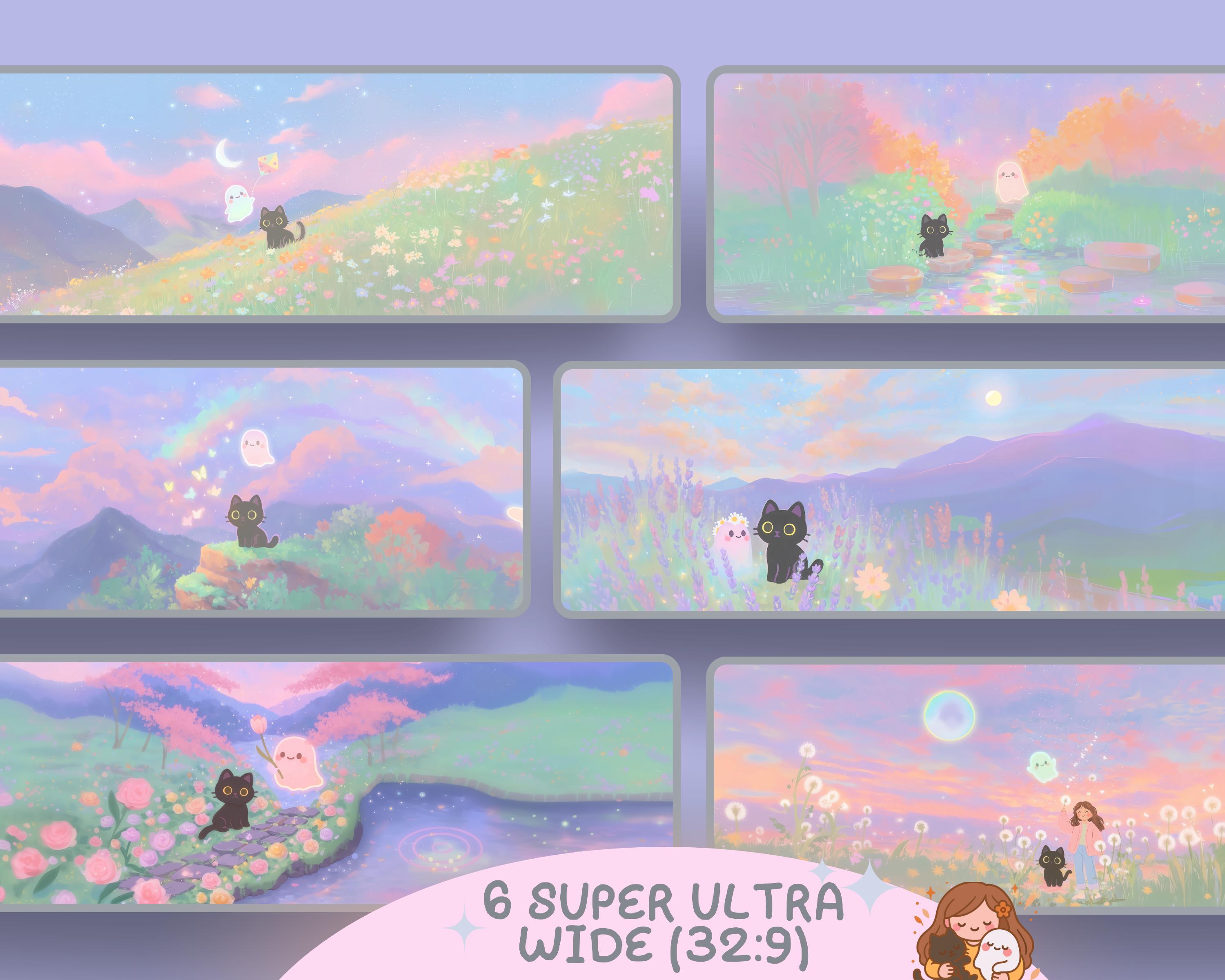 dreamy spring cat and ghost Ultrawide Wallpaper Set Desk Setup Desktop for 21:9 32x9